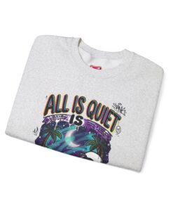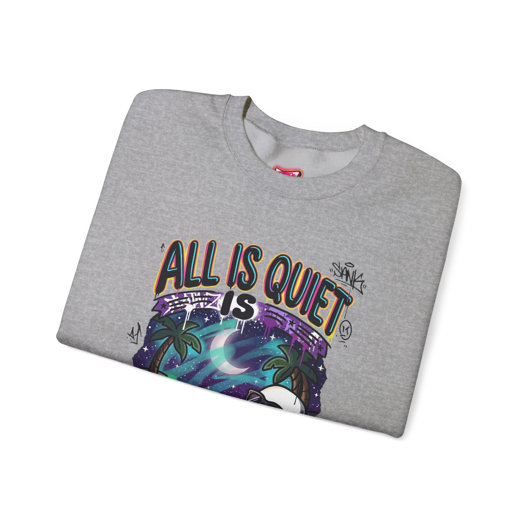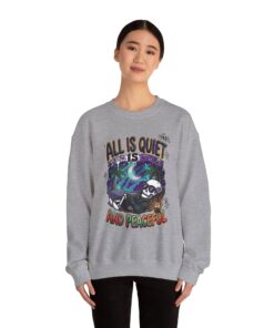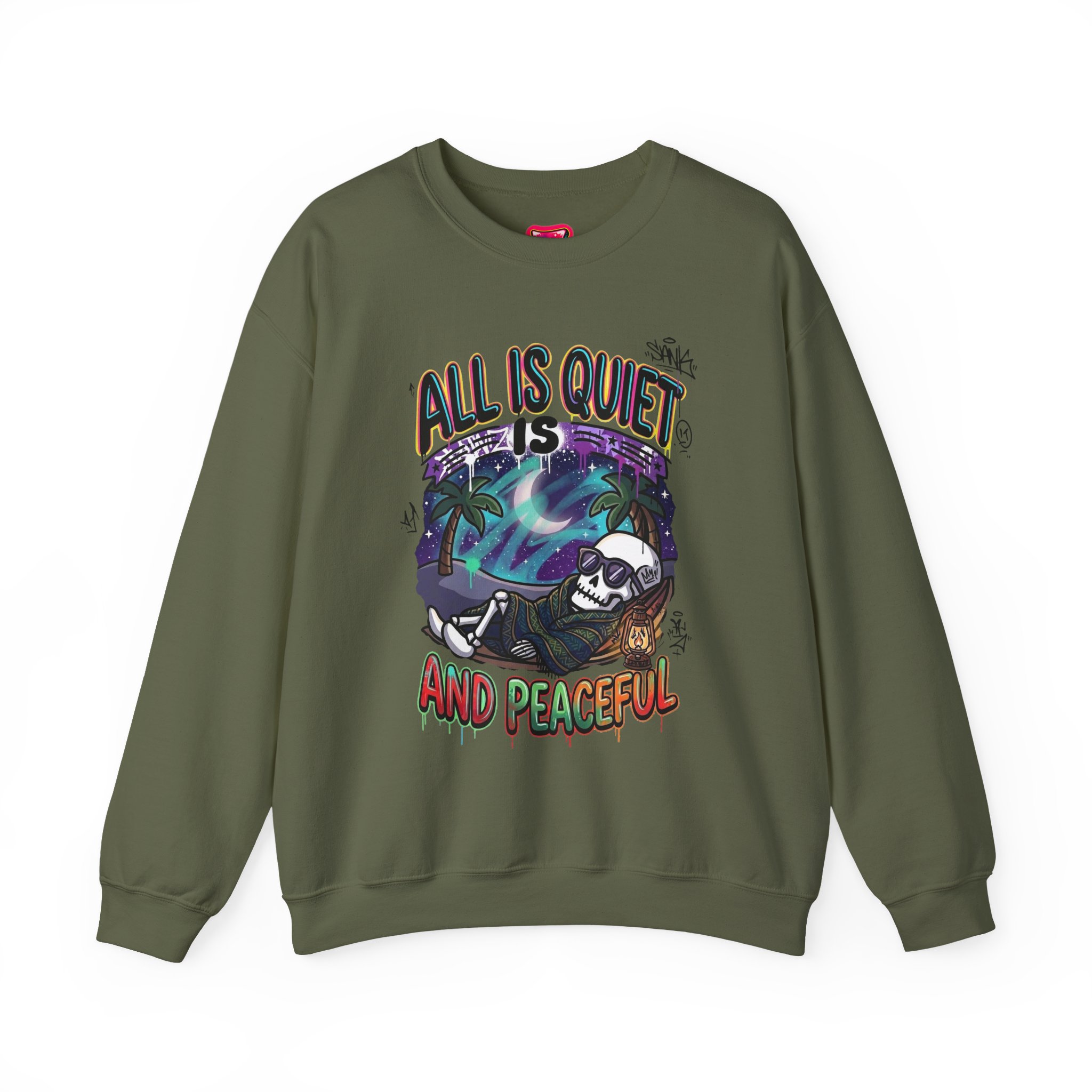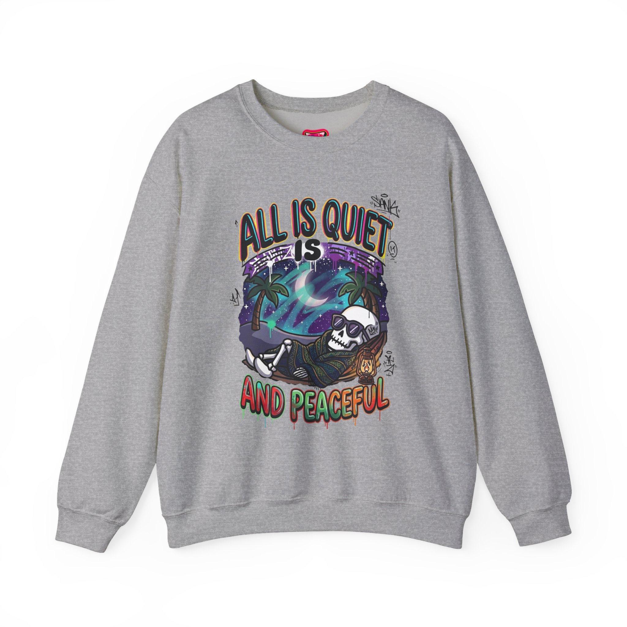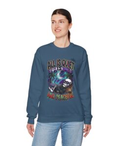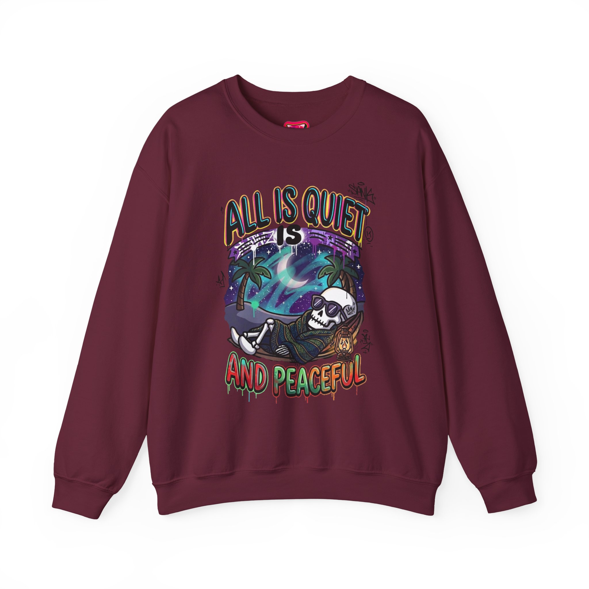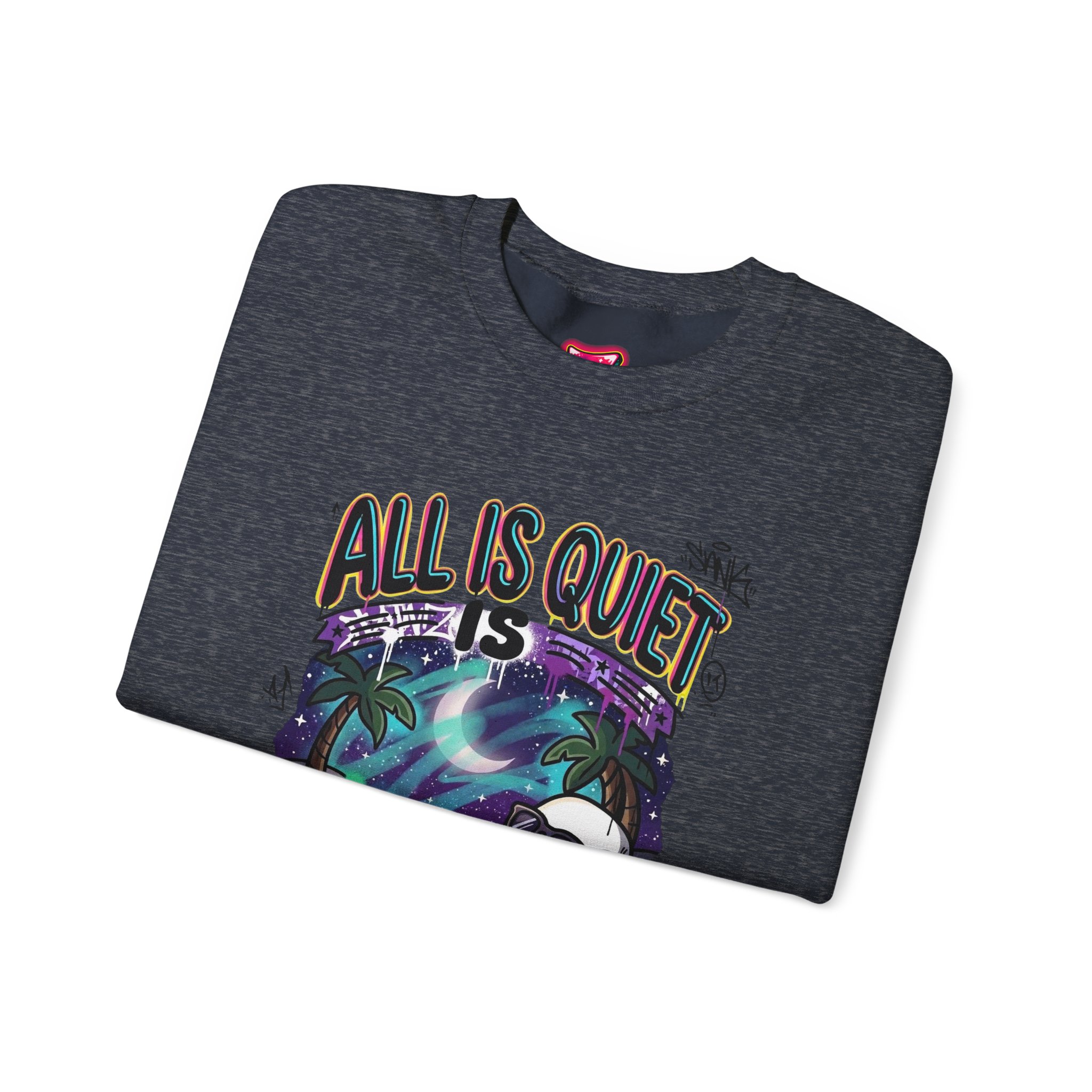 Eye-catching sweatshirt design featuring a mischievous raccoon hiding behind the phrase All Is Quiet and Peaceful. A playful contrast of chaos and calm, combined with graffiti-inspired typography, bold colors, and urban street-art energy. Perfect for animal lovers, streetwear fans, and anyone who enjoys sarcastic humor with standout style. Great for casual wear, gifts, and cozy fashion collections.