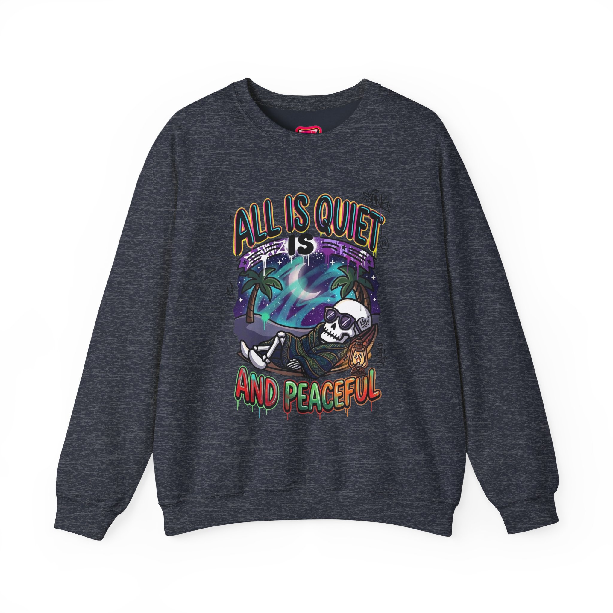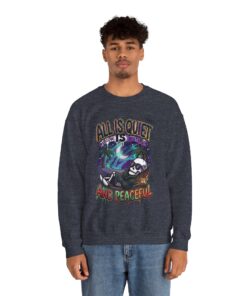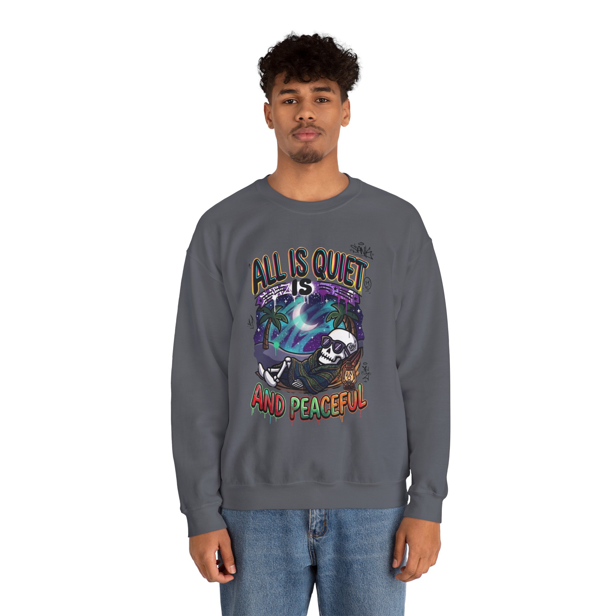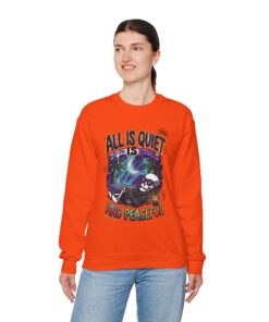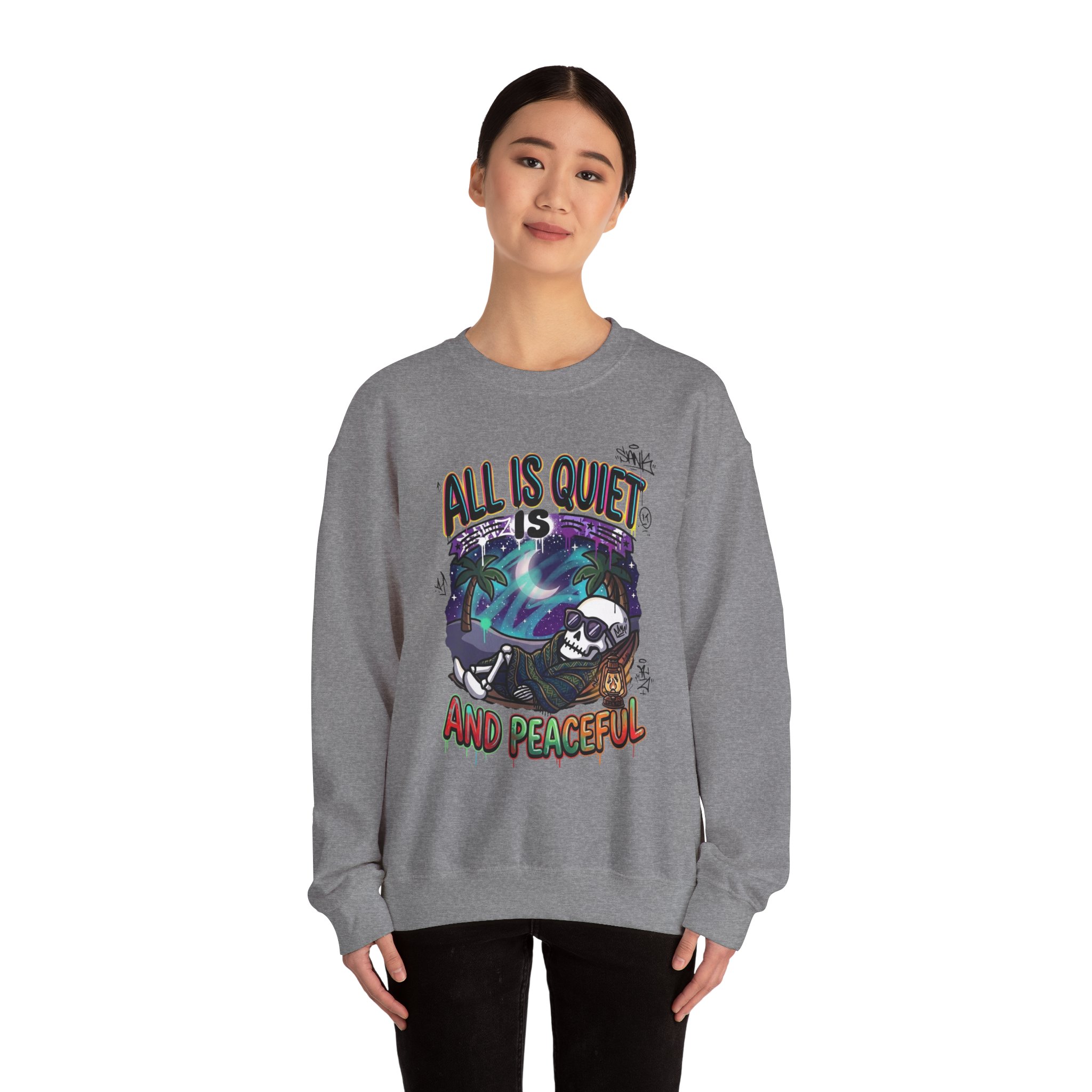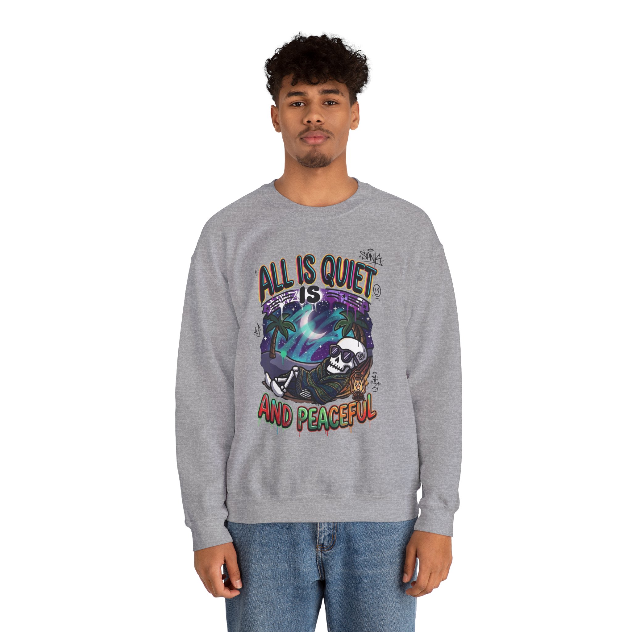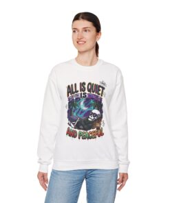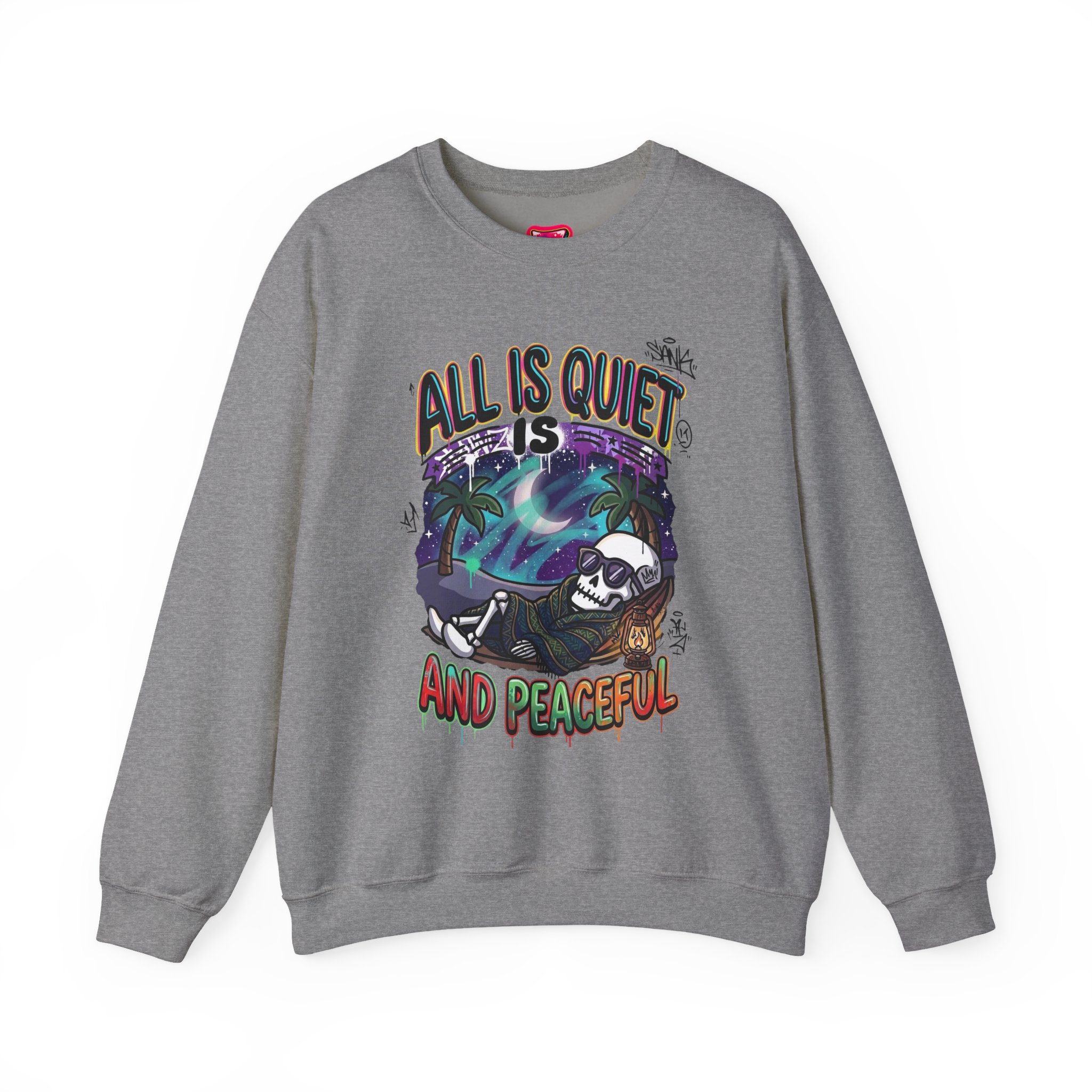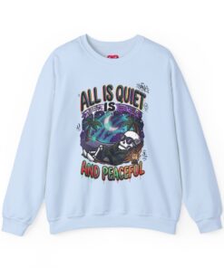 Eye-catching sweatshirt design featuring a mischievous raccoon hiding behind the phrase All Is Quiet and Peaceful. A playful contrast of chaos and calm, combined with graffiti-inspired typography, bold colors, and urban street-art energy. Perfect for animal lovers, streetwear fans, and anyone who enjoys sarcastic humor with standout style. Great for casual wear, gifts, and cozy fashion collections.