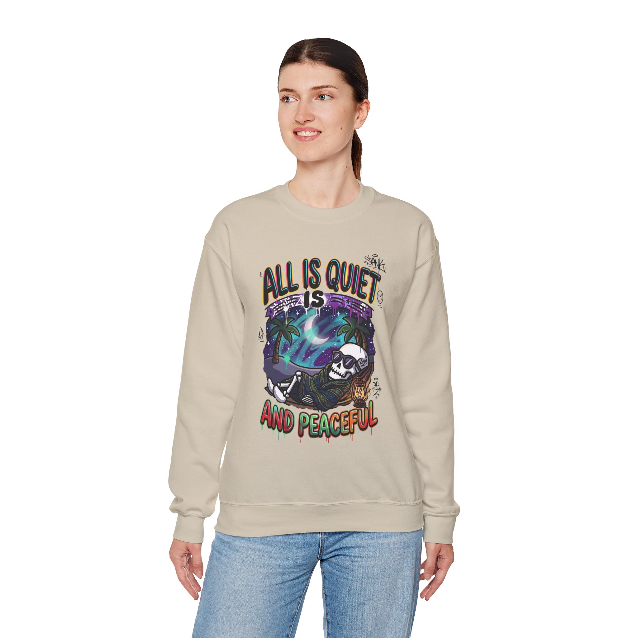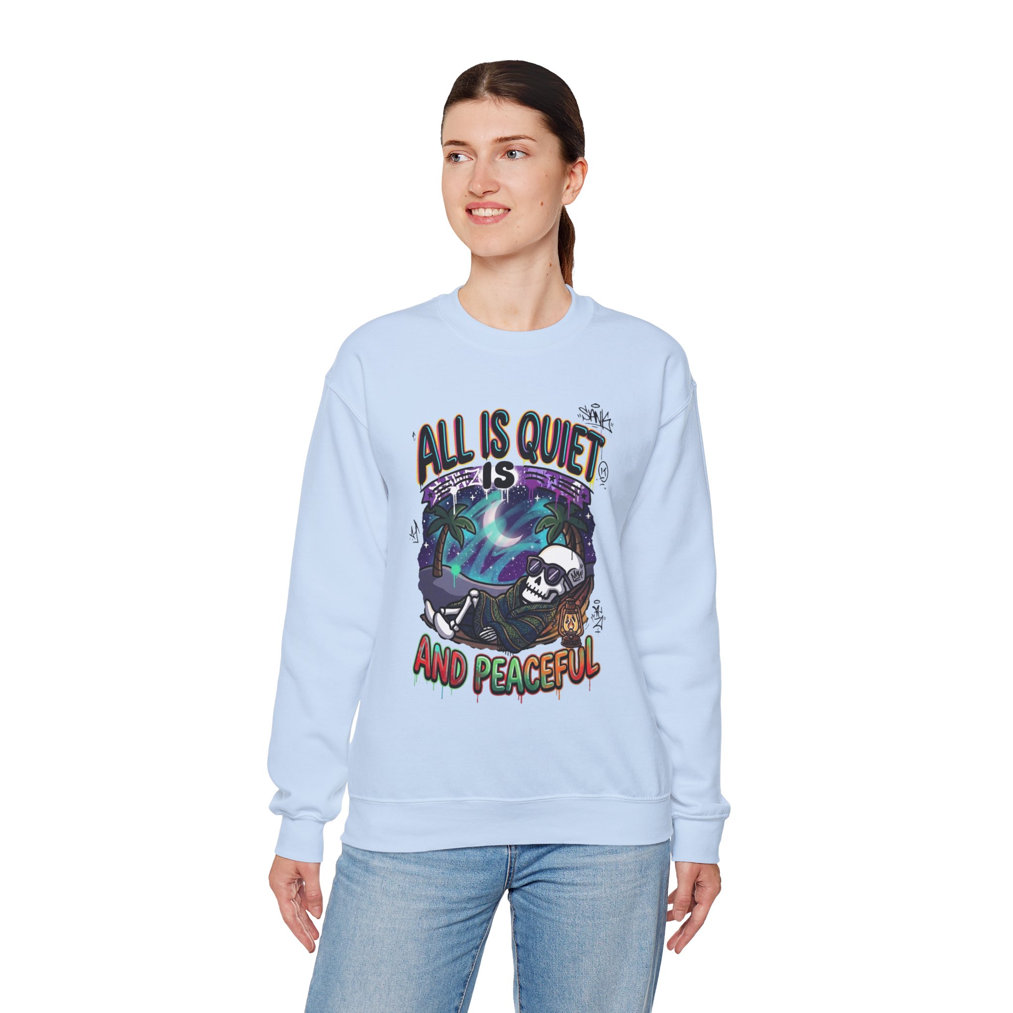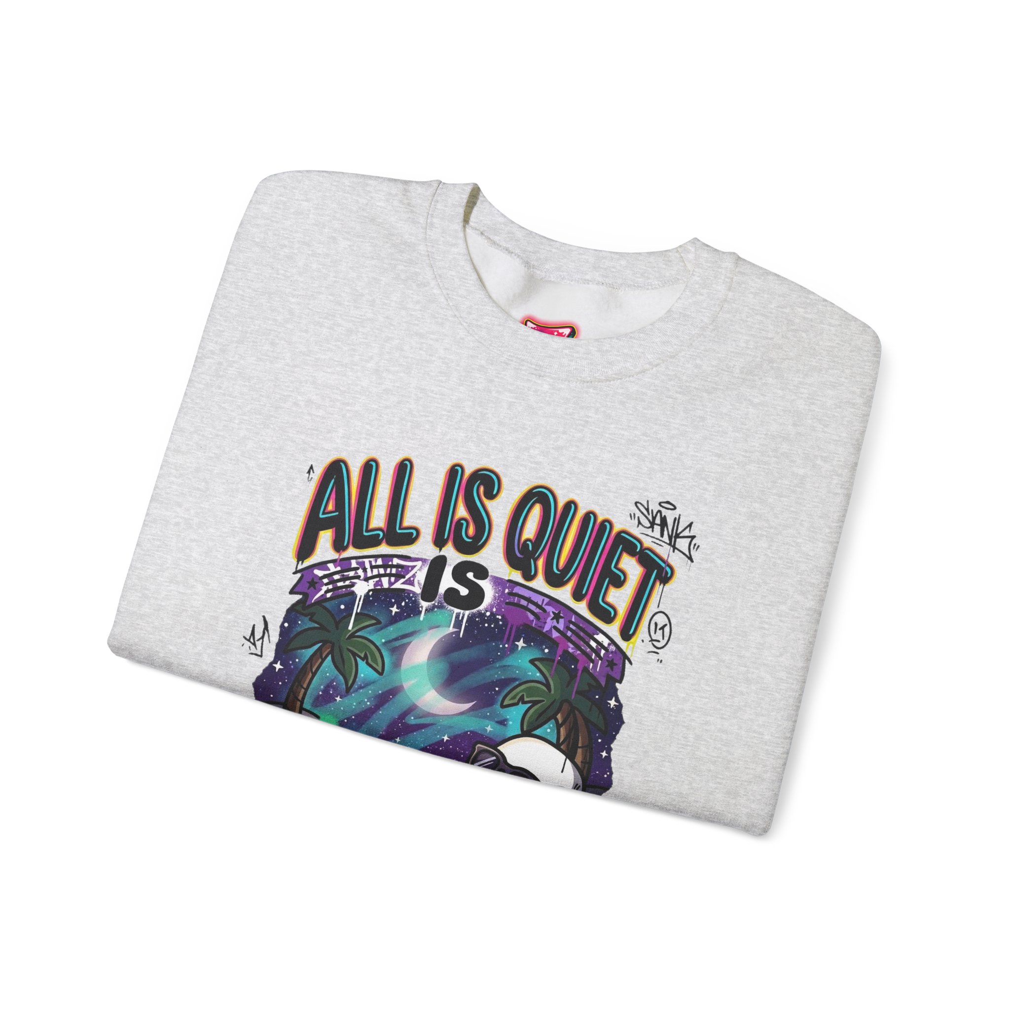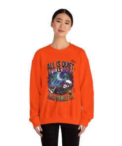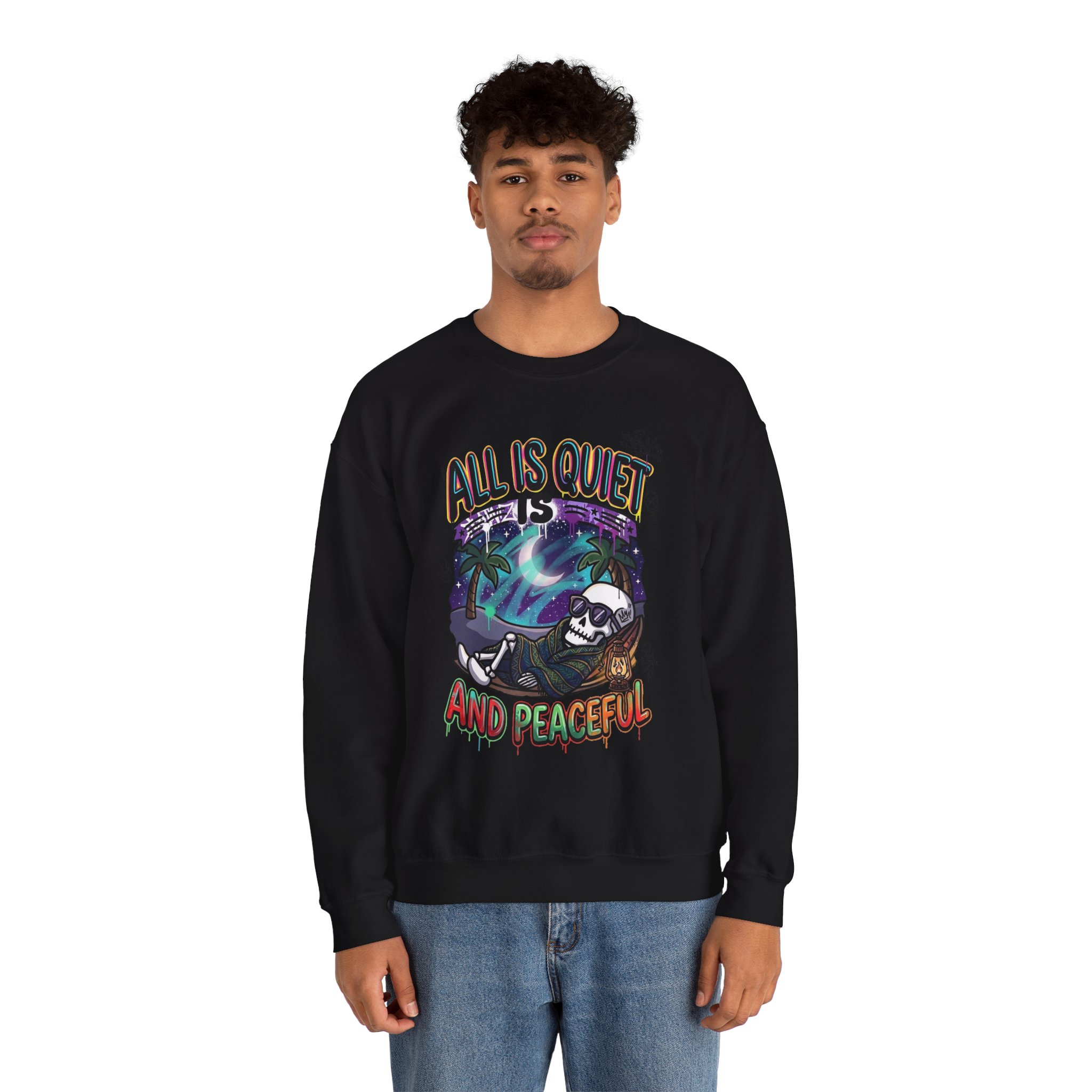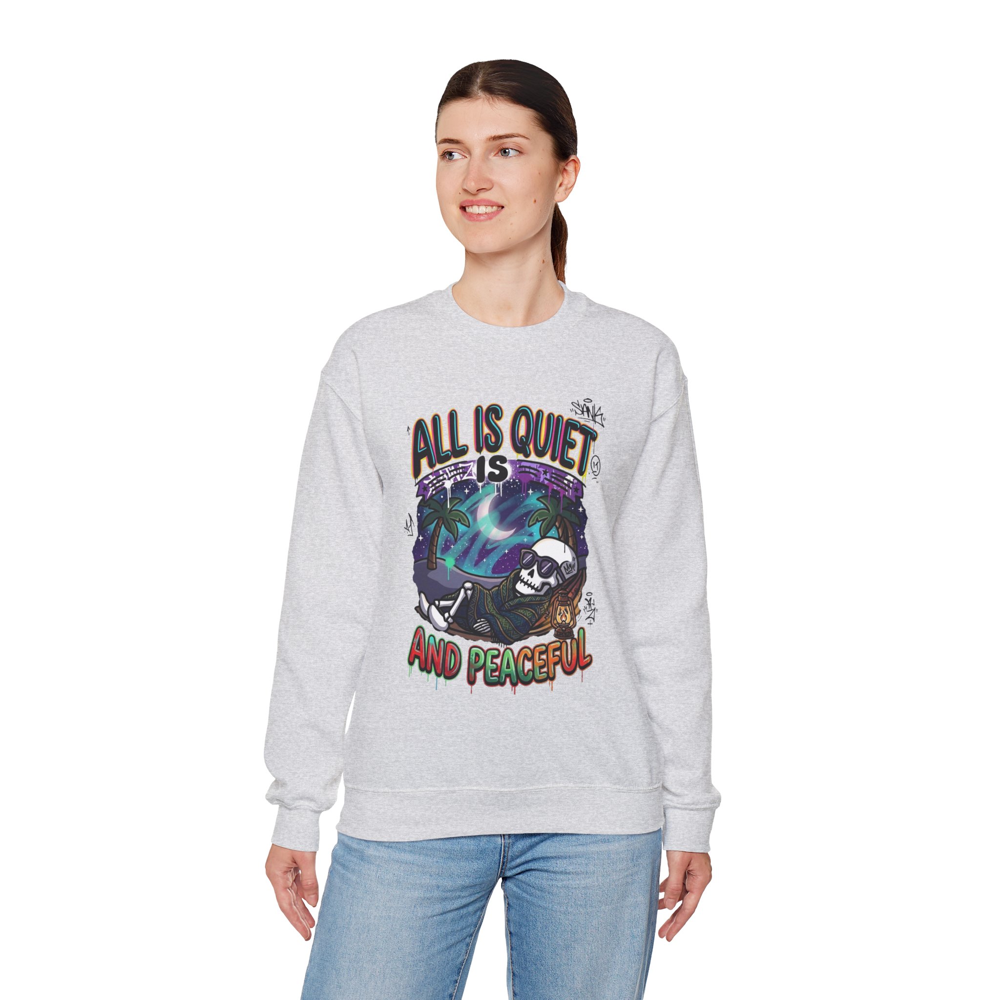 Eye-catching sweatshirt design featuring a mischievous raccoon hiding behind the phrase All Is Quiet and Peaceful. A playful contrast of chaos and calm, combined with graffiti-inspired typography, bold colors, and urban street-art energy. Perfect for animal lovers, streetwear fans, and anyone who enjoys sarcastic humor with standout style. Great for casual wear, gifts, and cozy fashion collections.