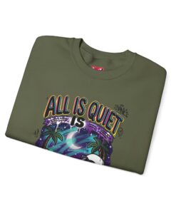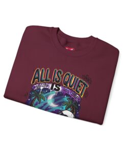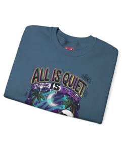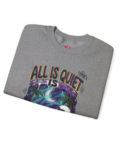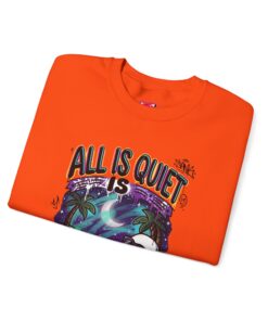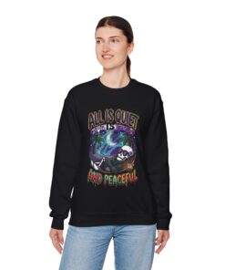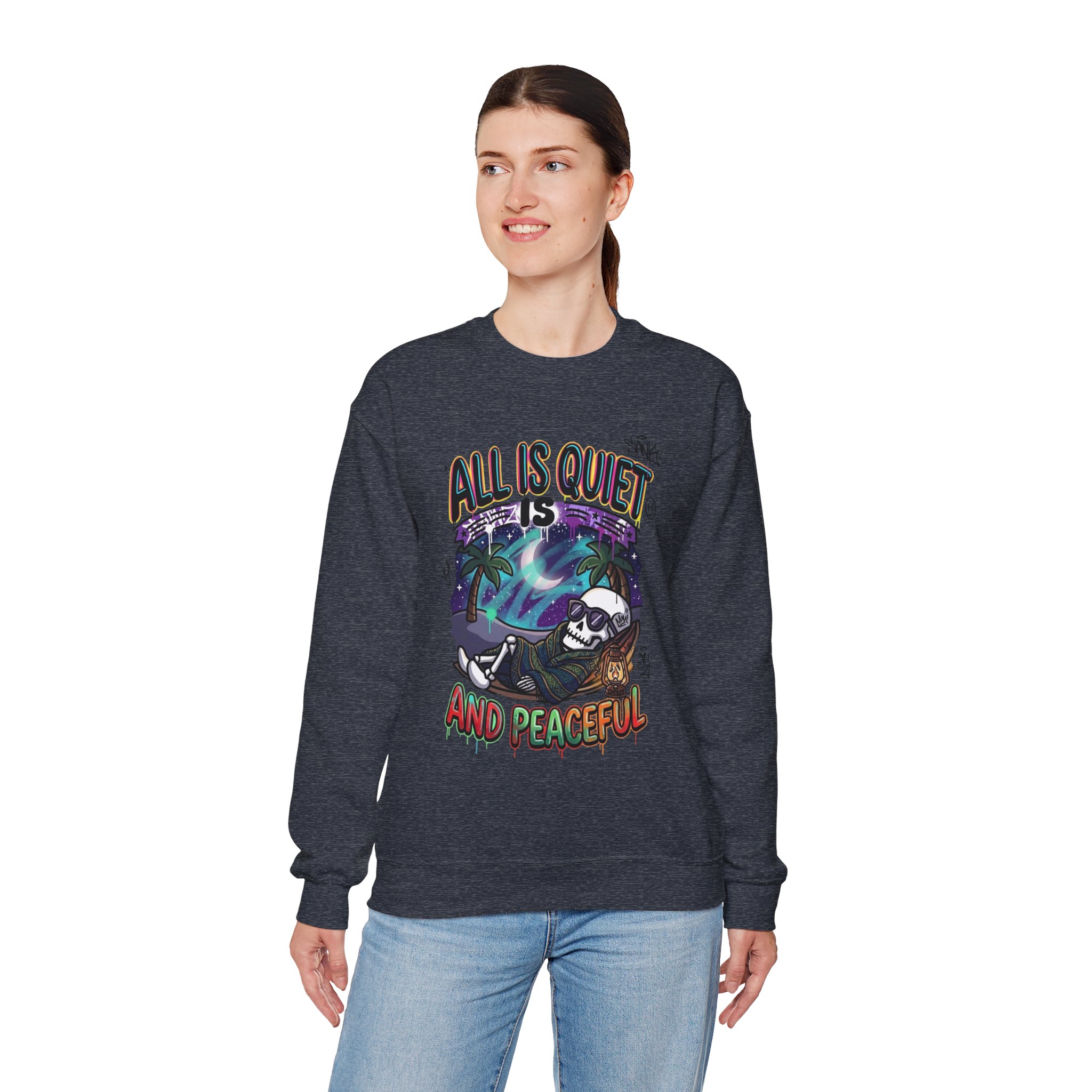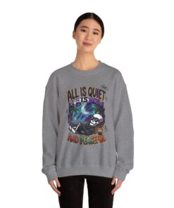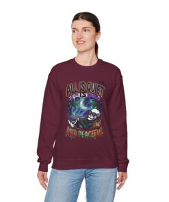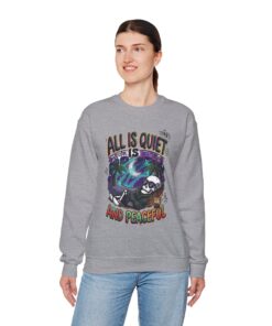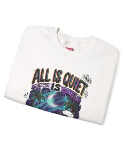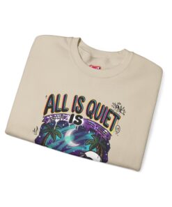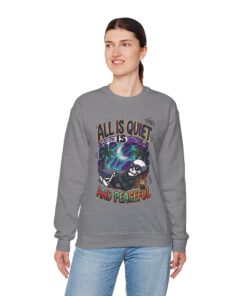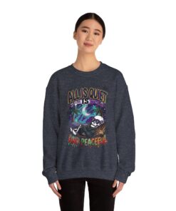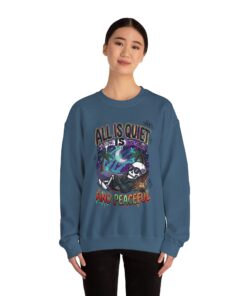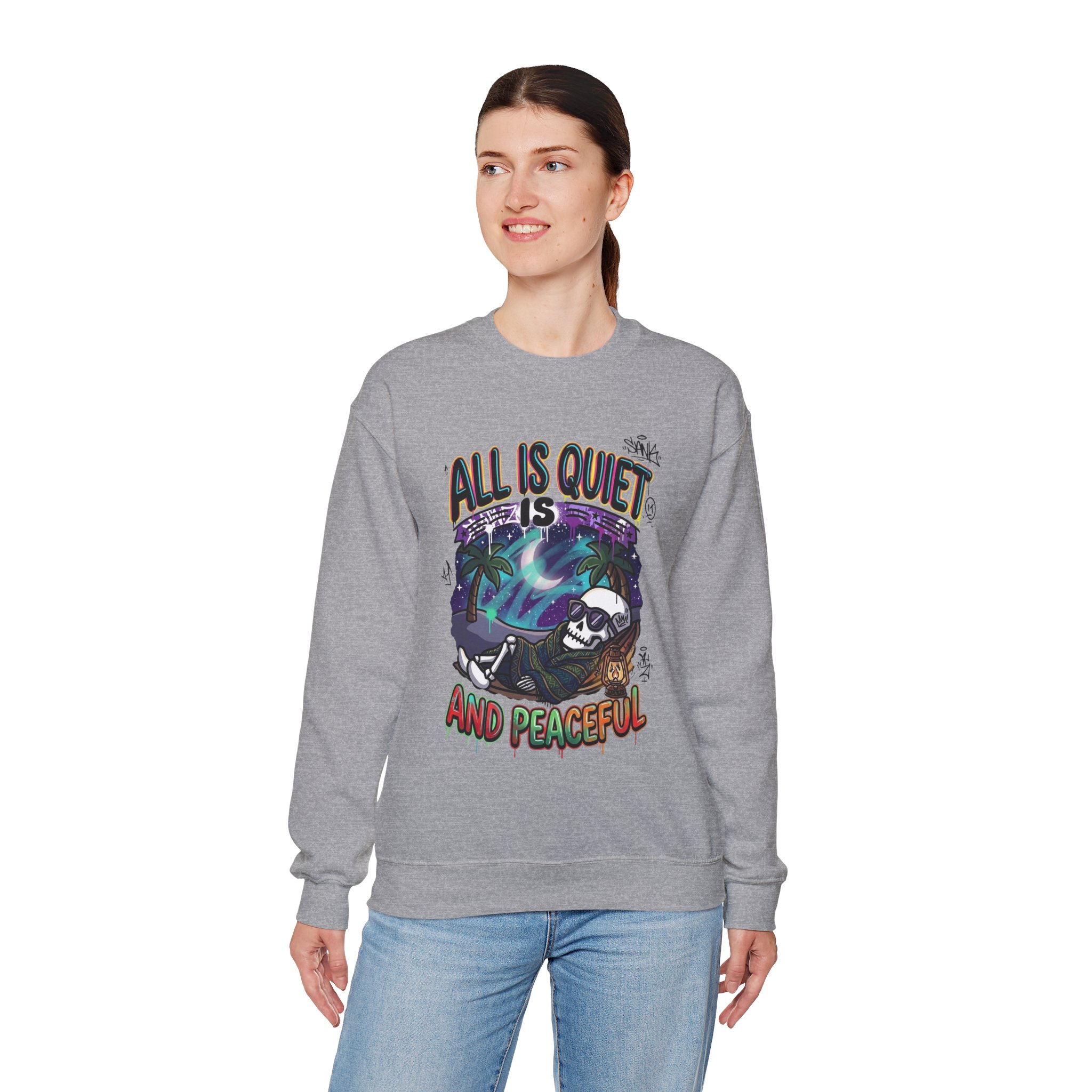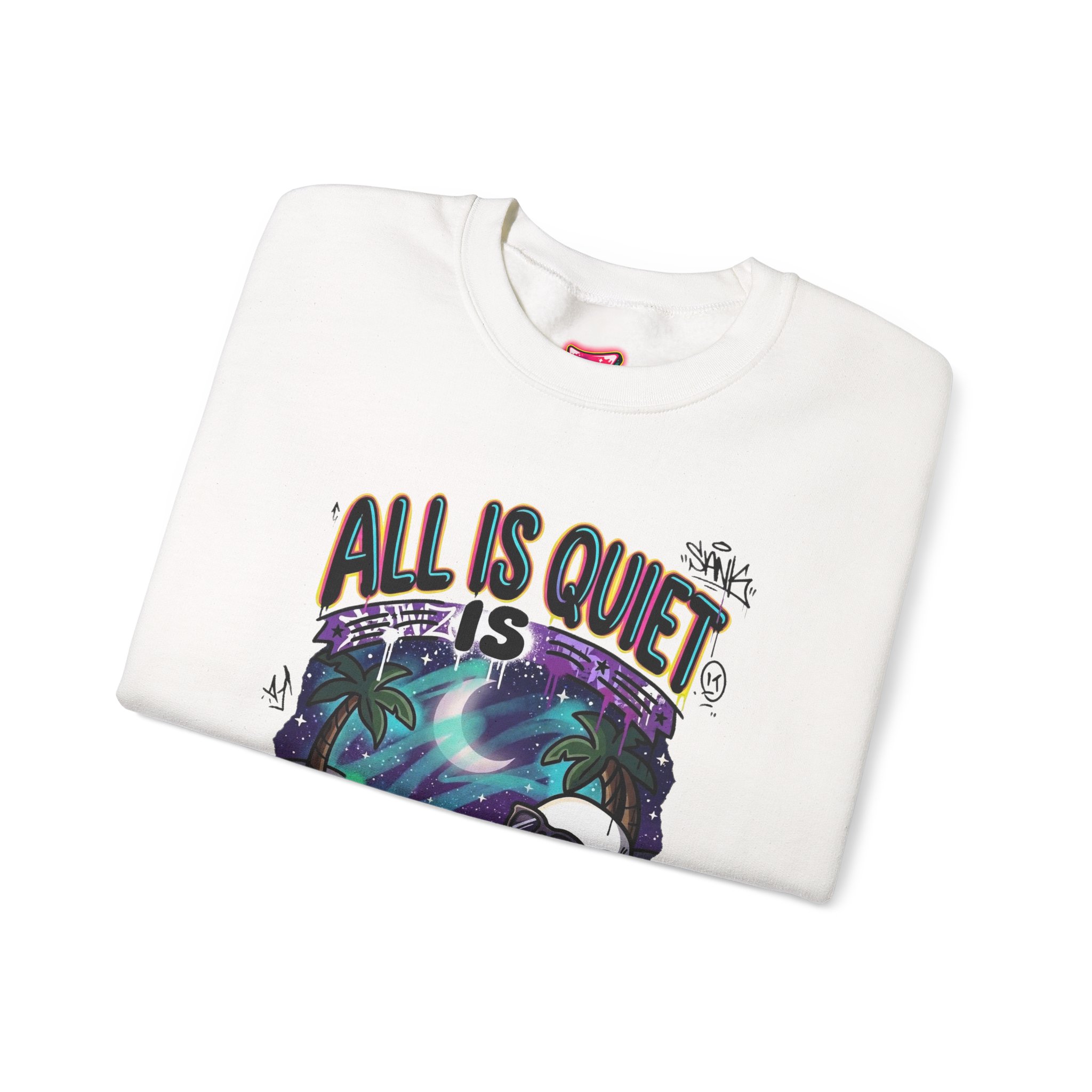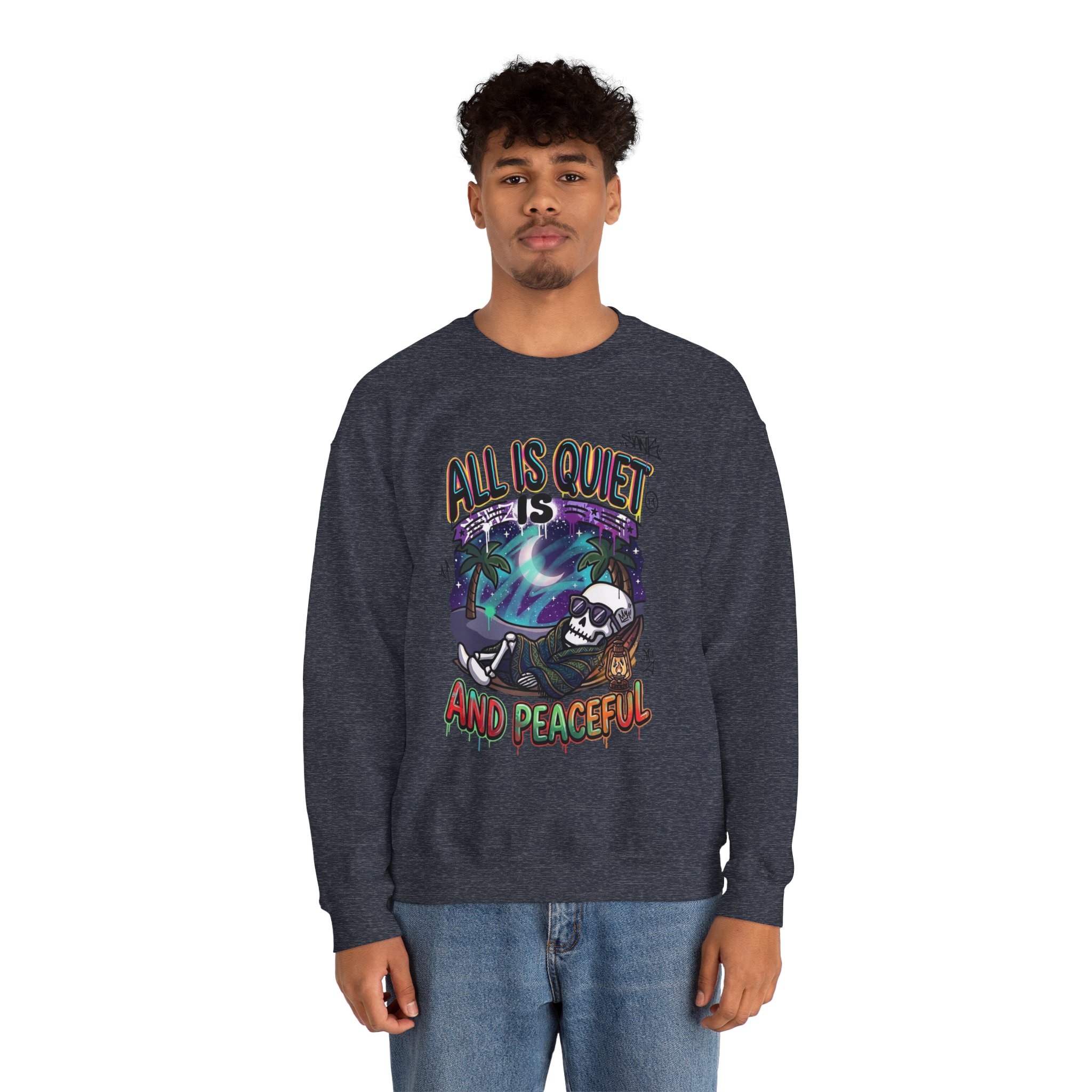 Eye-catching sweatshirt design featuring a mischievous raccoon hiding behind the phrase All Is Quiet and Peaceful. A playful contrast of chaos and calm, combined with graffiti-inspired typography, bold colors, and urban street-art energy. Perfect for animal lovers, streetwear fans, and anyone who enjoys sarcastic humor with standout style. Great for casual wear, gifts, and cozy fashion collections.