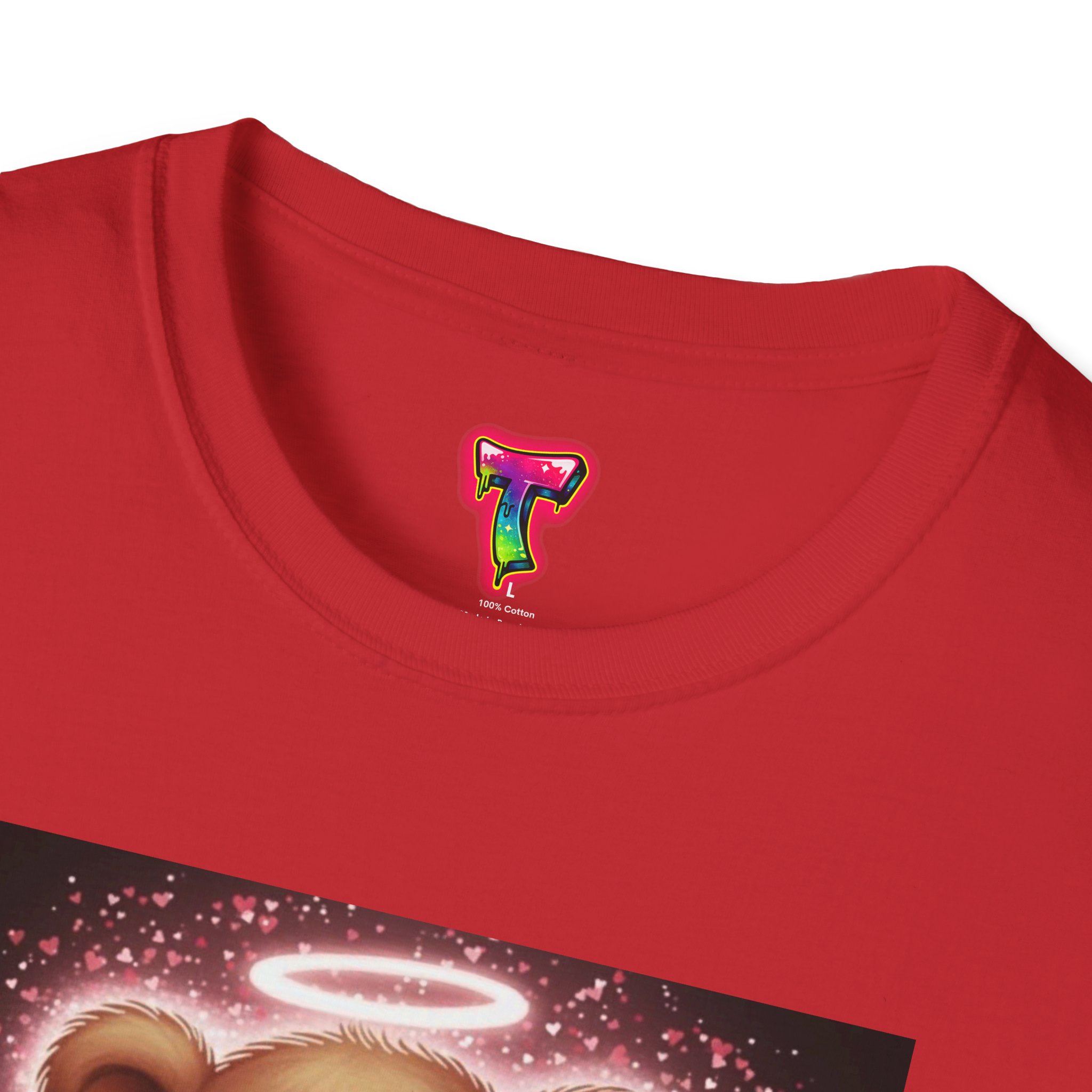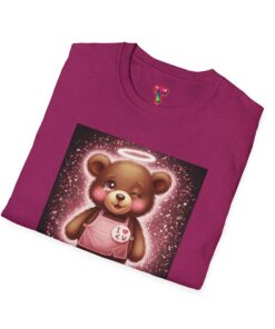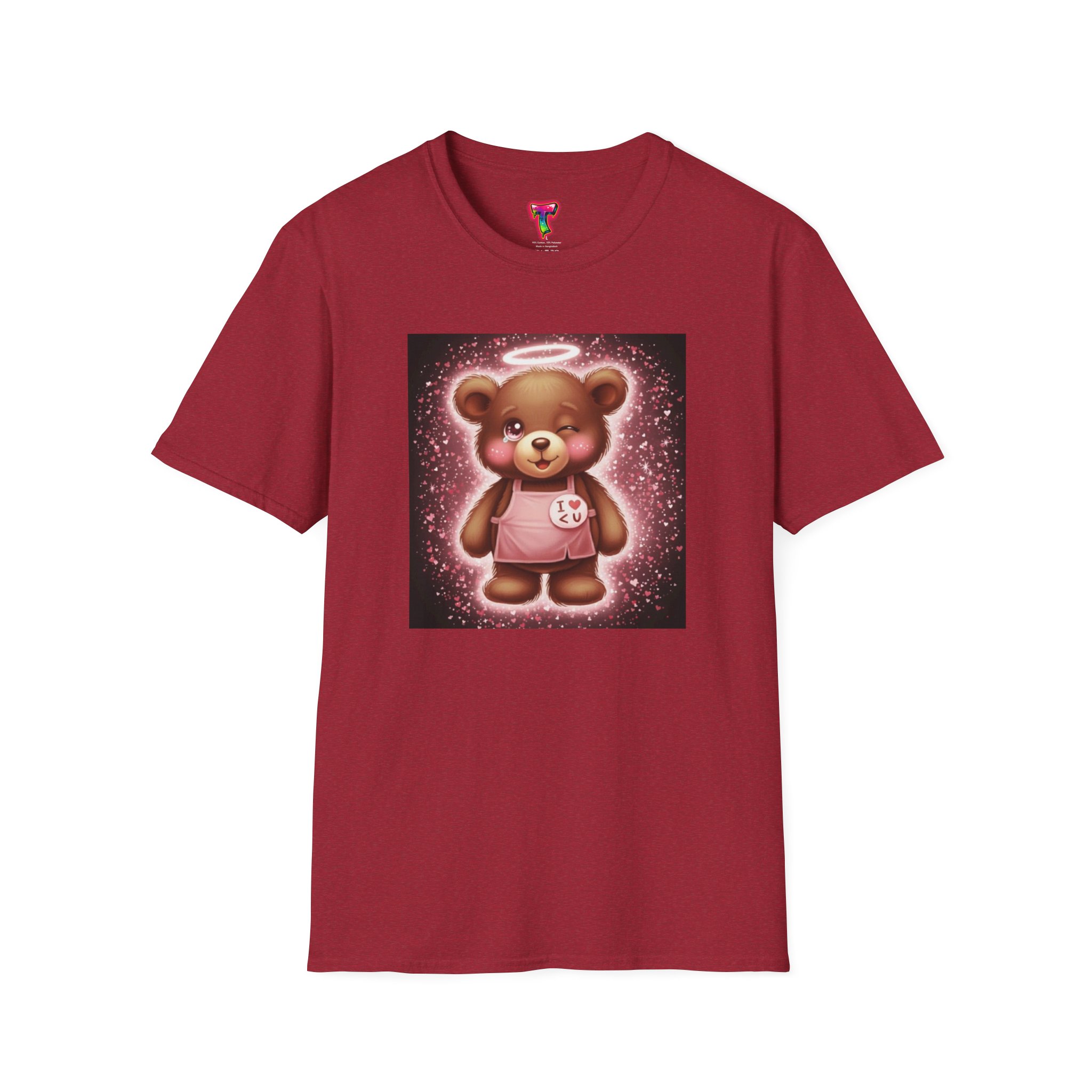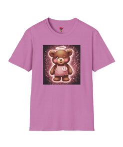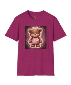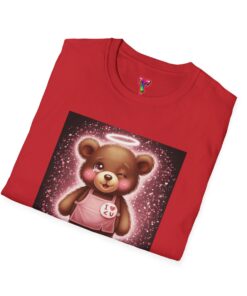A lightweight, ring-spun cotton tee that brings a warm, playful touch to everyday wear. The soft coral shirt features a vintage-style teddy bear print framed by a soft glowing background — nostalgic and quietly cheerful. Smooth, durable fabric and a clean crew neckline make it comfortable for long days, while the pearlized tear-away label keeps the neck free from irritation. Subtle details like ribbed collar, shoulder tape, and tubular knit give a polished fit that holds its shape. Wear it around the house, out for a casual meet-up, or layered under a jacket for a soft pop of personality.