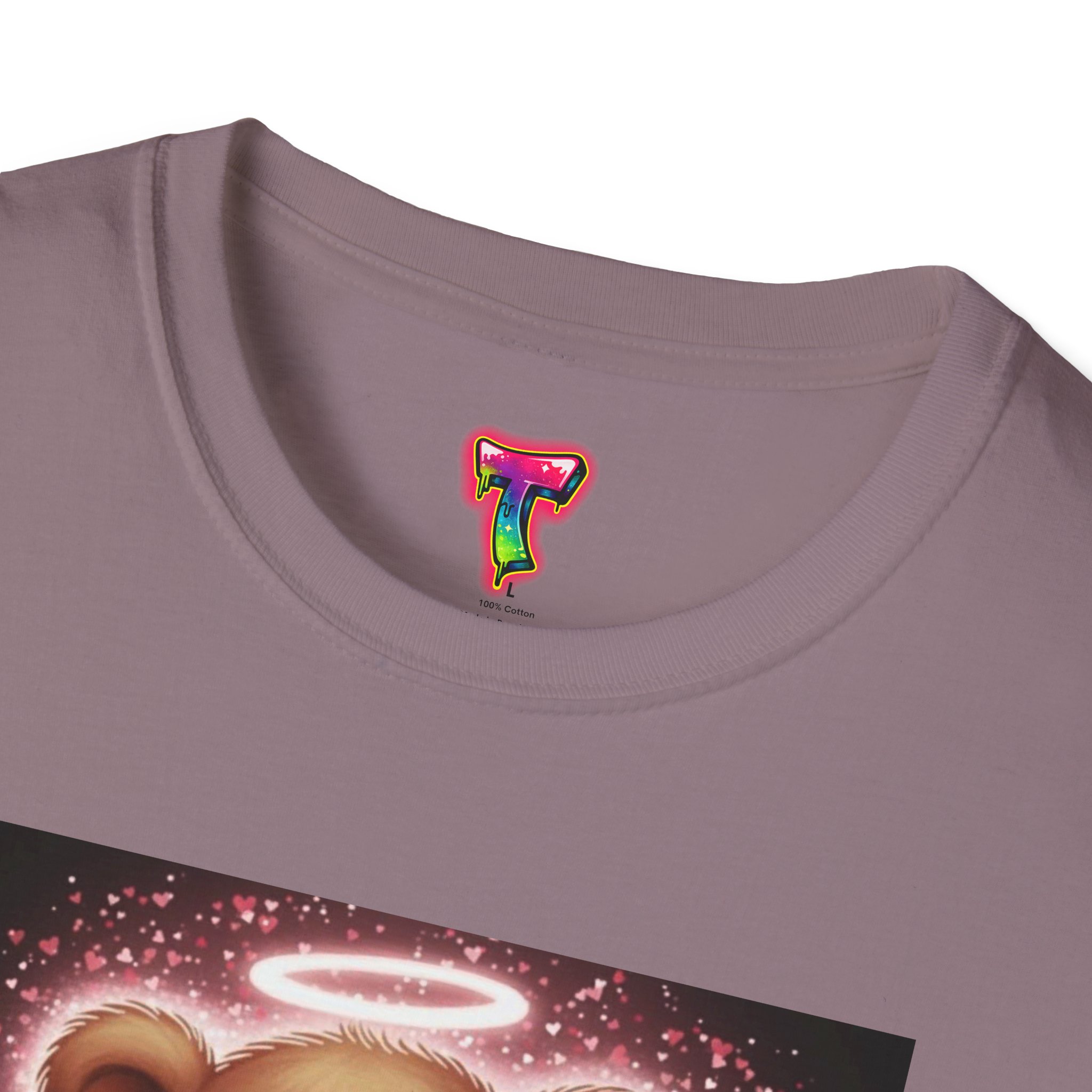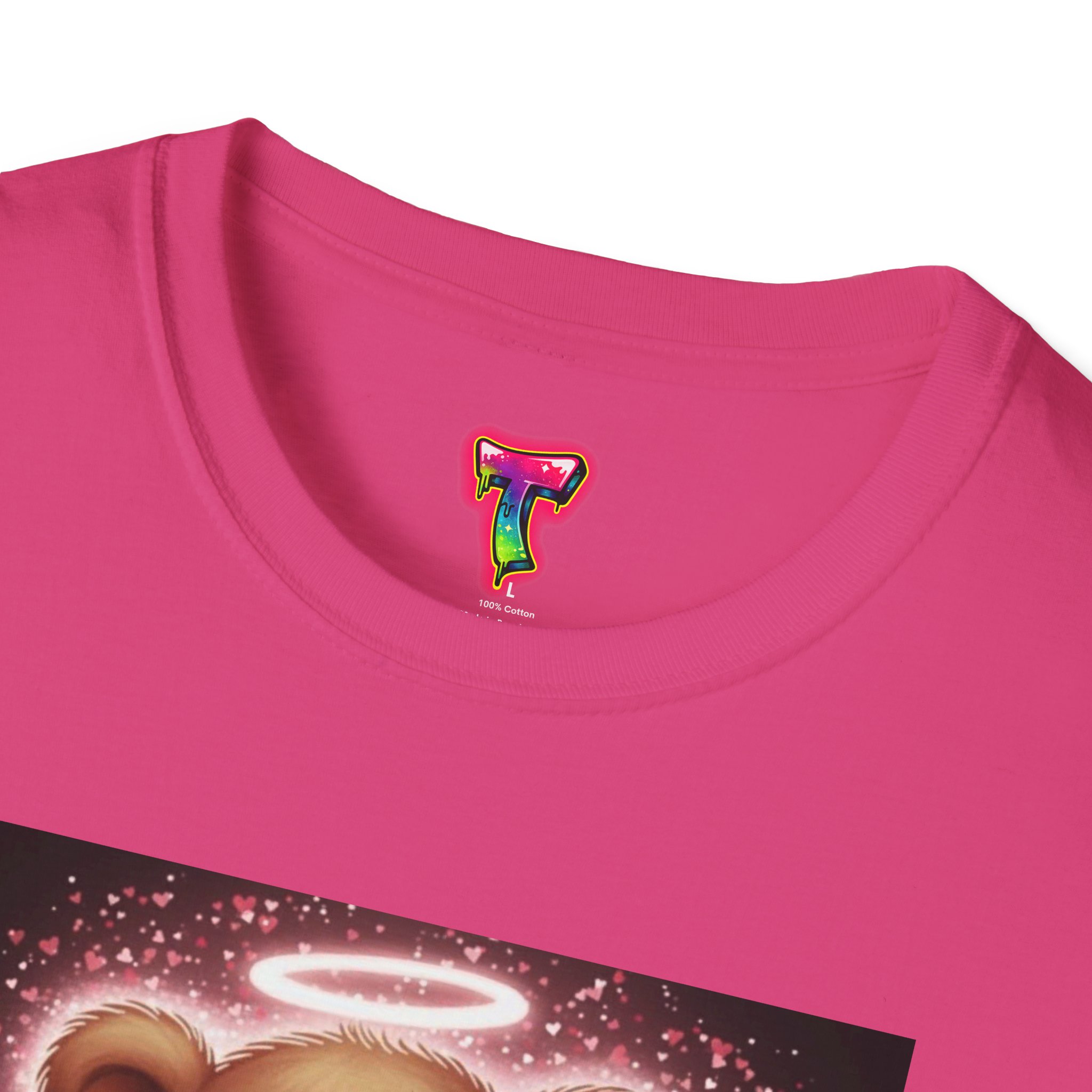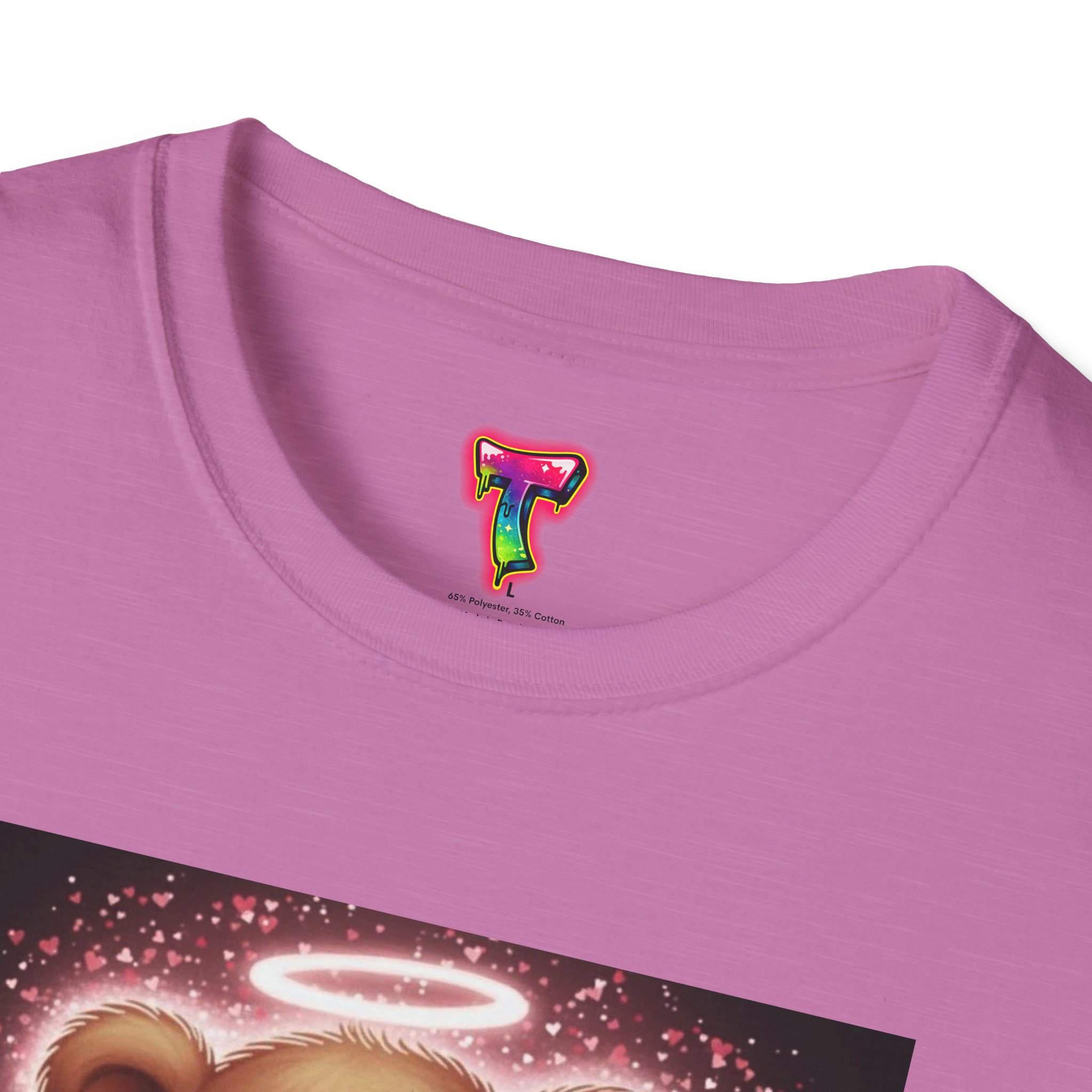 A lightweight, ring-spun cotton tee that brings a warm, playful touch to everyday wear. The soft coral shirt features a vintage-style teddy bear print framed by a soft glowing background — nostalgic and quietly cheerful. Smooth, durable fabric and a clean crew neckline make it comfortable for long days, while the pearlized tear-away label keeps the neck free from irritation. Subtle details like ribbed collar, shoulder tape, and tubular knit give a polished fit that holds its shape. Wear it around the house, out for a casual meet-up, or layered under a jacket for a soft pop of personality.