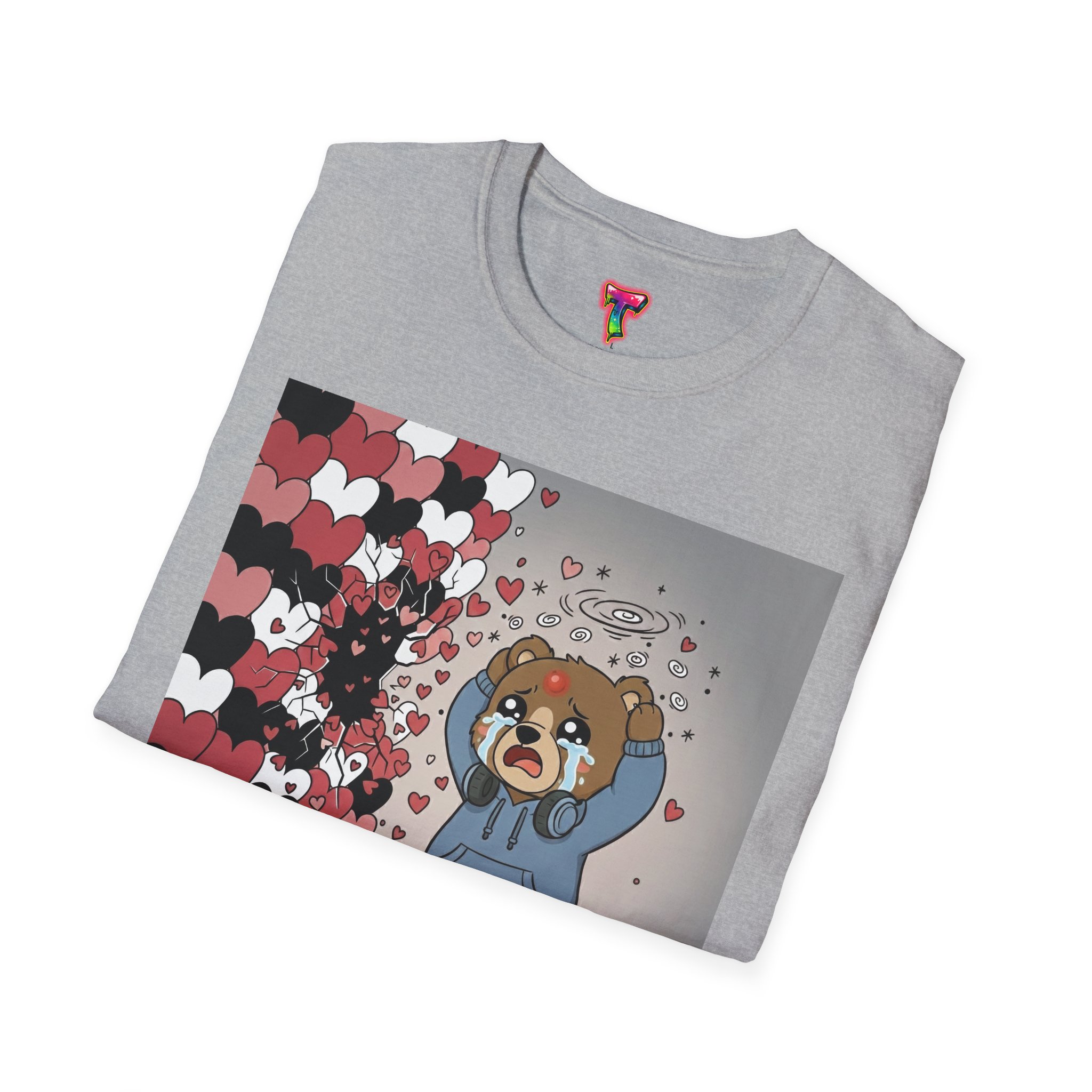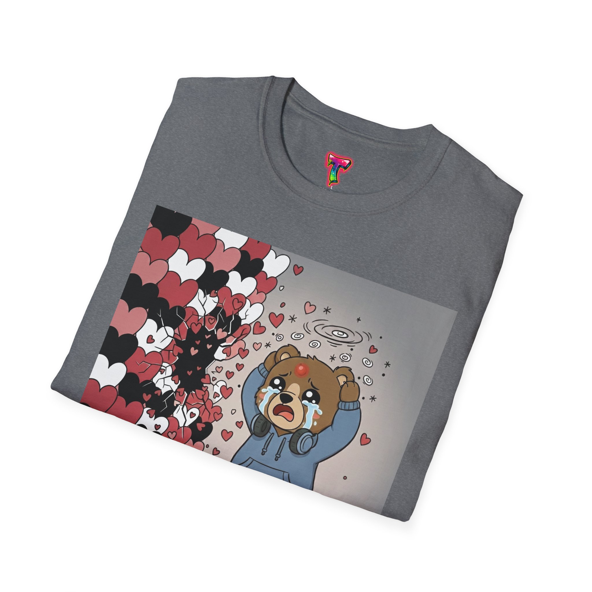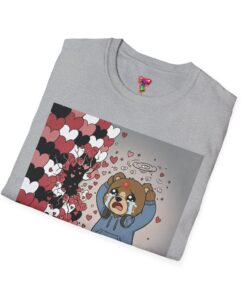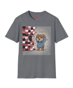 A soft, everyday tee that carries warmth and a little playful heart. The front art shows a wide-eyed, hoodie-wearing bear showered in drifting hearts — a gentle, whimsical moment that reads like a hug. Lightweight ring-spun cotton feels smooth against the skin and the tubular knit (no side seams) keeps the silhouette clean and comfortable. Thoughtful details like a ribbed collar, shoulder tape for shape retention, and a pearlized tear-away label make this shirt easy to wear all day. Wear it to cozy meetups, low-key dates, or whenever you want to share a quiet, sincere vibe.