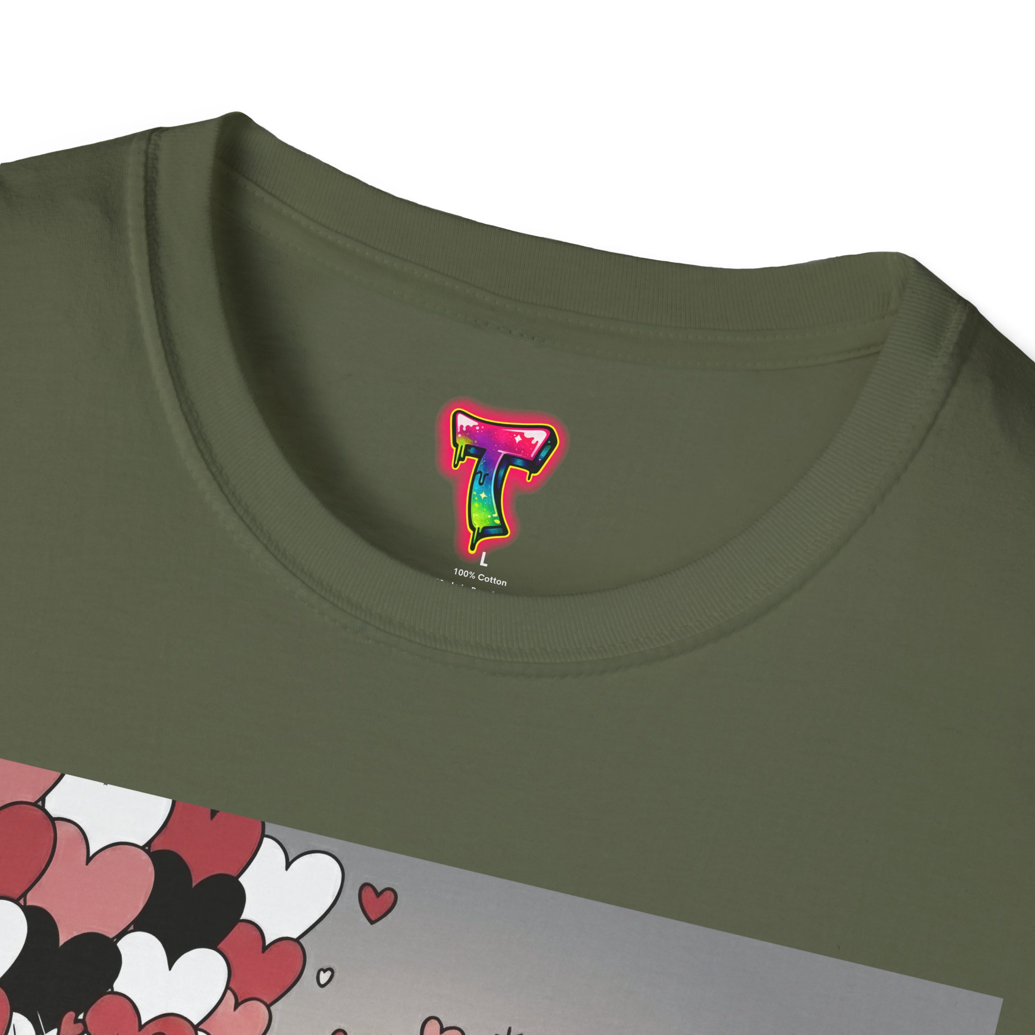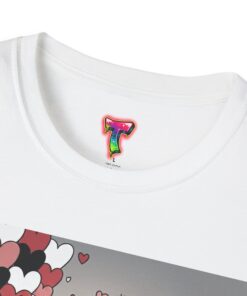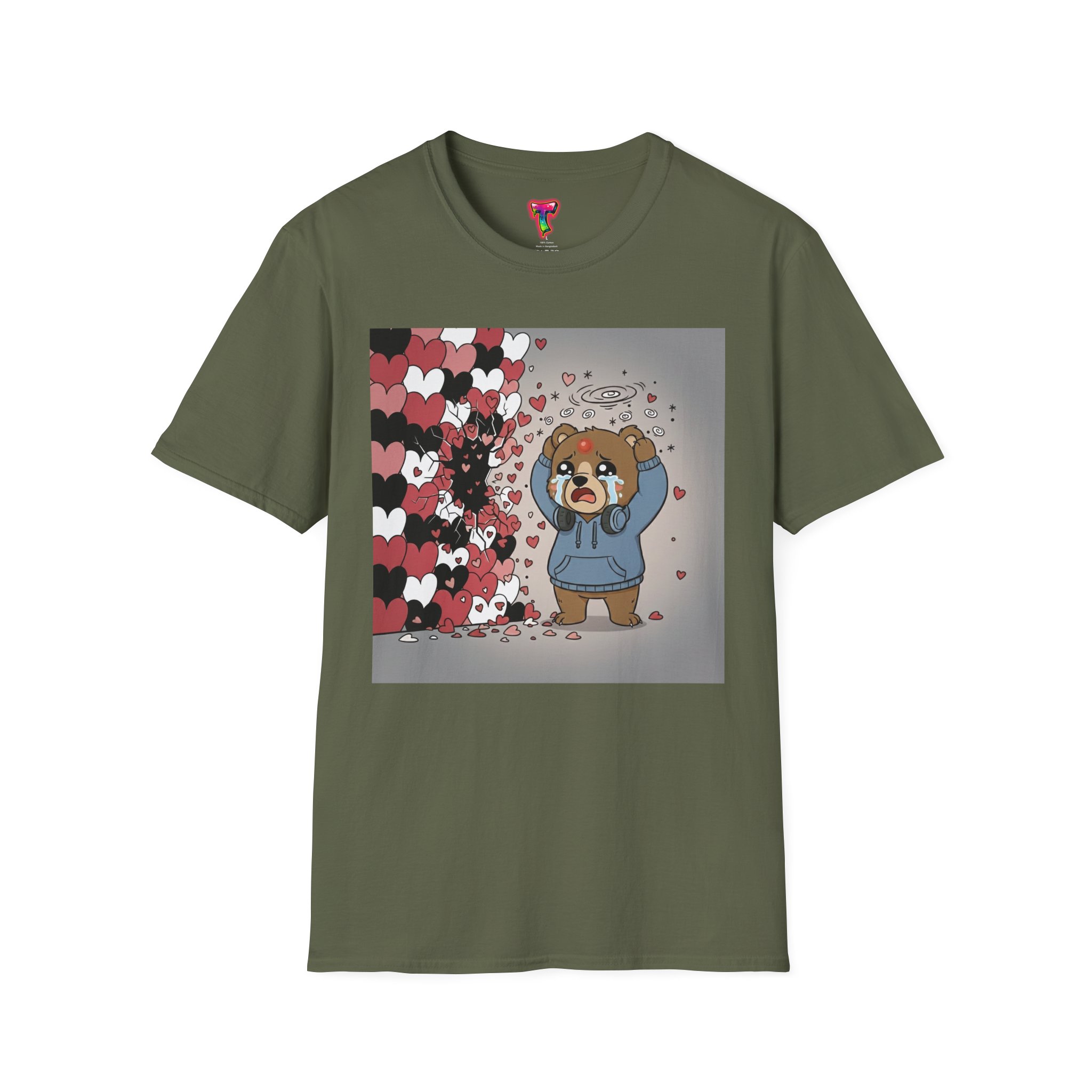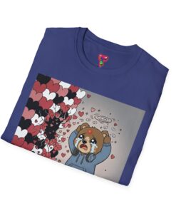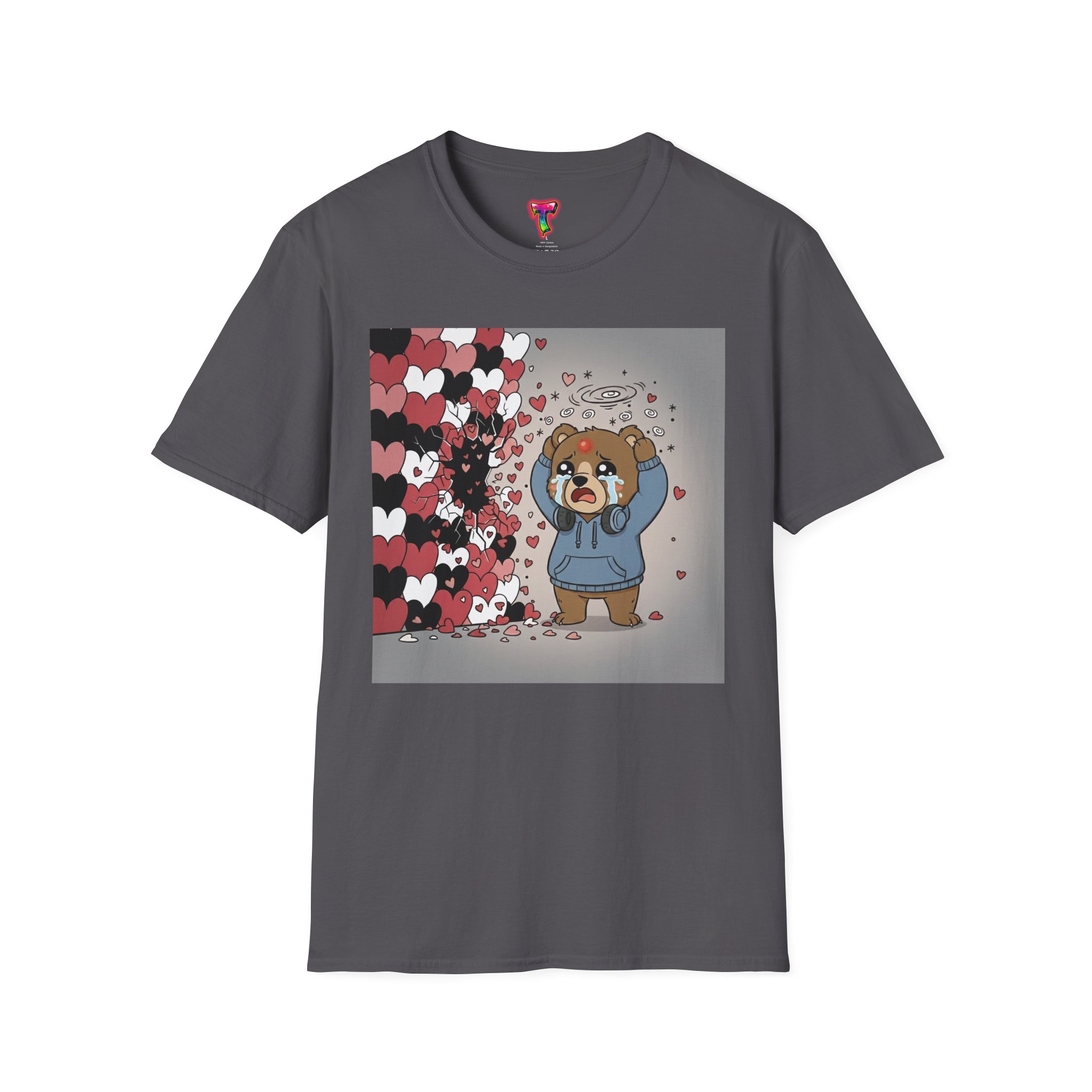 A soft, everyday tee that carries warmth and a little playful heart. The front art shows a wide-eyed, hoodie-wearing bear showered in drifting hearts — a gentle, whimsical moment that reads like a hug. Lightweight ring-spun cotton feels smooth against the skin and the tubular knit (no side seams) keeps the silhouette clean and comfortable. Thoughtful details like a ribbed collar, shoulder tape for shape retention, and a pearlized tear-away label make this shirt easy to wear all day. Wear it to cozy meetups, low-key dates, or whenever you want to share a quiet, sincere vibe.