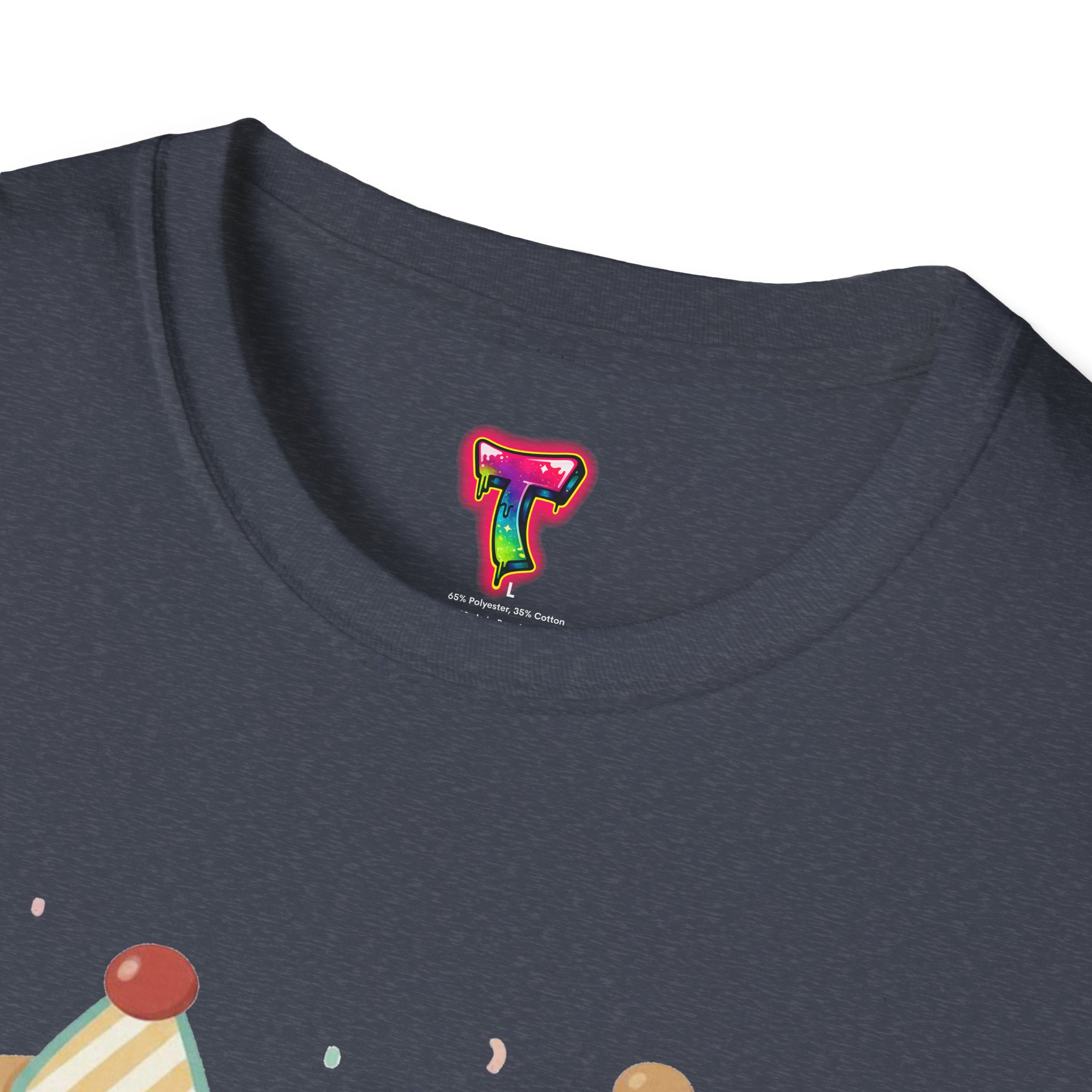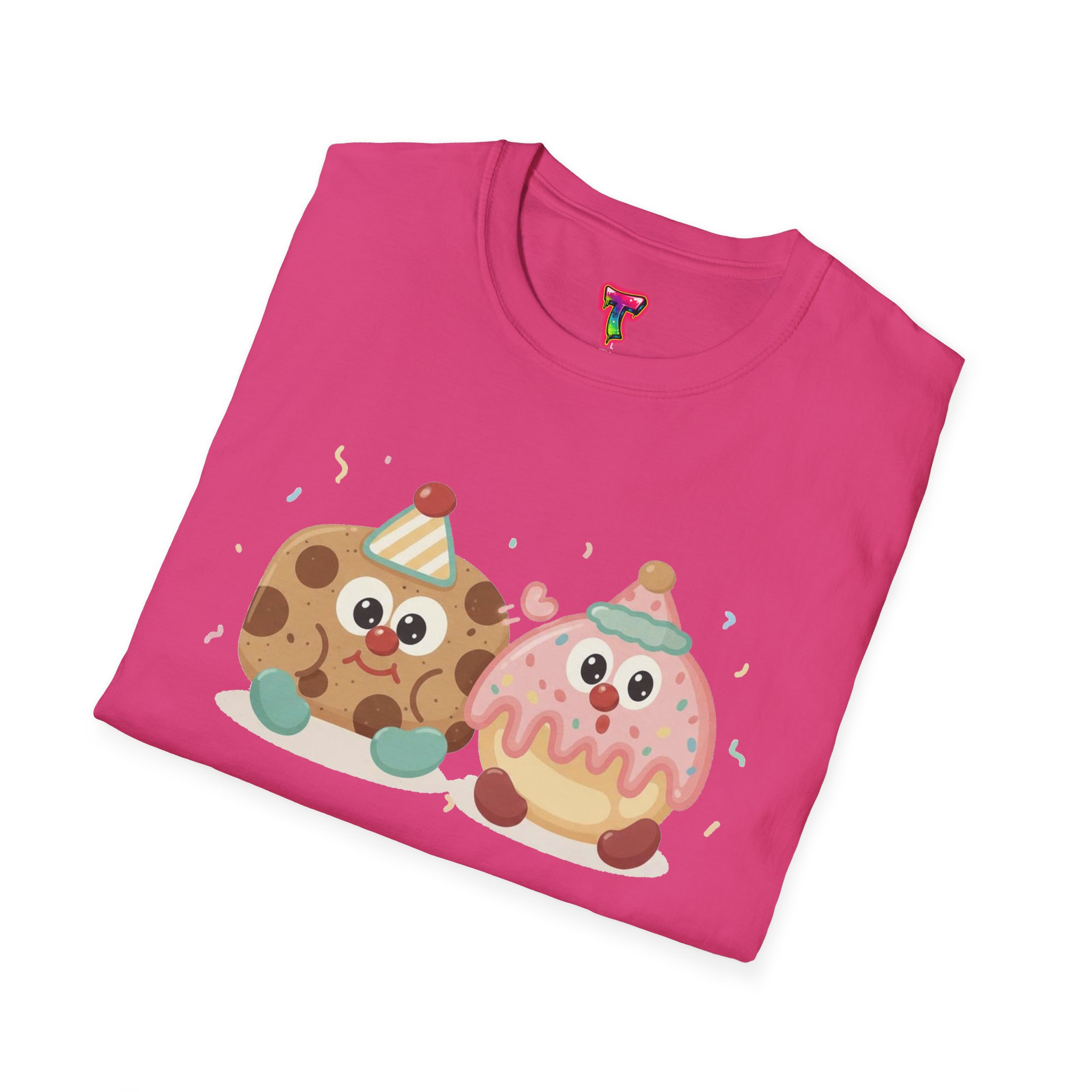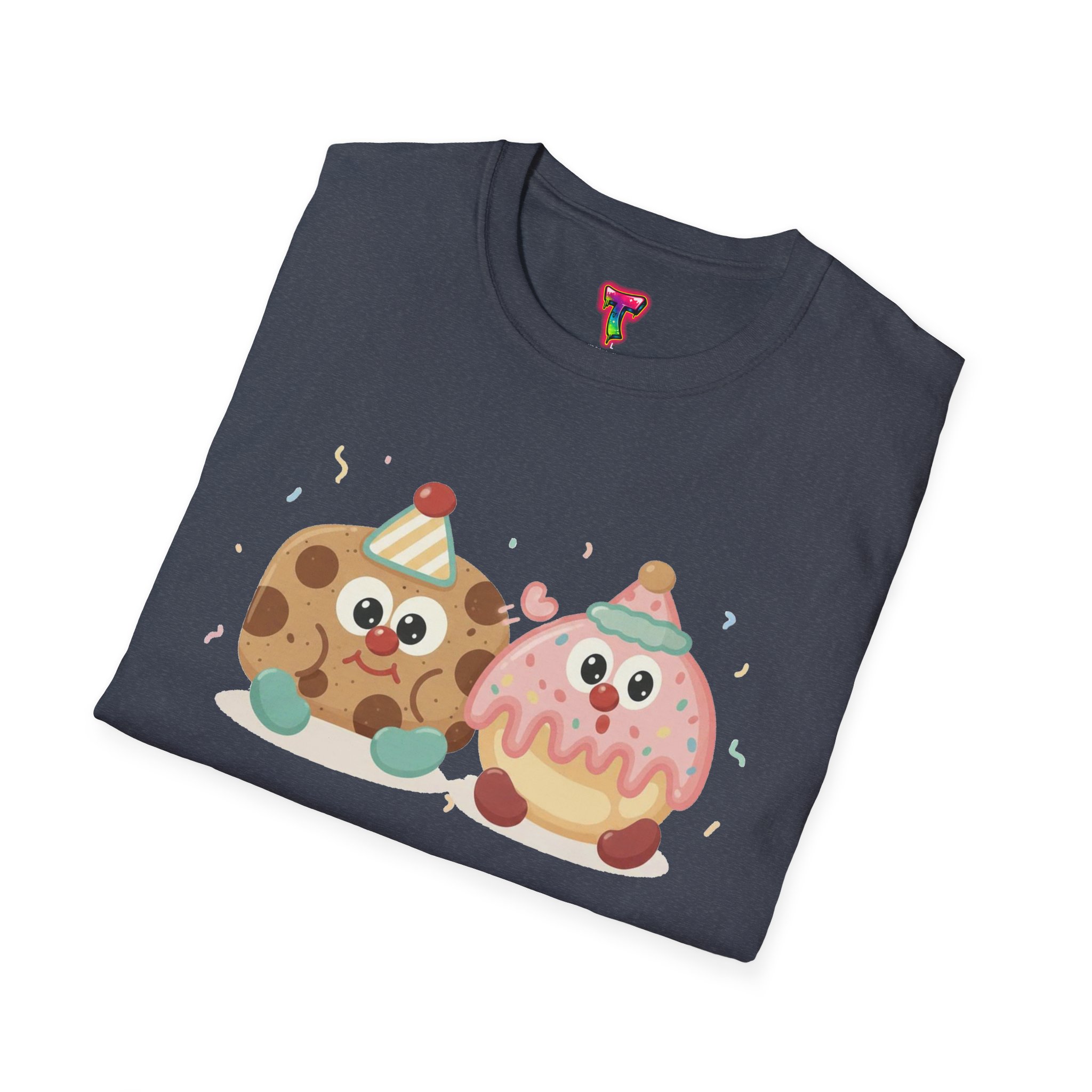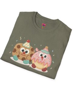 This lightweight cotton tee carries a playful illustrated duo — a chipper cookie and a blushing donut, both wearing tiny party hats and sharing a joyful moment. The design sits centered on a clean crew-neck silhouette that drapes casually over the body. Soft, breathable ring-spun cotton keeps the feel relaxed and wearable year-round, while the smooth print method gives the artwork crisp lines and cheerful colors that pop against darker fabrics. Wear it to bring a bit of fun to everyday errands, low-key meetups, or cozy at-home lounging. The simple, durable construction (tubular knit, ribbed collar, shoulder tape and tear-away label) keeps the shirt looking fresh wash after wash.