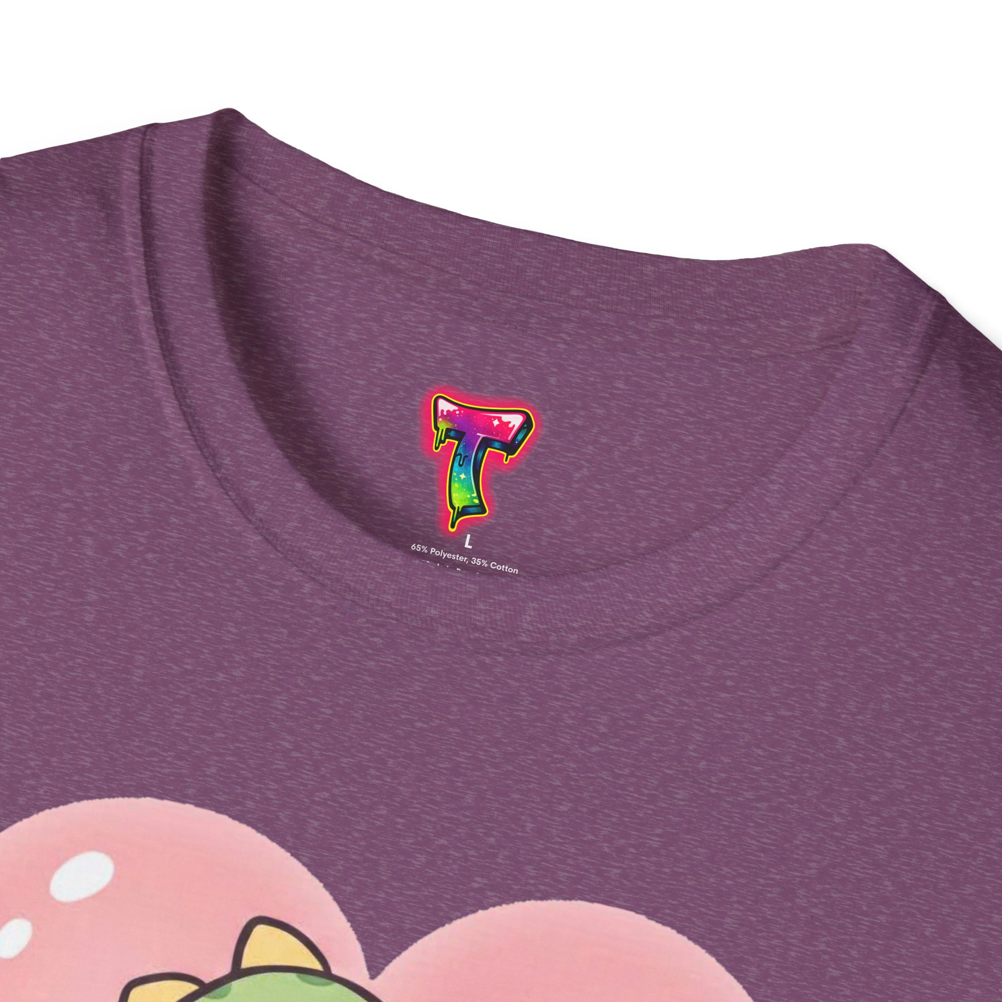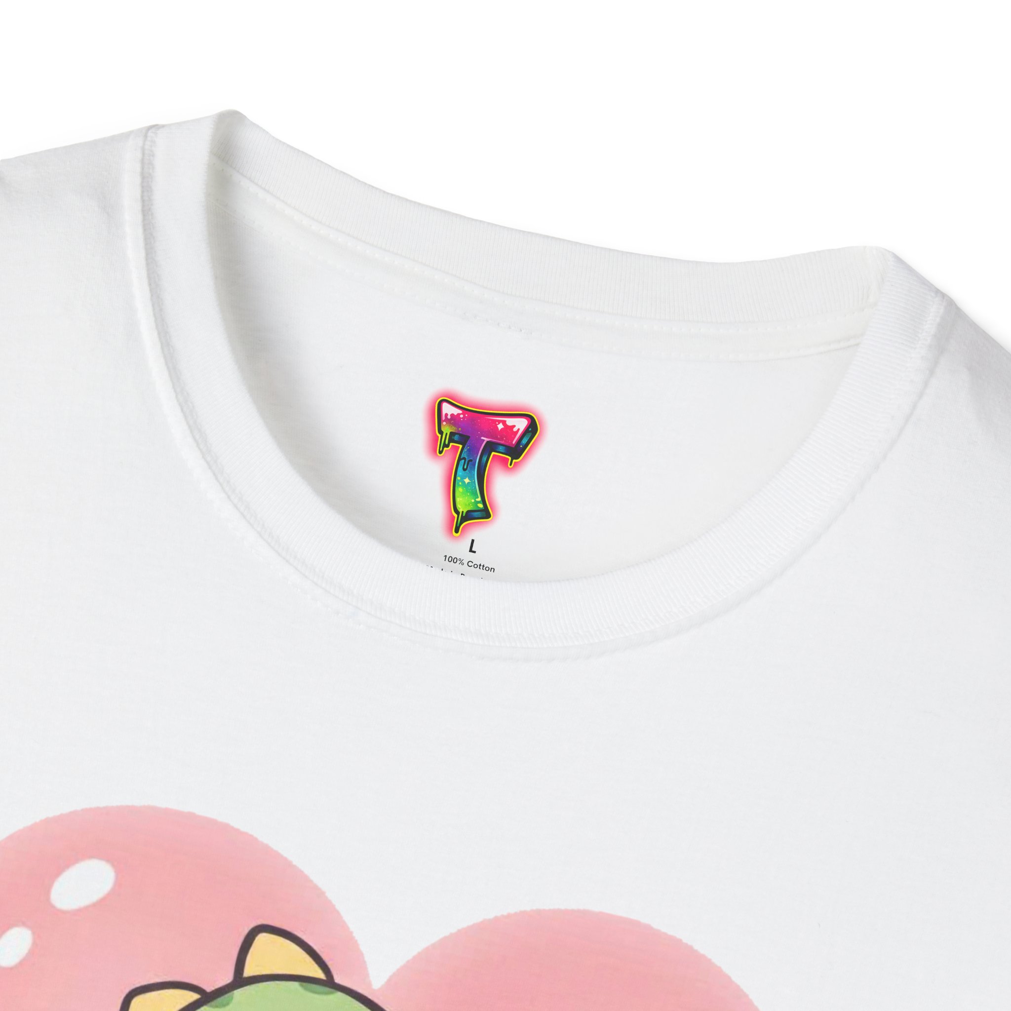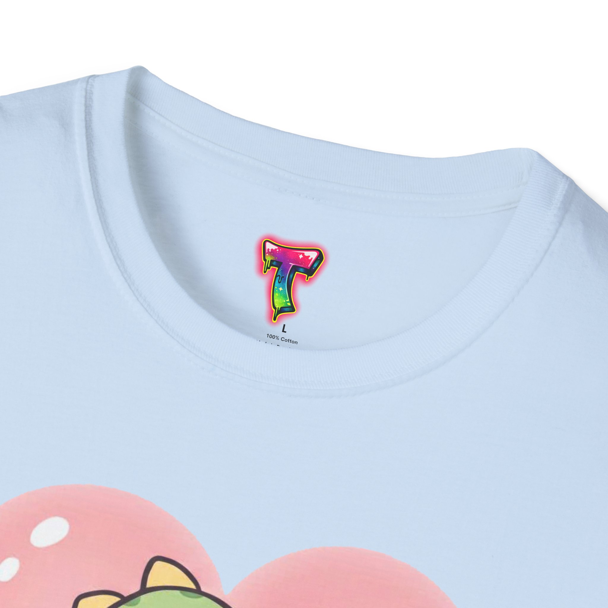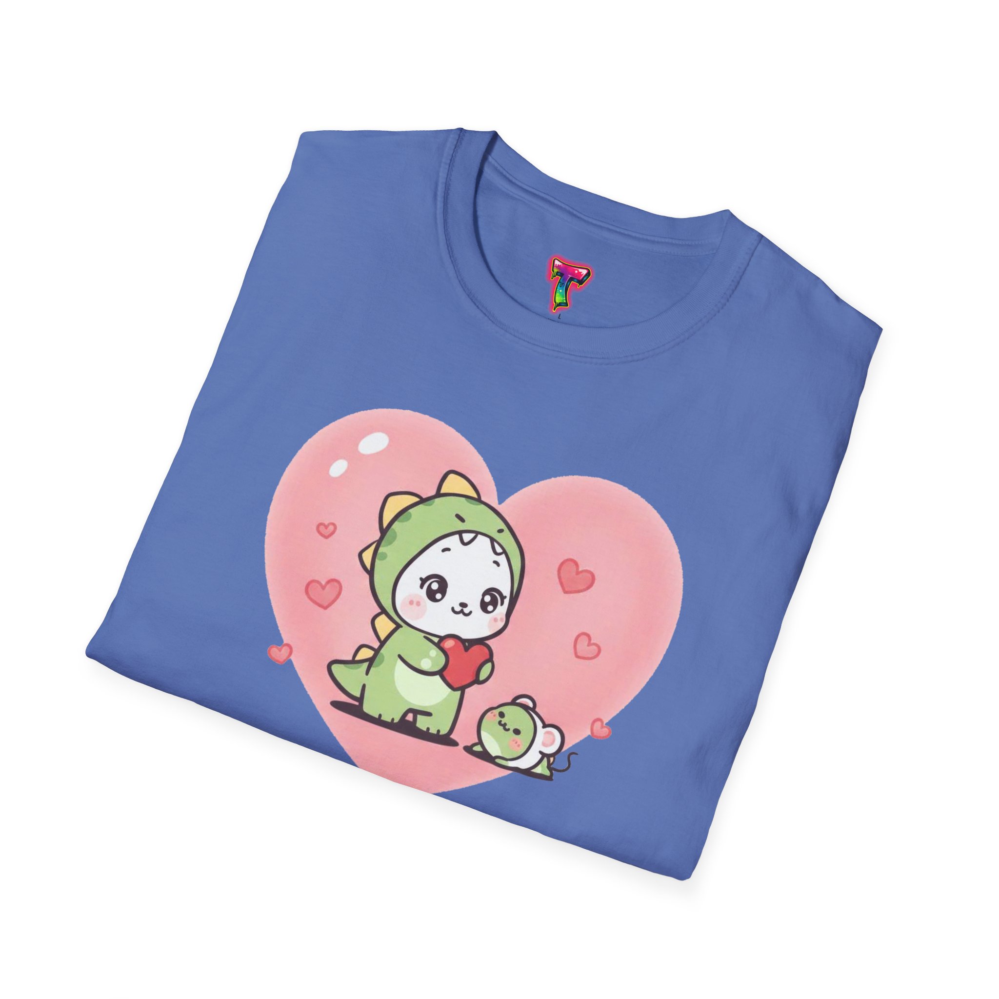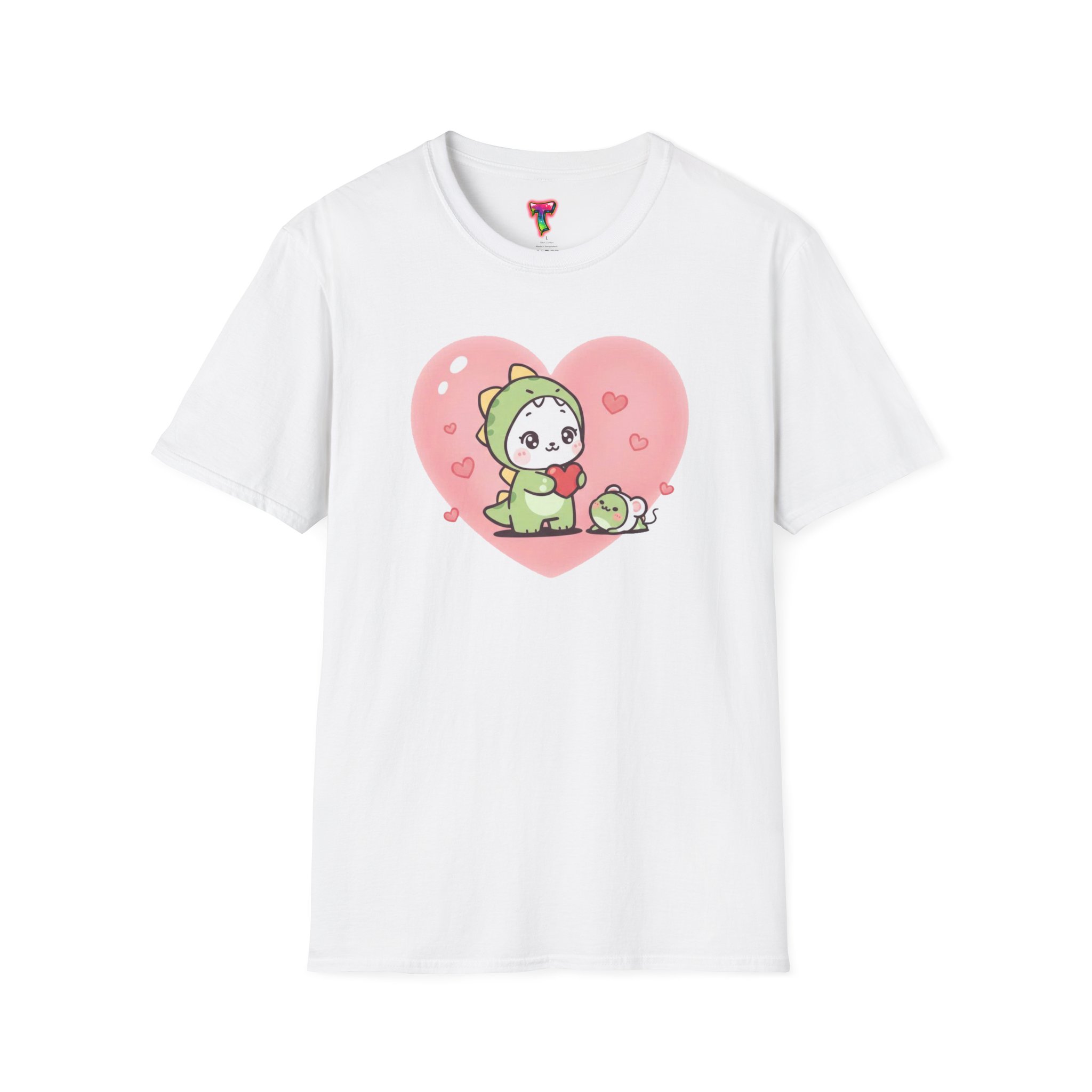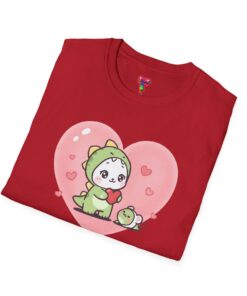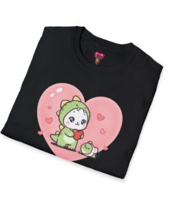 A lightweight, soft cotton tee that feels like a warm, familiar hug. The center-front design features an adorable chibi creature in a green dinosaur onesie, cradling a tiny matching friend inside a gentle pink heart. Subtle heart confetti and pastel tones give the shirt a cozy, playful mood — great for slow weekends, casual meetups, or lounging at home. The classic crew neck and clean, tubular knit create a neat silhouette that layers easily under jackets or wears solo. Built from ring-spun cotton with careful seam and collar details, this shirt balances everyday comfort with a sweet, sentimental look that appeals to fans of cute characters and soft, nostalgic style.