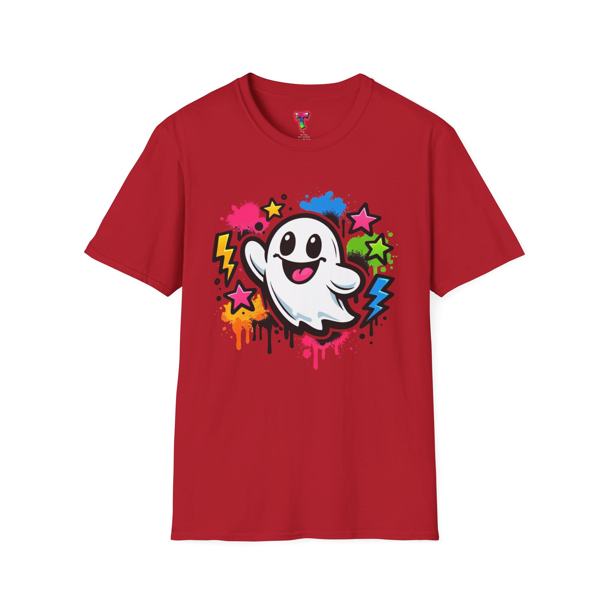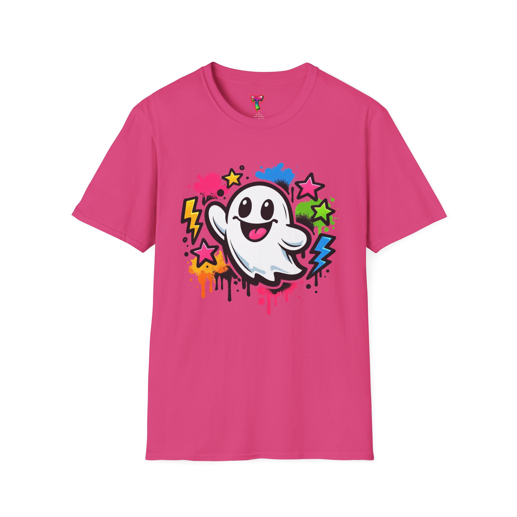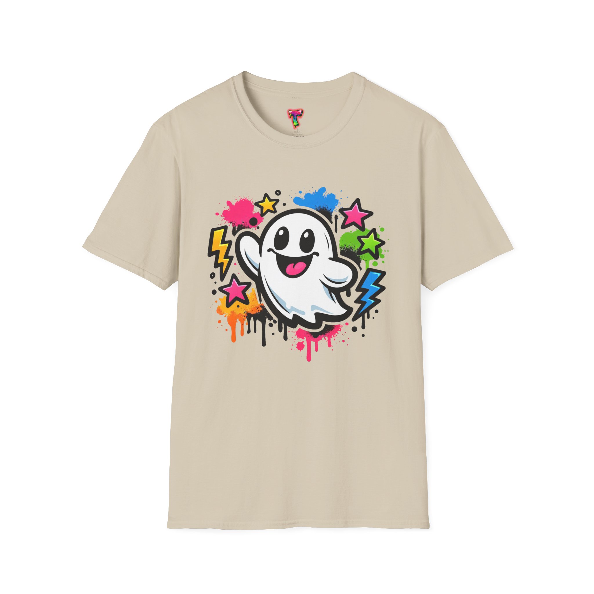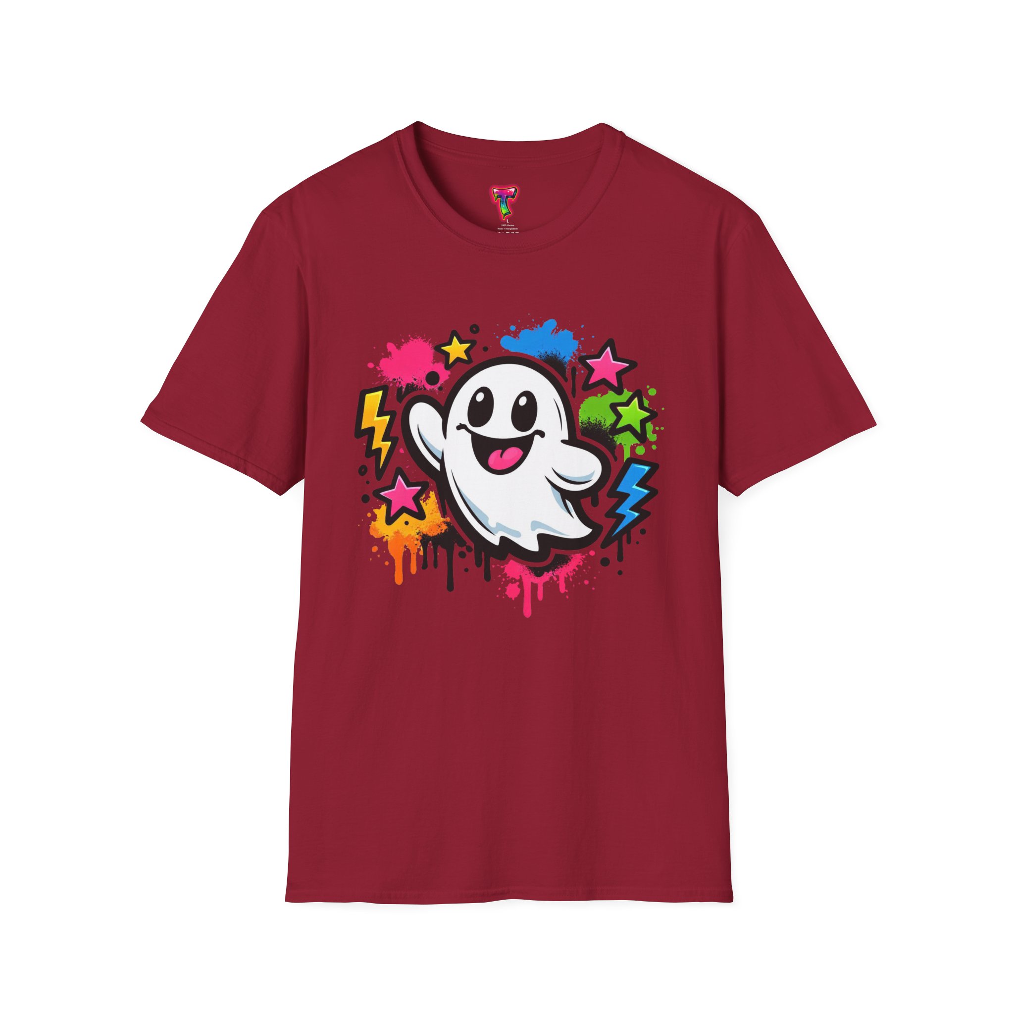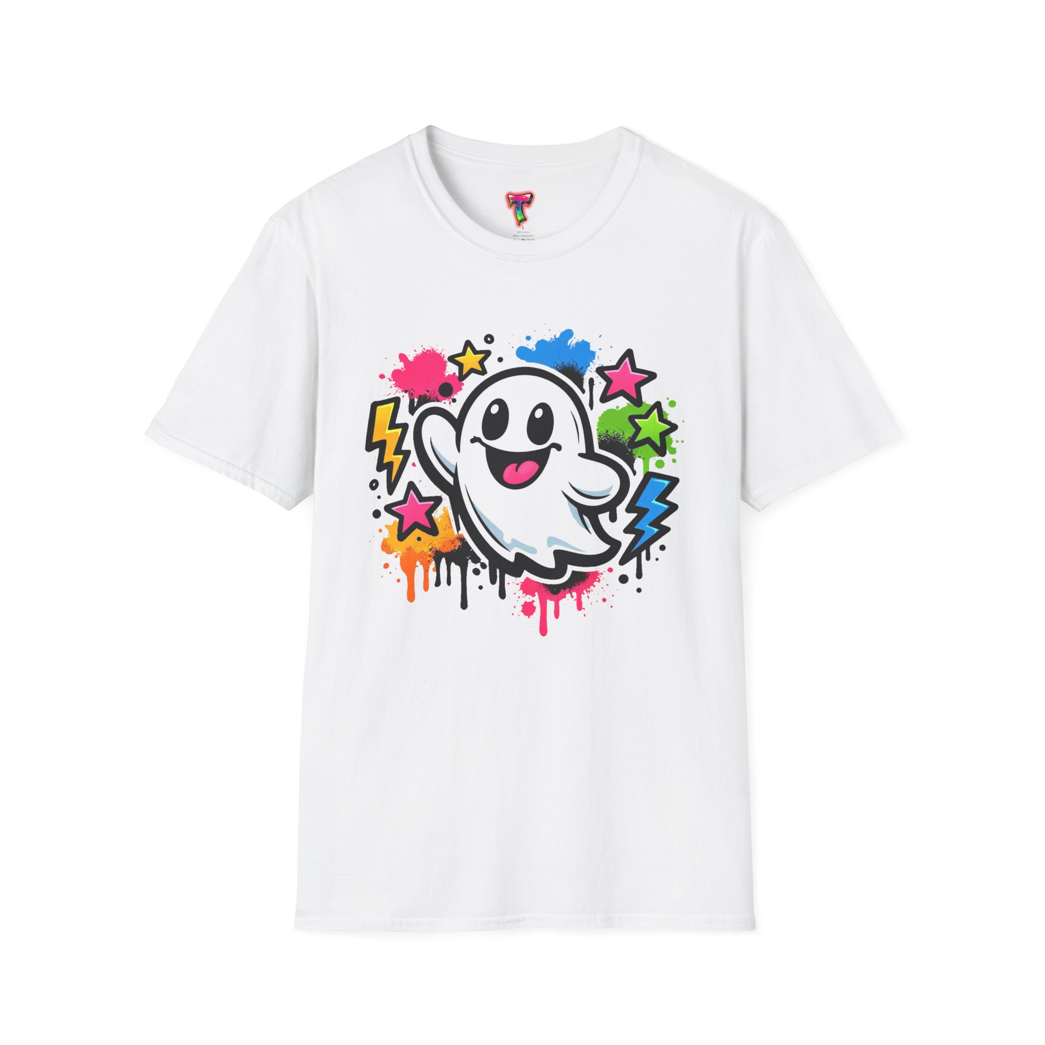 A playful, street-art inspired tee that brings a burst of color and fun to everyday wear. The lightweight, ring-spun cotton feels soft against the skin while the bold, graffiti-style ghost print adds a cheerful, energetic vibe. Wear it to brighten a casual day, to layer under a jacket for a pop of personality, or to celebrate spooky season with a lighthearted twist. The clean crew neckline and classic fit keep the look versatile and easy to style, while durable construction and quality printing keep the design lively wash after wash.