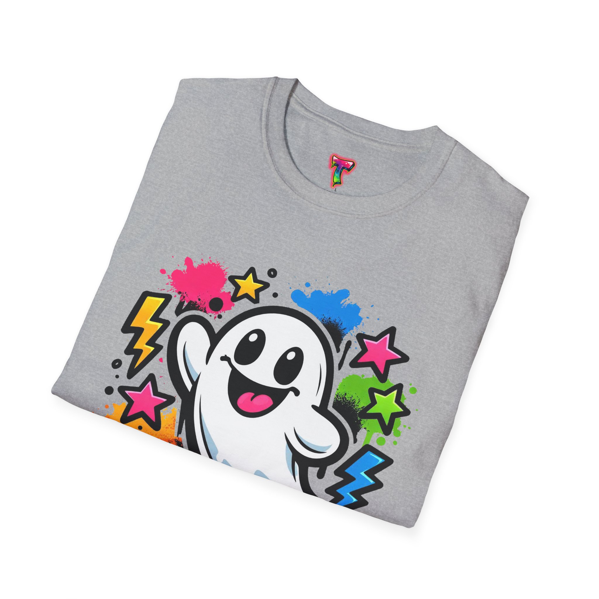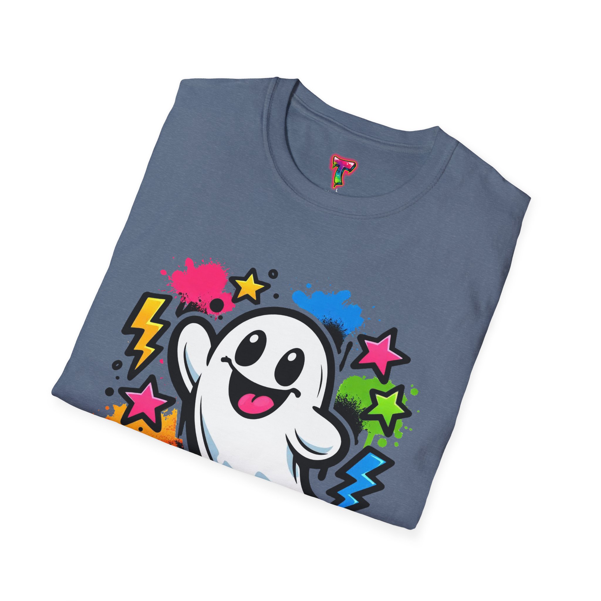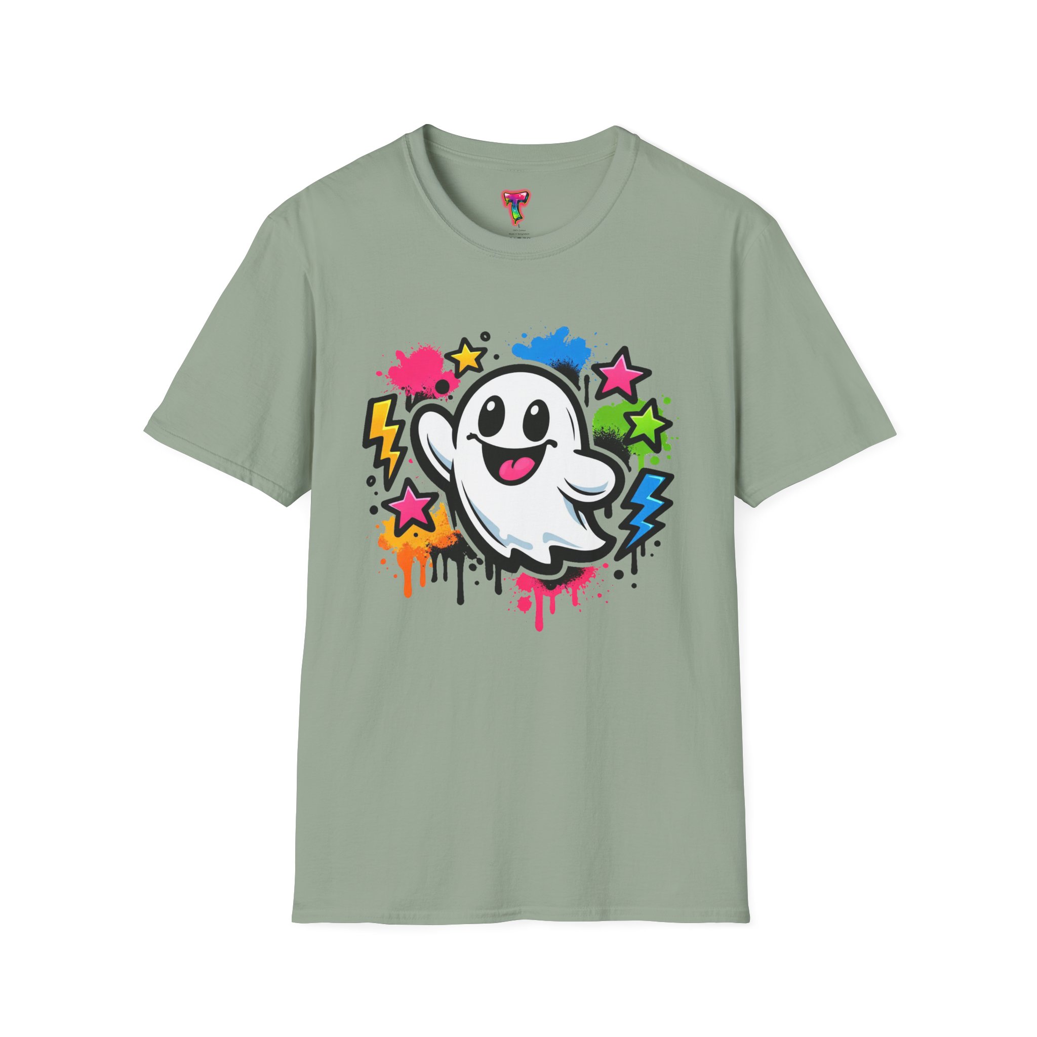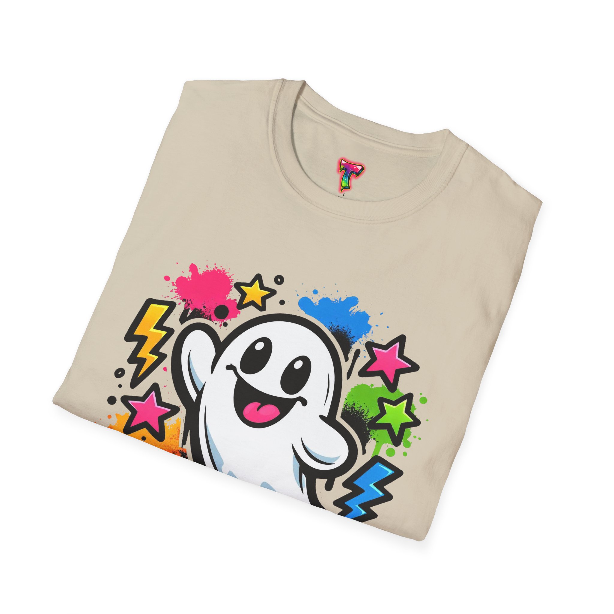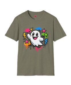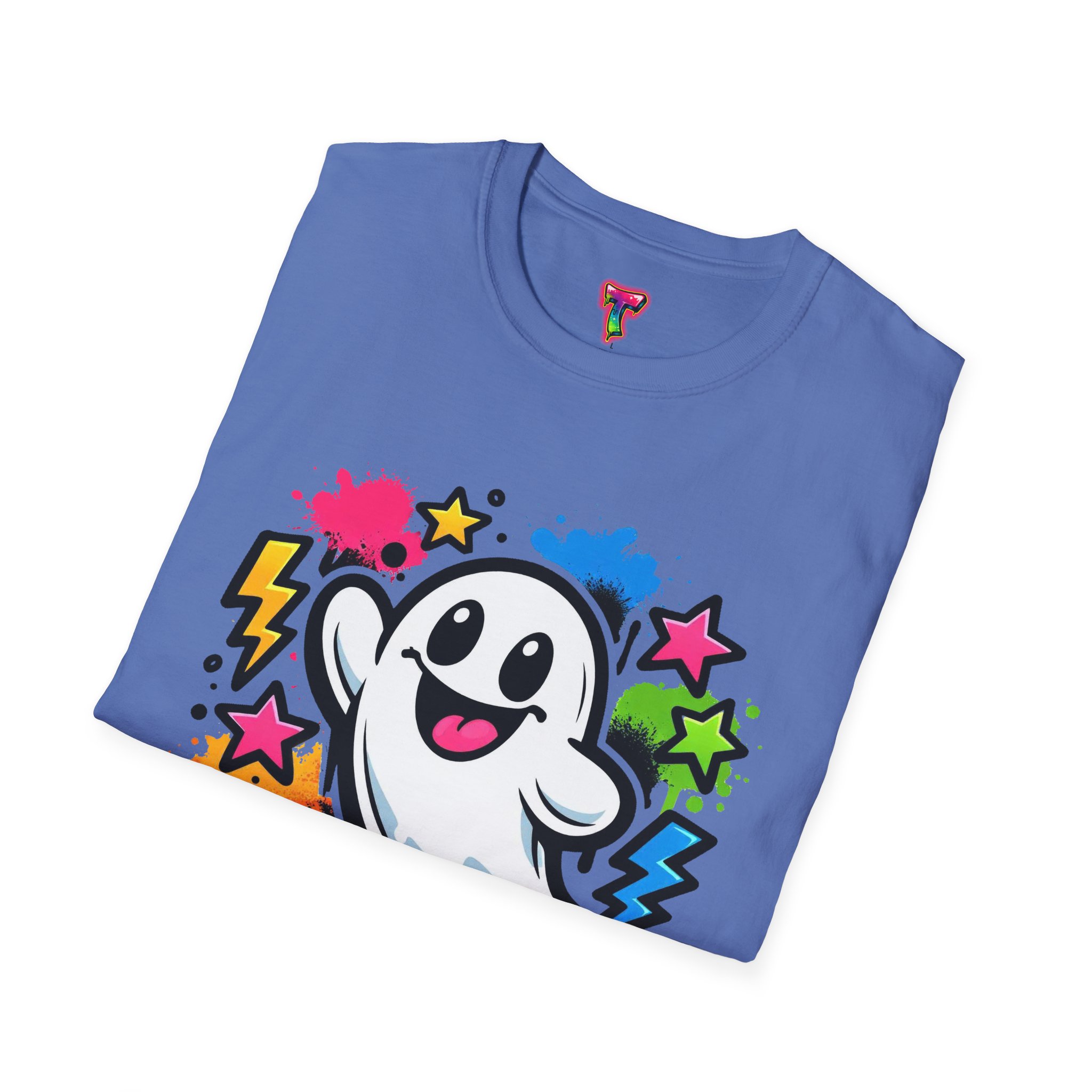 A playful, street-art inspired tee that brings a burst of color and fun to everyday wear. The lightweight, ring-spun cotton feels soft against the skin while the bold, graffiti-style ghost print adds a cheerful, energetic vibe. Wear it to brighten a casual day, to layer under a jacket for a pop of personality, or to celebrate spooky season with a lighthearted twist. The clean crew neckline and classic fit keep the look versatile and easy to style, while durable construction and quality printing keep the design lively wash after wash.