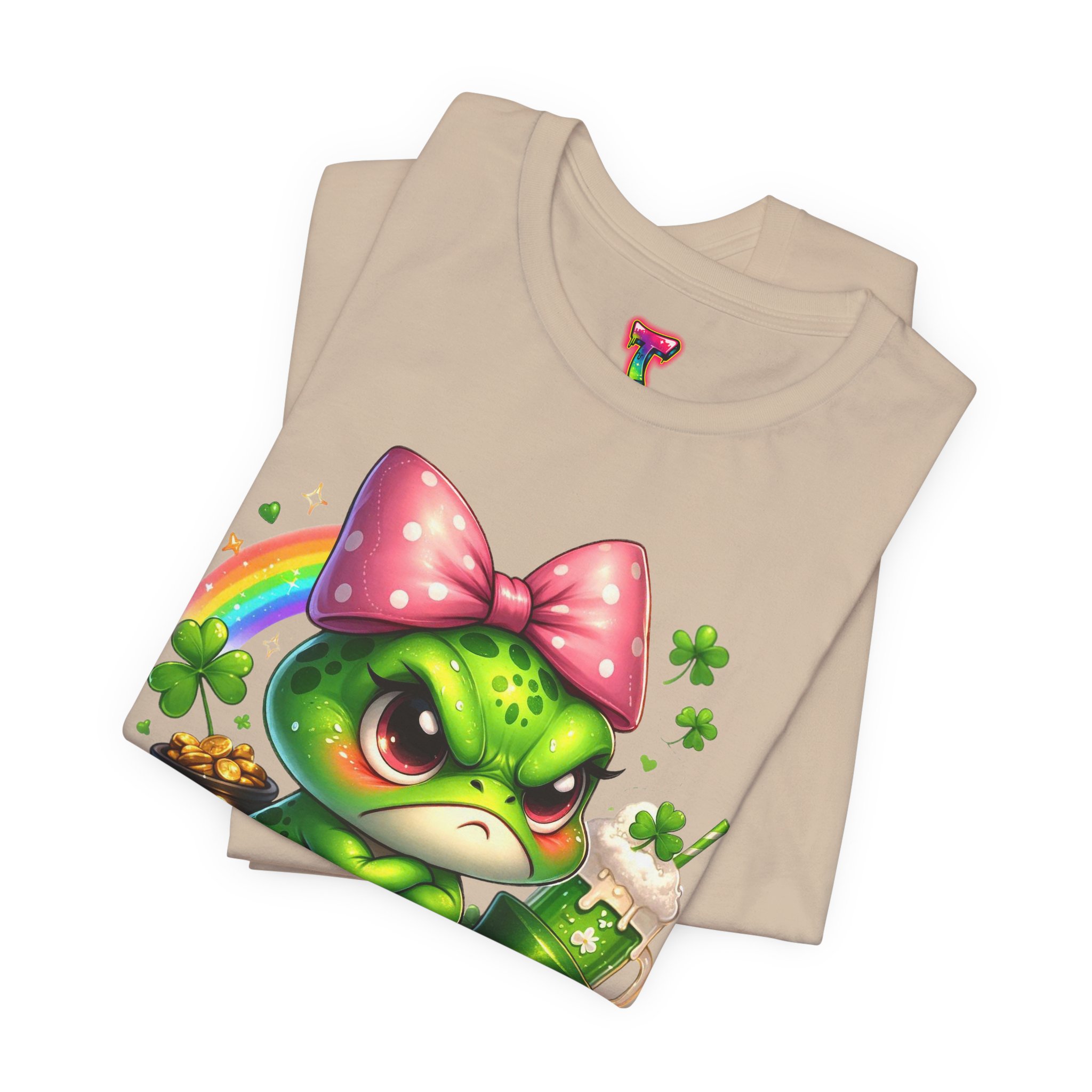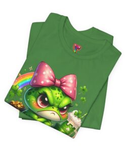 This lightweight jersey tee carries a playful, slightly sassy charm—an angry little green frog adorned with a big pink bow, a rainbow arc, shamrocks and a frothy green drink. The artwork pops with bright, saturated color and crisp detail, printed to hold its vibrancy through everyday wear. The crewneck silhouette and retail fit keep the look casual but tidy, easy to layer under a denim jacket or wear solo as a bold statement piece. Breathable Airlume combed and ring-spun cotton feels soft against the skin and the tear-away label keeps irritation away. It’s a tee that brings personality to weekend strolls, festival lineups, or relaxed meetups where playful attitude and hand-drawn style speak louder than words.