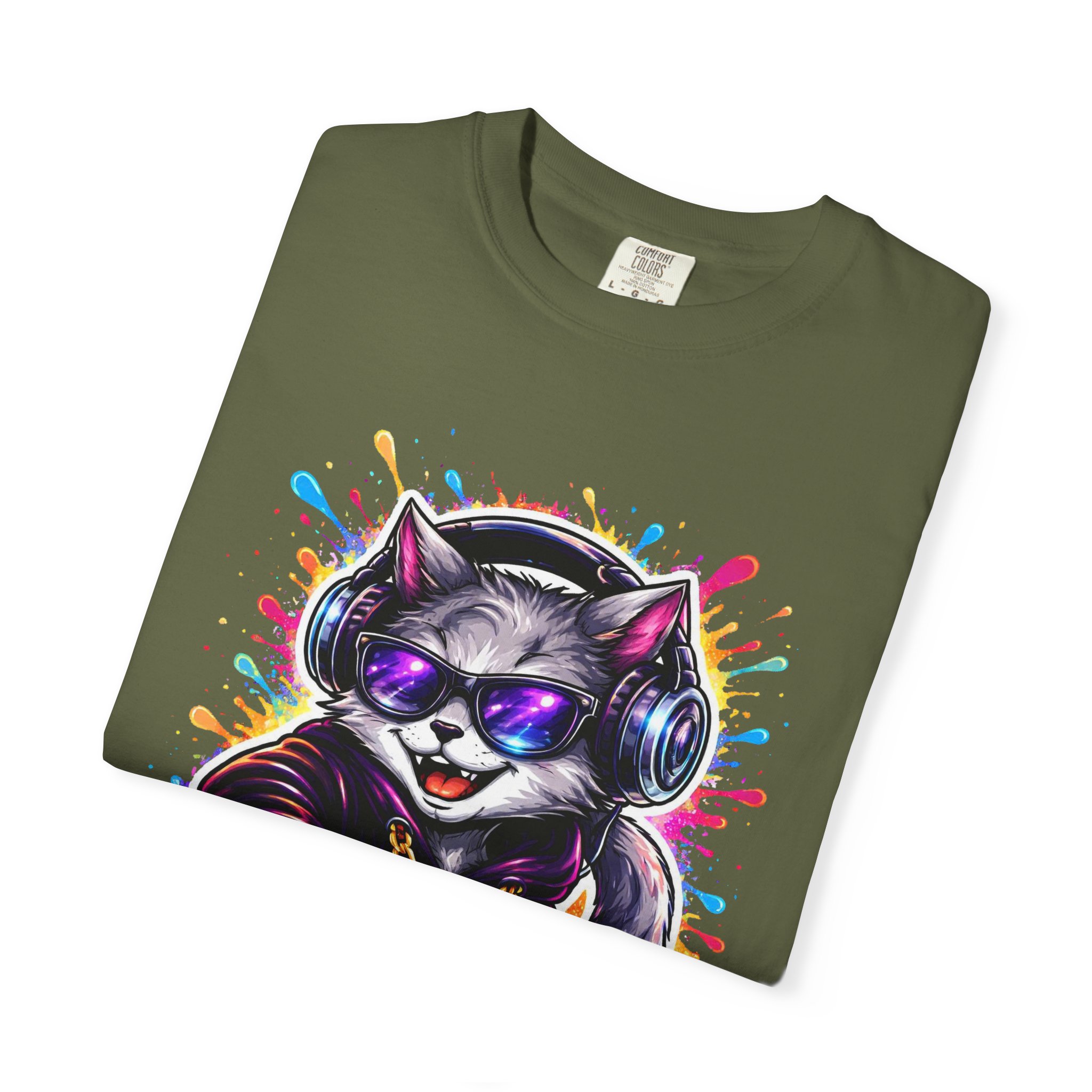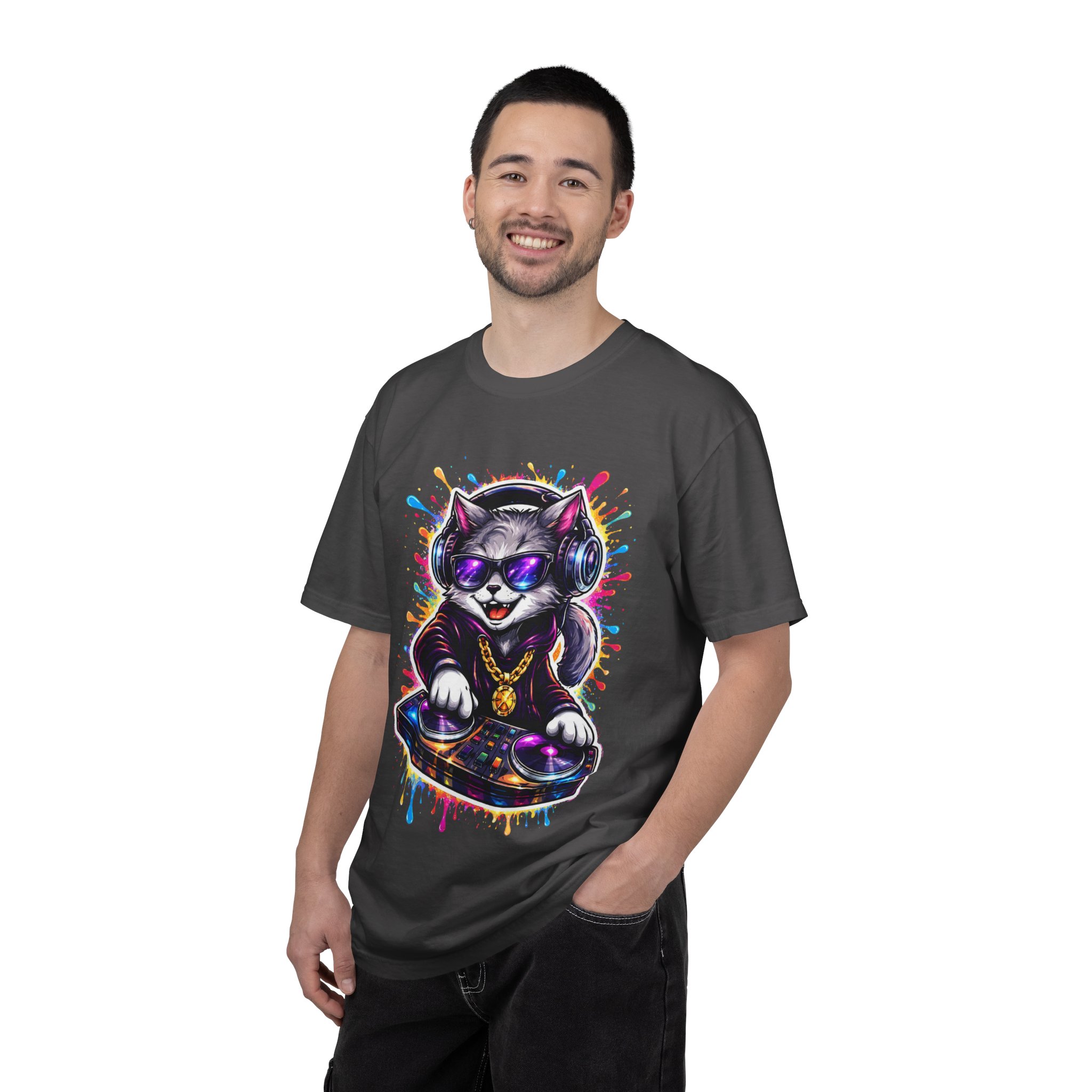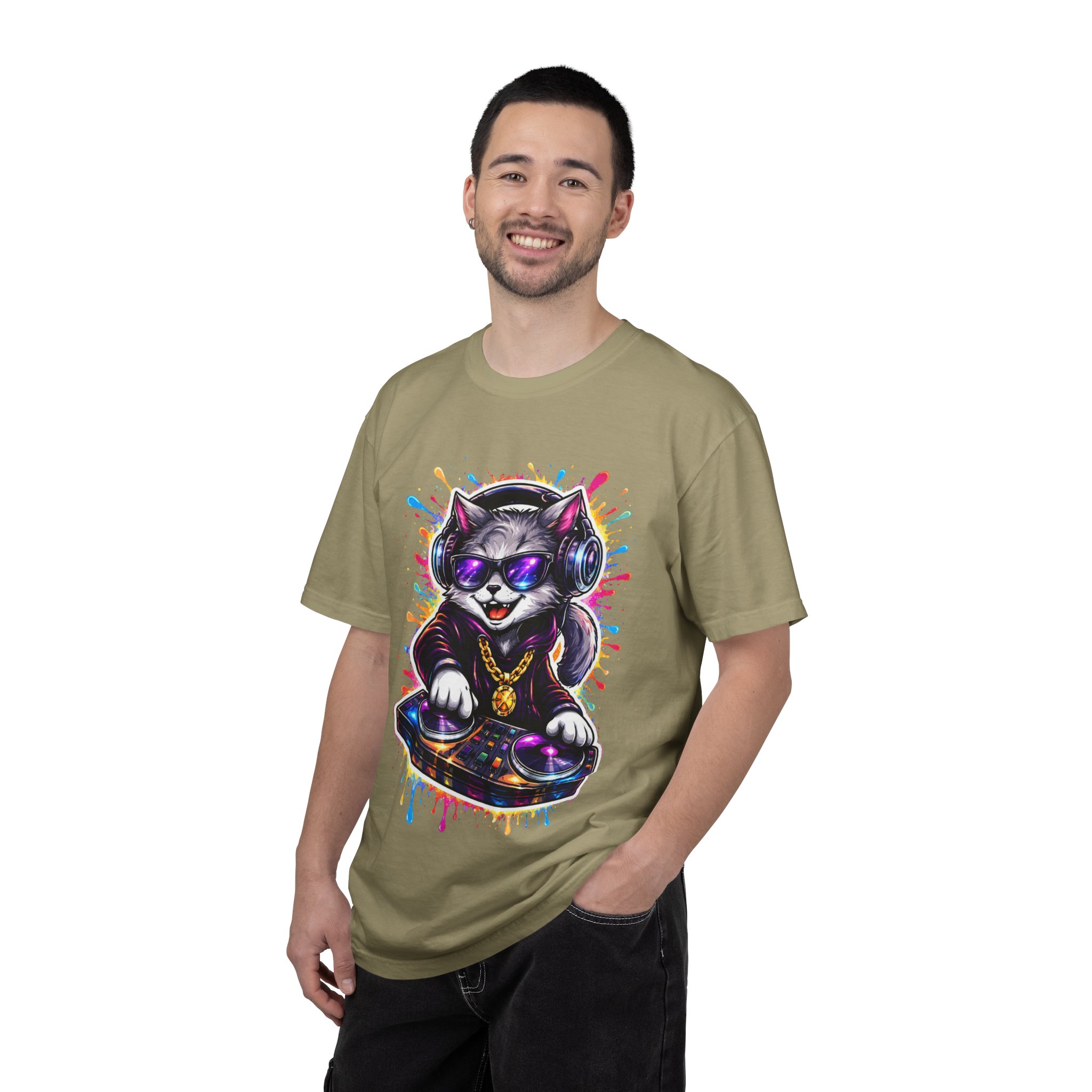 This heavyweight garment-dyed T-shirt carries a playful, streetwise vibe—think late-night beats, neon lights, and a cat spinning vinyl at the center of the scene. The soft, garment-dyed finish gives the fabric a lived-in feel that settles into your wardrobe, while the bold, colorful DJ-cat print adds personality without shouting. It sits relaxed on the body, made to move with you whether you’re running errands, DJing a friend’s house party, or layering under a jacket for a gig. The sewn-in label and double-needle stitching mean this tee is built to last through repeat wears and washes. Available in a wide palette of colors and sizes, it’s a comfortable, durable canvas for anyone who loves music, street art, and playful self-expression.