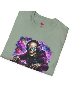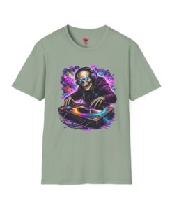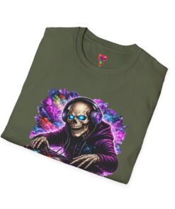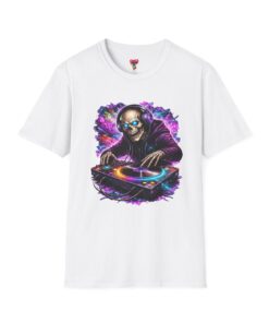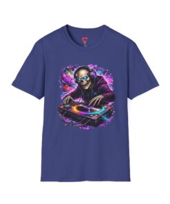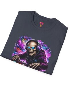 This lightweight cotton tee carries a bold, neon-soaked DJ skeleton design that feels like a late-night set under pulsing lights. The image pops with electric purples, blues and warm highlights, bringing club energy to a casual shirt you can wear day or night. It’s breathable and smooth against skin, with a clean crew neckline and a classic cut that layers easily under jackets or wears solo while you’re spinning tracks or heading to a gig. The printed neck label and tear-away tag keep the back of the neck comfortable. Durable stitch details—shoulder tape, ribbed collar and tubular knit—mean this shirt holds its shape through frequent wear and washes, so the artwork stays sharp and the fit stays true.