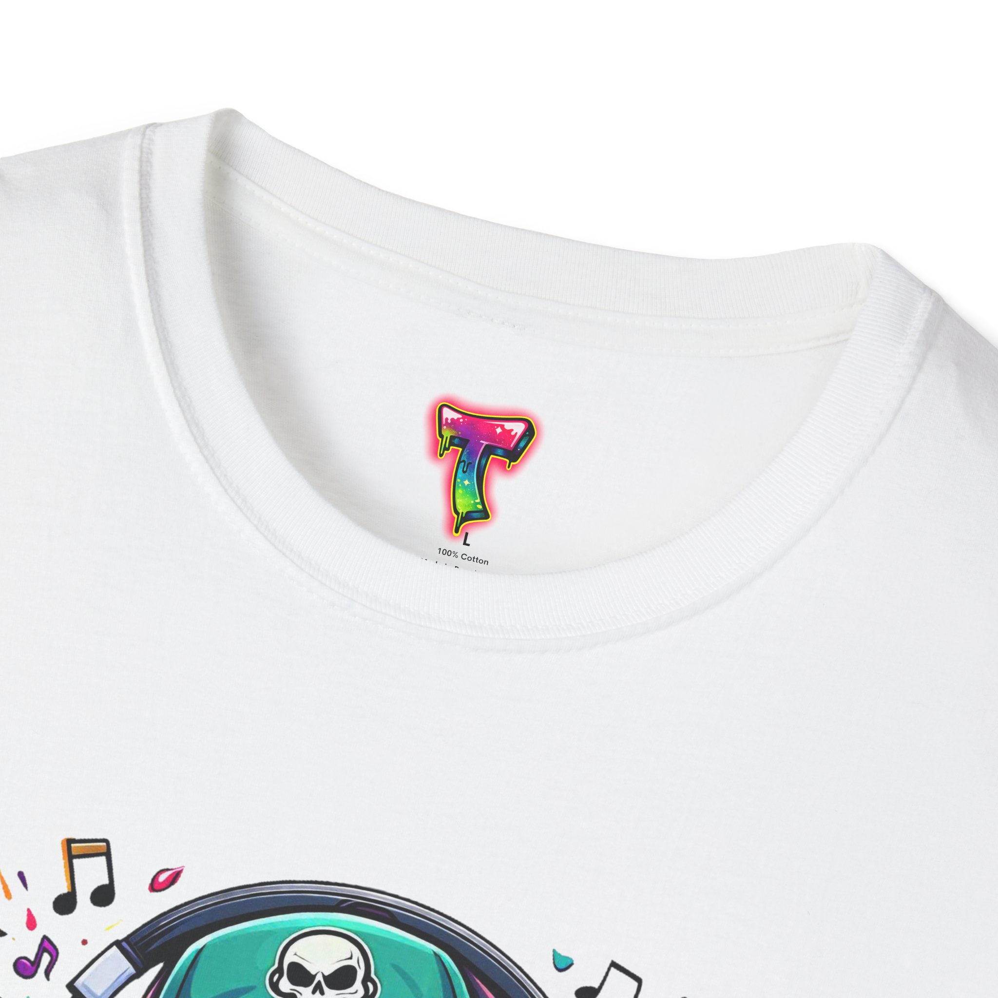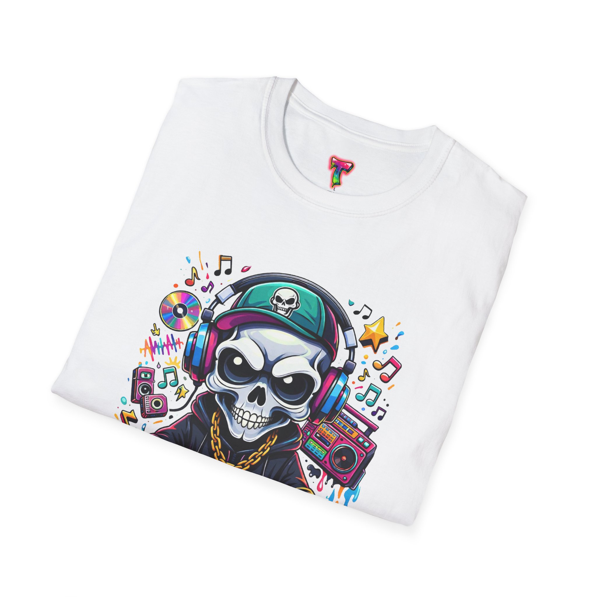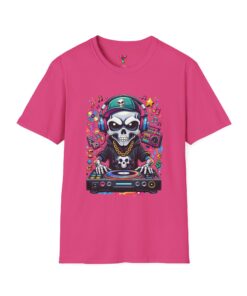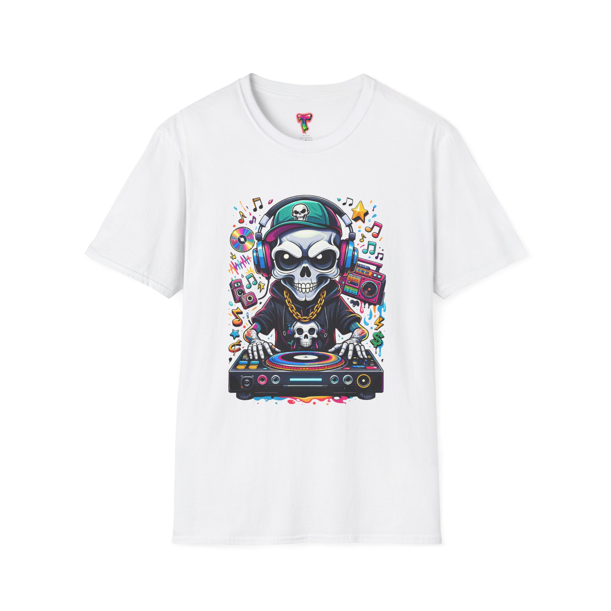 This lightweight cotton tee carries a bold, music-obsessed attitude. A vibrant DJ skeleton—decked in headphones, a cap, and gold chain—spins on colorful turntables across the chest. The artwork pops against the clean white canvas, bringing festival energy, late-night sets, and studio vibes into one wearable statement. It sits comfortably and simply, so the design is what speaks: loud, playful, and a little rebellious. Wear it to shows, mixing sessions, or when you want your outfit to announce that beats and good times are coming.
