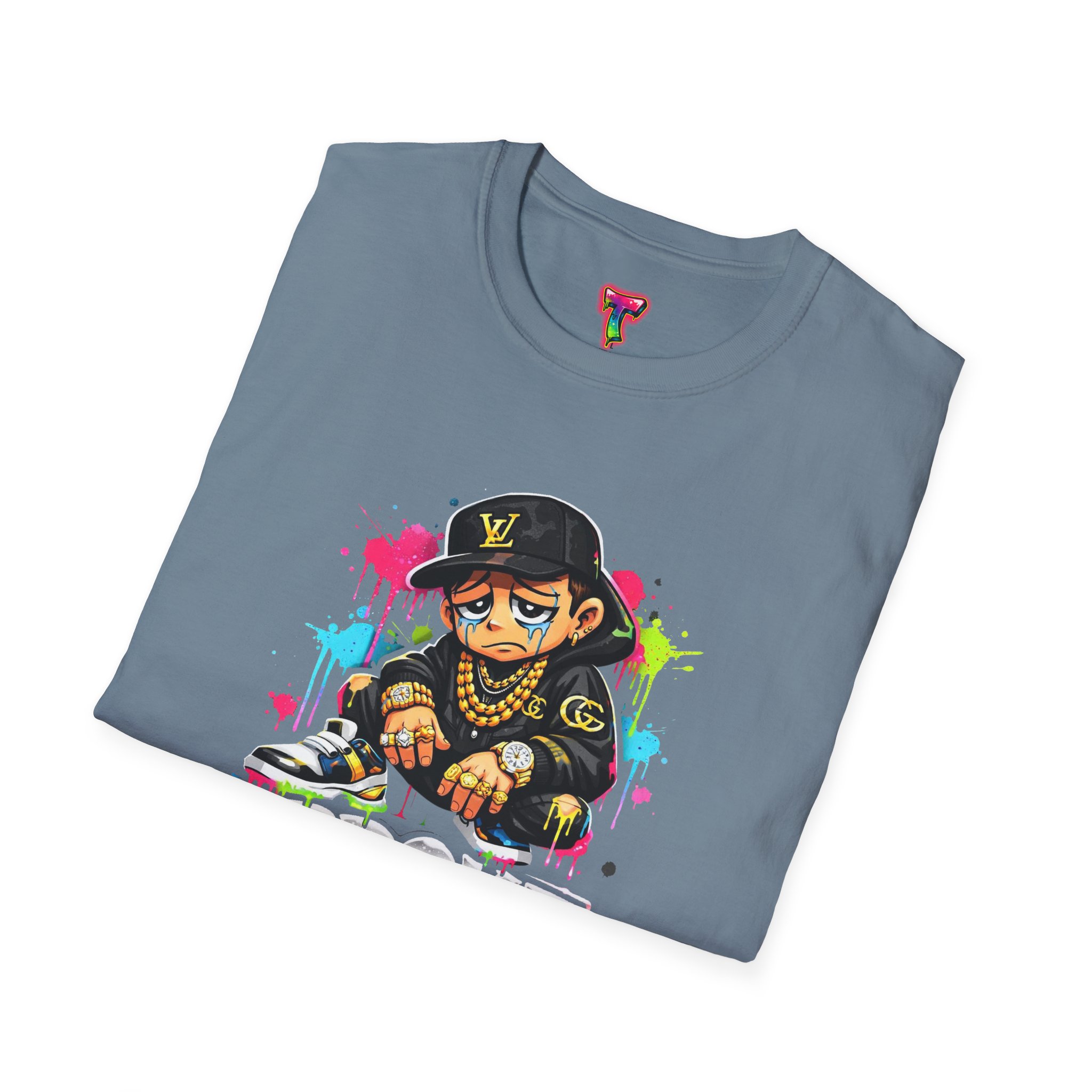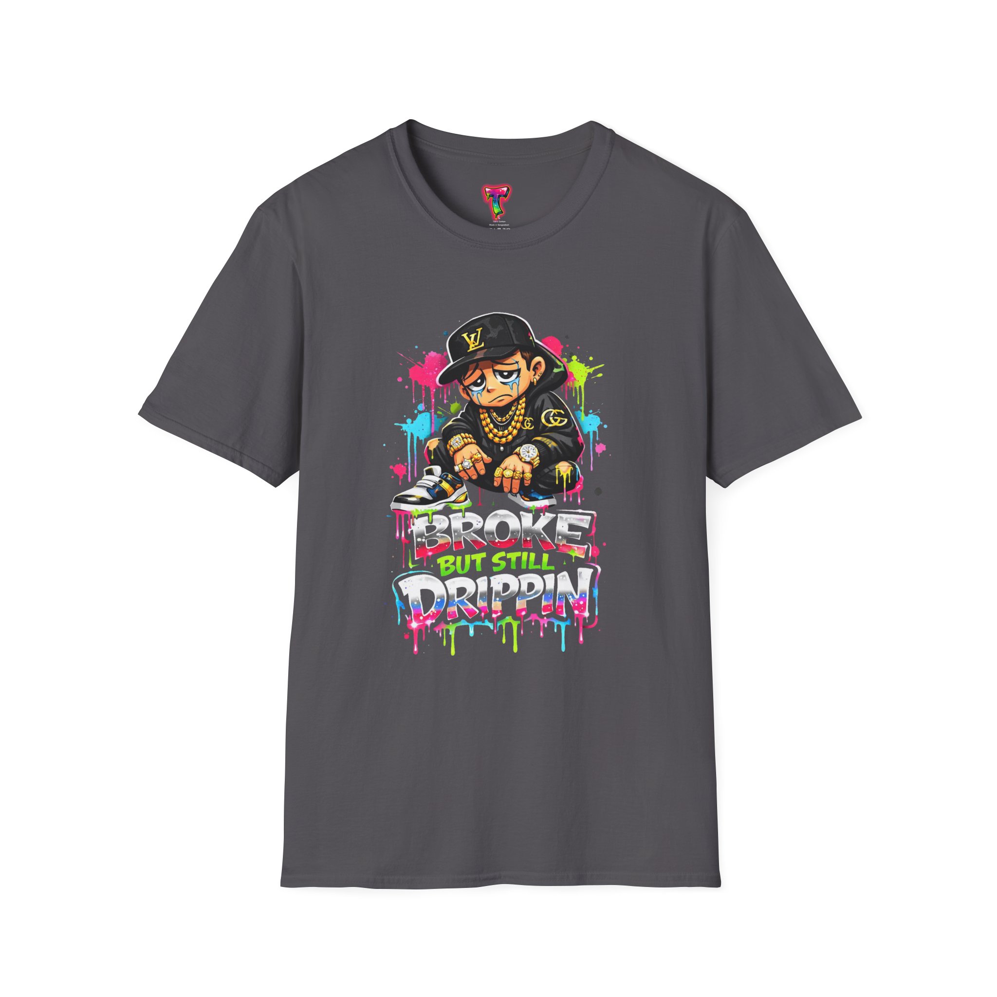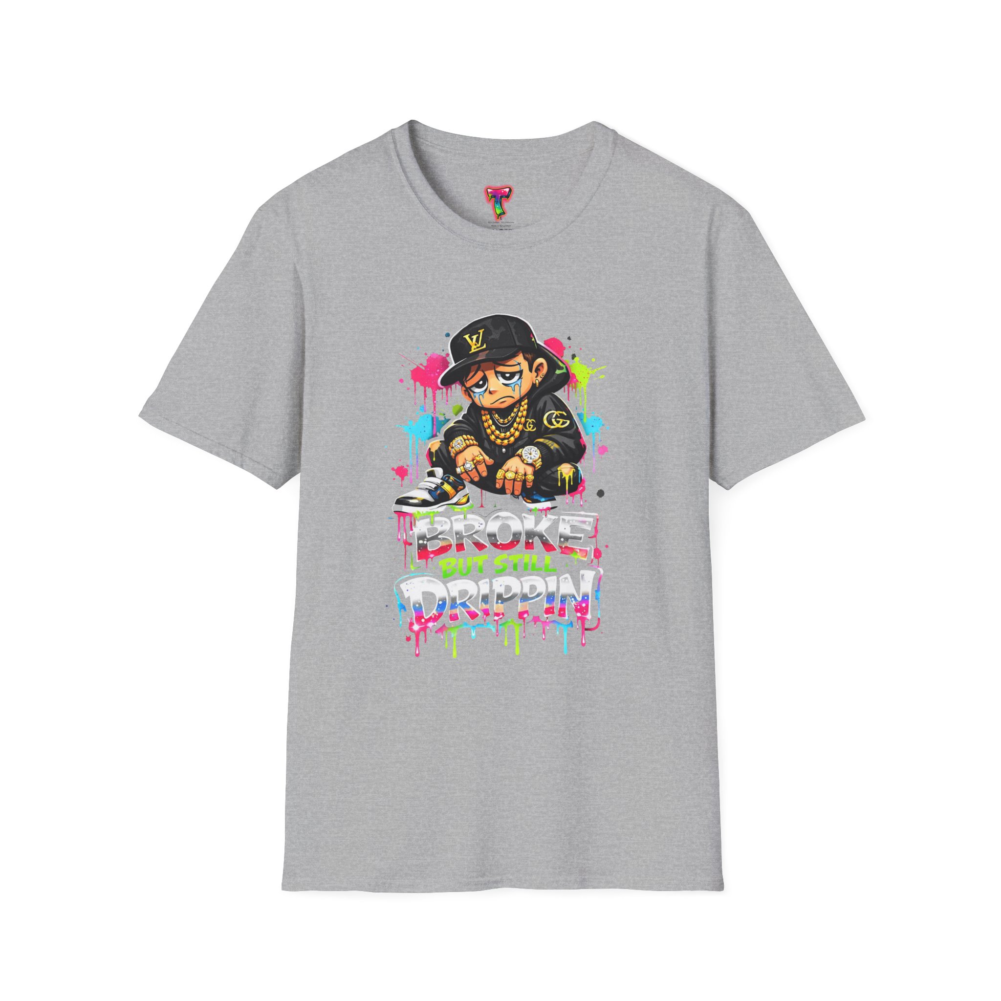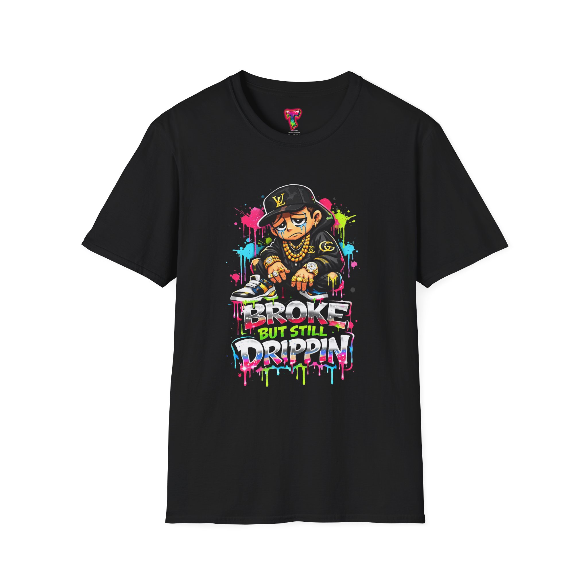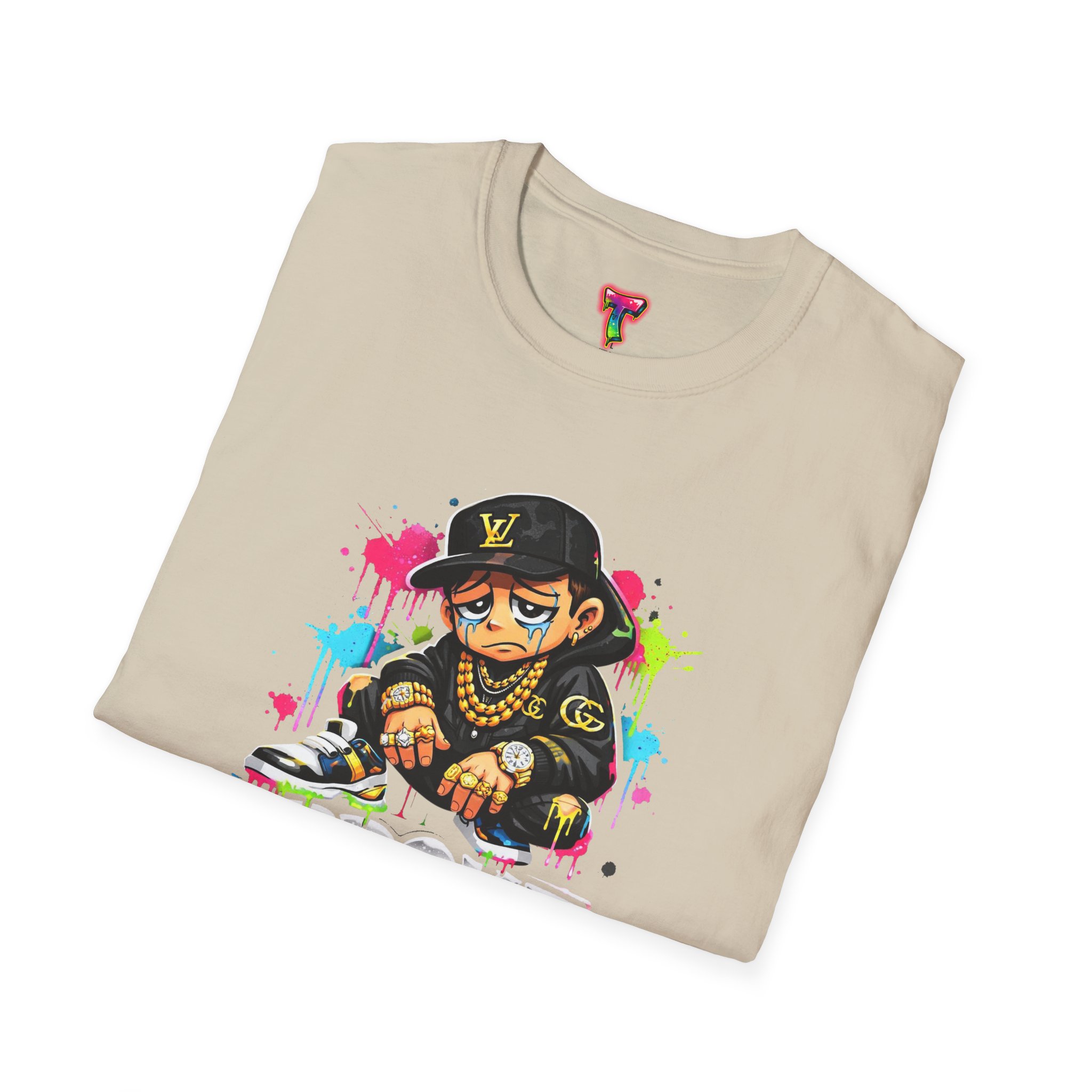 This lightweight cotton tee carries street energy with playful color splatters and bold DJ character artwork. The design feels like an underground block party — bright neon drips, graffiti-style lettering and a turntable-slinging character that radiates hustle and humor. Wear it layered under a denim jacket or solo with joggers to bring a casual, confident vibe to everyday runs, late-night sets, or city hangs. The soft ring-spun cotton and clean crew neckline keep the focus on the art while staying comfortable through long days and nights.