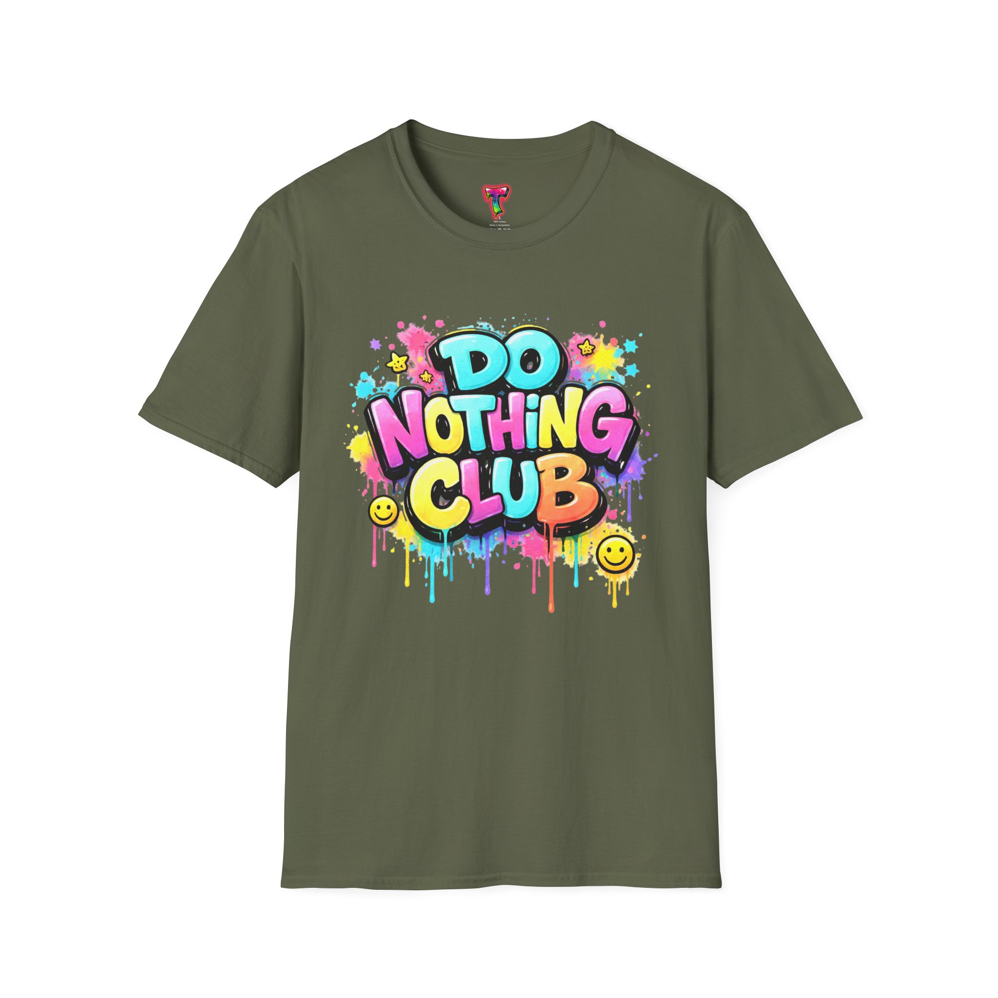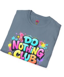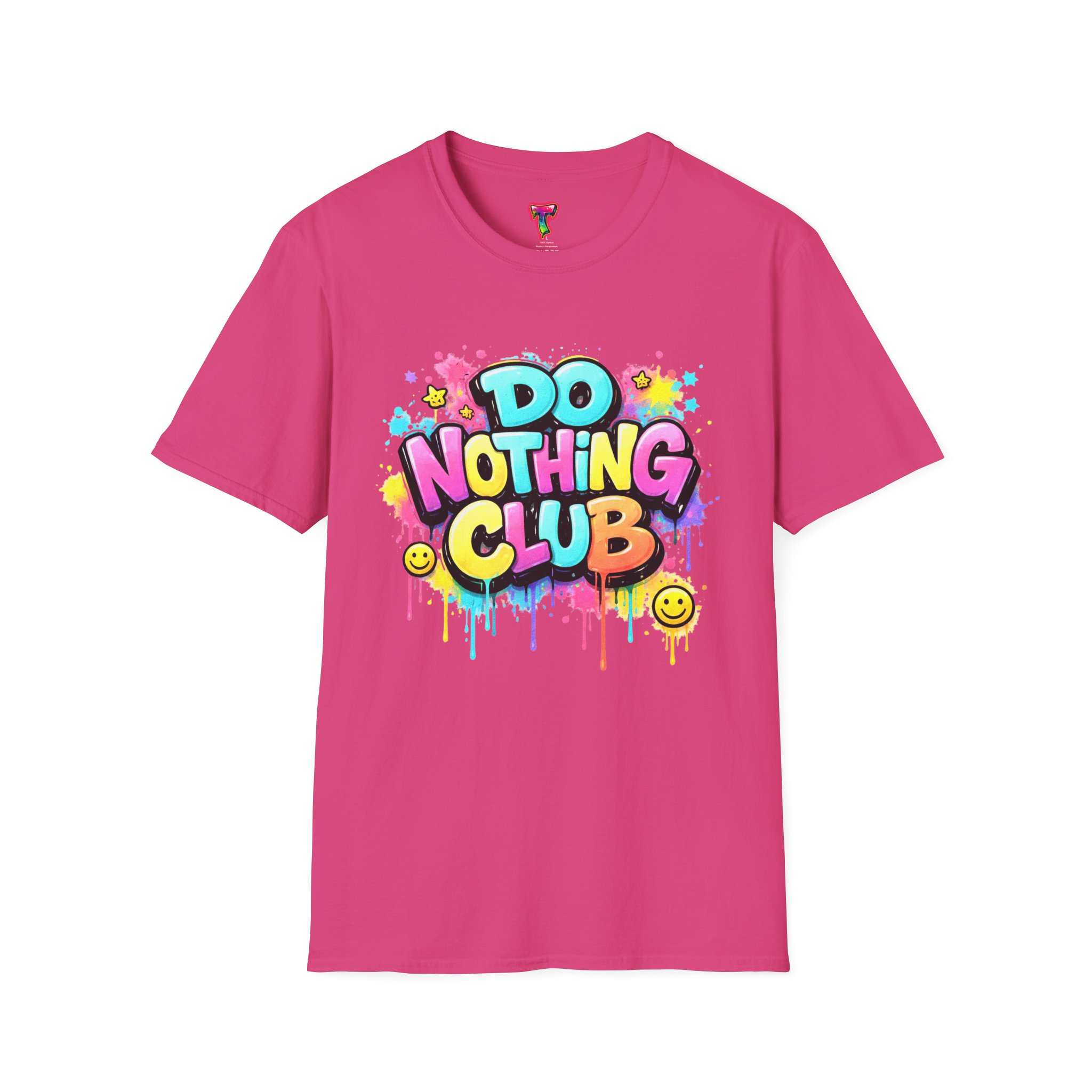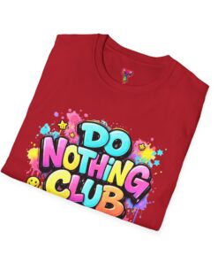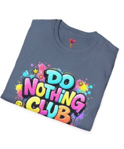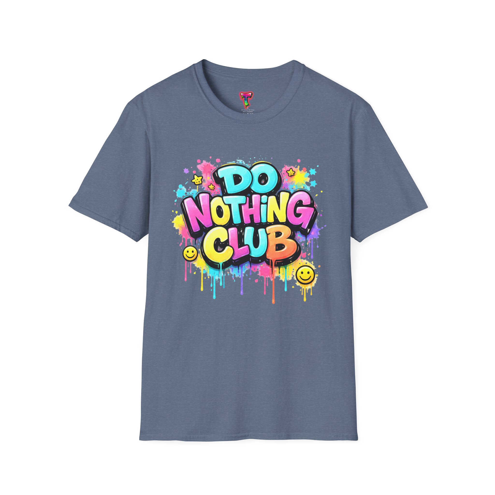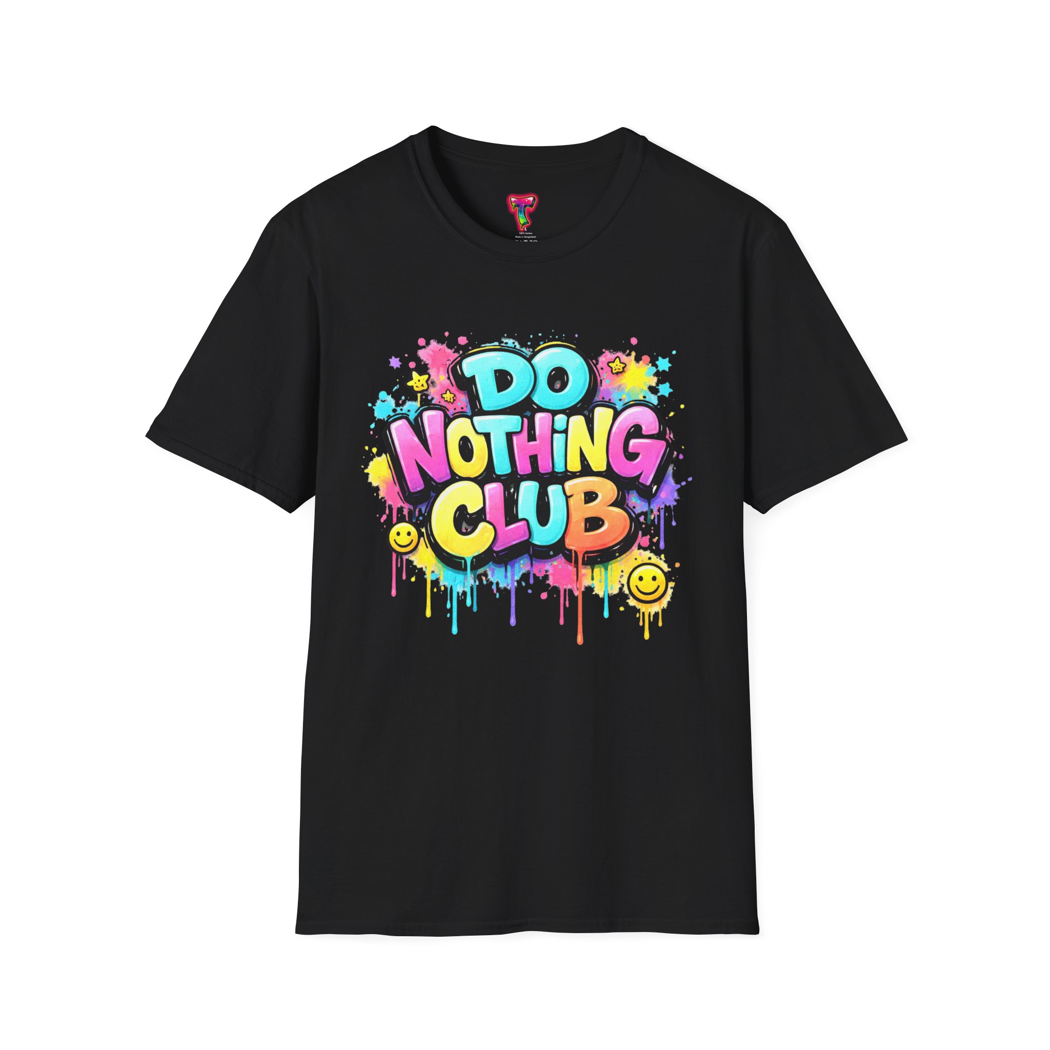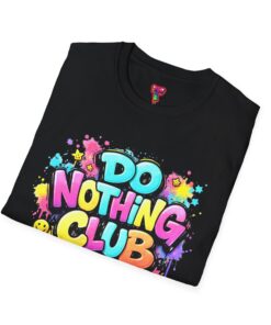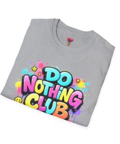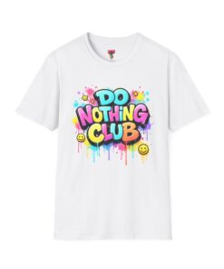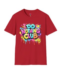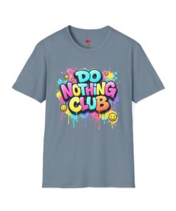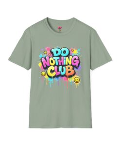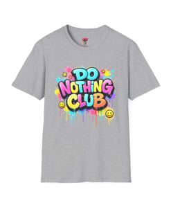 Bright, playful, and unapologetically chill — this soft cotton tee wears its laid-back attitude on the chest. A bold, graffiti-style “DO NOTHING CLUB” design pops in candy-bright colors with paint drips and smiley accents, nodding to street art and easygoing weekend vibes. The lightweight ring-spun cotton feels soft against skin and moves with you, whether you’re lounging at home, wandering the city, or meeting friends for a slow, sunlit afternoon. Built with thoughtful details — a stretch-retaining ribbed collar, shoulder tape for durability, and a tear-away label for comfort — it looks fresh out of the box and stays that way. This shirt slips into the life of someone who celebrates downtime, casual hangouts, and playful self-expression. Throw it on, slow your pace, and let the graphics do the talking.