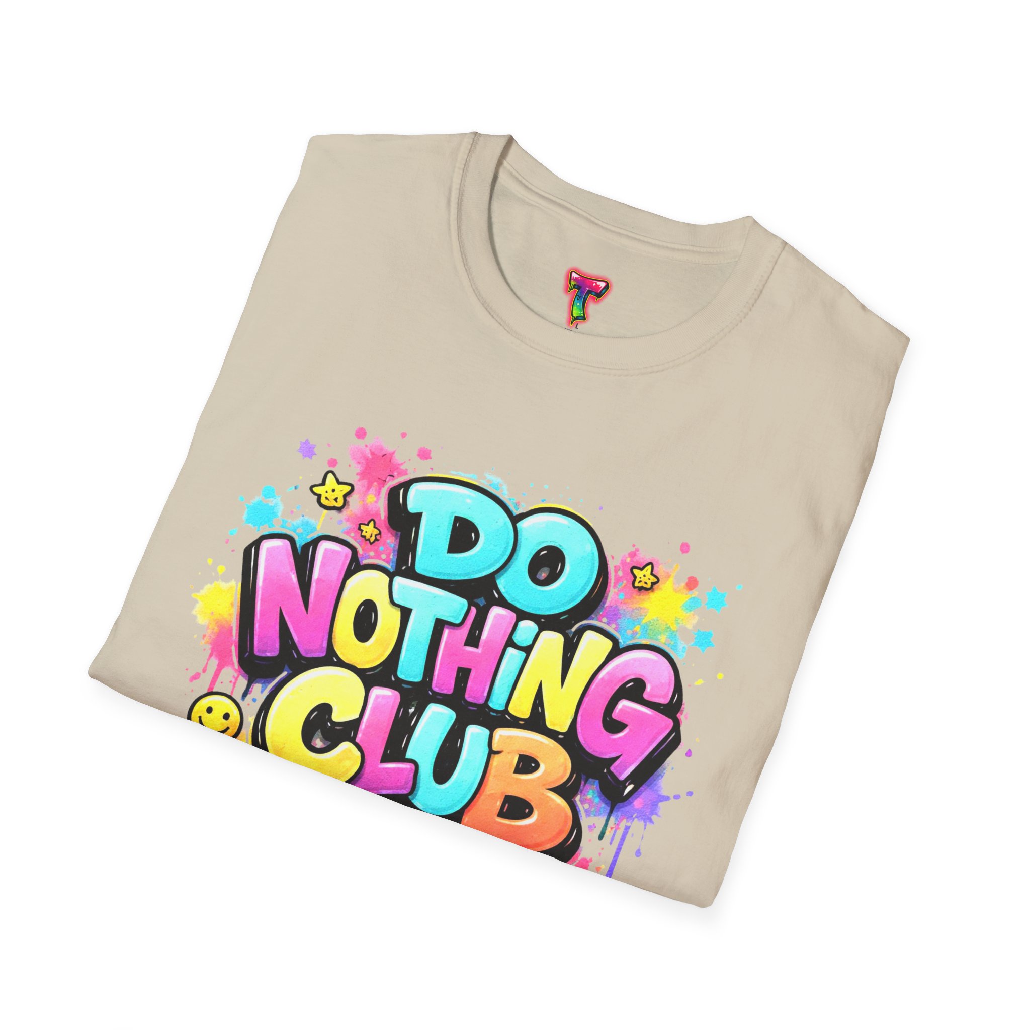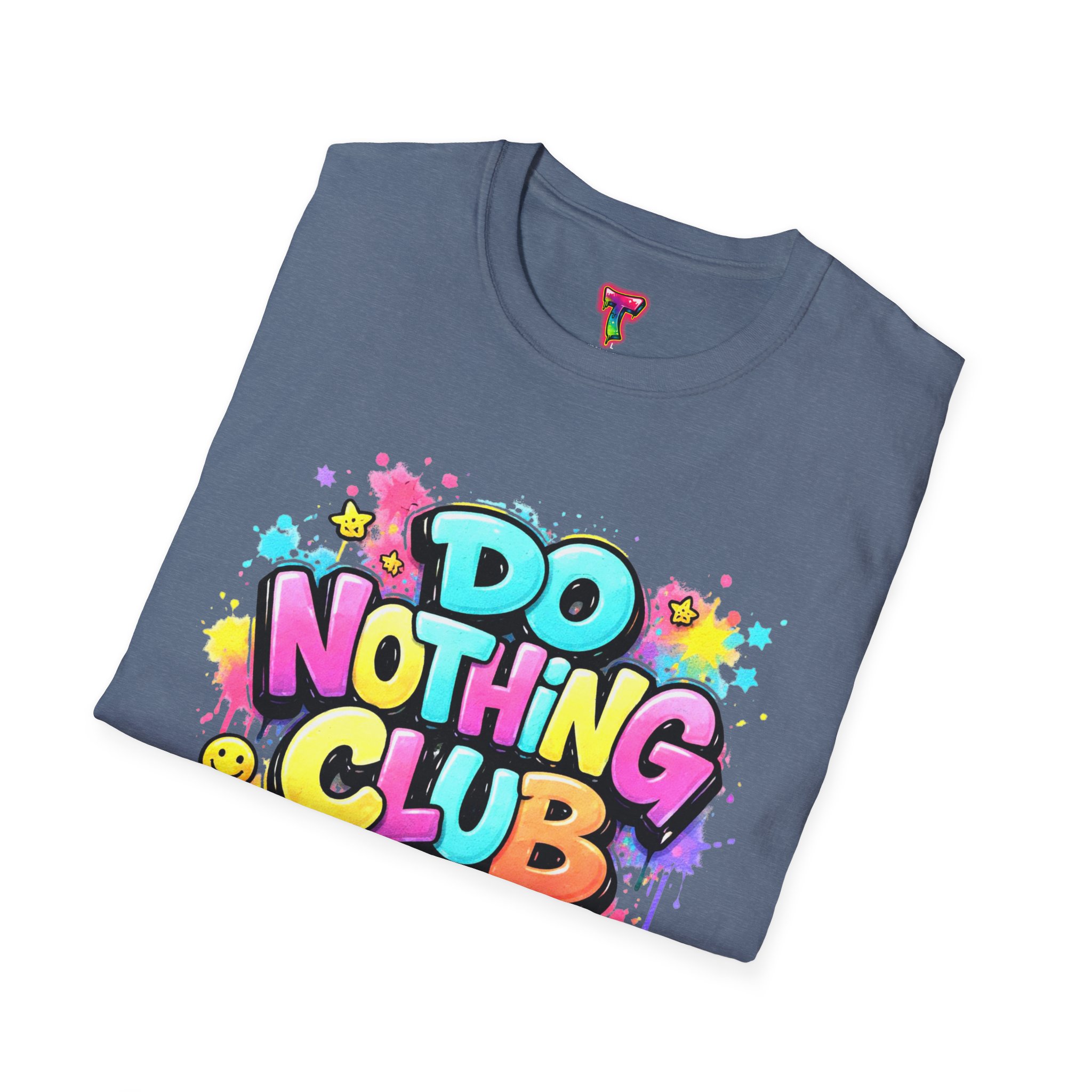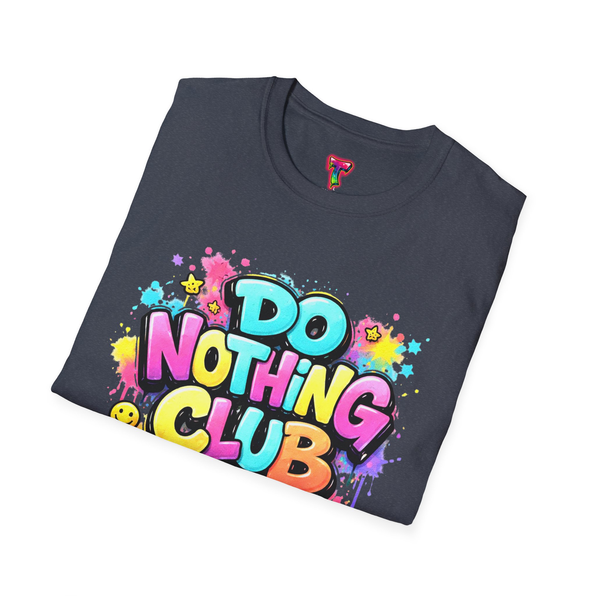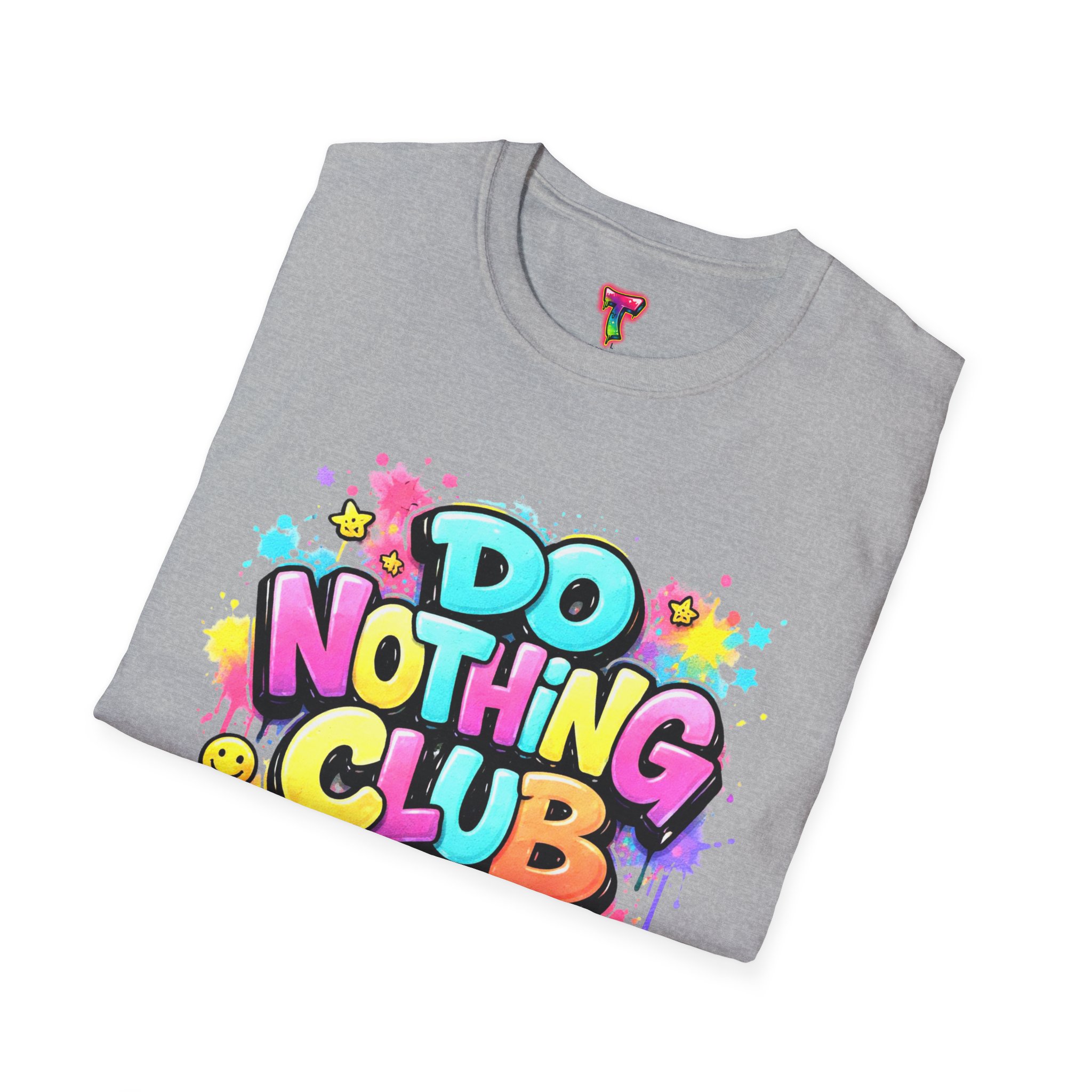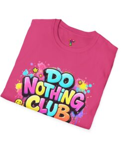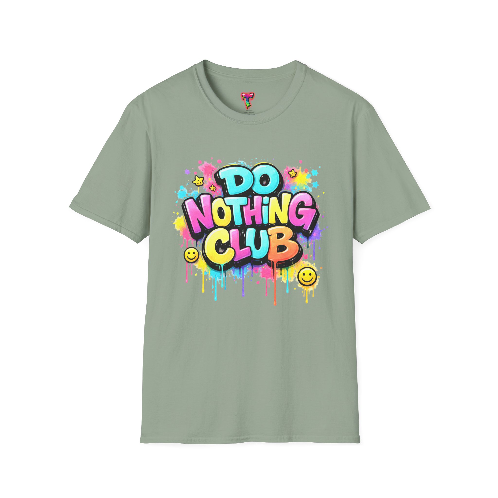 Bright, playful, and unapologetically chill — this soft cotton tee wears its laid-back attitude on the chest. A bold, graffiti-style “DO NOTHING CLUB” design pops in candy-bright colors with paint drips and smiley accents, nodding to street art and easygoing weekend vibes. The lightweight ring-spun cotton feels soft against skin and moves with you, whether you’re lounging at home, wandering the city, or meeting friends for a slow, sunlit afternoon. Built with thoughtful details — a stretch-retaining ribbed collar, shoulder tape for durability, and a tear-away label for comfort — it looks fresh out of the box and stays that way. This shirt slips into the life of someone who celebrates downtime, casual hangouts, and playful self-expression. Throw it on, slow your pace, and let the graphics do the talking.