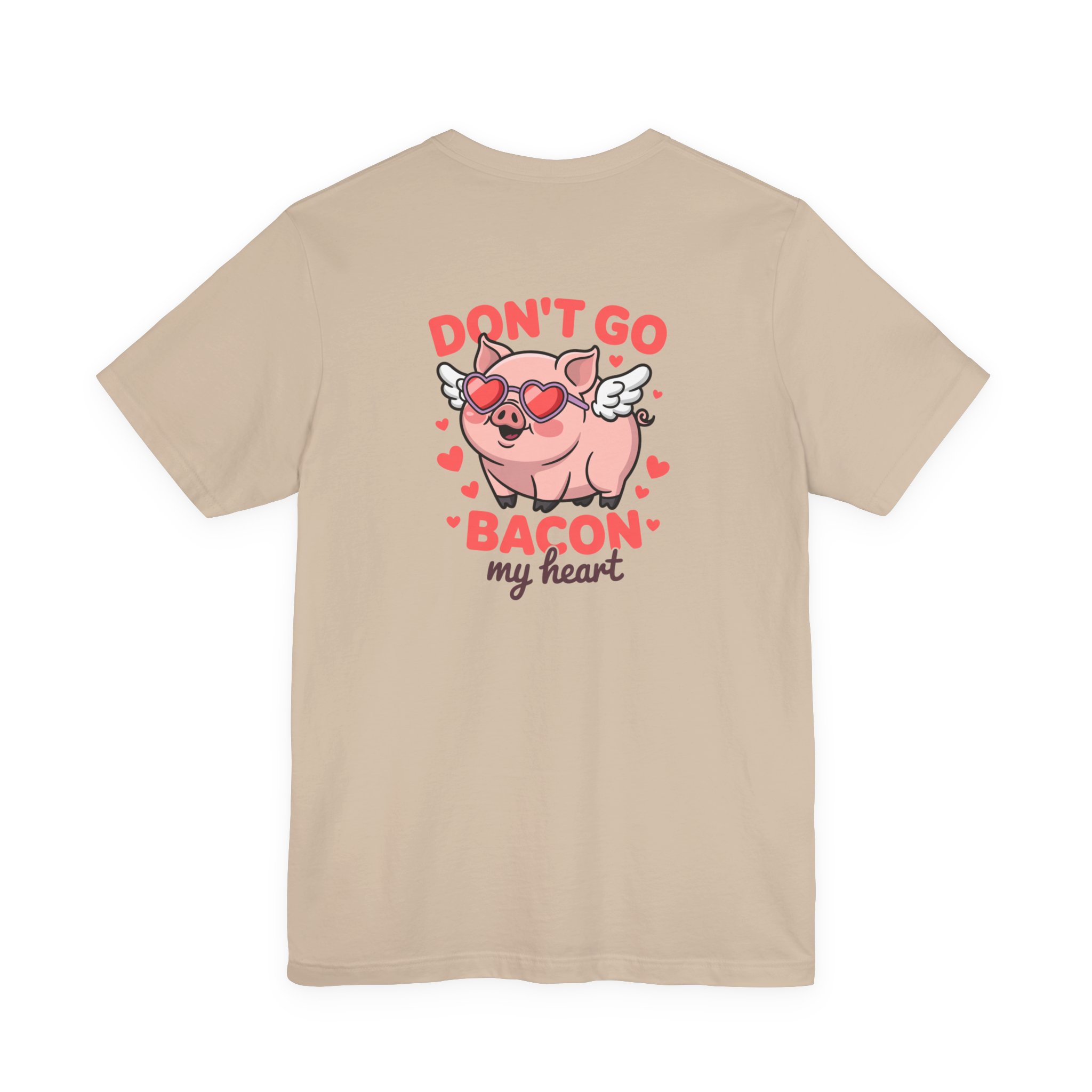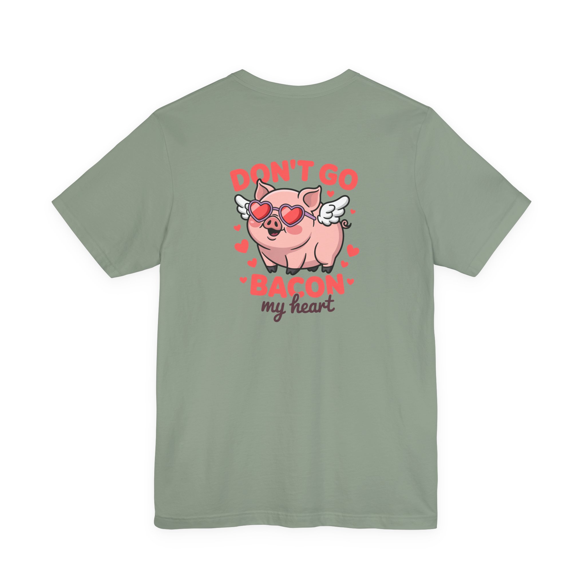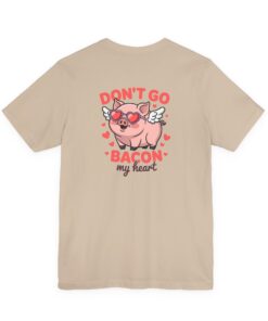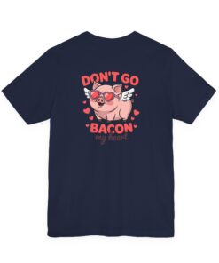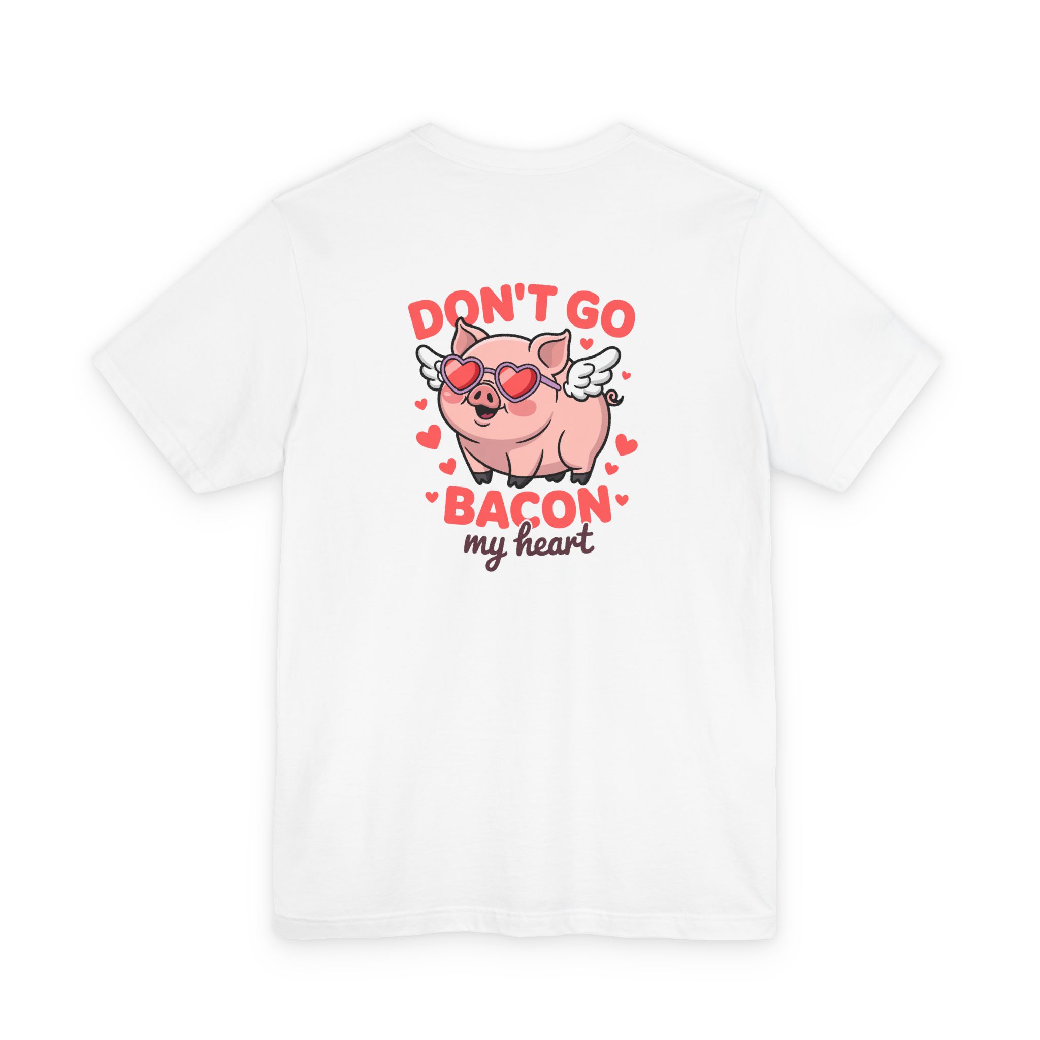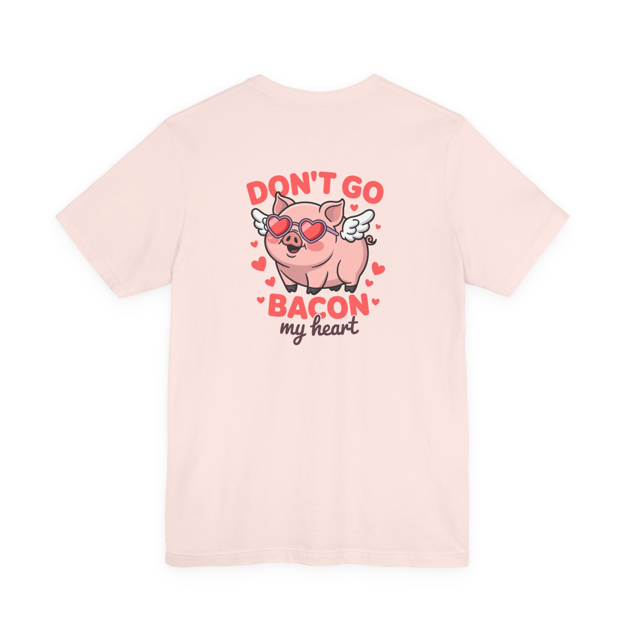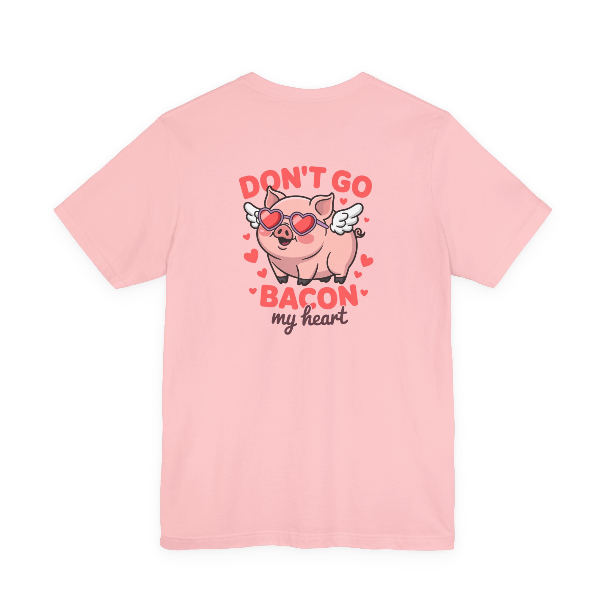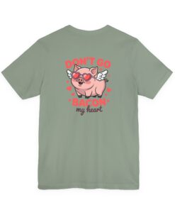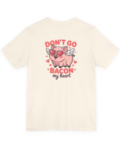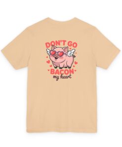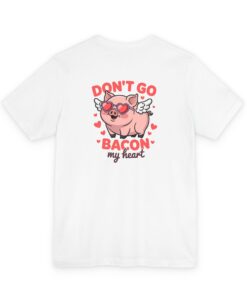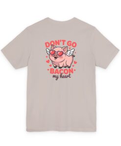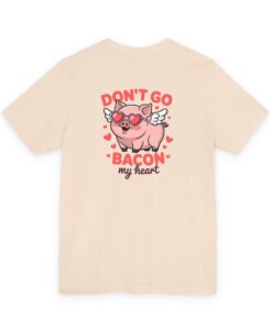 Soft, breathable, and charming — this lightweight tee brings a playful wink to everyday wear. Made from 100% Airlume combed and ring-spun cotton (with select heather/blend color options), it feels gentle against the skin while holding its shape thanks to side seams, shoulder tape, and a ribbed knit collar. The front chest features a small, sweet pig motif; the back shows a cheerful, heart-eyed pig with wings and the text “DON’T GO BACON my heart,” giving the shirt a cheeky, affectionate vibe. Finished with a tear-away label for comfort and printed using crisp DTF or vibrant DTG methods depending on print zone, this tee layers easily under jackets or stands alone as a light, playful statement piece. Responsibly produced by a brand committed to humane, sustainable practices.