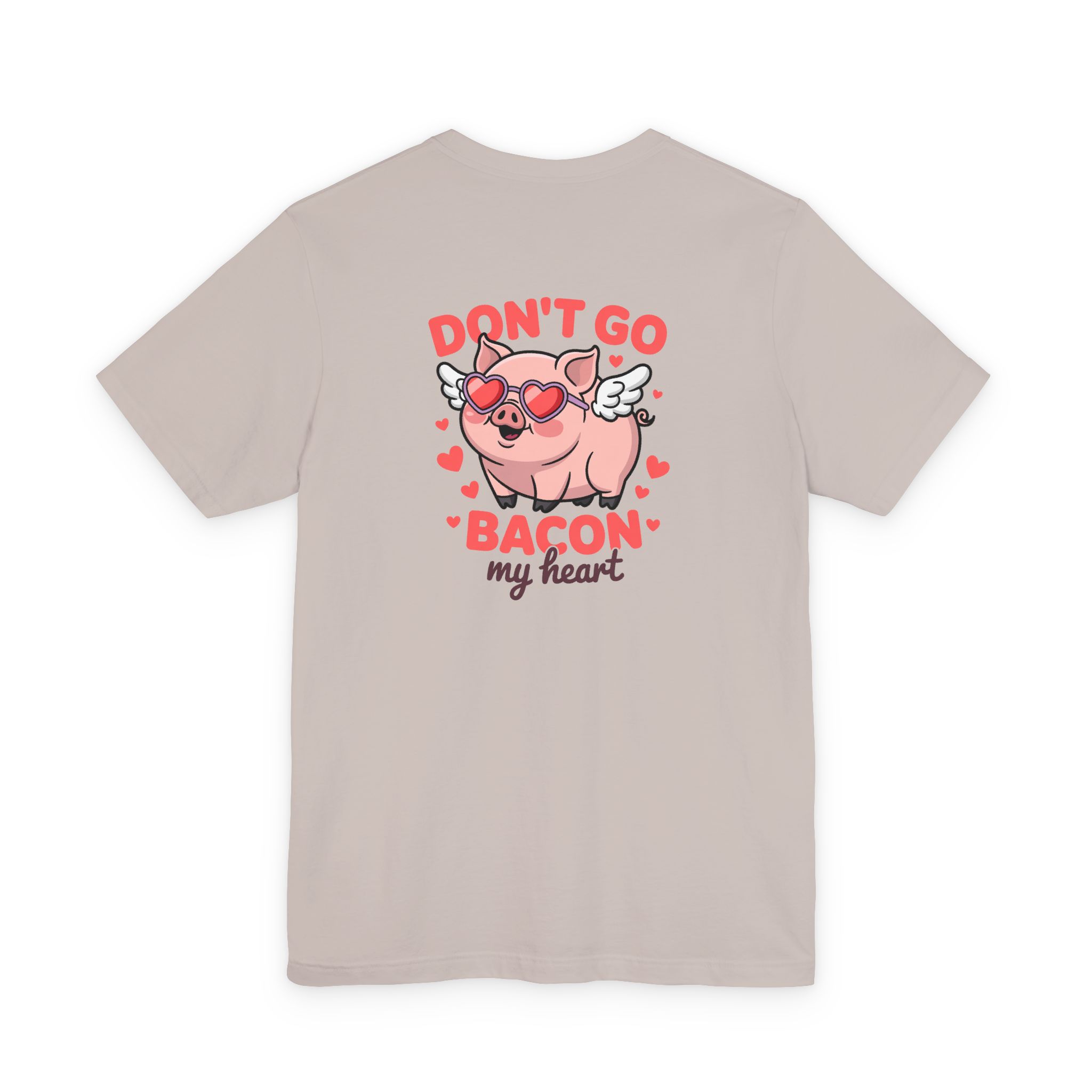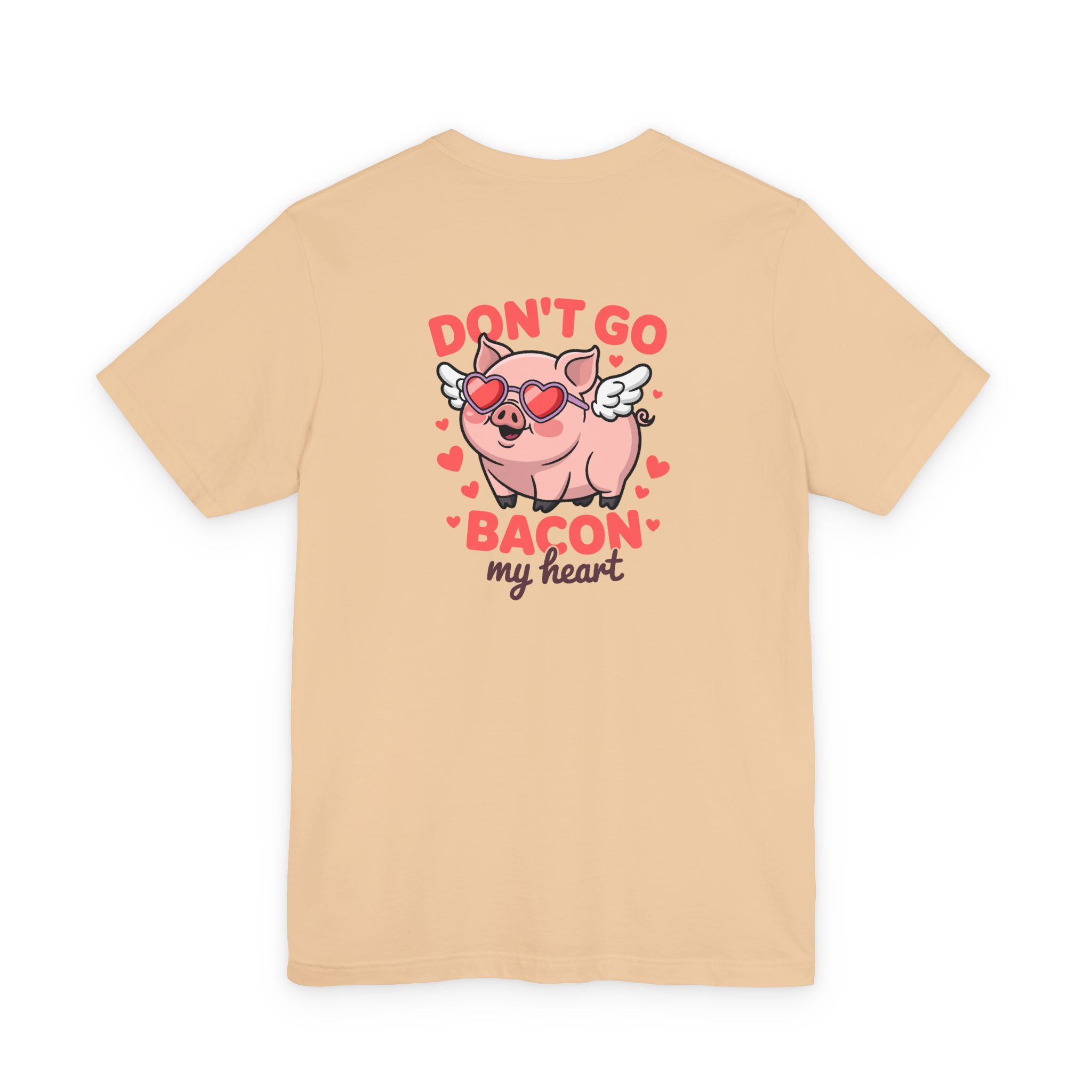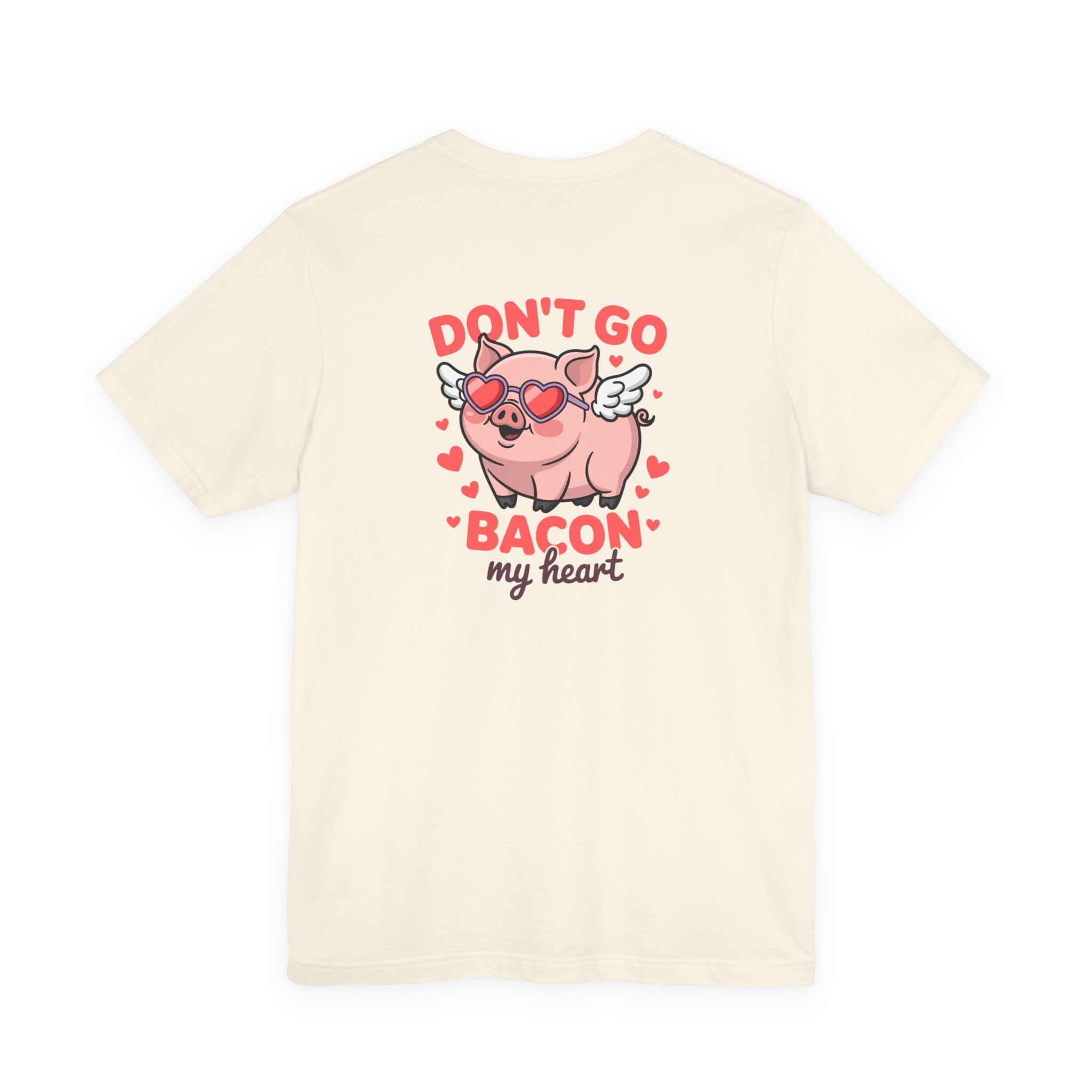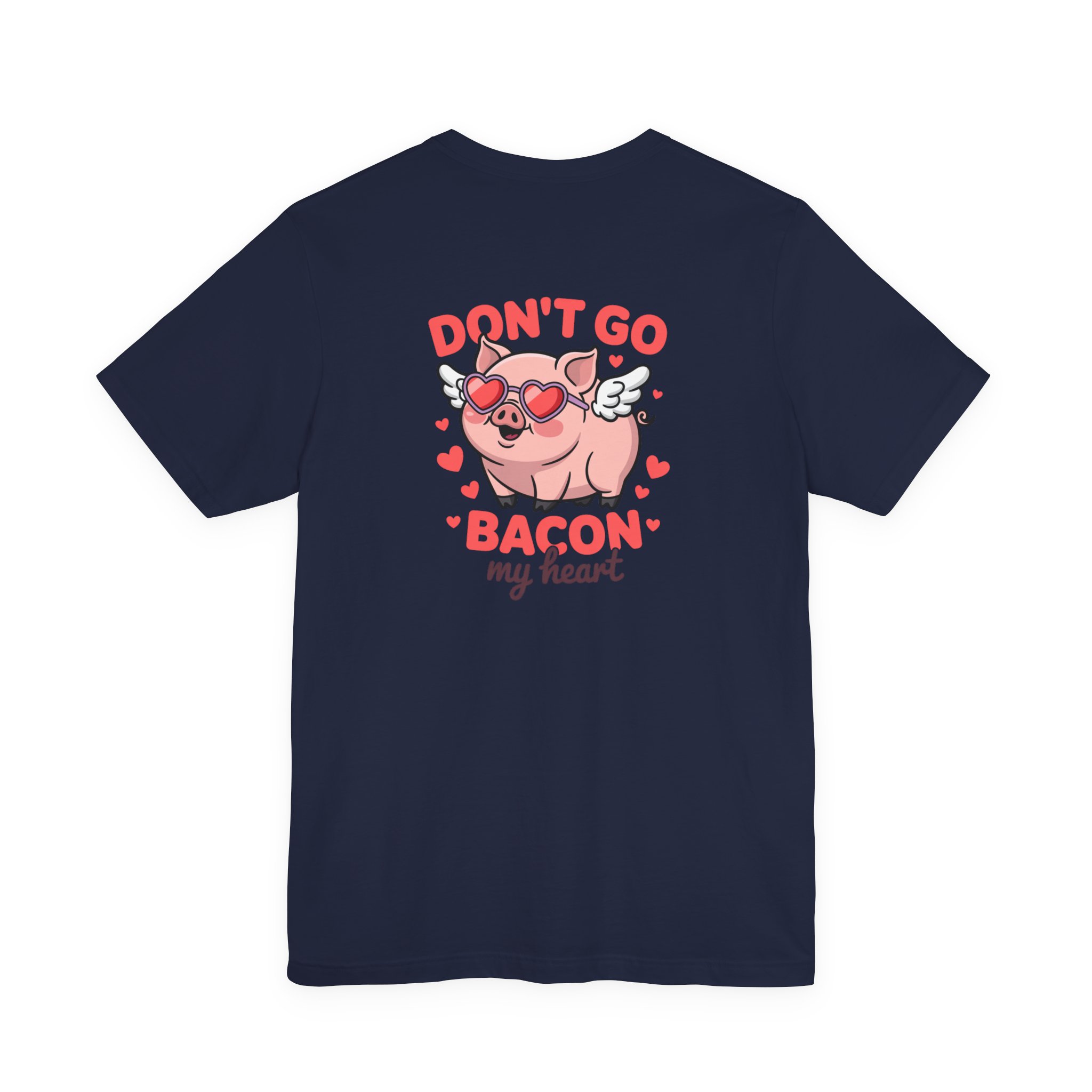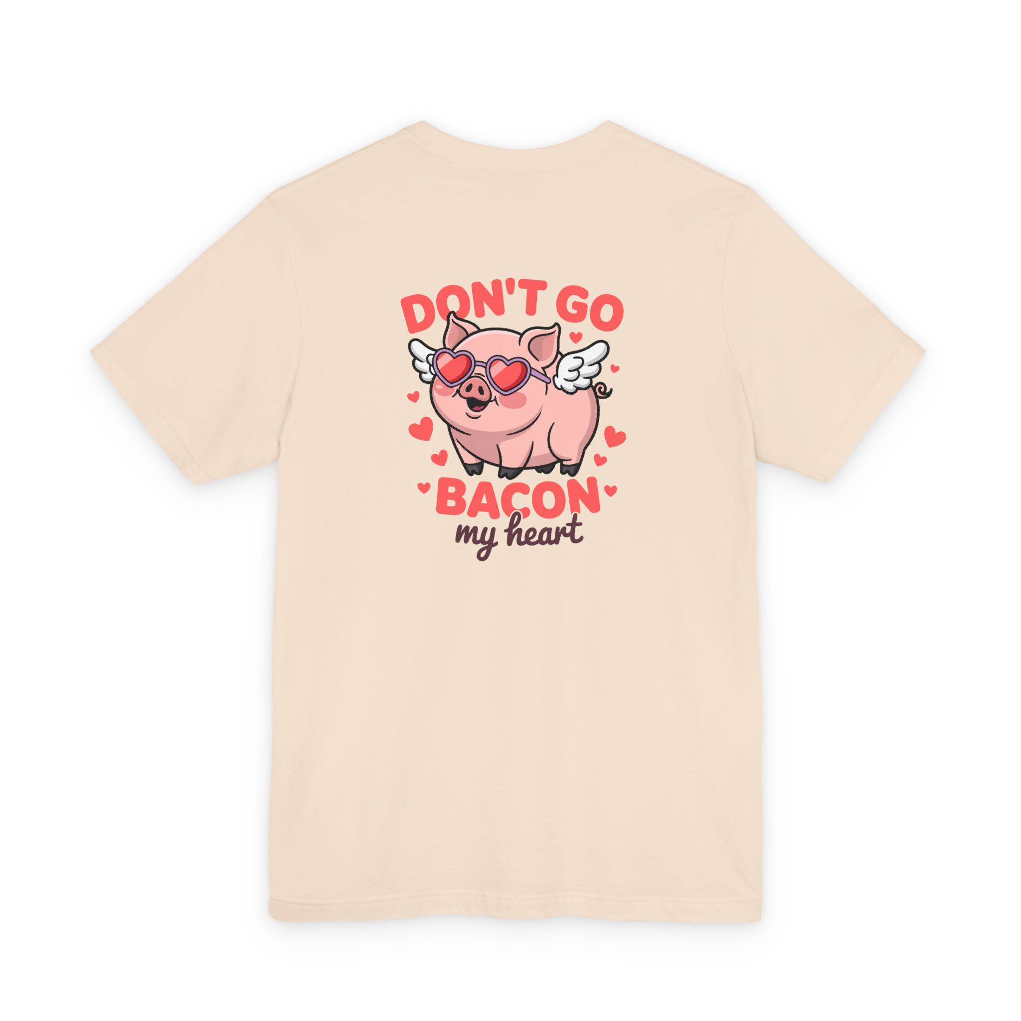 Soft, breathable, and charming — this lightweight tee brings a playful wink to everyday wear. Made from 100% Airlume combed and ring-spun cotton (with select heather/blend color options), it feels gentle against the skin while holding its shape thanks to side seams, shoulder tape, and a ribbed knit collar. The front chest features a small, sweet pig motif; the back shows a cheerful, heart-eyed pig with wings and the text “DON’T GO BACON my heart,” giving the shirt a cheeky, affectionate vibe. Finished with a tear-away label for comfort and printed using crisp DTF or vibrant DTG methods depending on print zone, this tee layers easily under jackets or stands alone as a light, playful statement piece. Responsibly produced by a brand committed to humane, sustainable practices.