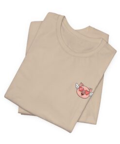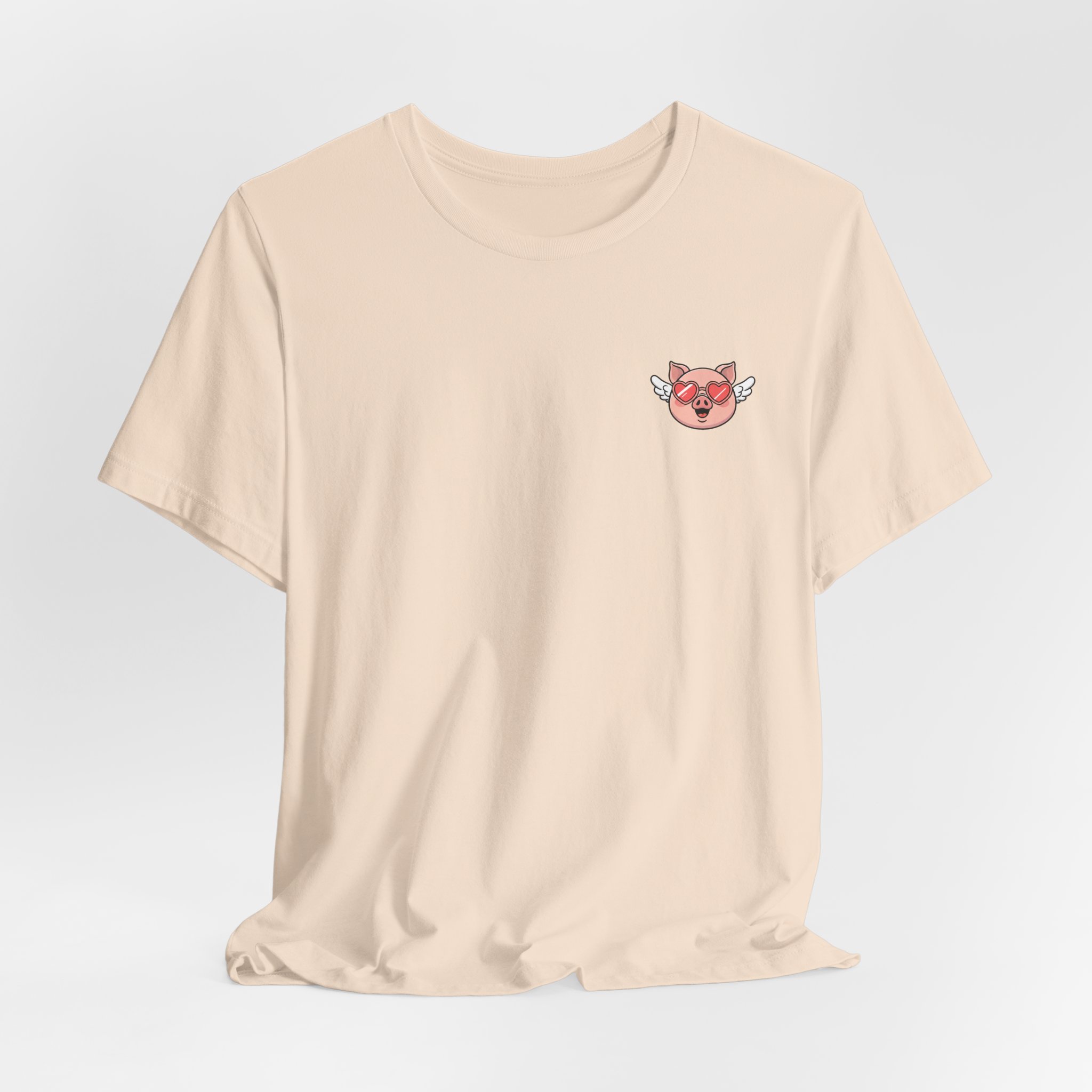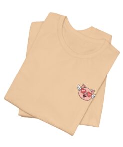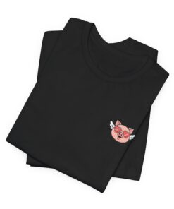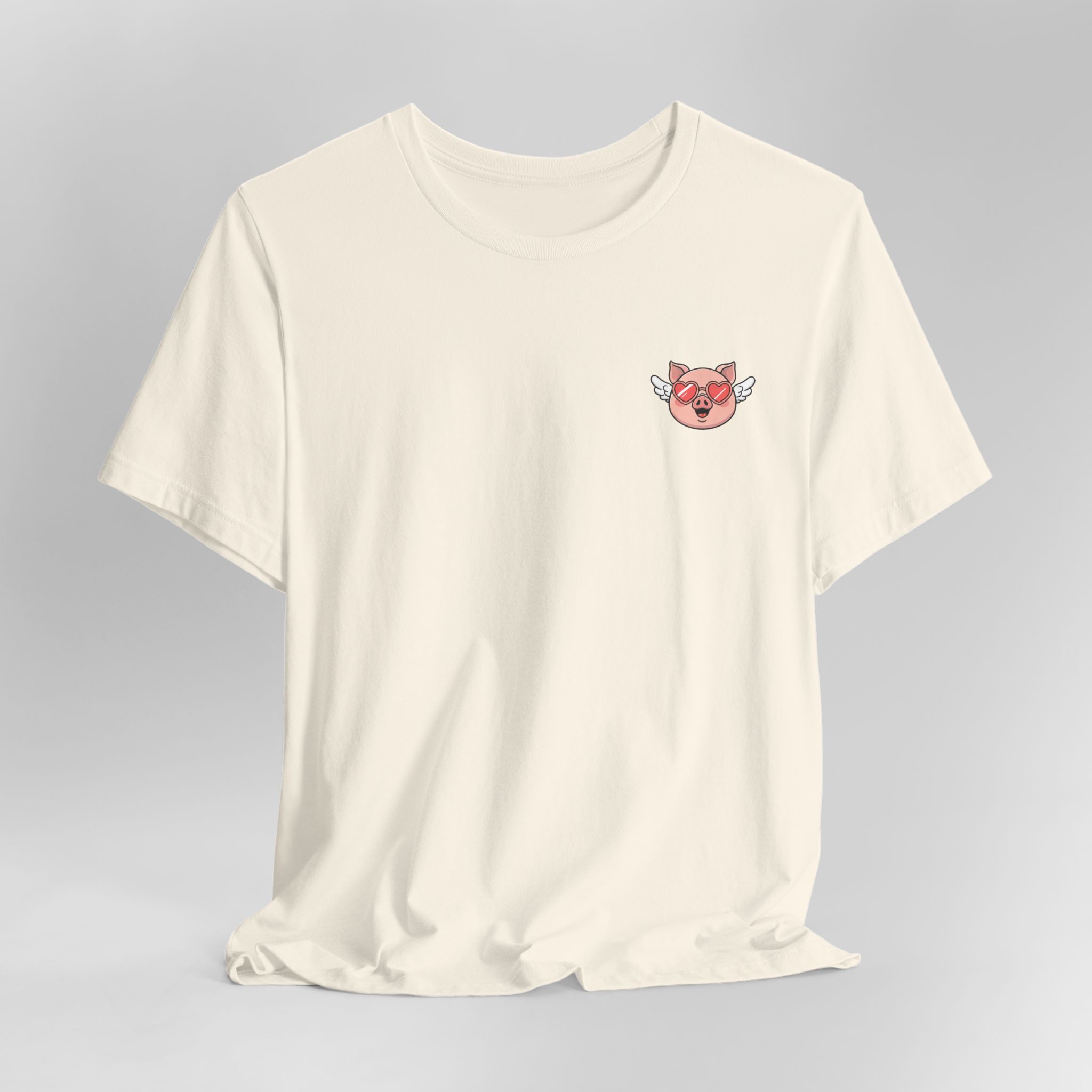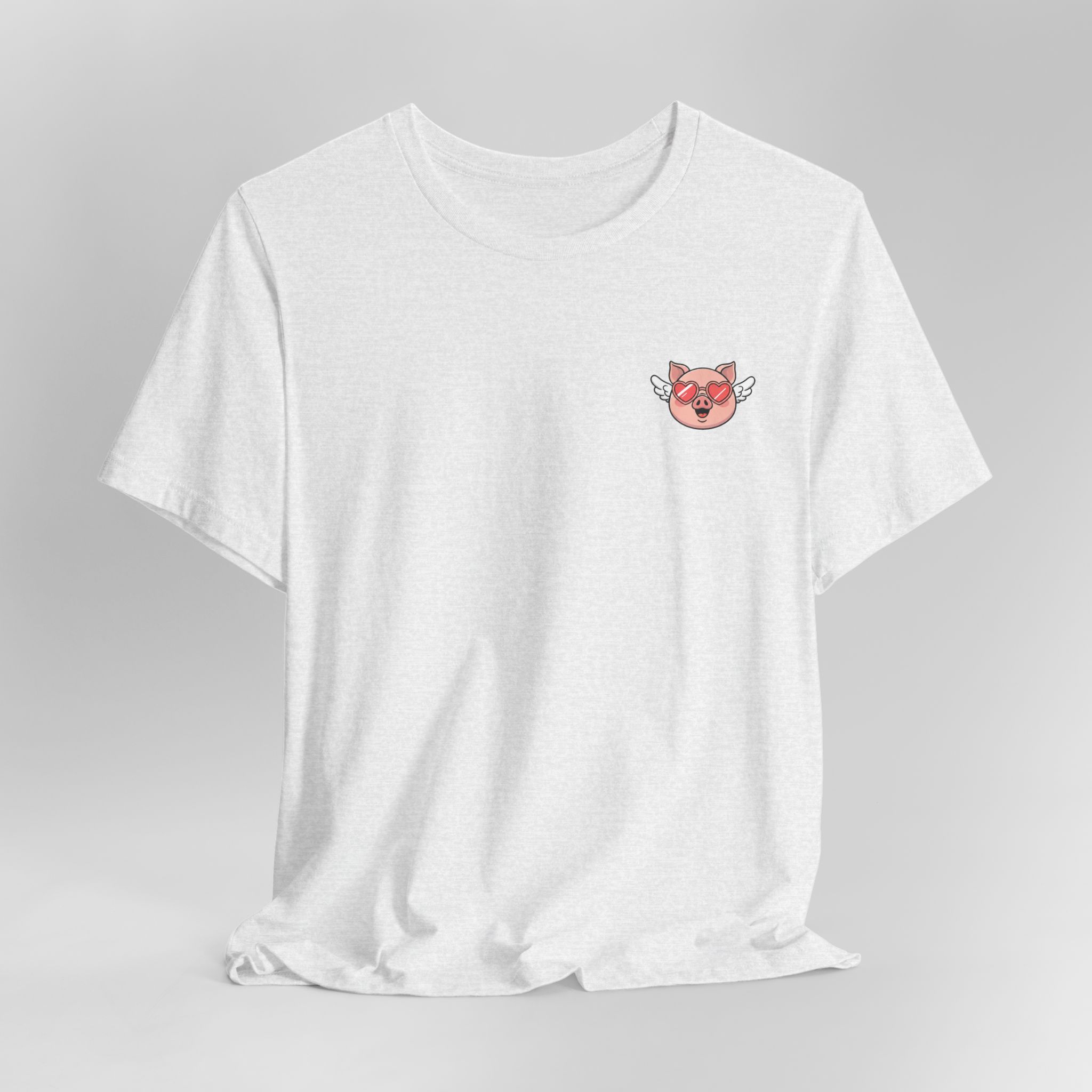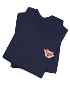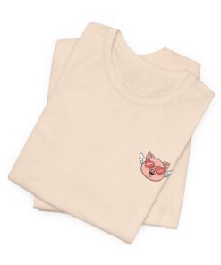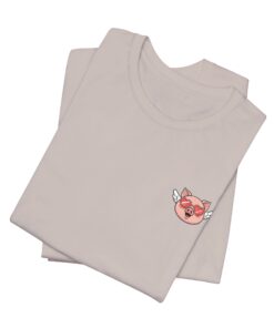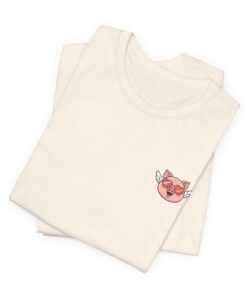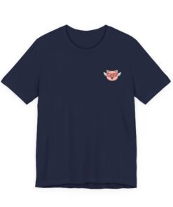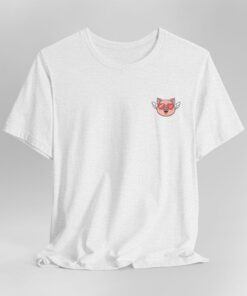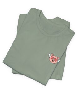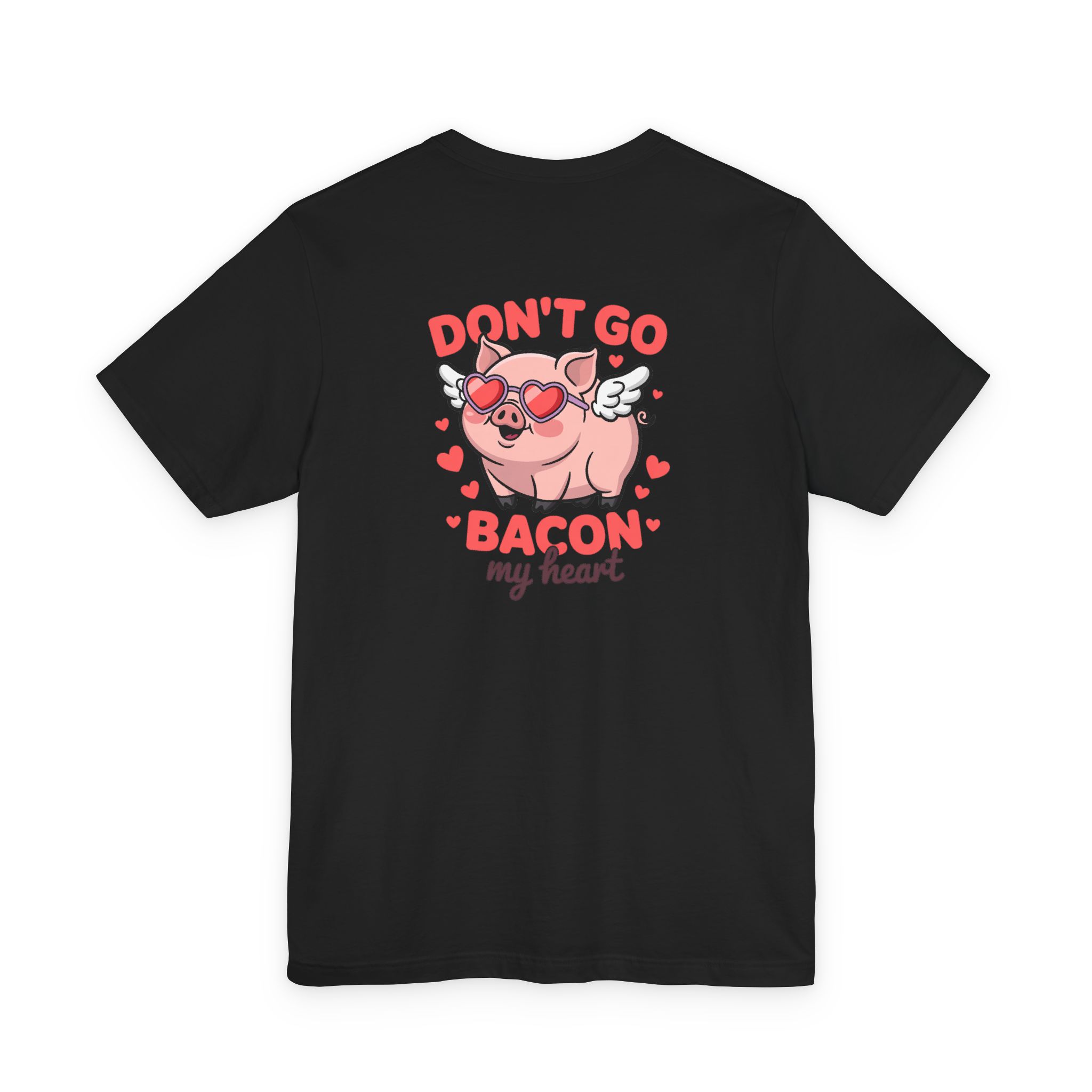 Soft, breathable, and charming — this lightweight tee brings a playful wink to everyday wear. Made from 100% Airlume combed and ring-spun cotton (with select heather/blend color options), it feels gentle against the skin while holding its shape thanks to side seams, shoulder tape, and a ribbed knit collar. The front chest features a small, sweet pig motif; the back shows a cheerful, heart-eyed pig with wings and the text “DON’T GO BACON my heart,” giving the shirt a cheeky, affectionate vibe. Finished with a tear-away label for comfort and printed using crisp DTF or vibrant DTG methods depending on print zone, this tee layers easily under jackets or stands alone as a light, playful statement piece. Responsibly produced by a brand committed to humane, sustainable practices.