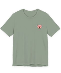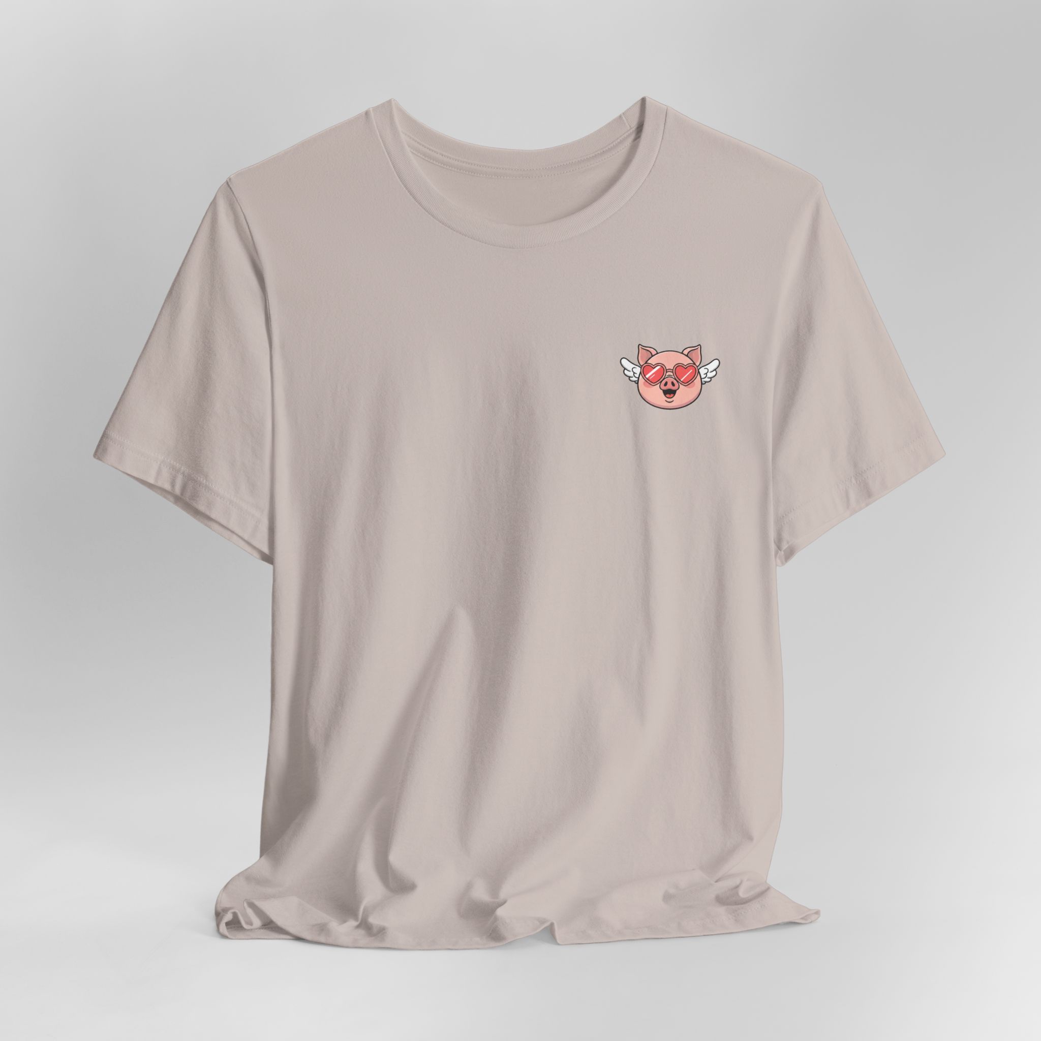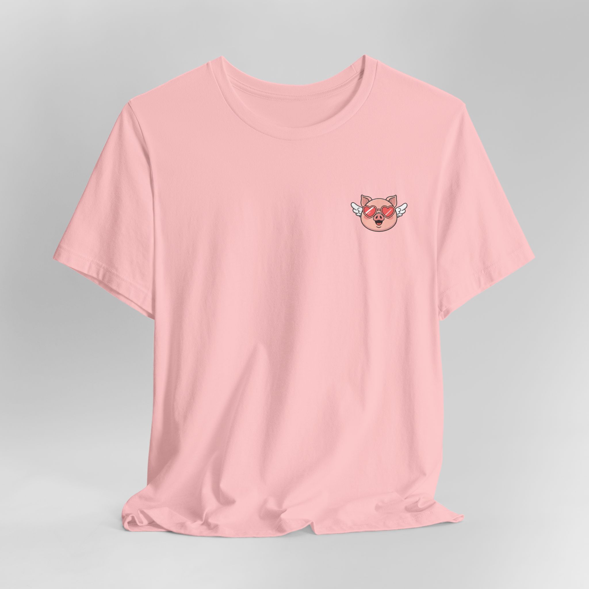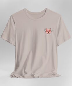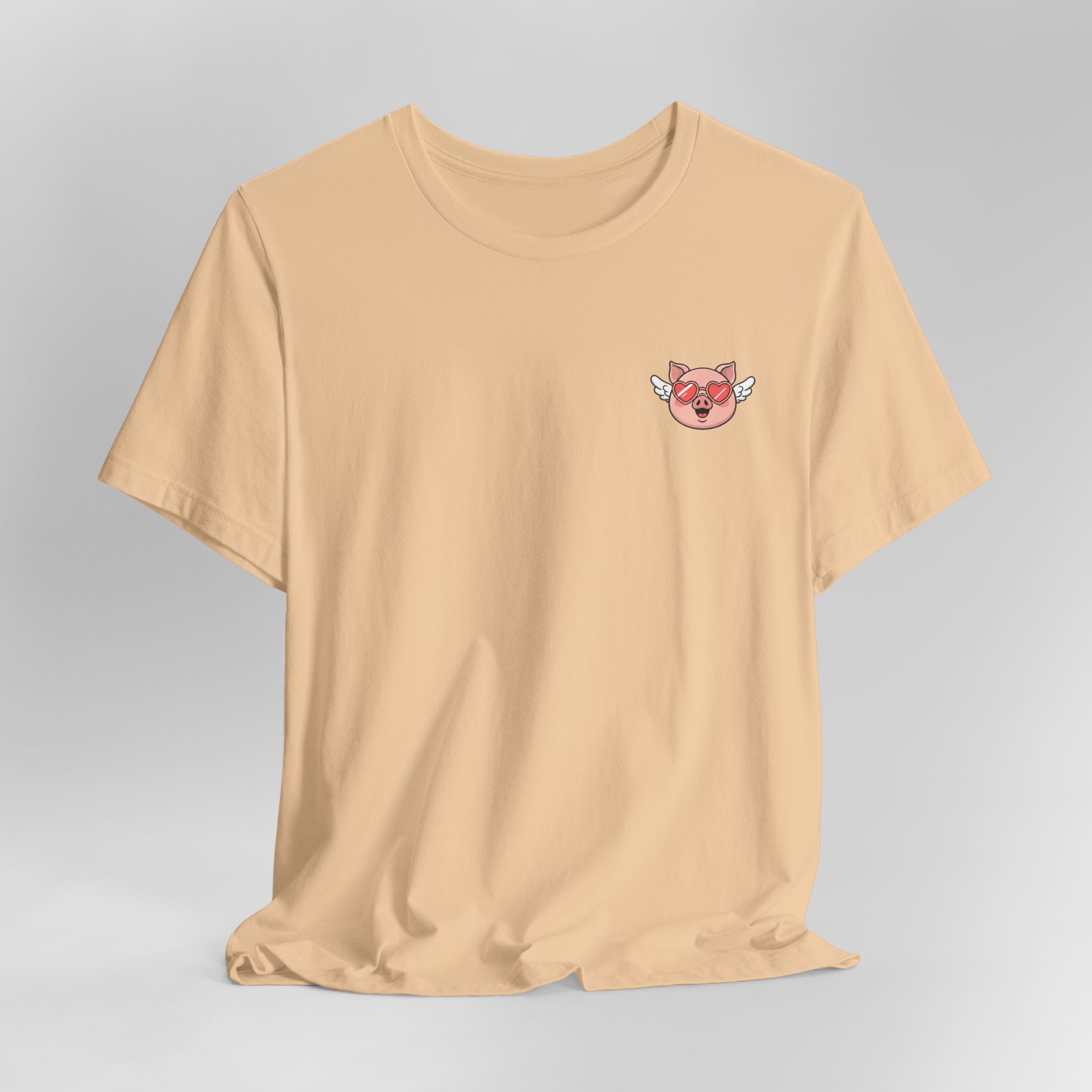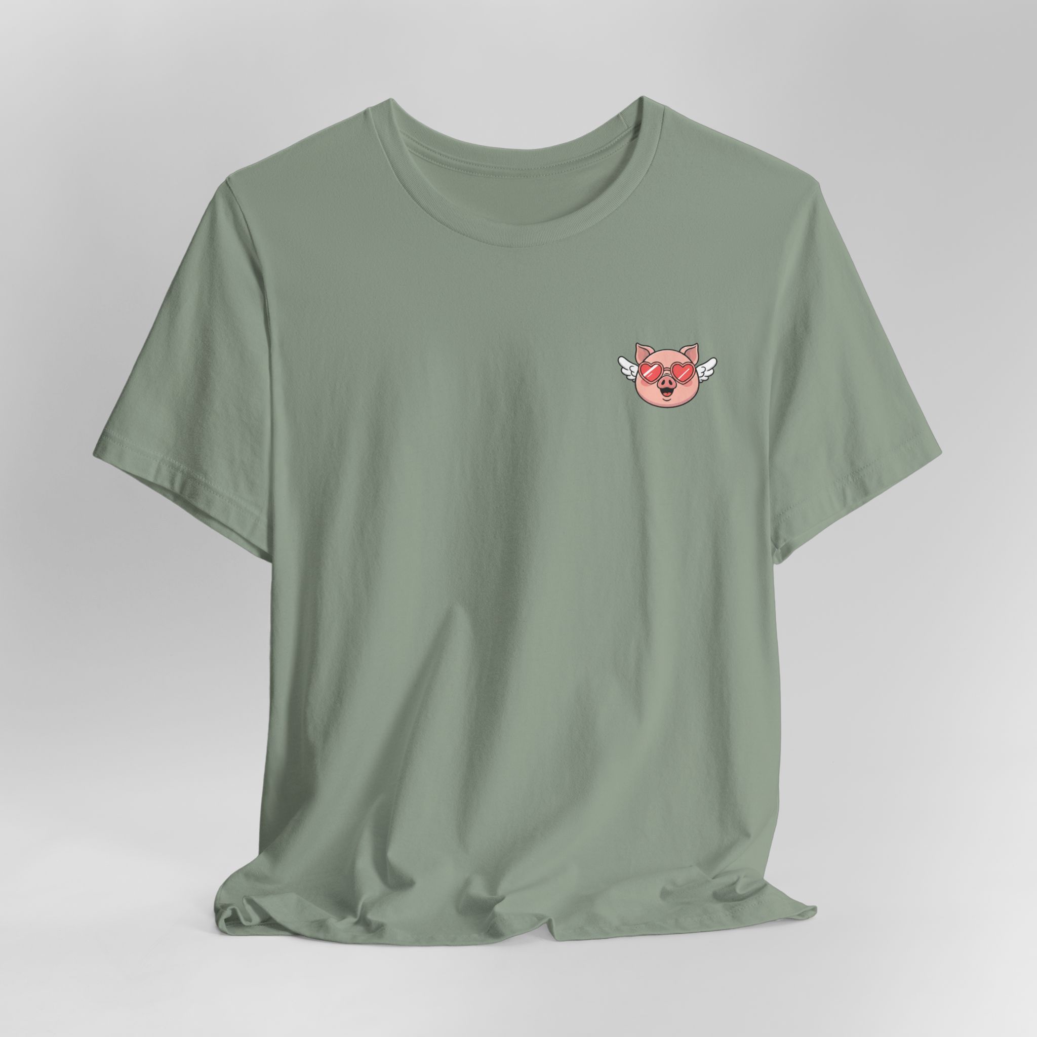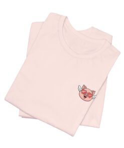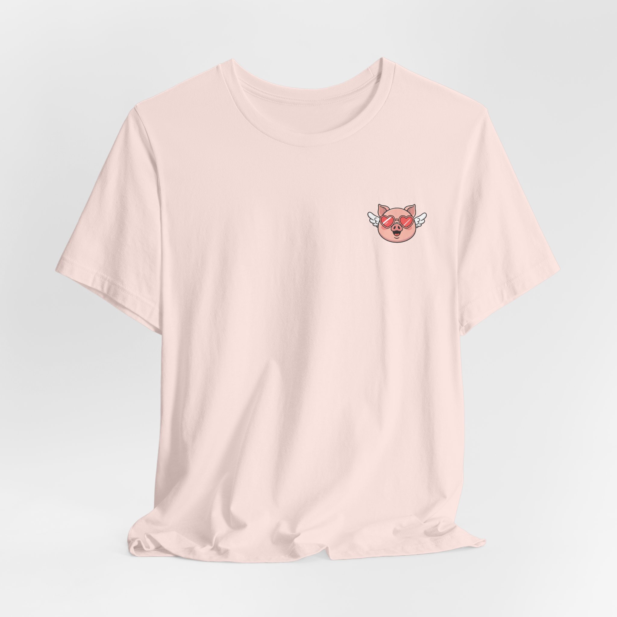 Soft, breathable, and charming — this lightweight tee brings a playful wink to everyday wear. Made from 100% Airlume combed and ring-spun cotton (with select heather/blend color options), it feels gentle against the skin while holding its shape thanks to side seams, shoulder tape, and a ribbed knit collar. The front chest features a small, sweet pig motif; the back shows a cheerful, heart-eyed pig with wings and the text “DON’T GO BACON my heart,” giving the shirt a cheeky, affectionate vibe. Finished with a tear-away label for comfort and printed using crisp DTF or vibrant DTG methods depending on print zone, this tee layers easily under jackets or stands alone as a light, playful statement piece. Responsibly produced by a brand committed to humane, sustainable practices.
