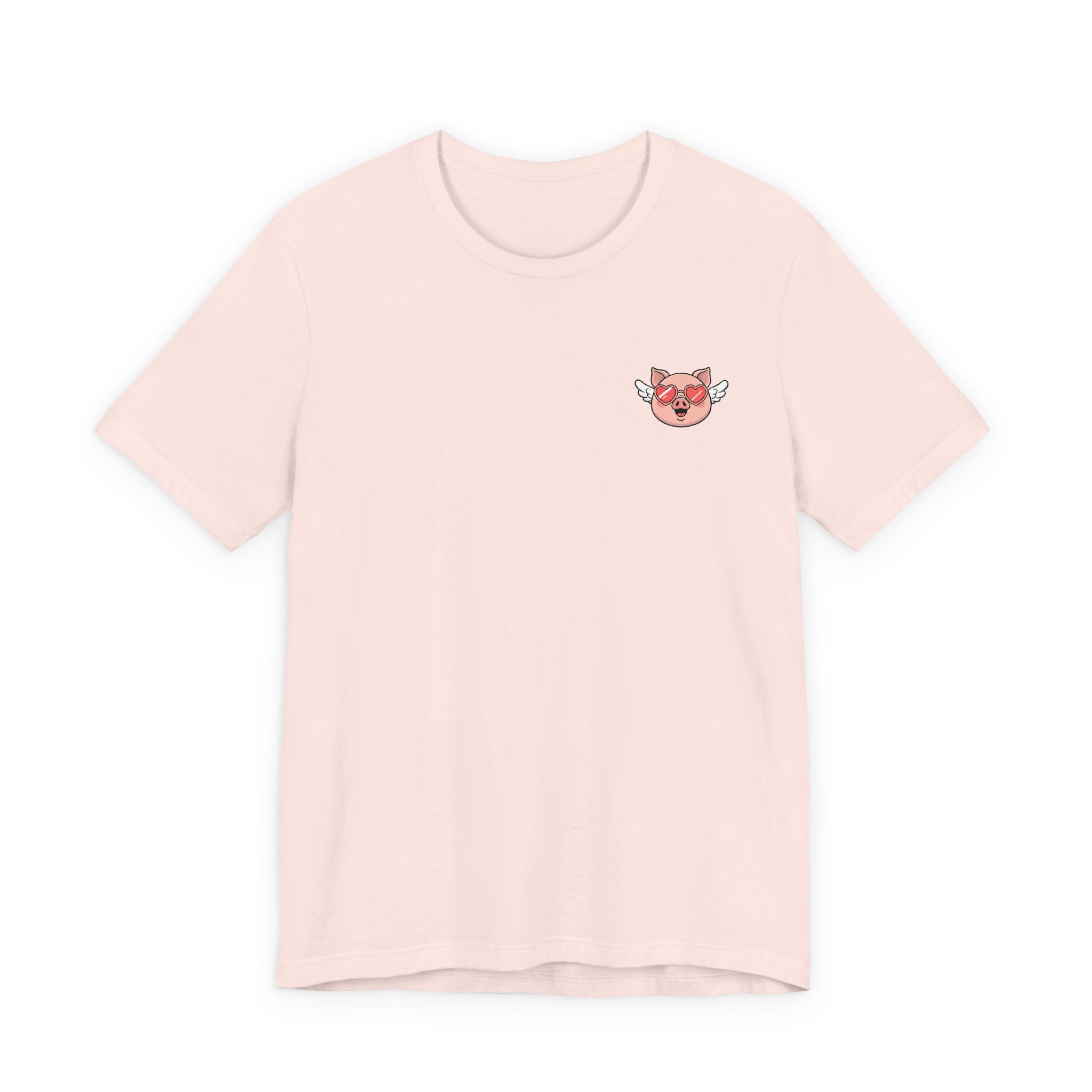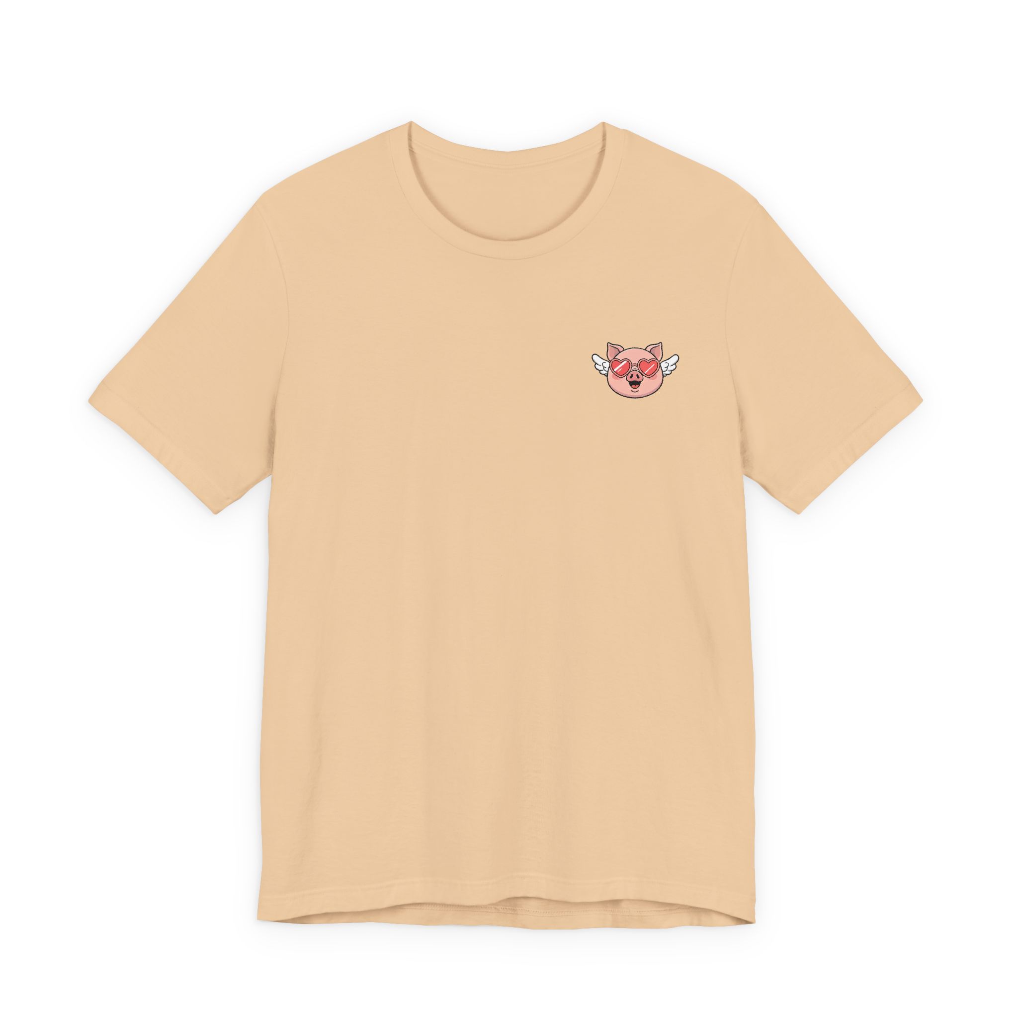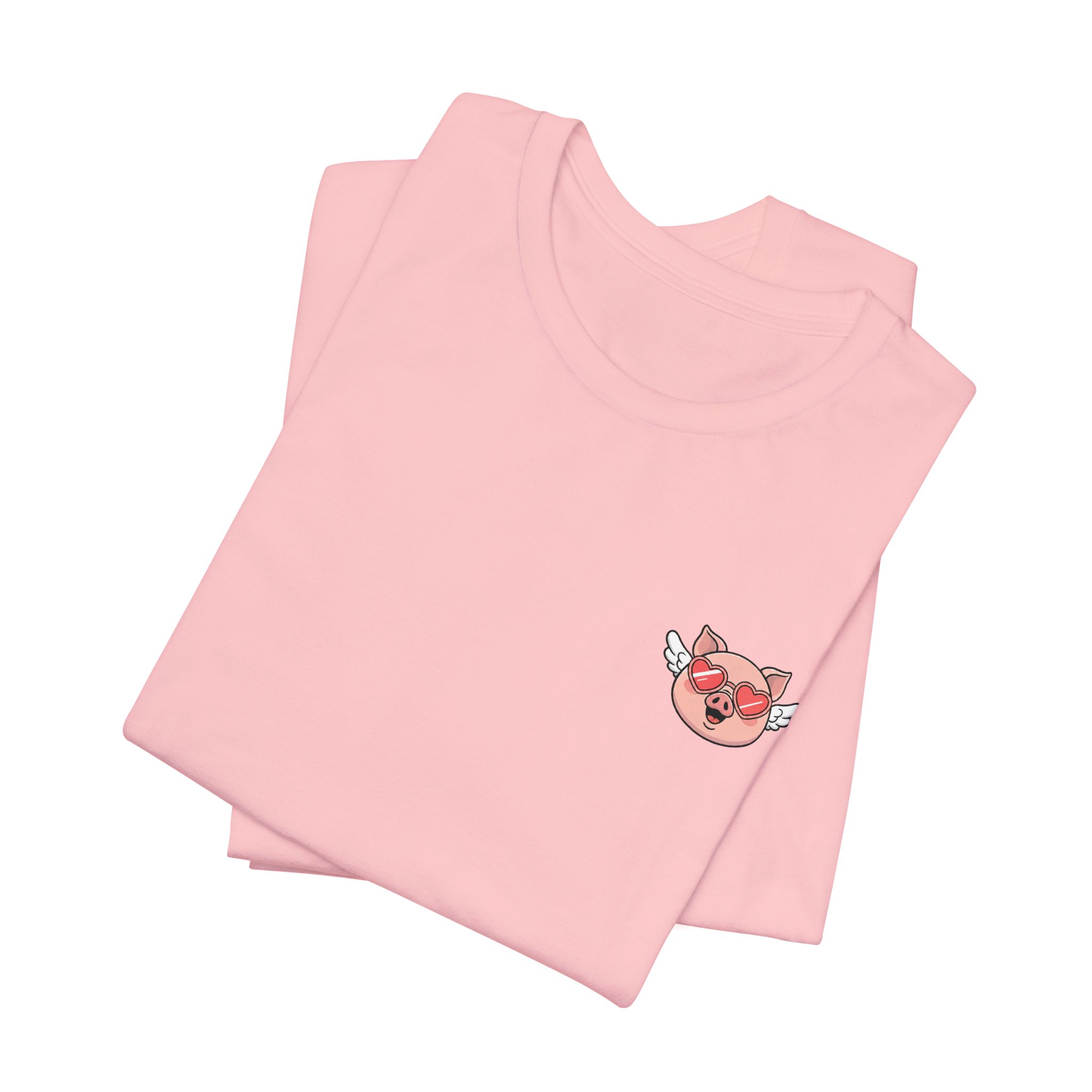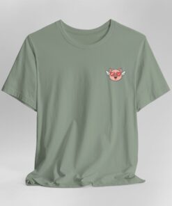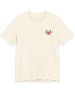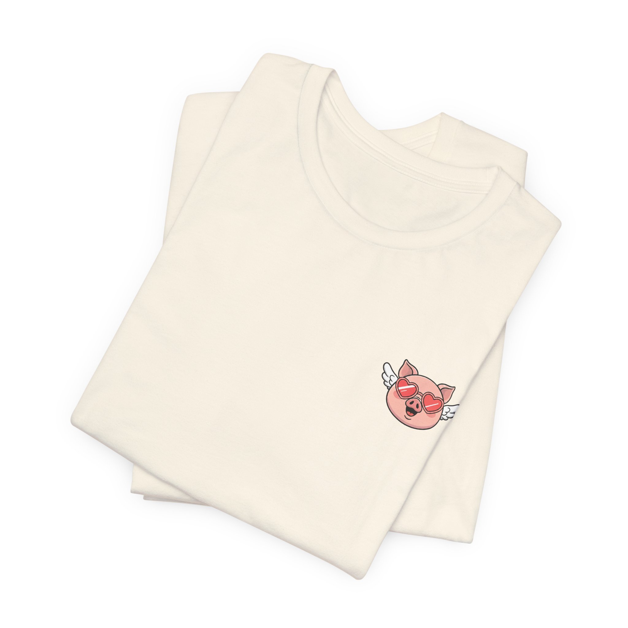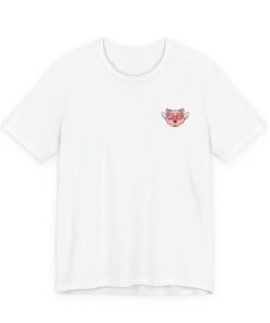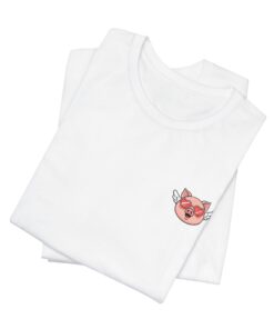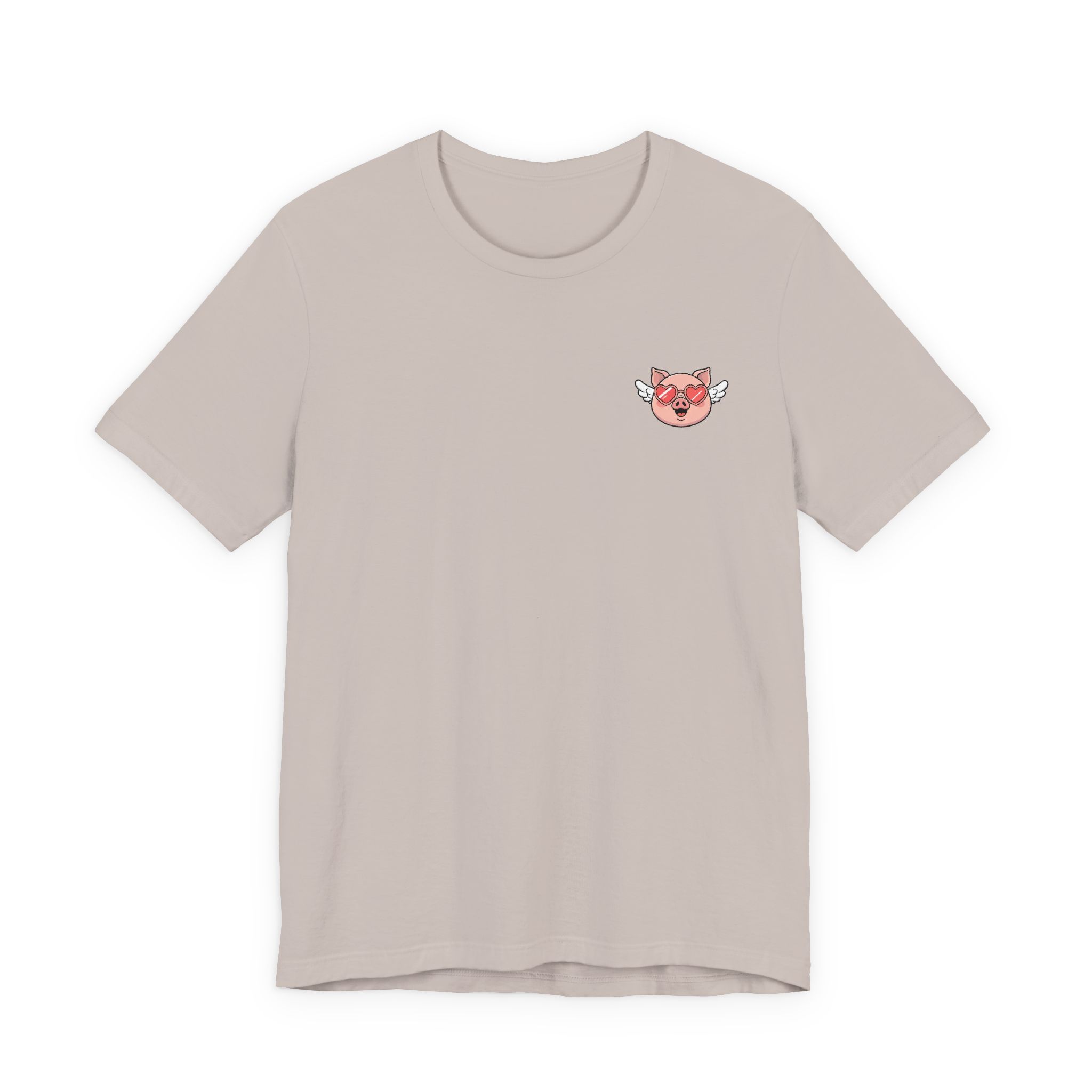 Soft, breathable, and charming — this lightweight tee brings a playful wink to everyday wear. Made from 100% Airlume combed and ring-spun cotton (with select heather/blend color options), it feels gentle against the skin while holding its shape thanks to side seams, shoulder tape, and a ribbed knit collar. The front chest features a small, sweet pig motif; the back shows a cheerful, heart-eyed pig with wings and the text “DON’T GO BACON my heart,” giving the shirt a cheeky, affectionate vibe. Finished with a tear-away label for comfort and printed using crisp DTF or vibrant DTG methods depending on print zone, this tee layers easily under jackets or stands alone as a light, playful statement piece. Responsibly produced by a brand committed to humane, sustainable practices.