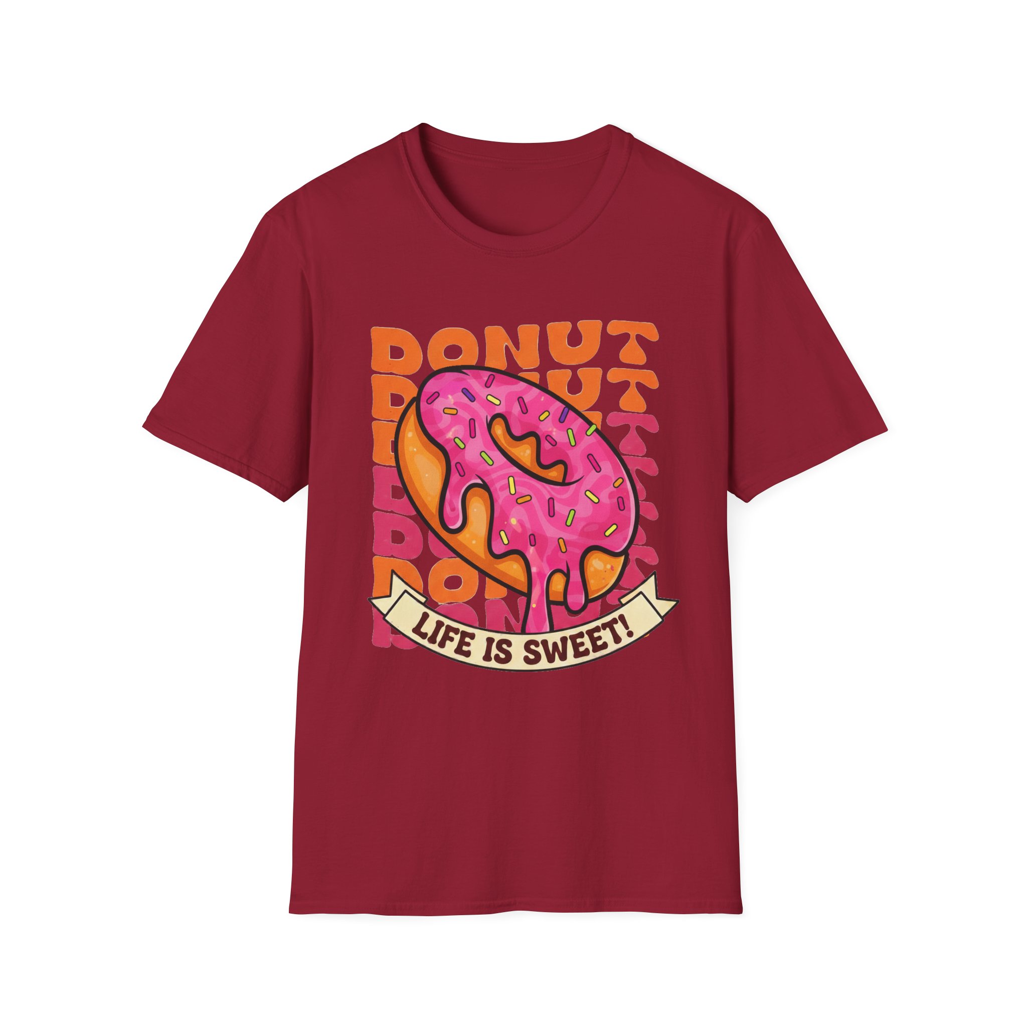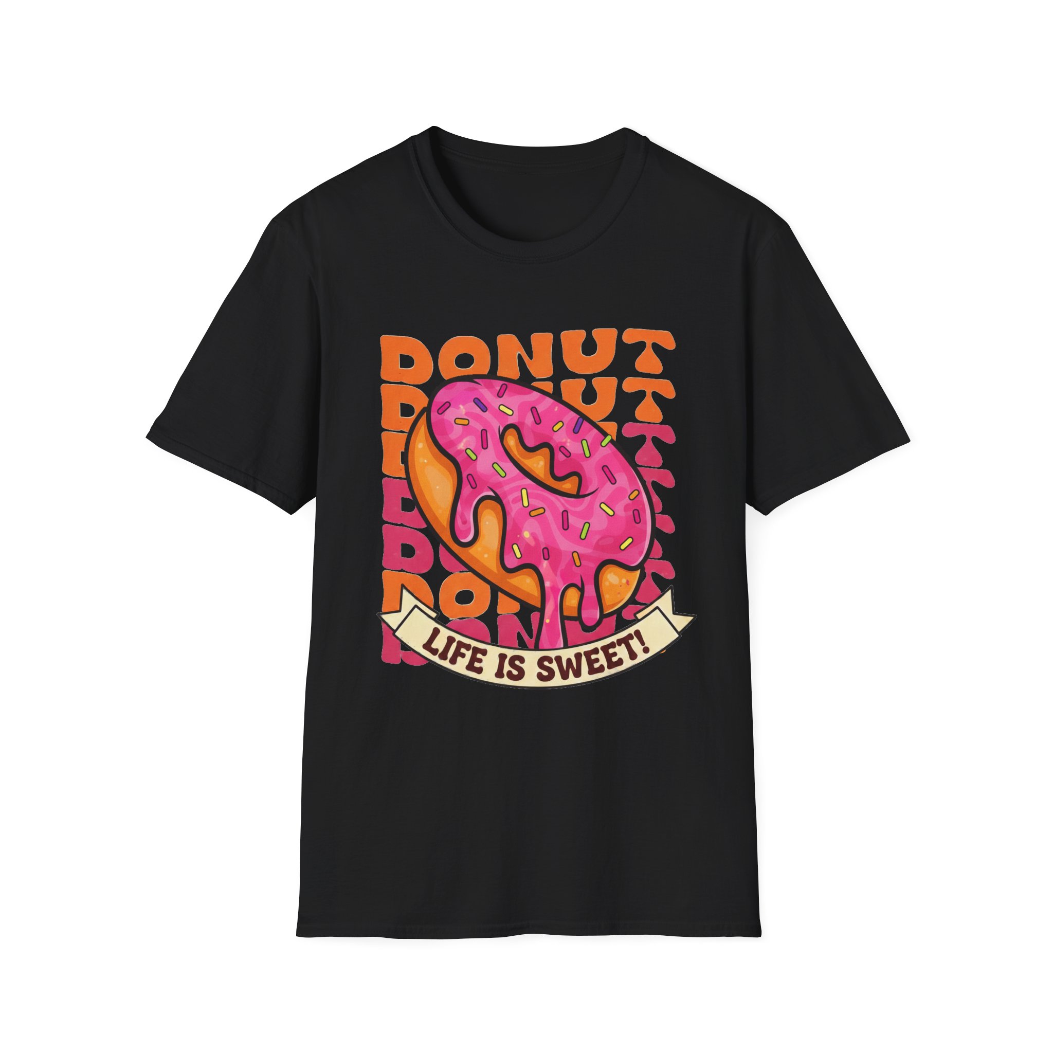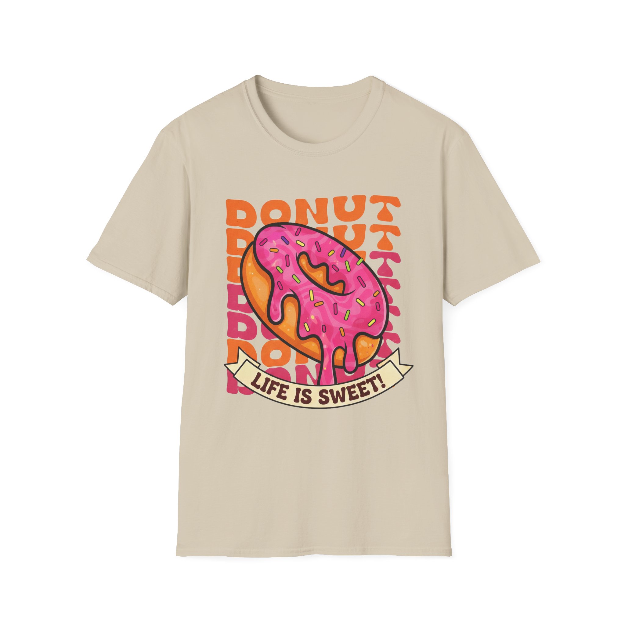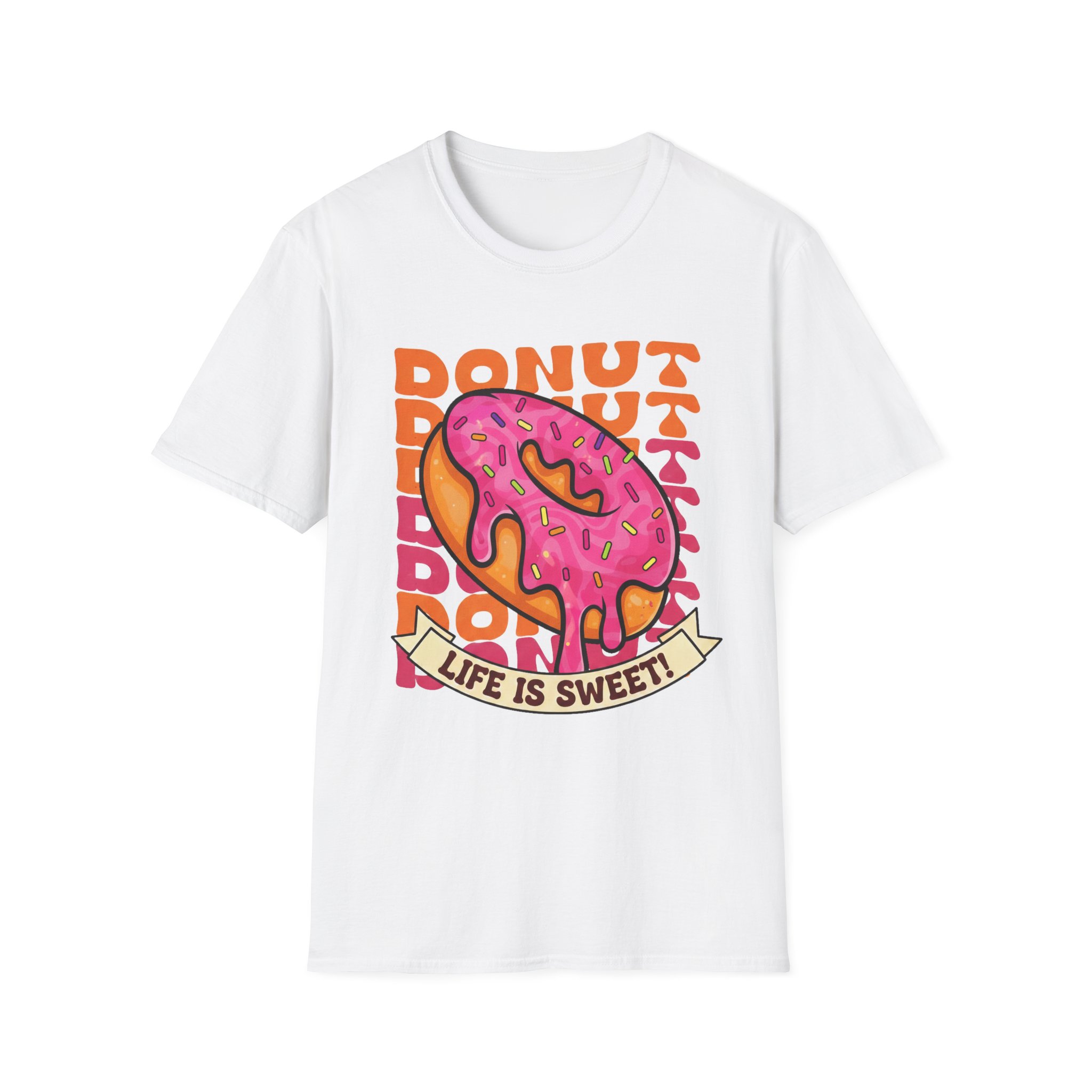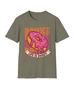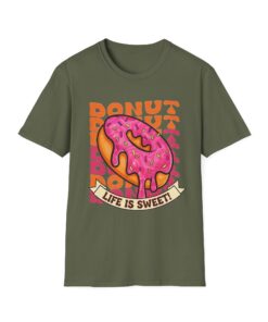 This tee brings a playful, vintage snack-vibe to everyday wear. A bold, hand-illustrated pink sprinkled donut sits front and center above a ribbon that reads “Life is Sweet,” surrounded by warm, retro lettering in orange tones. The design feels sunny and a little nostalgic—like a quick joy-break between errands, a coffee-shop detour, or a weekend stroll. Lightweight and breathable, the shirt moves easily from relaxed mornings to late-night hangouts, adding a splash of color and humor without shouting for attention.