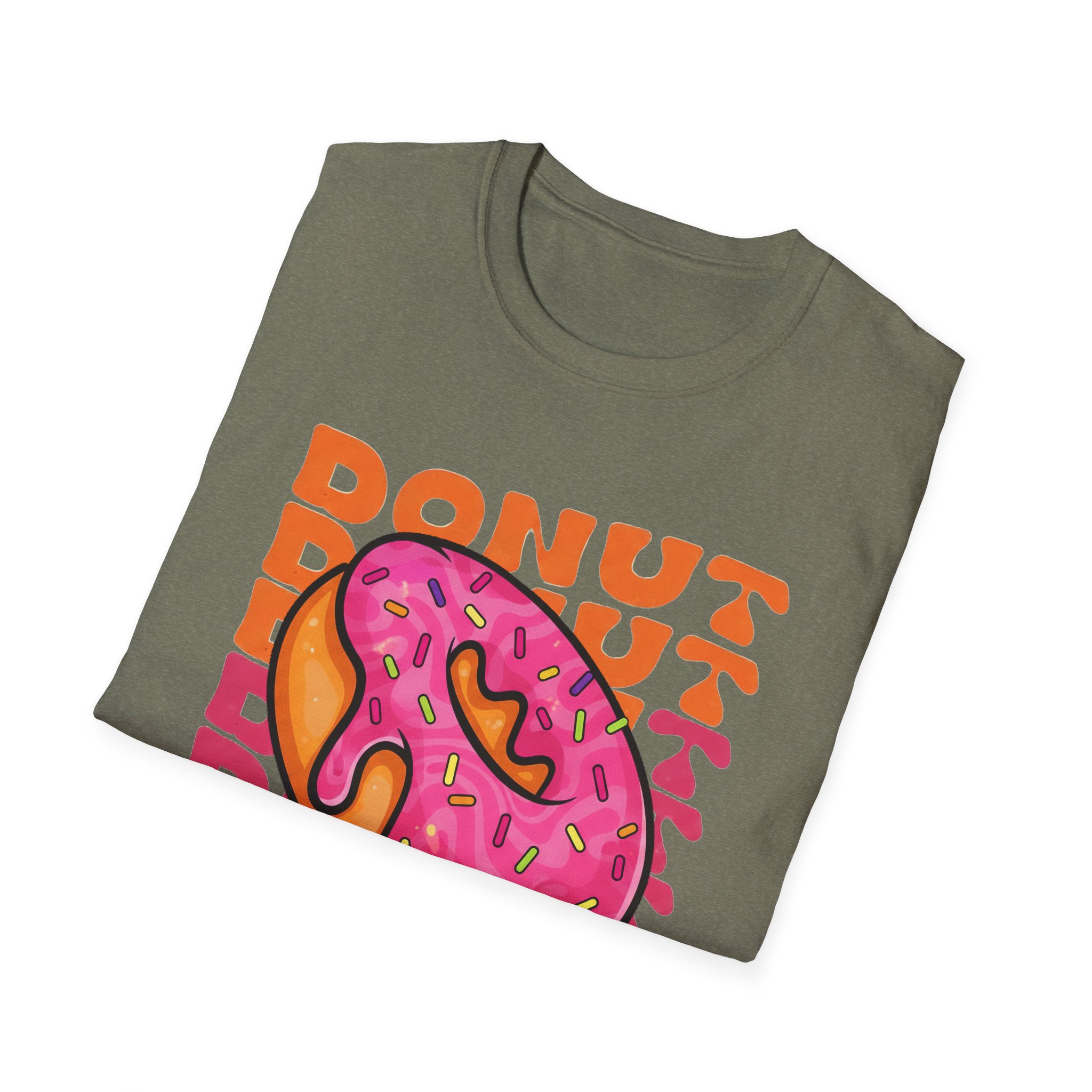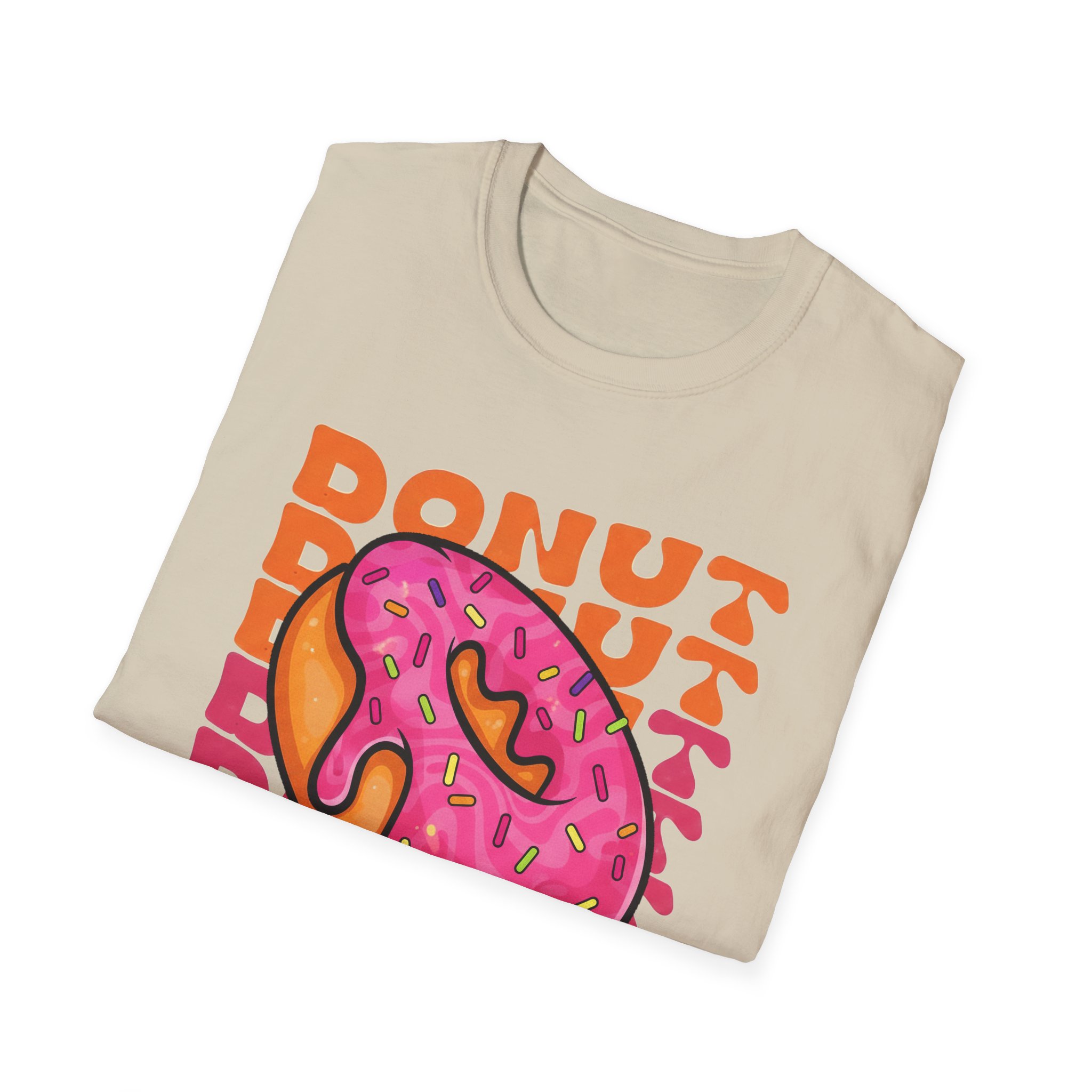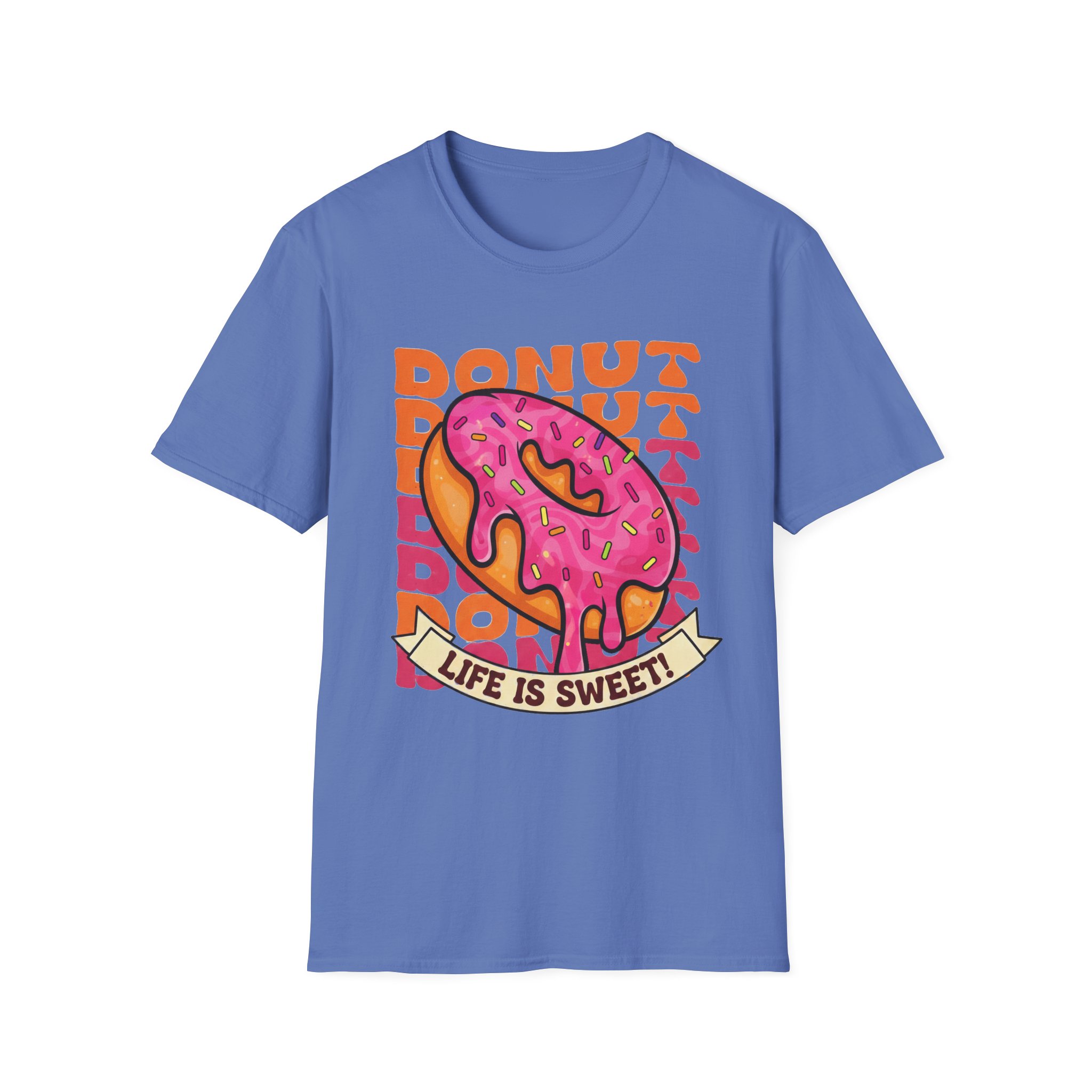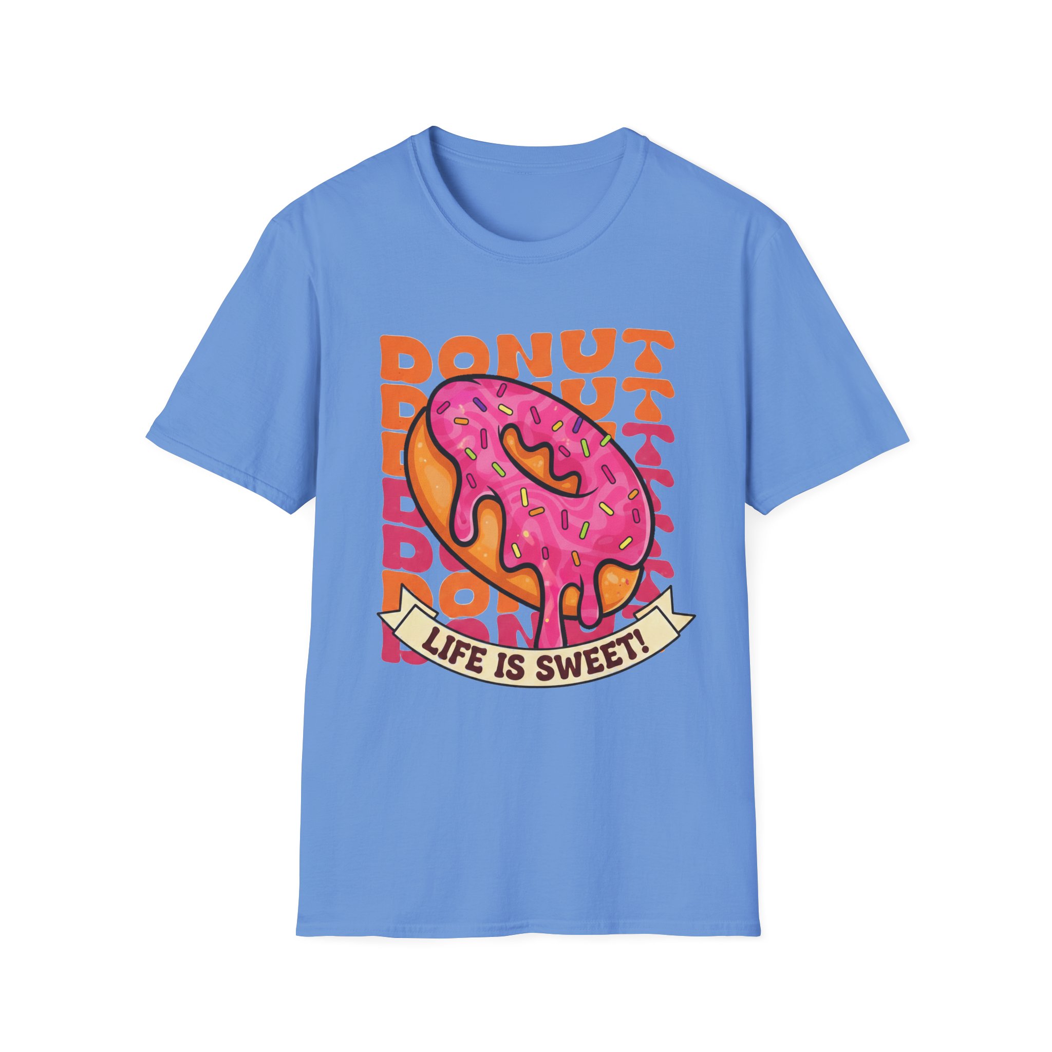This tee brings a playful, vintage snack-vibe to everyday wear. A bold, hand-illustrated pink sprinkled donut sits front and center above a ribbon that reads “Life is Sweet,” surrounded by warm, retro lettering in orange tones. The design feels sunny and a little nostalgic—like a quick joy-break between errands, a coffee-shop detour, or a weekend stroll. Lightweight and breathable, the shirt moves easily from relaxed mornings to late-night hangouts, adding a splash of color and humor without shouting for attention.