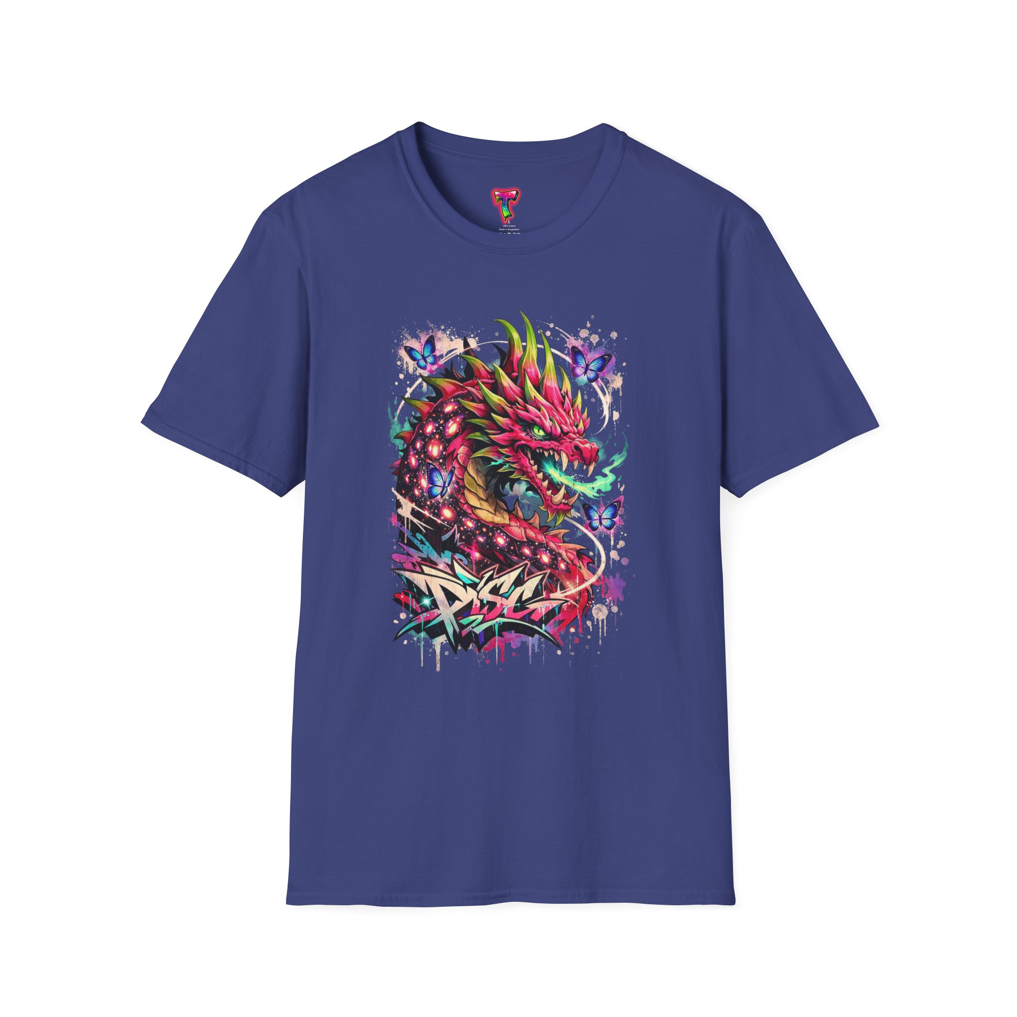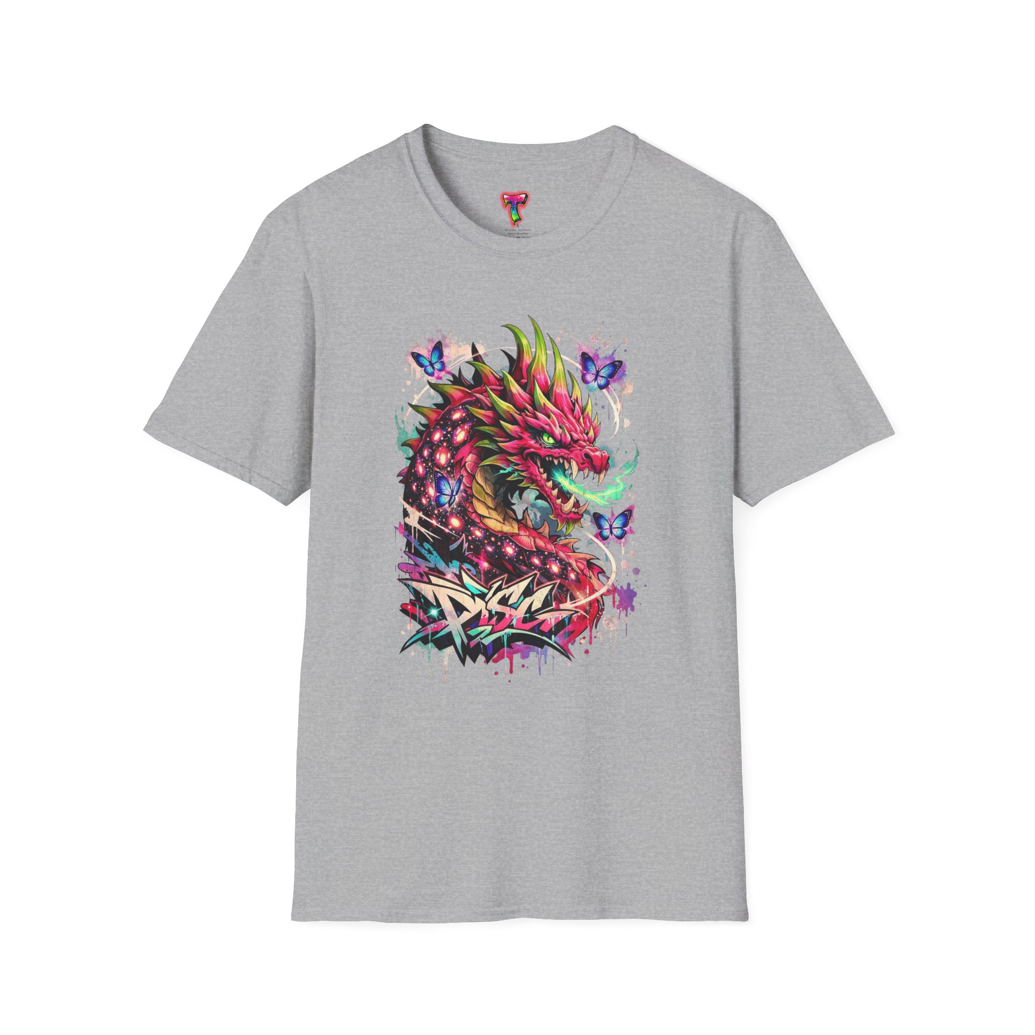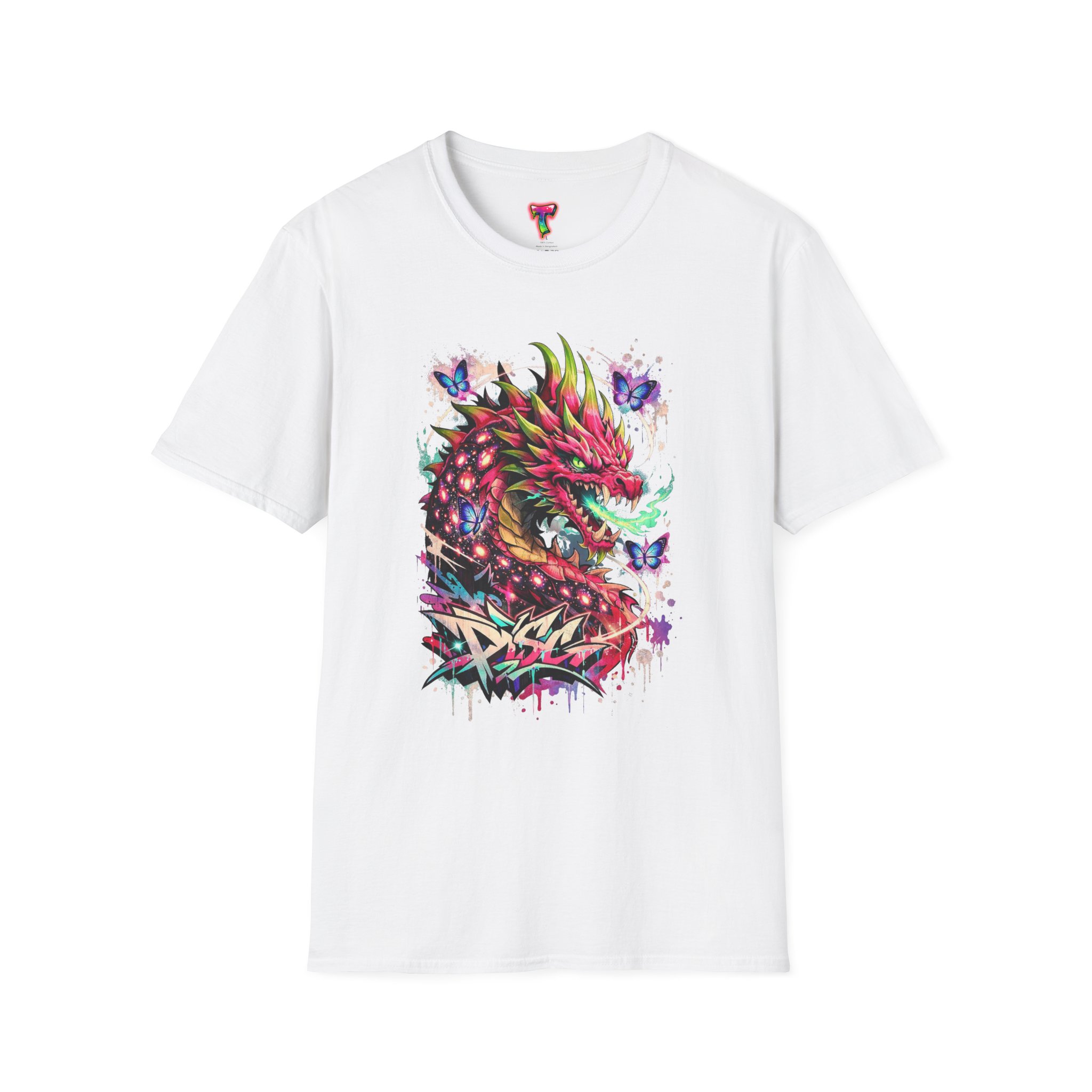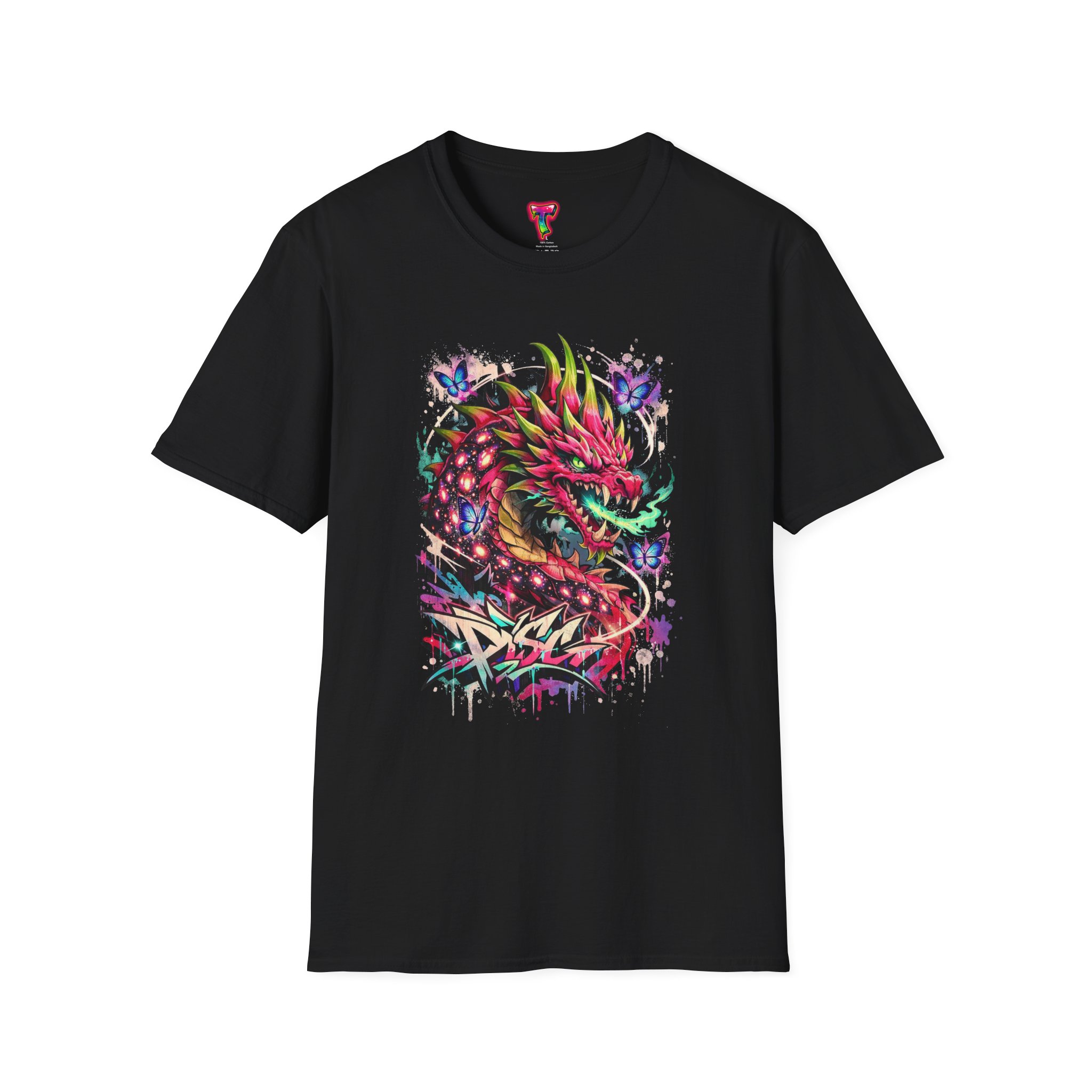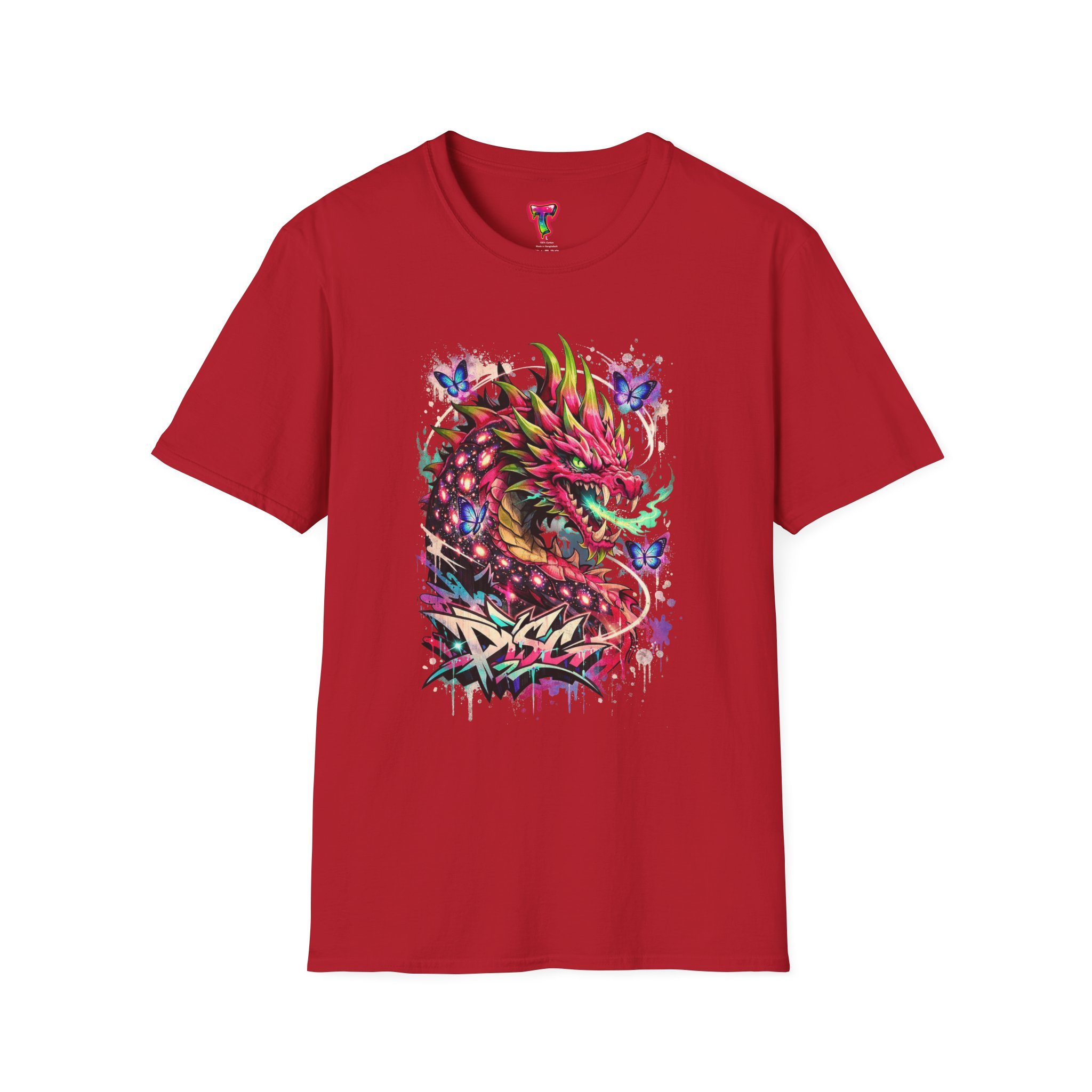 This lightweight cotton tee features a vivid, graffiti-style dragon design that feels alive with color and motion. The artwork blends street-art edge with mythical energy — jagged strokes, splashes of neon, and delicate butterflies that soften the intensity. Wear it when you want your outfit to tell a story: loud where you need it, detailed where people look closer. The crew neck and classic fit sit comfortably under a jacket or on their own, while the tear-away label and soft ring-spun cotton keep the focus on the print and your day, not the tag. Ethically sourced cotton and durable printing methods mean this shirt keeps its look wash after wash.