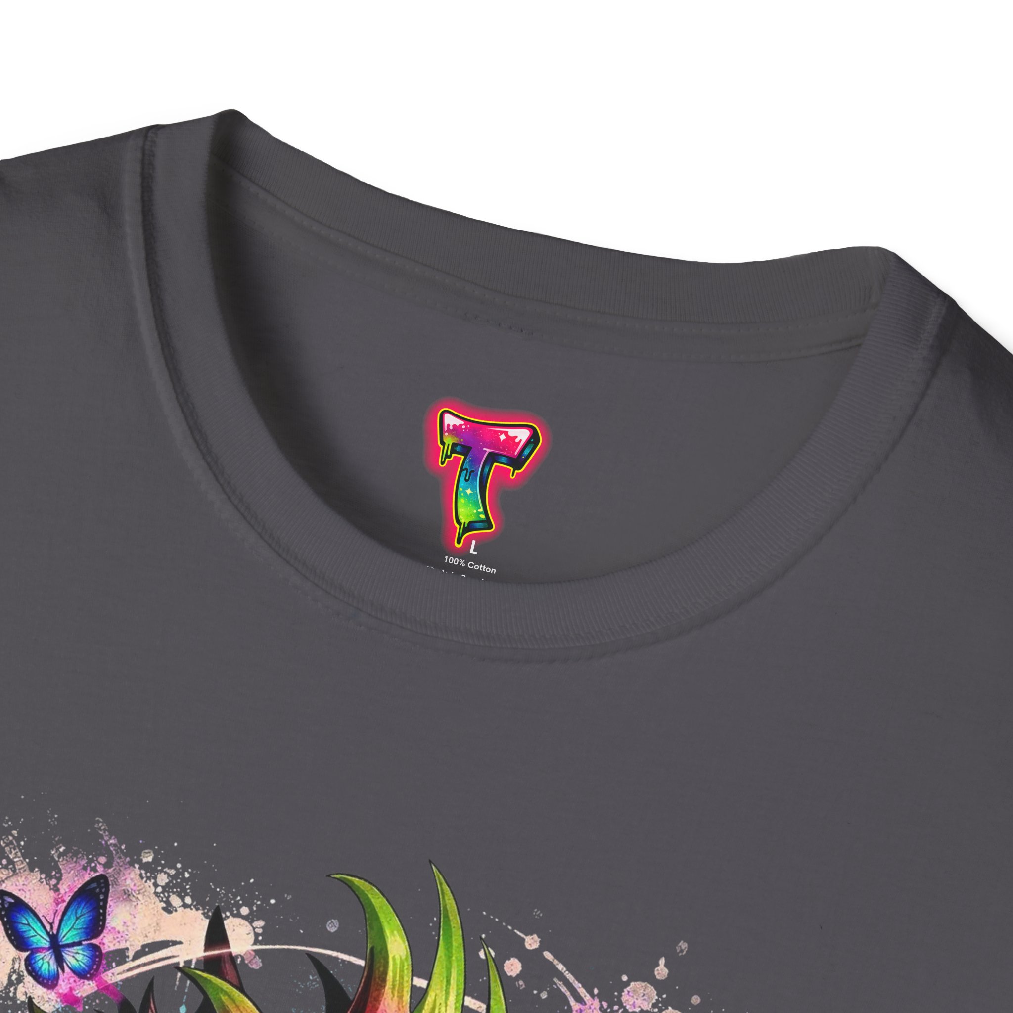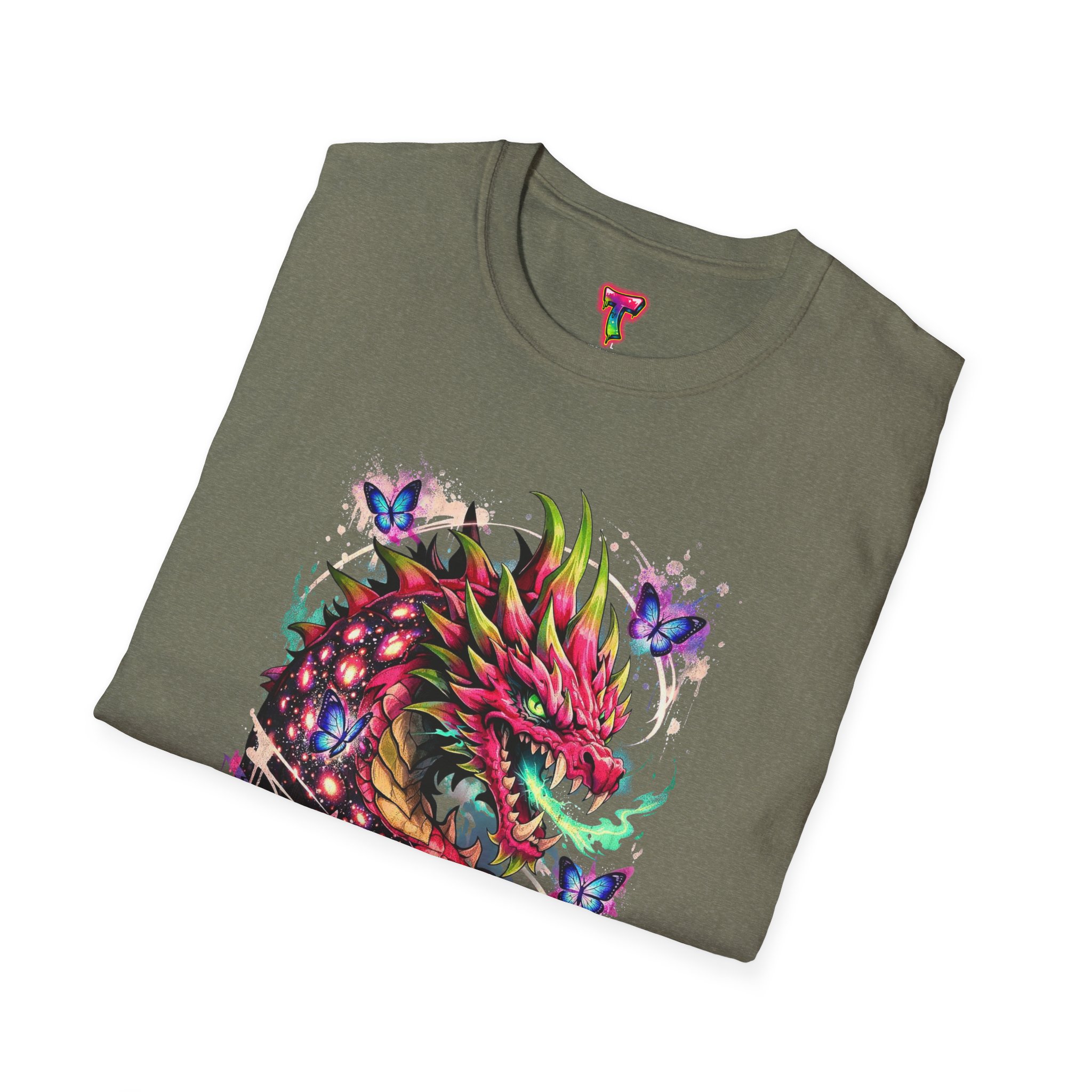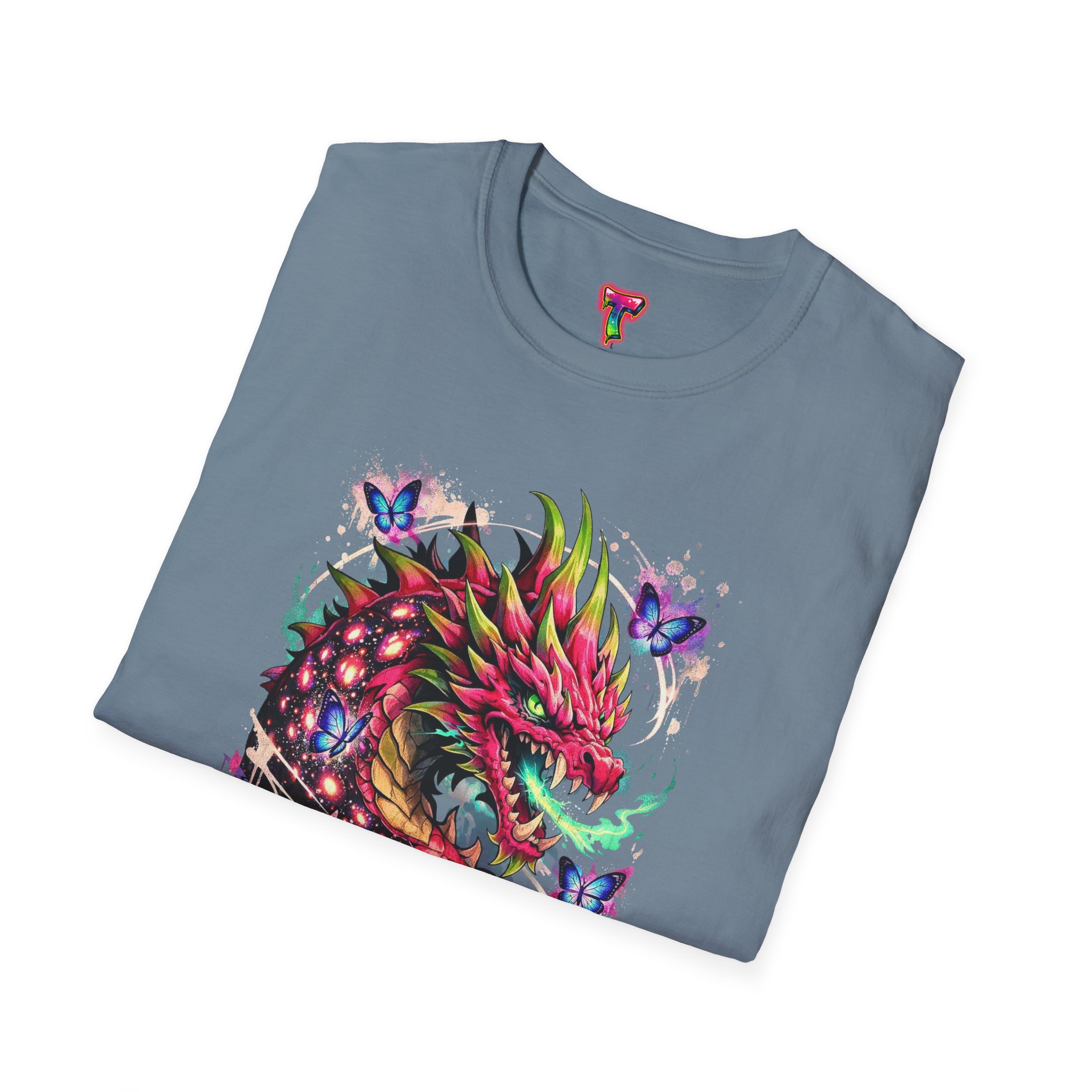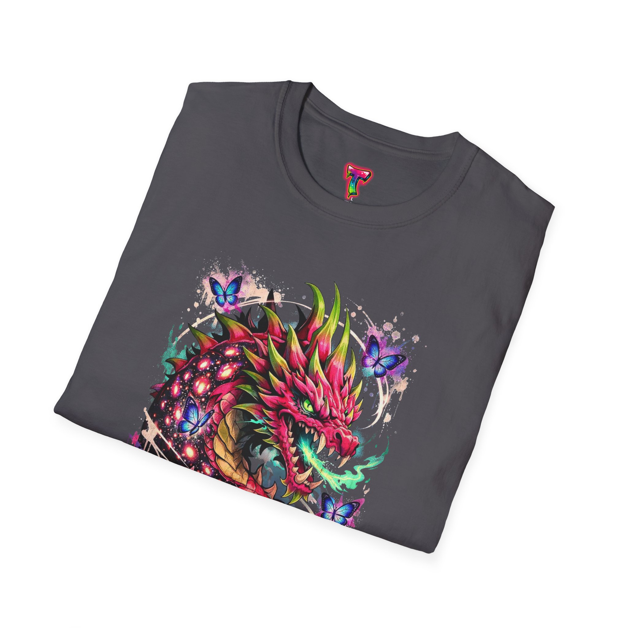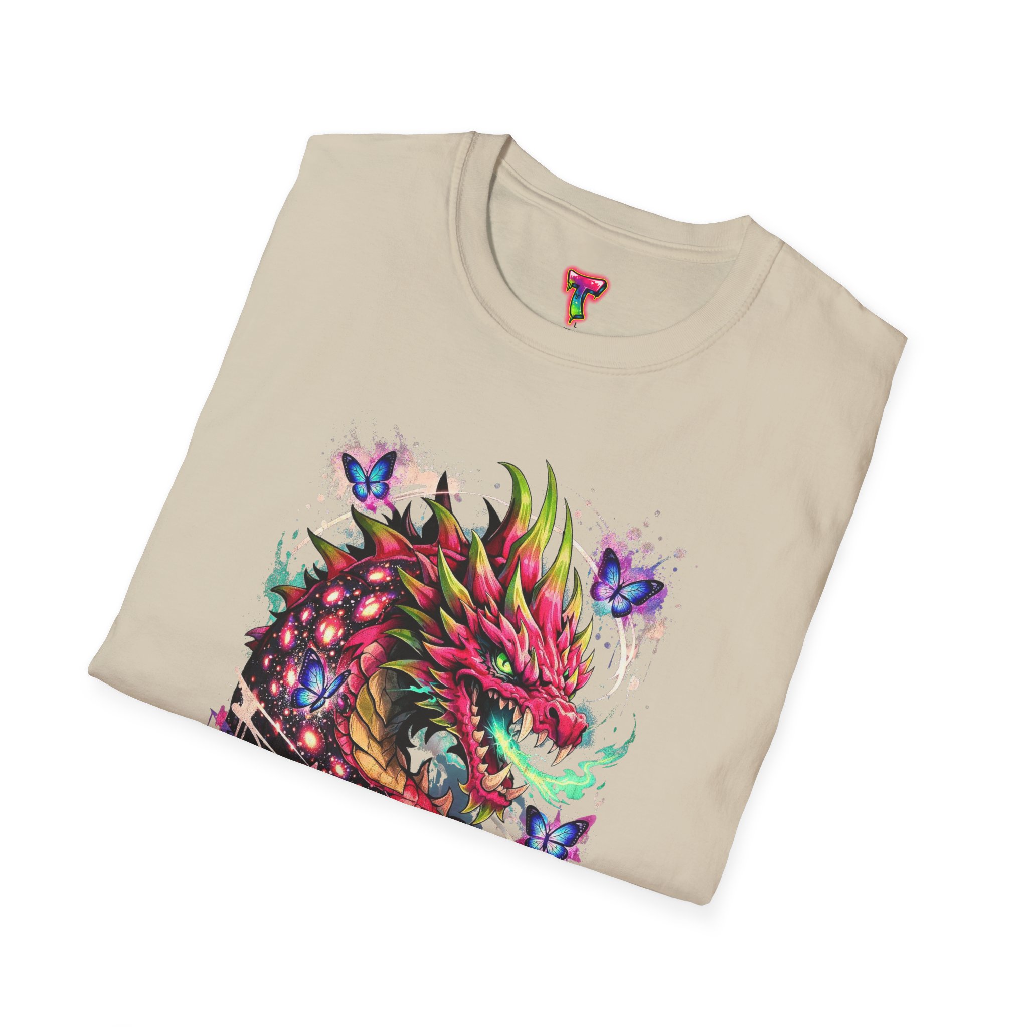 This lightweight cotton tee features a vivid, graffiti-style dragon design that feels alive with color and motion. The artwork blends street-art edge with mythical energy — jagged strokes, splashes of neon, and delicate butterflies that soften the intensity. Wear it when you want your outfit to tell a story: loud where you need it, detailed where people look closer. The crew neck and classic fit sit comfortably under a jacket or on their own, while the tear-away label and soft ring-spun cotton keep the focus on the print and your day, not the tag. Ethically sourced cotton and durable printing methods mean this shirt keeps its look wash after wash.