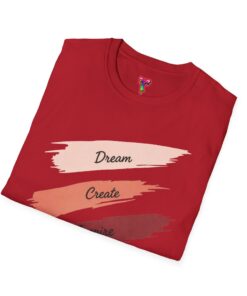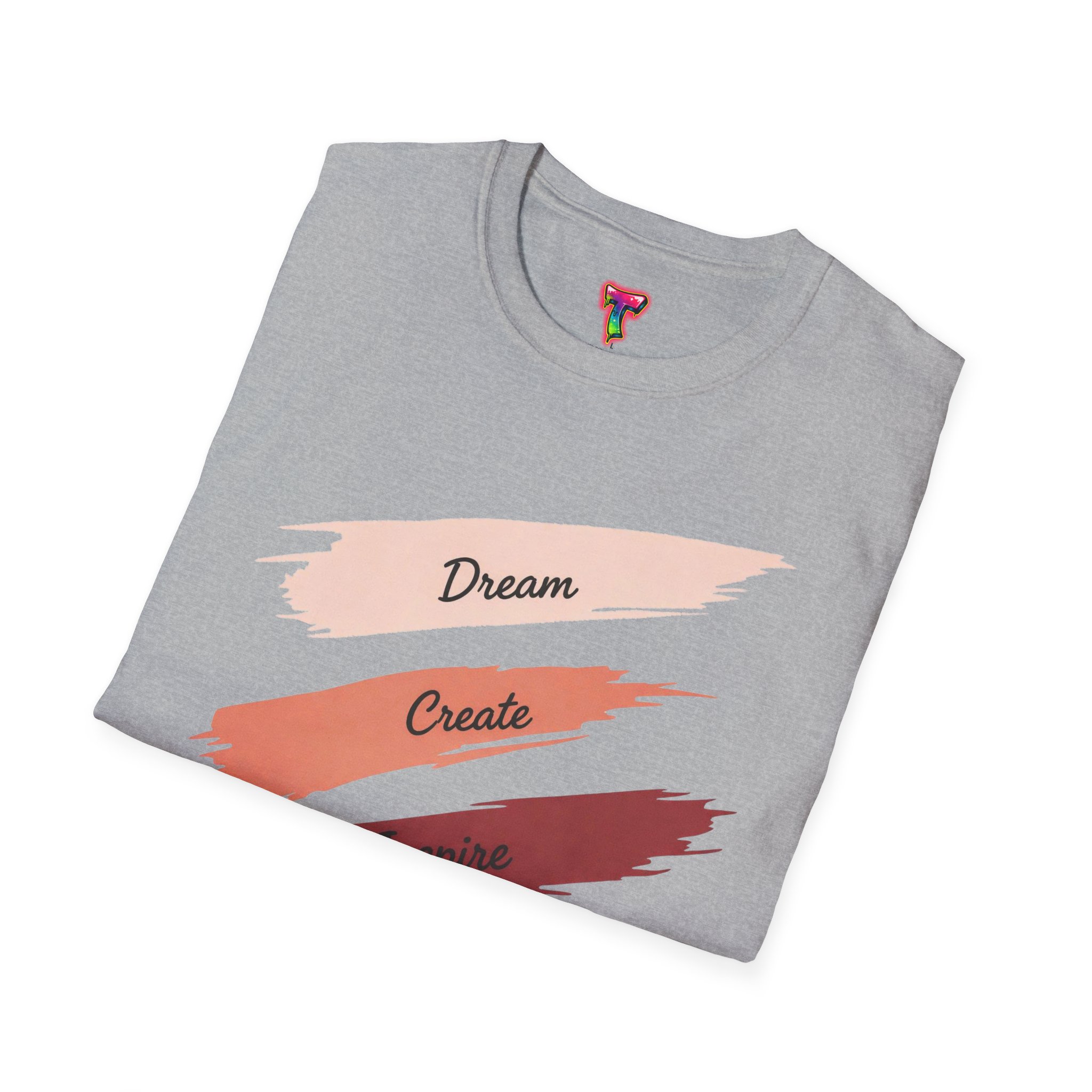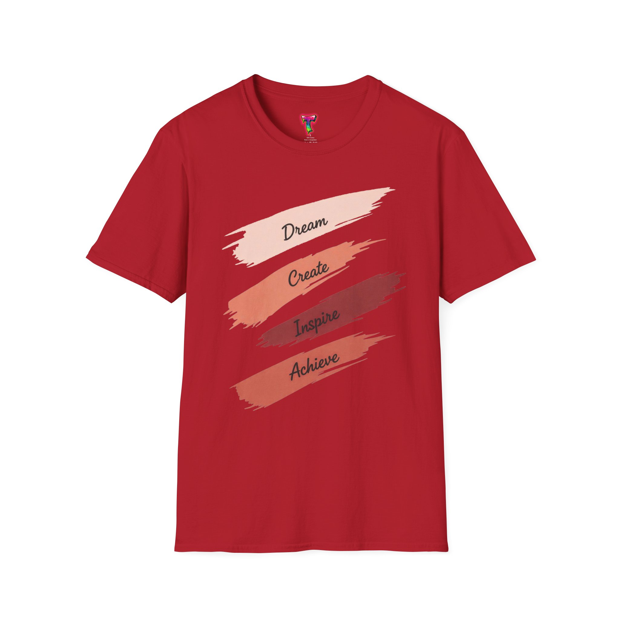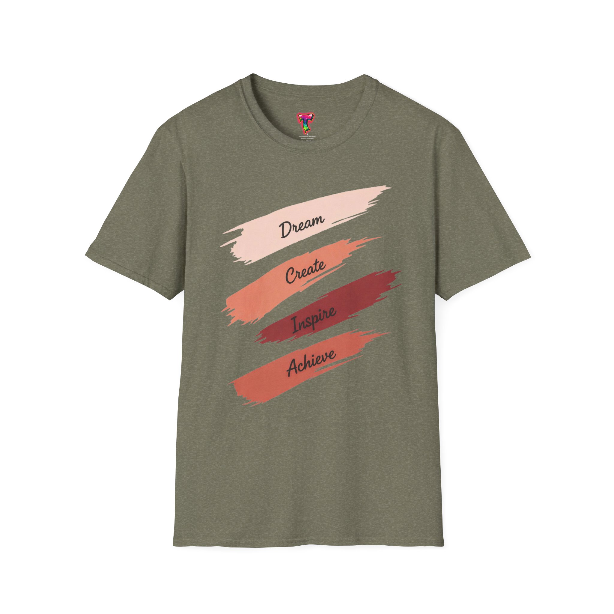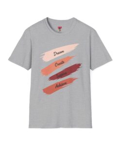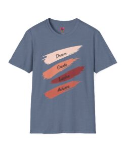 A lightweight, everyday tee with a calm, creative spirit. Soft, ring-spun cotton drapes gently while four painterly brushstrokes — Dream, Create, Inspire, Achieve — sit across the chest in warm, blended tones. Wear it on studio days, while sketching at a café, or layered under a jacket for a casual meeting. The fabric feels smooth against the skin and keeps its shape thanks to a ribbed, resilient neckline and shoulder tape that prevents stretching. Subtle details like a tear-away inner label and clean tubular knit give this shirt a polished, comfortable finish that won’t distract from your day or your work.