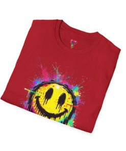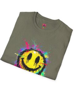 A lightweight cotton tee that wears like a favorite from day one. The front shows a bold, dripping smiley rendered in neon splashes — like street art caught mid-spray. It feels breathable and soft against the skin, with a classic crew neck and clean, tubular cut so the graphic sits flat and true. Wear it to add color to a simple outfit, bring attitude to a skate session, or layer under a jacket for nights out. The vibe is playful and a little gritty — expressive without trying too hard.