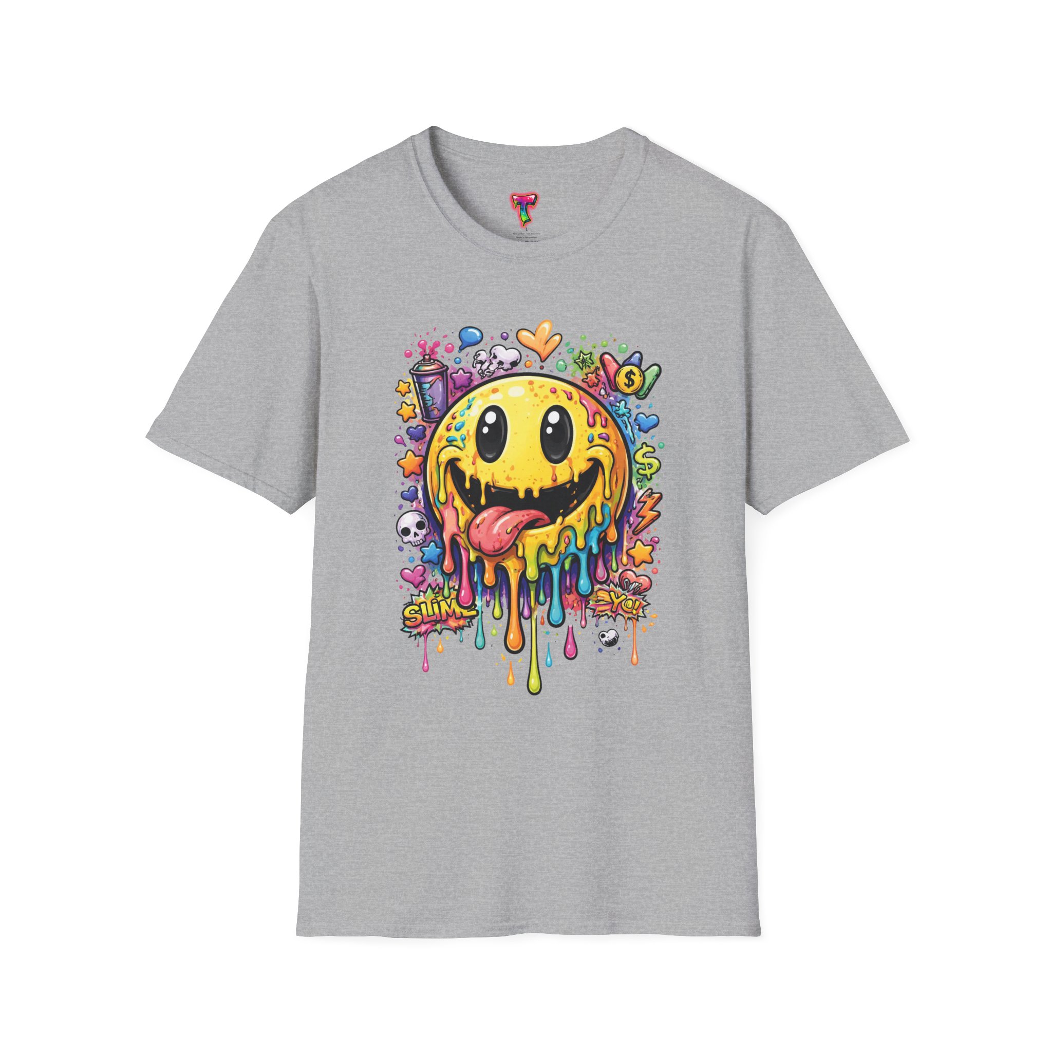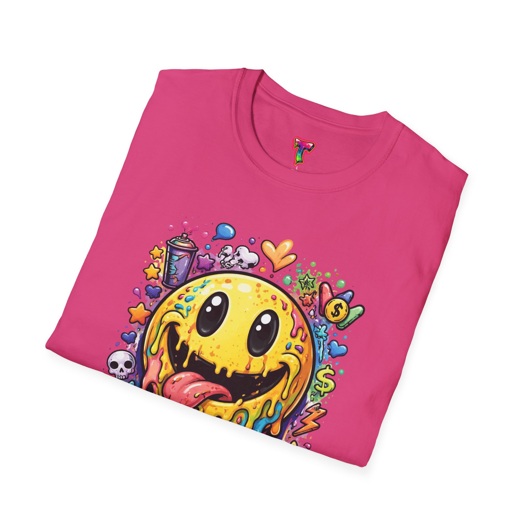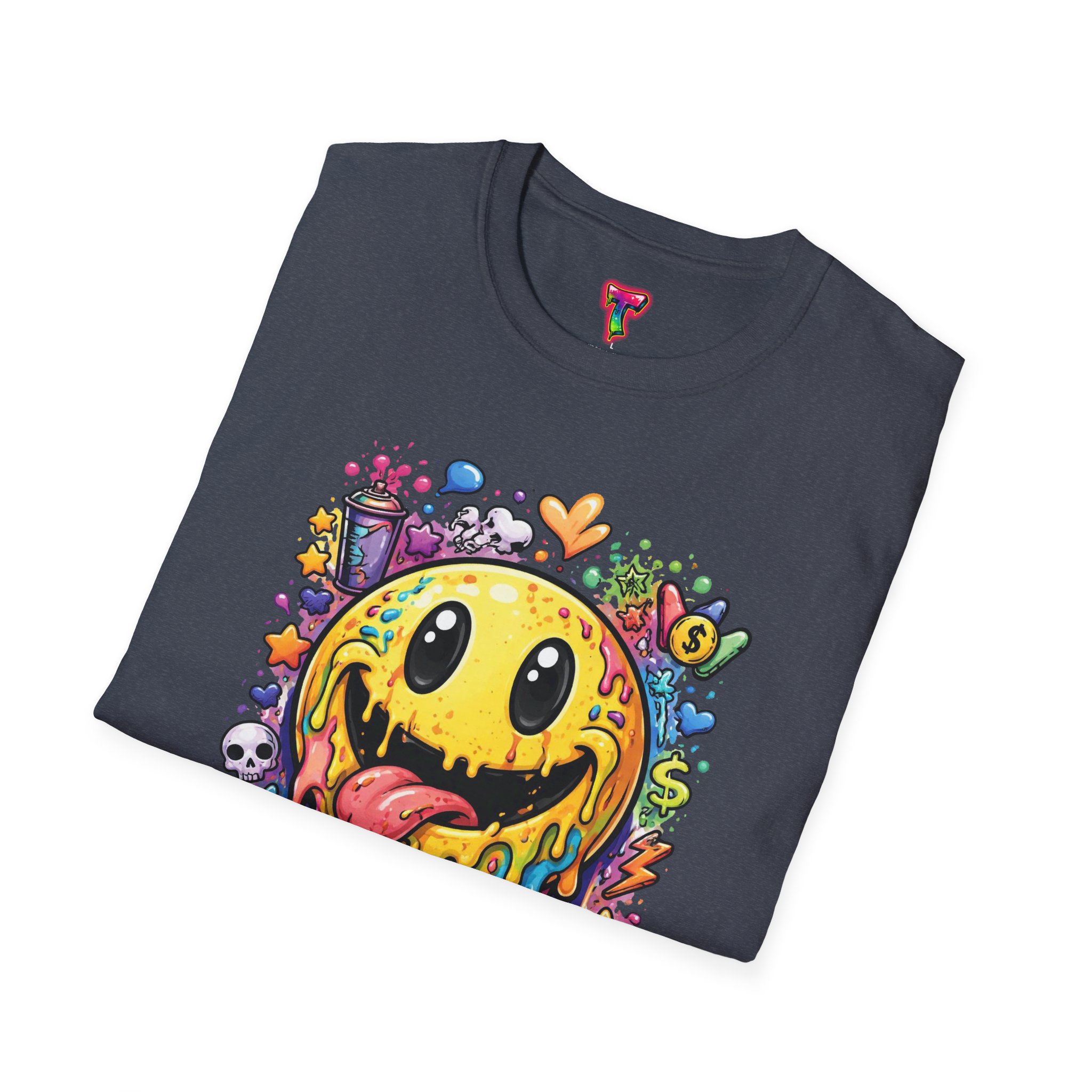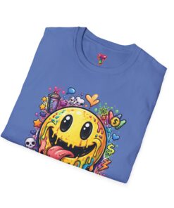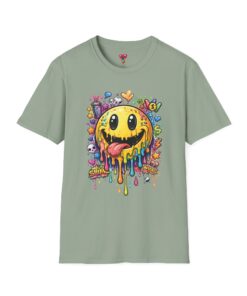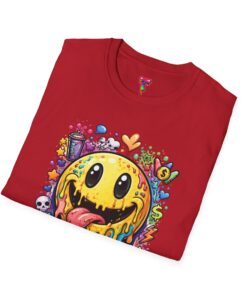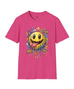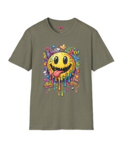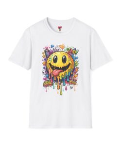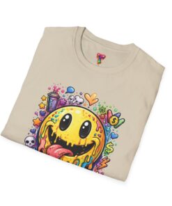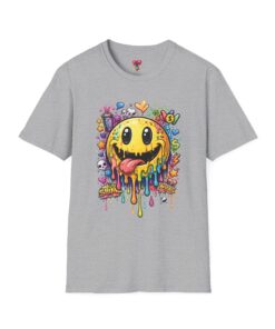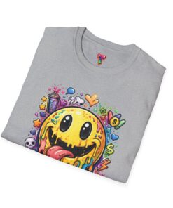 This lightweight cotton tee carries a bold, hand-illustrated graphic that feels equal parts playful and chaotic — a melting smiley face dripping neon colors, splattered with tiny hearts, skulls, and doodle elements. It sits on a classic crew silhouette that layers easily under a jacket or stands out on its own. Wear it to concerts, street festivals, or while sketching with friends; it’s made to move with you and keep drawing second glances. The soft, ring-spun cotton and tear-away label keep the focus on comfort so the artwork can do the talking. Ethically sourced materials and careful construction give it a lived-in, dependable feel that lasts through repeat wears and washes.