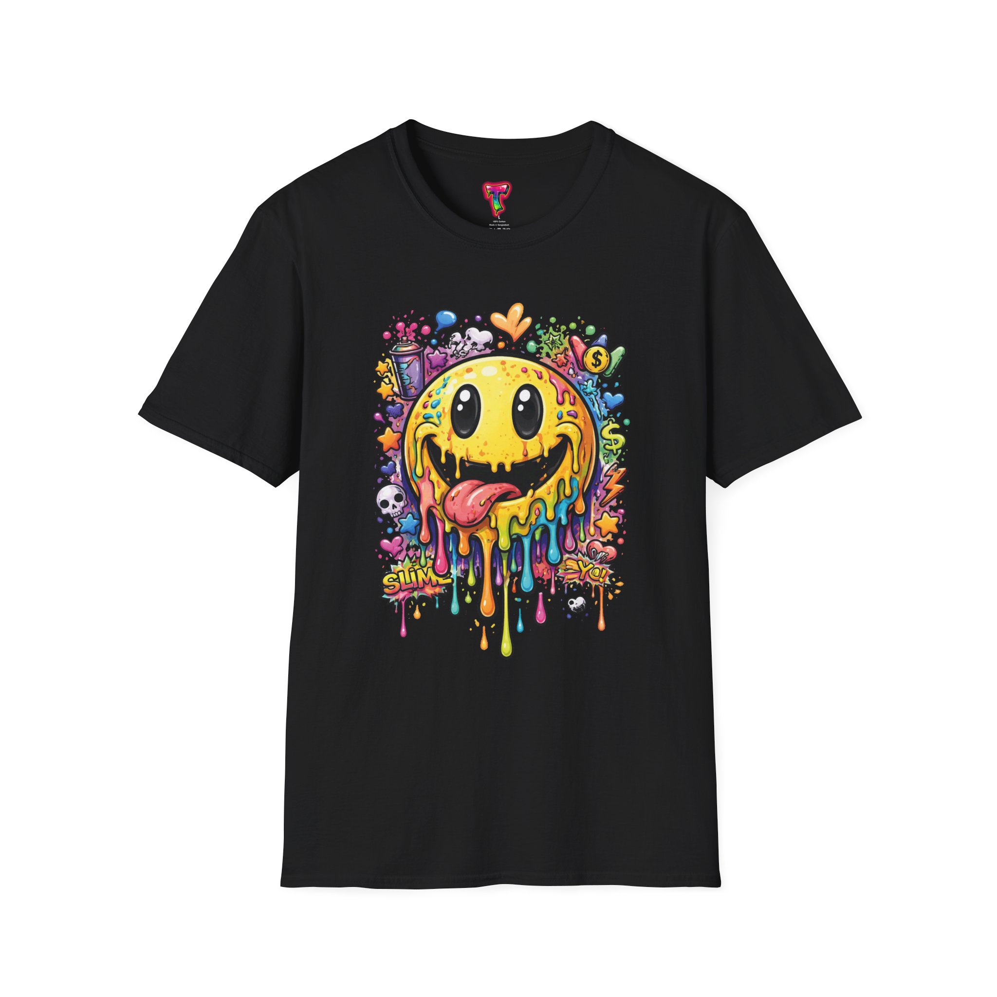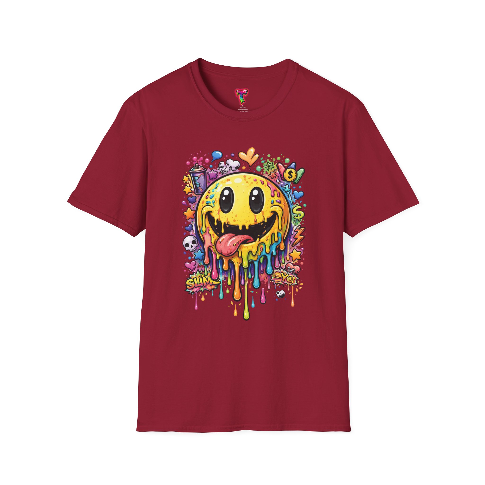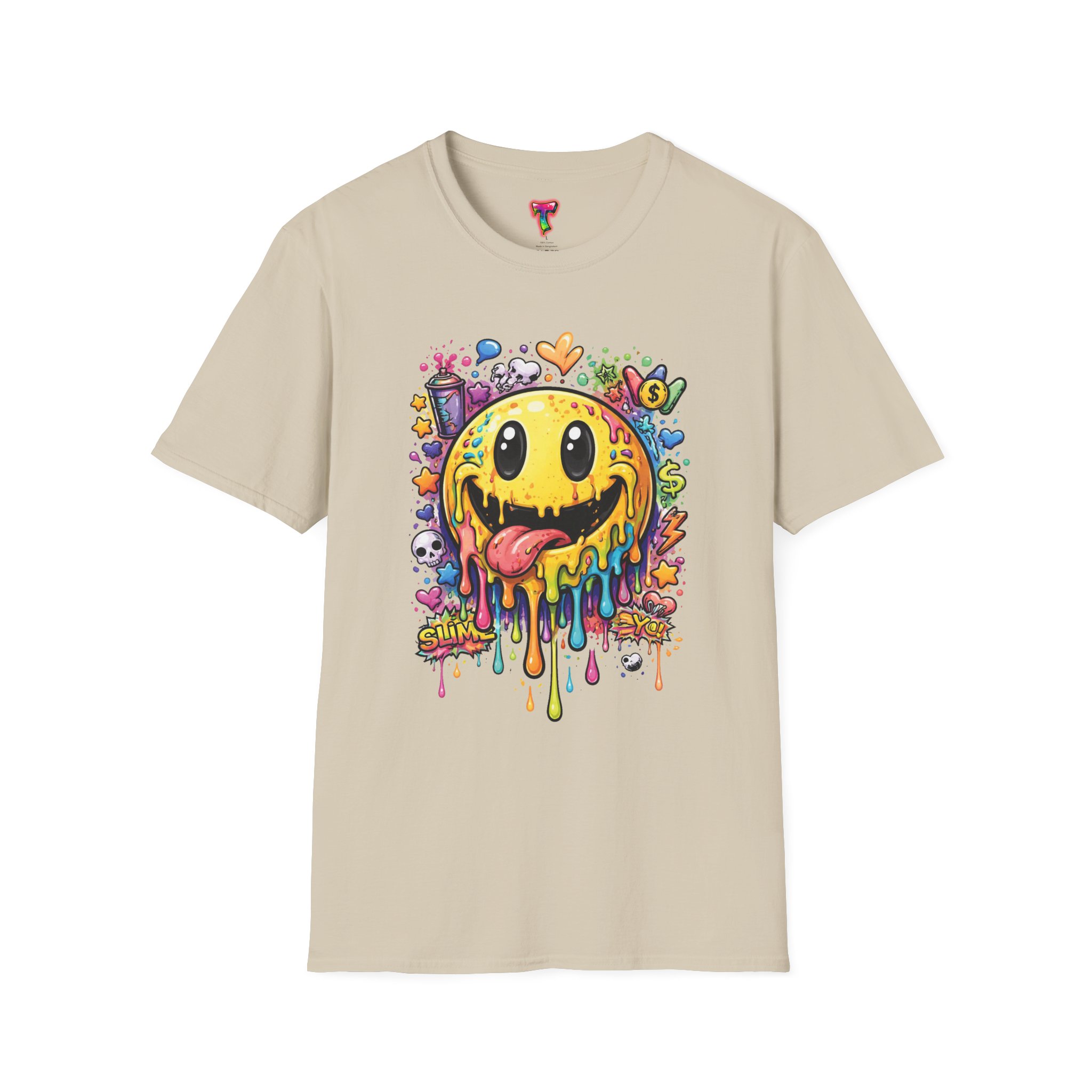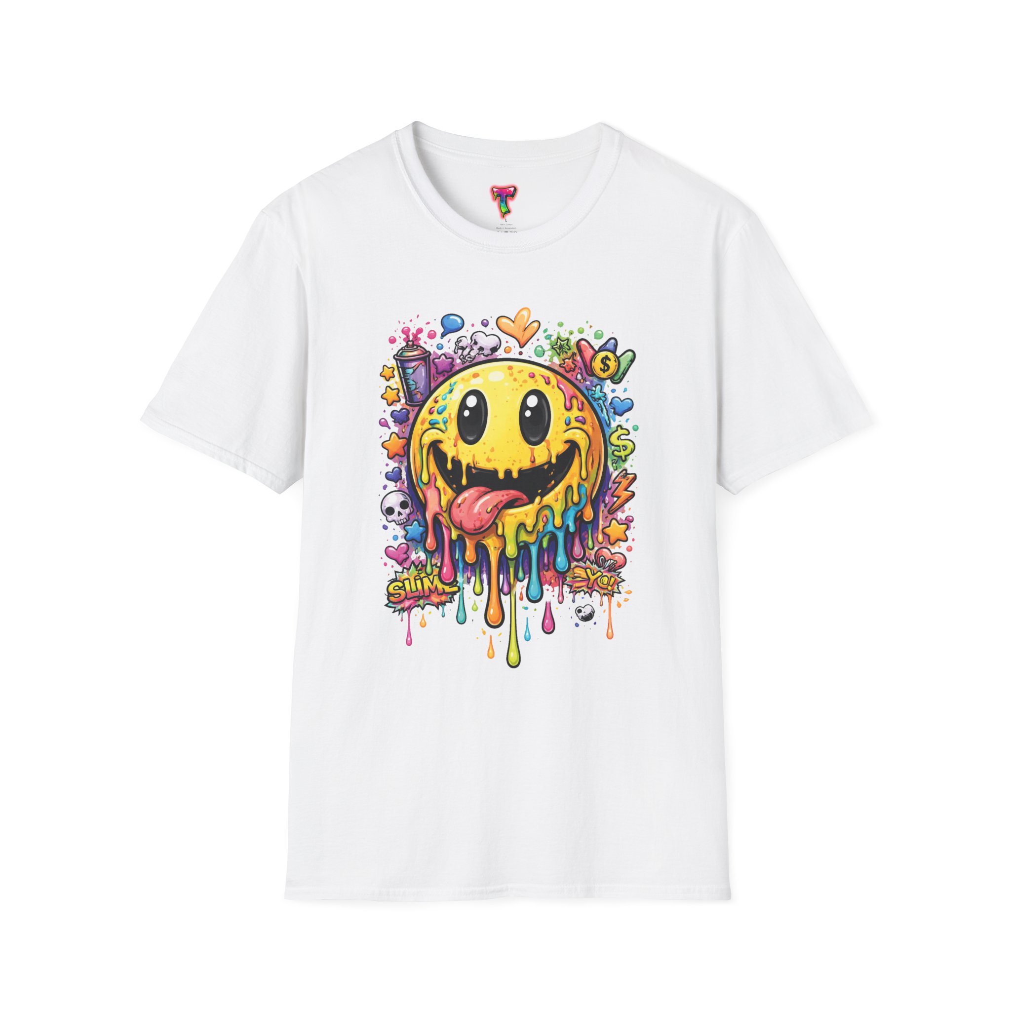 This lightweight cotton tee carries a bold, hand-illustrated graphic that feels equal parts playful and chaotic — a melting smiley face dripping neon colors, splattered with tiny hearts, skulls, and doodle elements. It sits on a classic crew silhouette that layers easily under a jacket or stands out on its own. Wear it to concerts, street festivals, or while sketching with friends; it’s made to move with you and keep drawing second glances. The soft, ring-spun cotton and tear-away label keep the focus on comfort so the artwork can do the talking. Ethically sourced materials and careful construction give it a lived-in, dependable feel that lasts through repeat wears and washes.