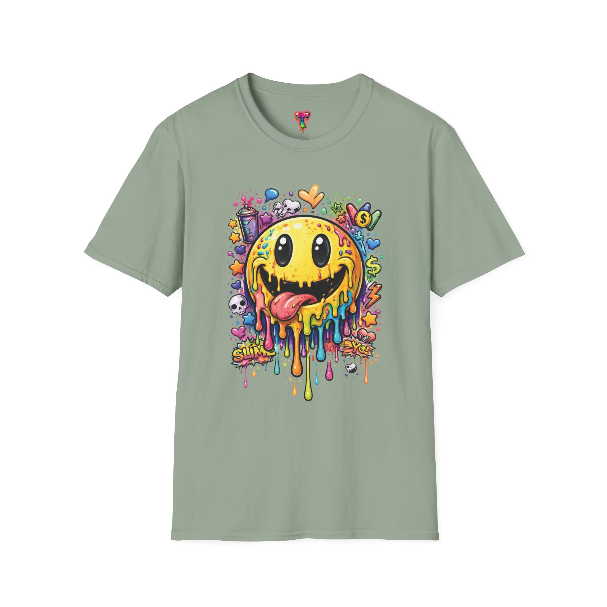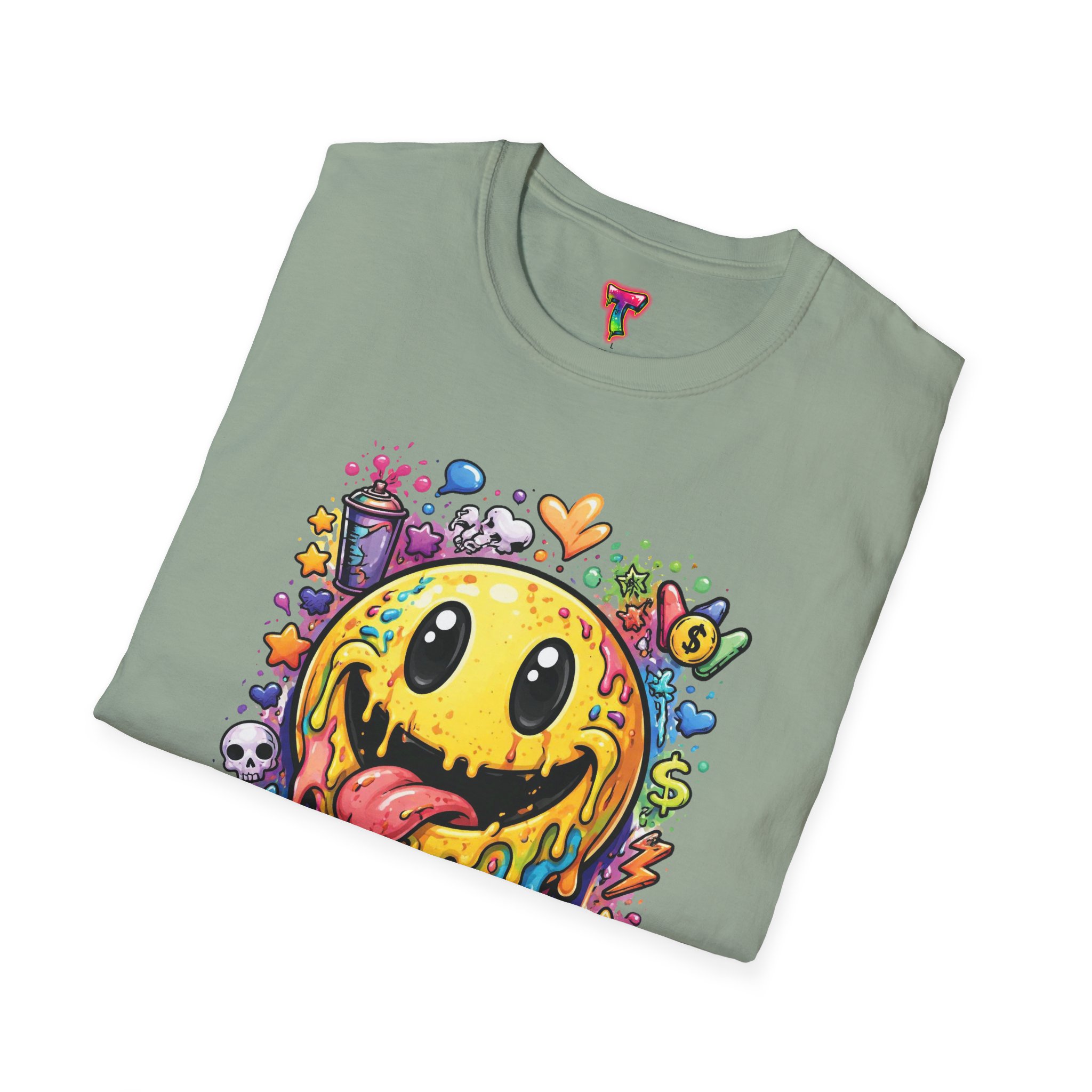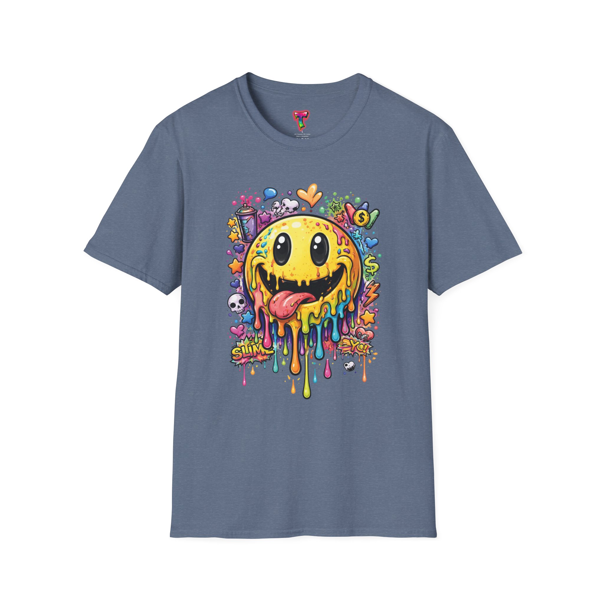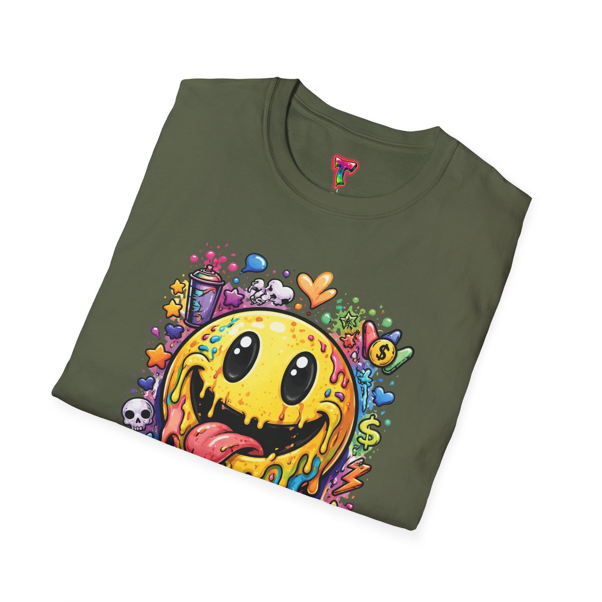 This lightweight cotton tee carries a bold, hand-illustrated graphic that feels equal parts playful and chaotic — a melting smiley face dripping neon colors, splattered with tiny hearts, skulls, and doodle elements. It sits on a classic crew silhouette that layers easily under a jacket or stands out on its own. Wear it to concerts, street festivals, or while sketching with friends; it’s made to move with you and keep drawing second glances. The soft, ring-spun cotton and tear-away label keep the focus on comfort so the artwork can do the talking. Ethically sourced materials and careful construction give it a lived-in, dependable feel that lasts through repeat wears and washes.
