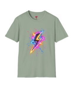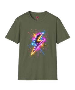 Bright, electric energy meets soft everyday wear. This lightweight cotton tee carries a bold, hand-painted lightning bolt at its center—vivid neon edges and watercolor splatters that look like a burst of color caught in motion. It sits true to the classic crew silhouette and feels breathable against the skin, so you reach for it whether you’re layering under a jacket or wearing it solo on warm days. The print pops on natural and white fabrics, while the tear-away label and stable ribbed collar keep comfort front and center. Wear it when you want an outfit that reads loud and playful without sacrificing comfort.