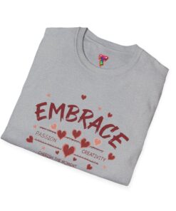 Soft, simple, and quietly uplifting—this tee wears like a friendly reminder. Light, breathable ring-spun cotton drapes easily over the shoulders while the warm, muted print reads “EMBRACE” surrounded by tiny hearts and hand-drawn accents. It’s the kind of shirt you reach for on slow mornings, creative afternoons, or when you want to carry a gentle message without shouting. The smooth fabric and clean crew neckline keep the look versatile; pair with jeans, a cozy cardigan, or layer under a jacket to keep that calm, encouraging energy close.
