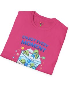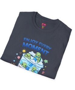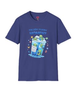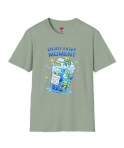 Soft, light, and endlessly cheerful — this cotton tee wears like a hug and carries a tiny, whimsical world on the chest. A clear-blue cup full of smiling creatures and bubbles sits under the gentle reminder “Enjoy Every Moment,” turning an ordinary outfit into a small celebration. The fit is classic and relaxed, the collar holds its shape, and the tubular knit keeps the silhouette clean. Wear it on slow mornings with coffee, on playful city walks, or layered under a jacket when you need a quiet lift. The bright, calming artwork speaks to anyone who collects small joys and notices the little happy things in life.
