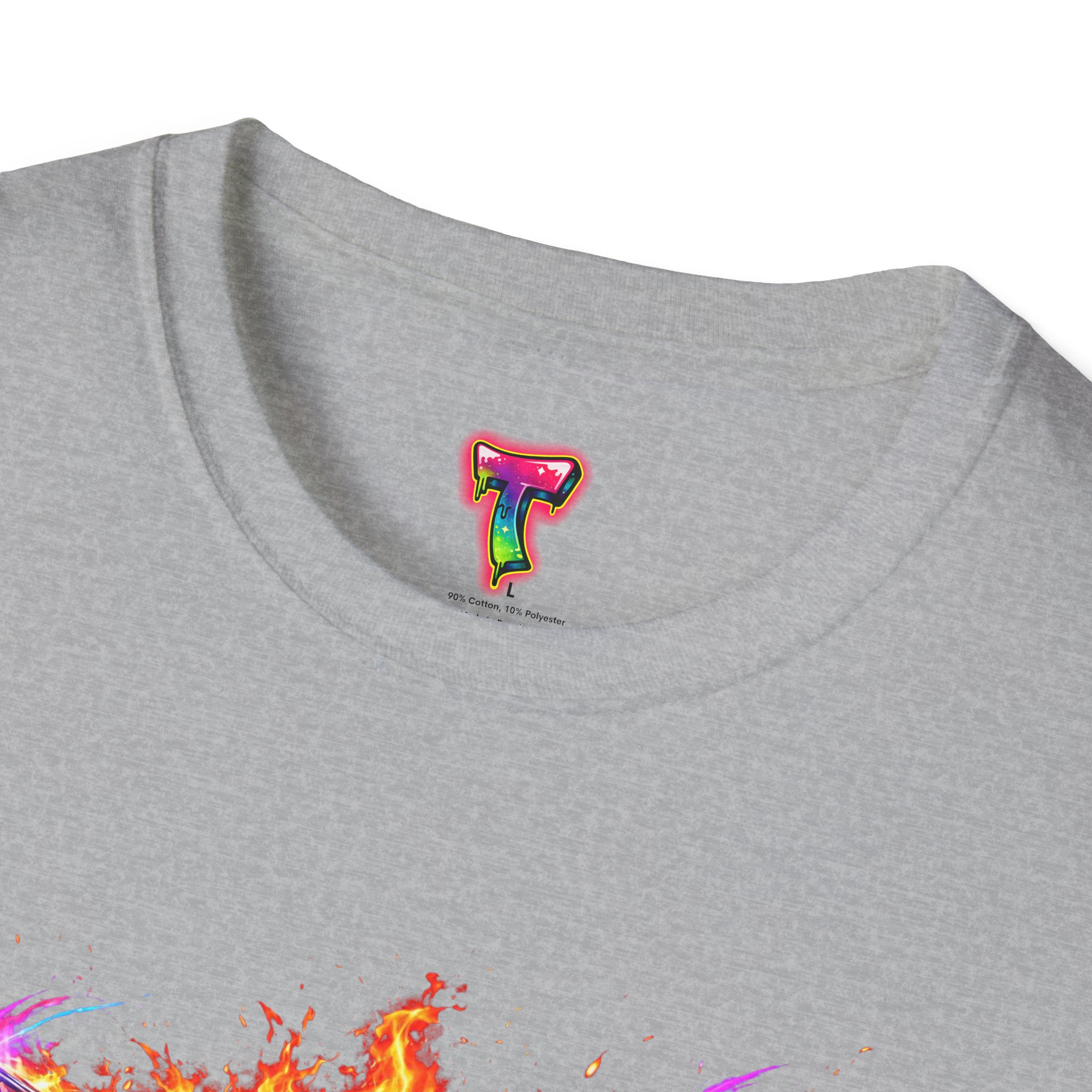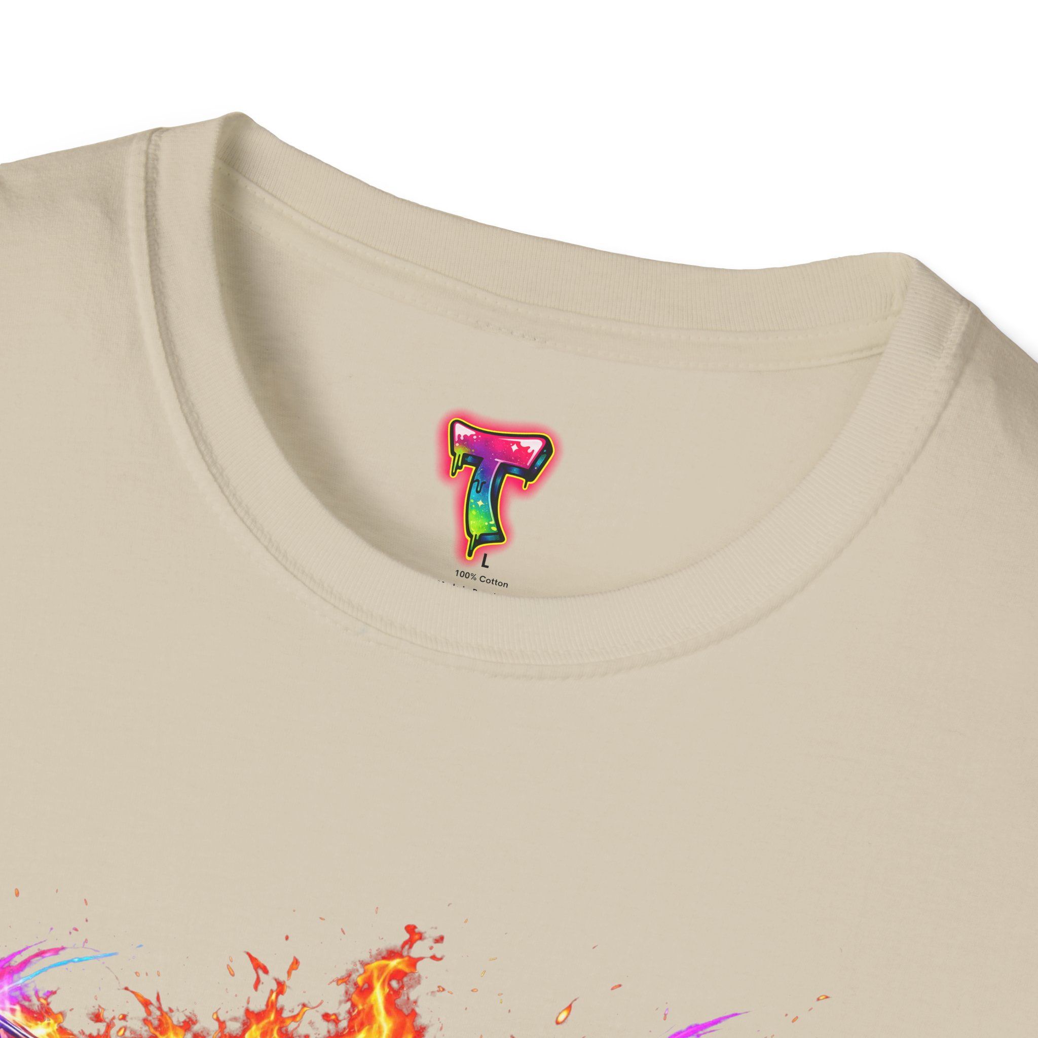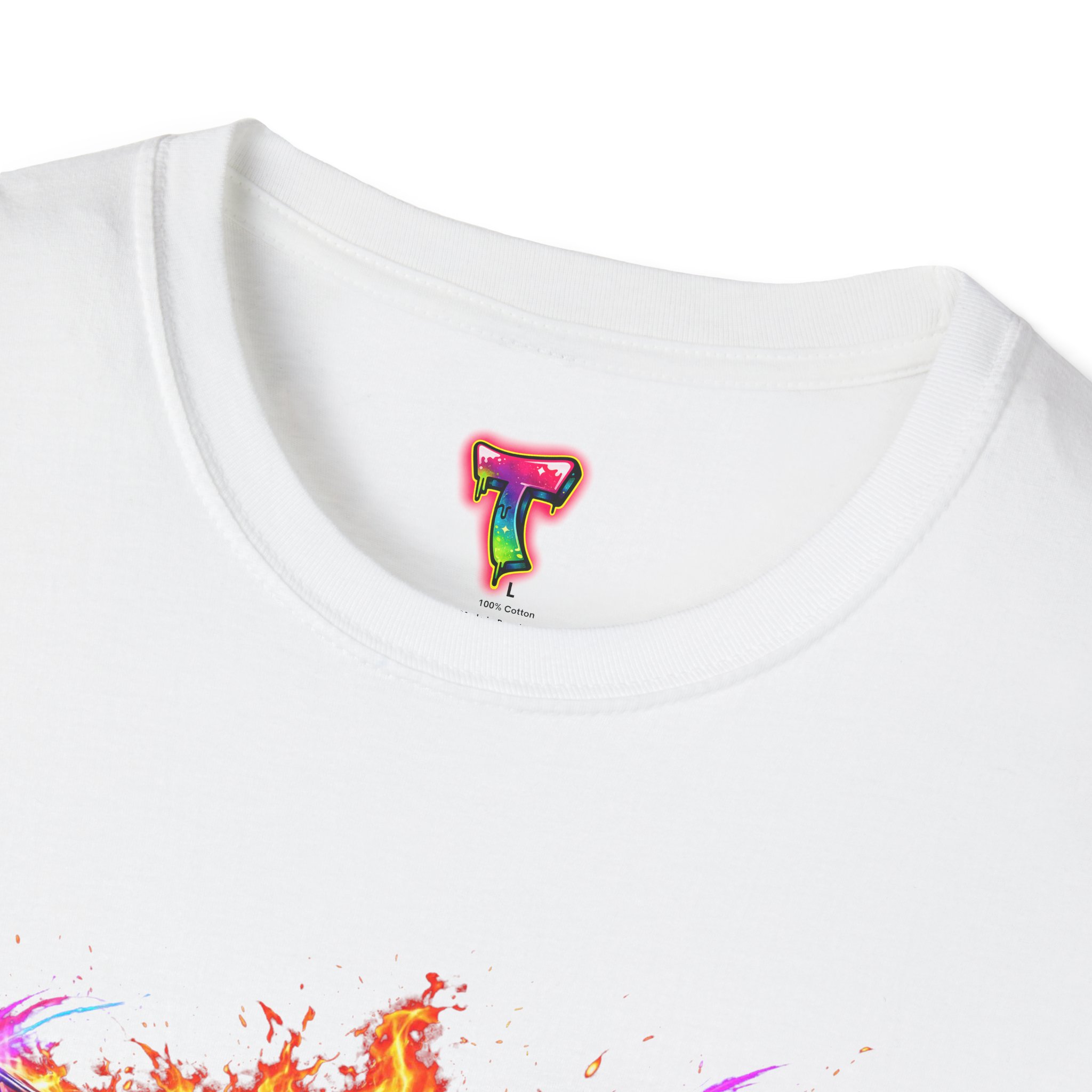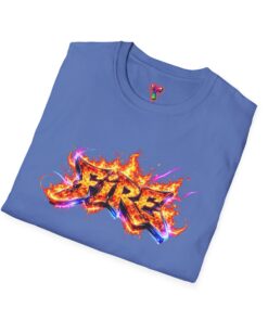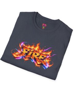 This lightweight tee carries a graphic that roars — vibrant flames form a bold graffiti-style wordmark across the chest, radiating heat and motion. It’s a clean white canvas with a punch of color: oranges, yellows and hints of electric blue blend into a street-art-inspired blaze that reads like movement captured mid-spark. Wear it on days when you want to stand out without shouting. The soft ring-spun cotton feels airy against the skin and the ribbed crew neck keeps the silhouette tidy. It slips easily into a layered look under a denim jacket or stands alone with worn-in jeans for a city-night vibe. Designed for everyday wear, it’s made with responsibly sourced cotton and finished with tear-away labels for no-scratch comfort — built to be seen and built to last.