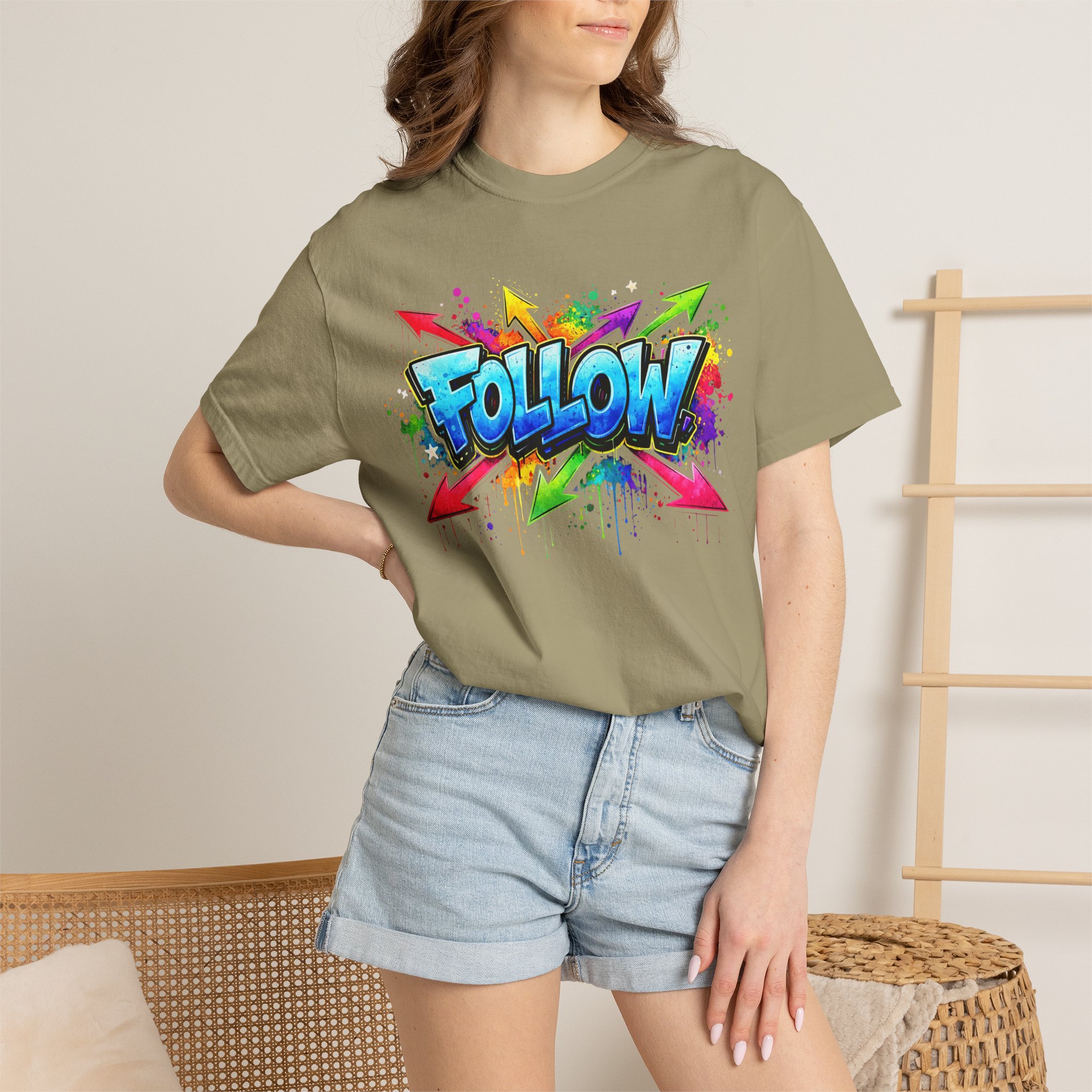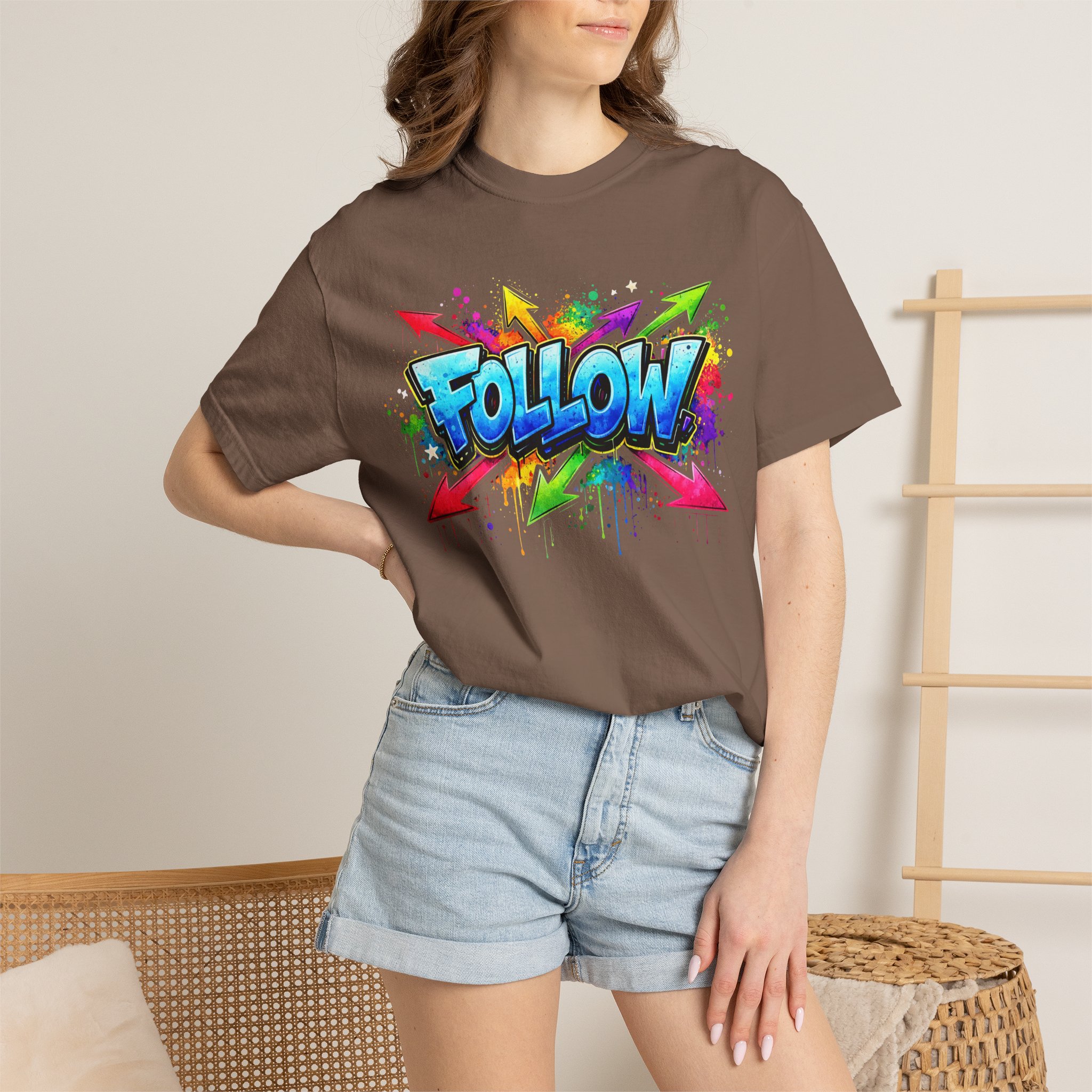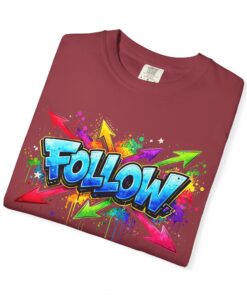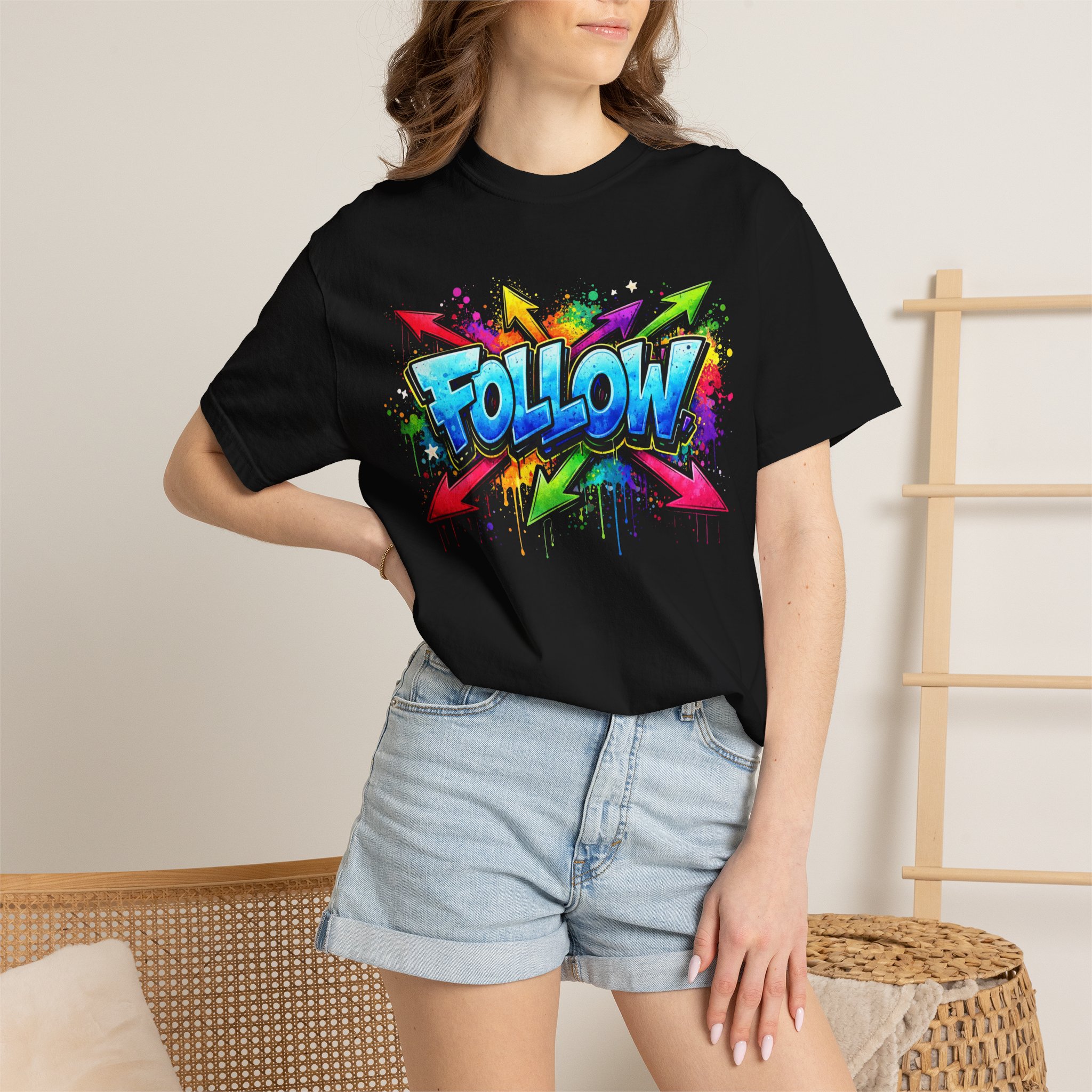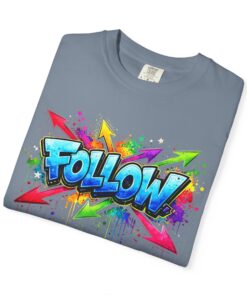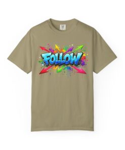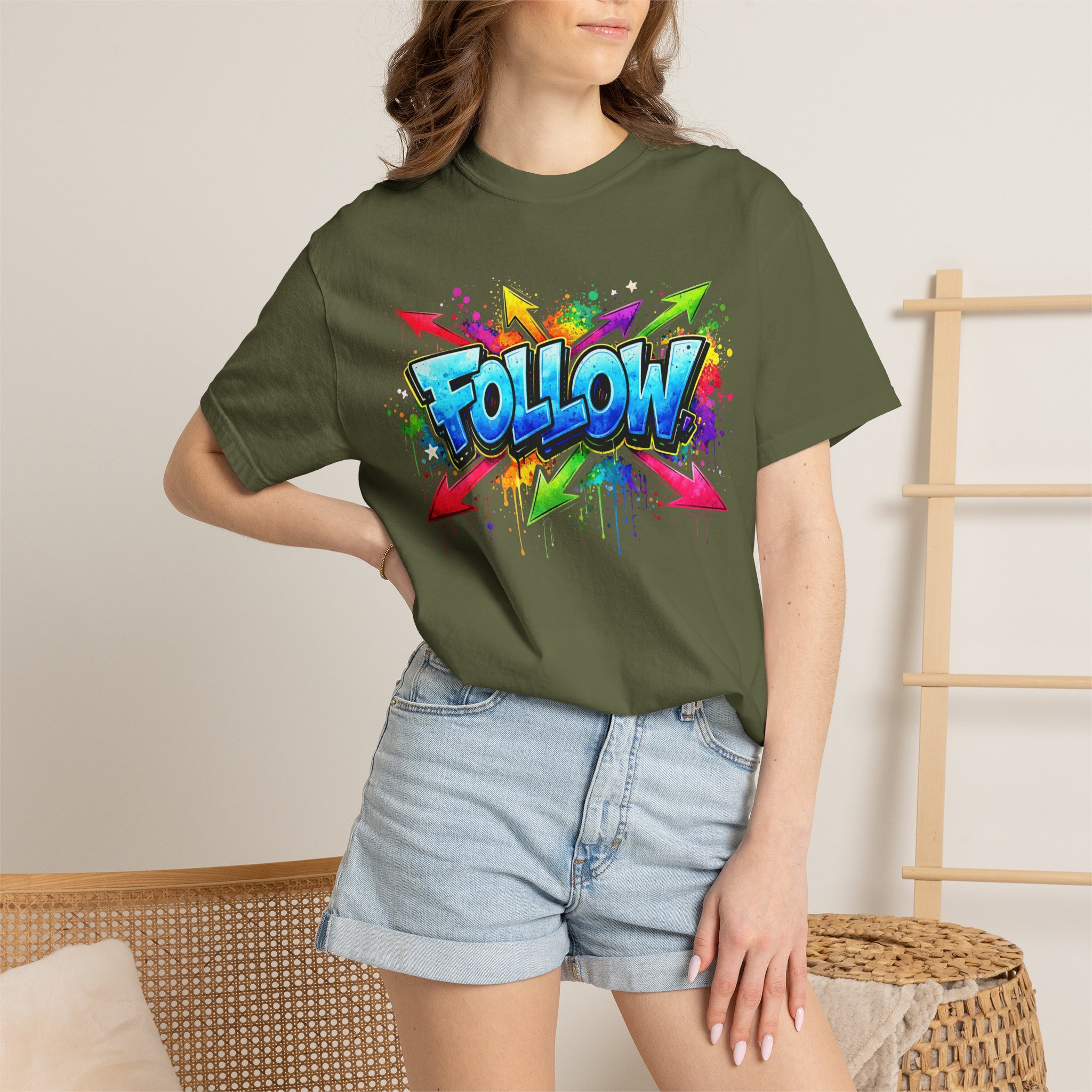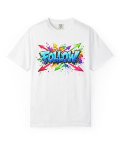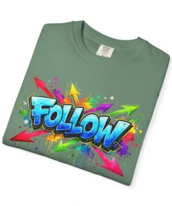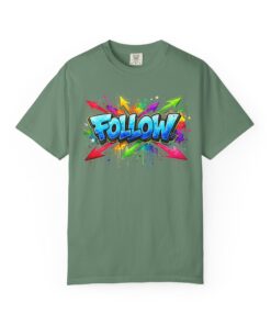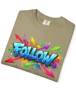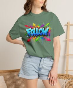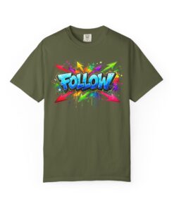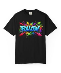 This relaxed, garment-dyed tee brings bold street-art energy into everyday wear. Soft, heavyweight ring-spun cotton feels lived-in from day one, while the vibrant graffiti-style “FOLLOW” graphic pops with multi-colored arrows and paint splatter. Wear it for skate sessions, casual meetups, or when you want to add color to a simple outfit. The roomy fit and sturdy double-needle stitching stand up to frequent wear, and the tubular construction keeps side seams out of the way for a clean silhouette. Available in many colors and sizes, it’s a confident, comfortable layer that reads like personal expression — loud, playful, and unapologetically graphic.