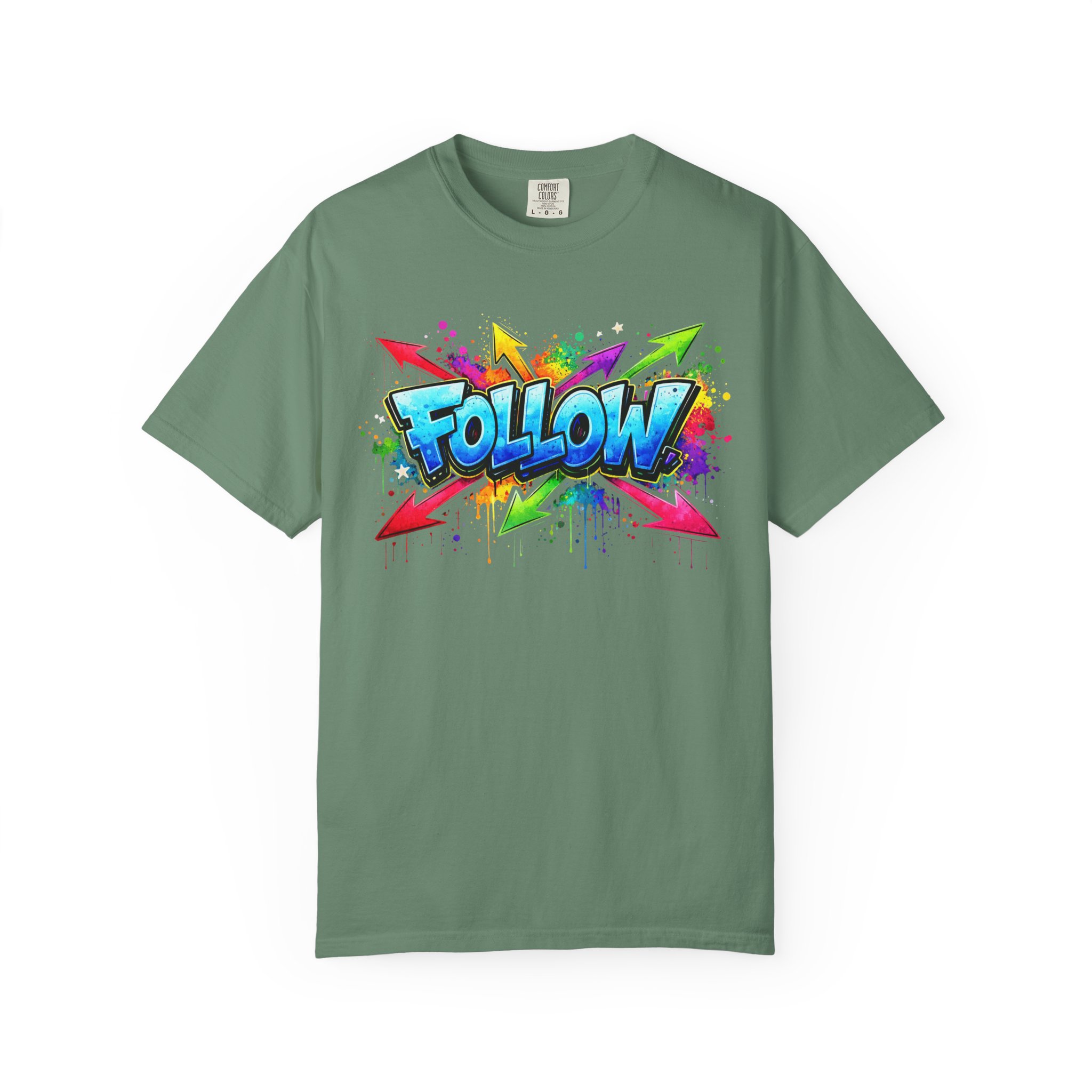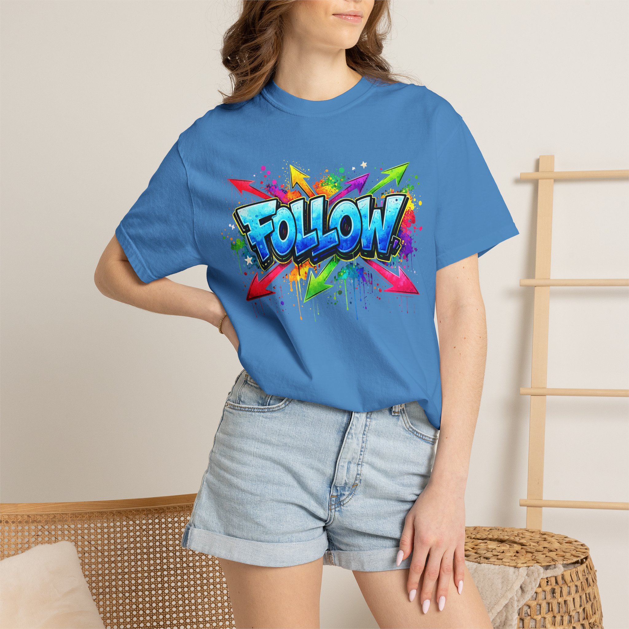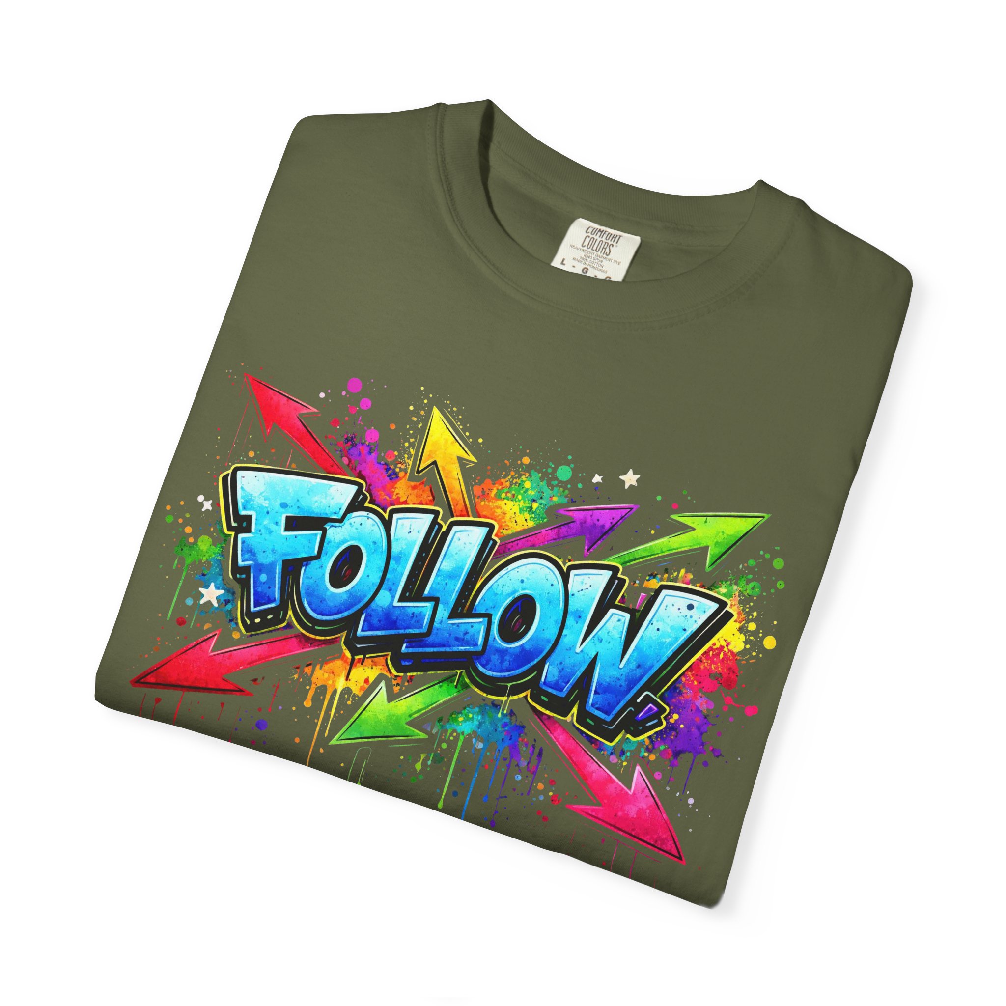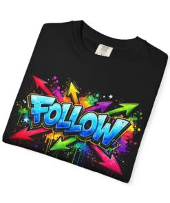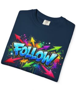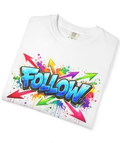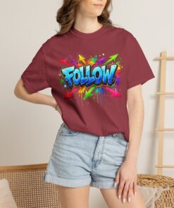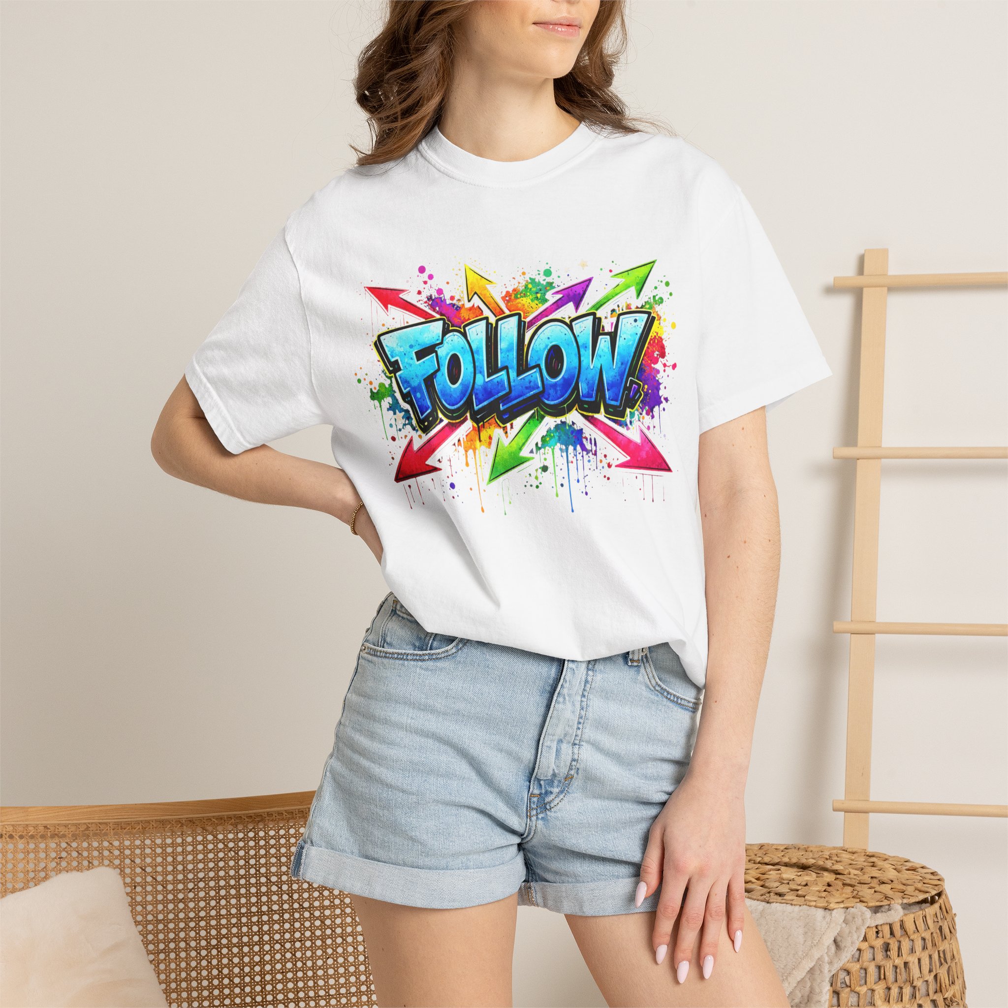This relaxed, garment-dyed tee brings bold street-art energy into everyday wear. Soft, heavyweight ring-spun cotton feels lived-in from day one, while the vibrant graffiti-style “FOLLOW” graphic pops with multi-colored arrows and paint splatter. Wear it for skate sessions, casual meetups, or when you want to add color to a simple outfit. The roomy fit and sturdy double-needle stitching stand up to frequent wear, and the tubular construction keeps side seams out of the way for a clean silhouette. Available in many colors and sizes, it’s a confident, comfortable layer that reads like personal expression — loud, playful, and unapologetically graphic.