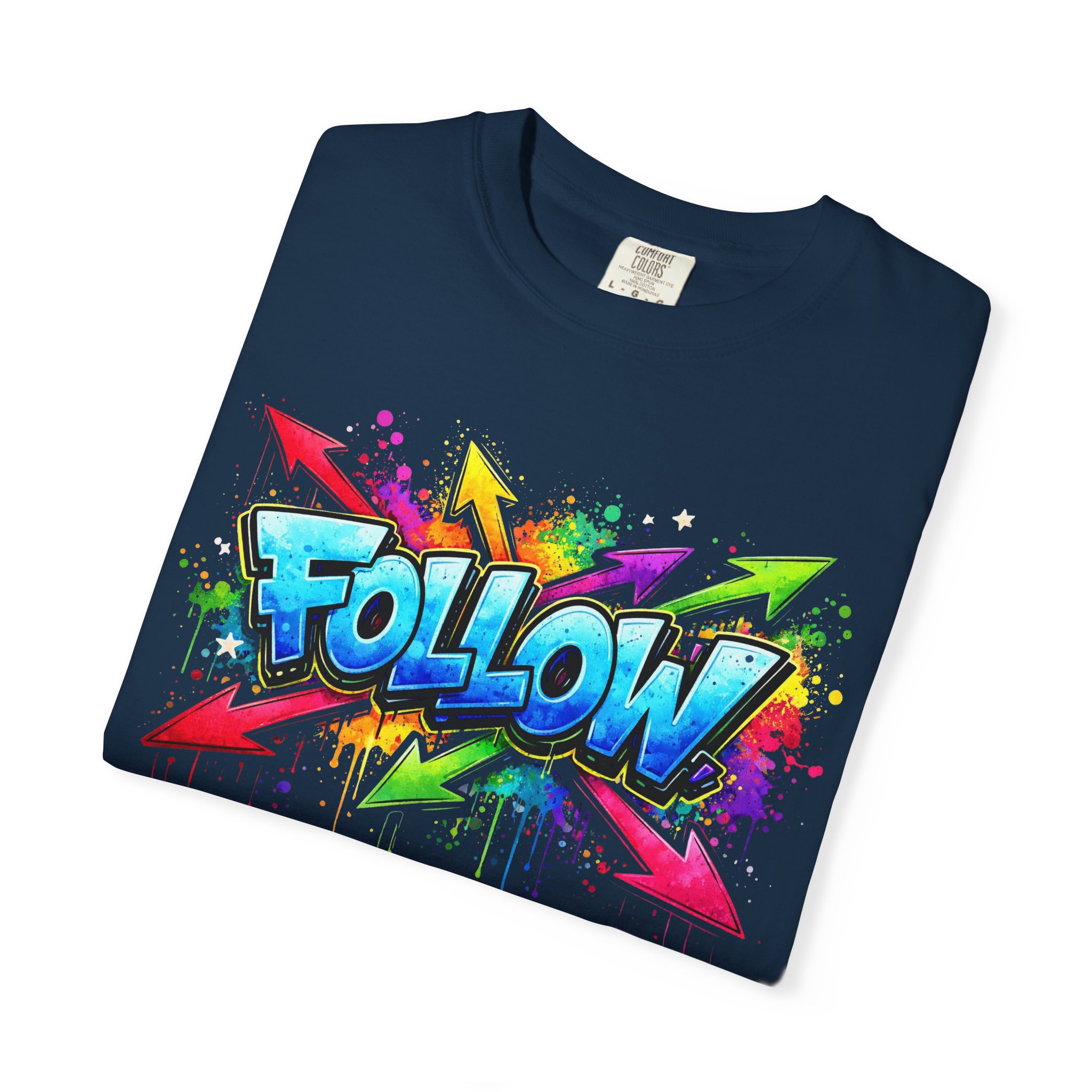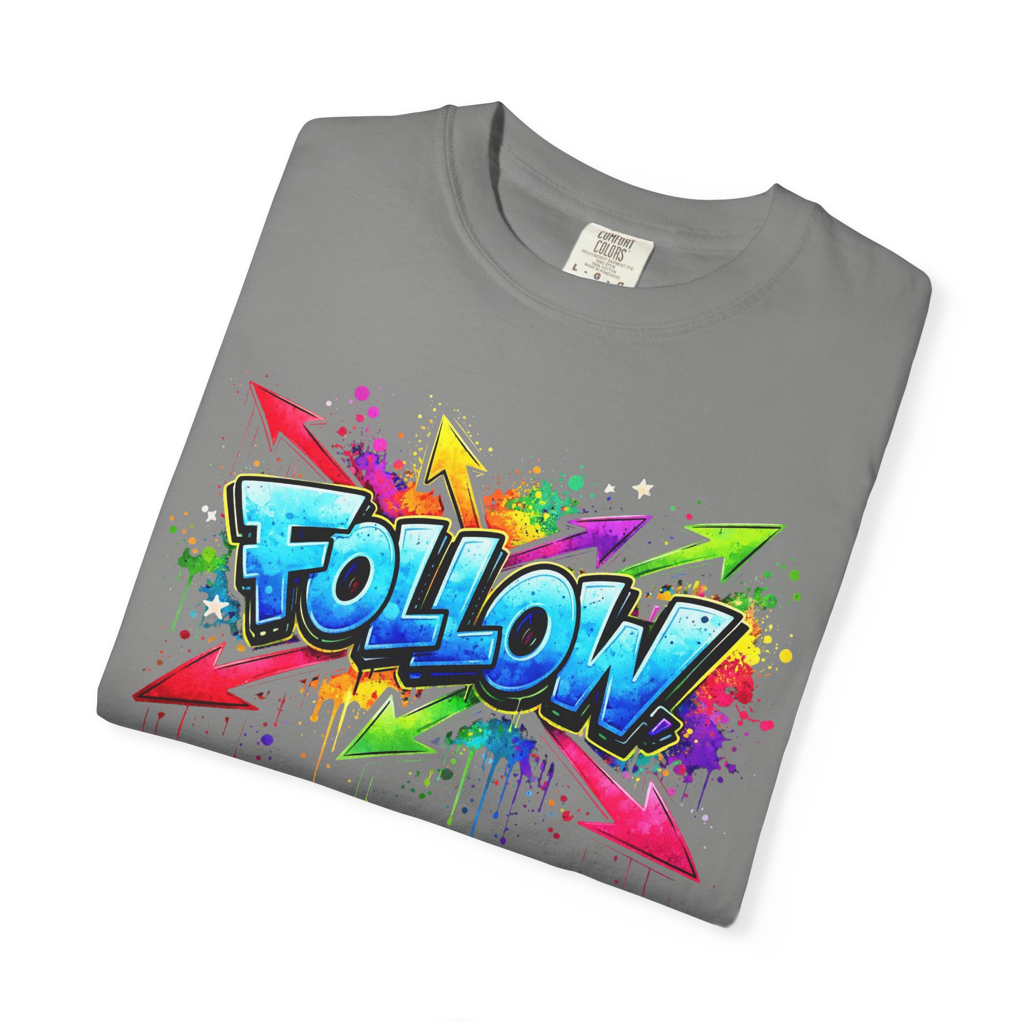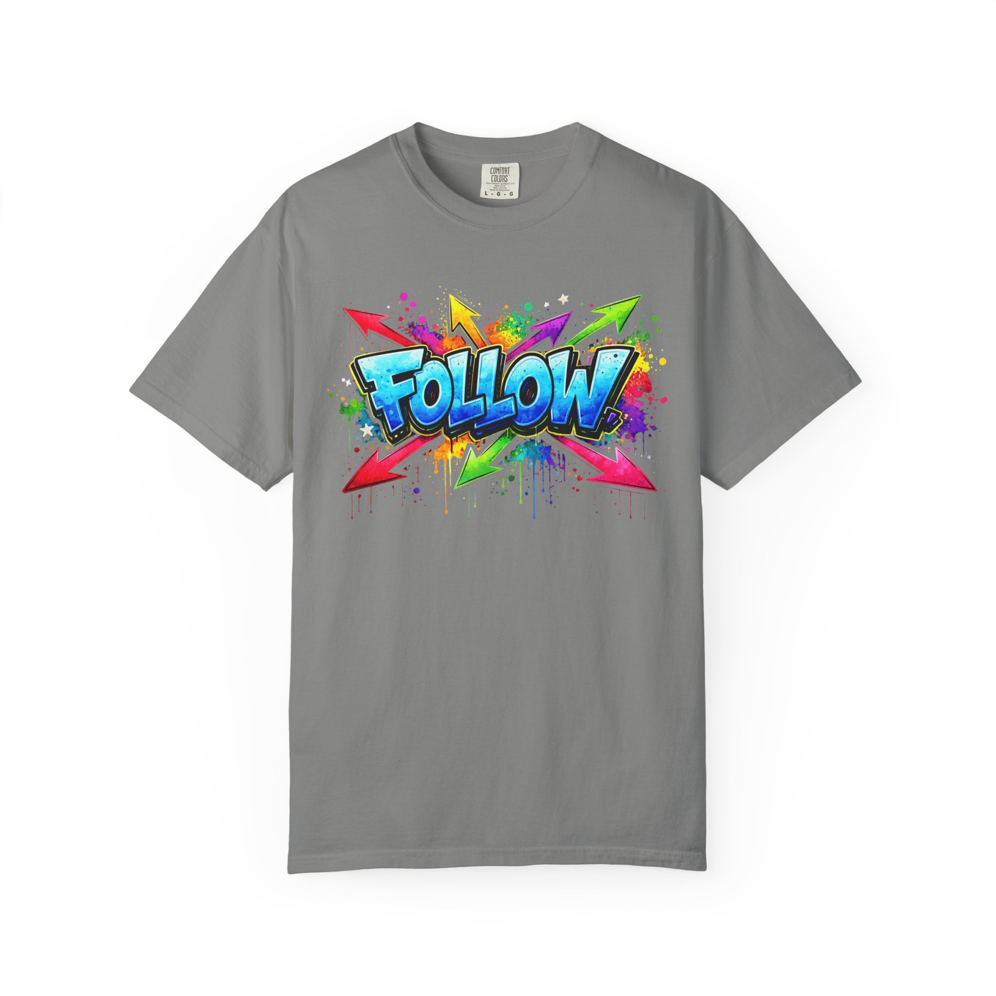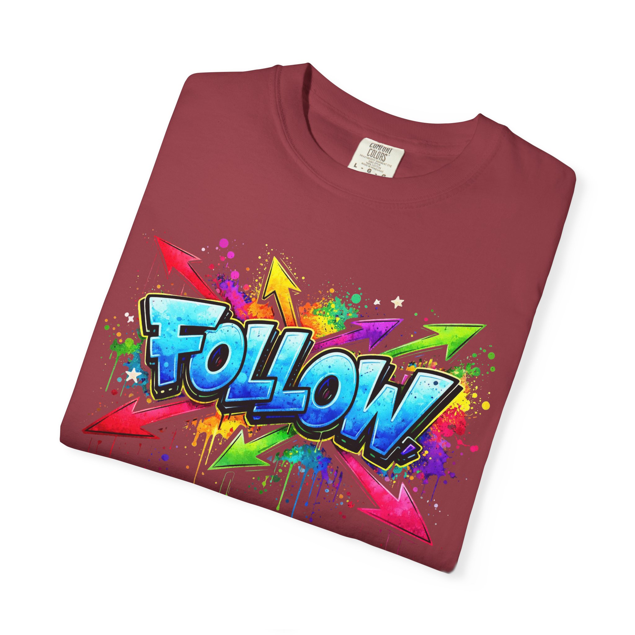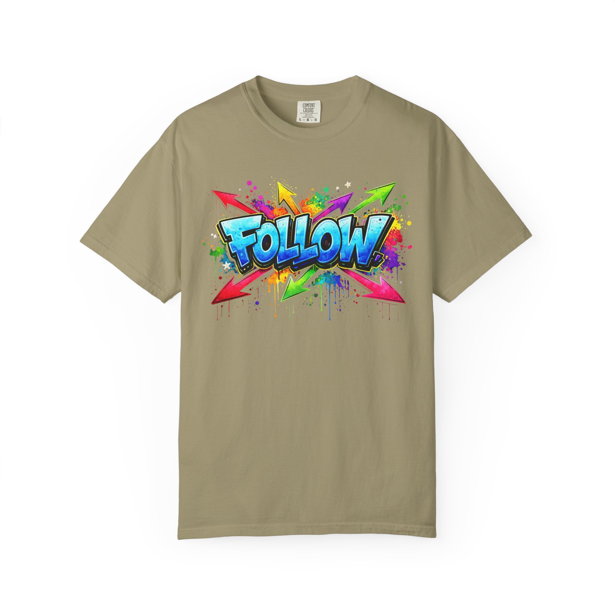 This relaxed, garment-dyed tee brings bold street-art energy into everyday wear. Soft, heavyweight ring-spun cotton feels lived-in from day one, while the vibrant graffiti-style “FOLLOW” graphic pops with multi-colored arrows and paint splatter. Wear it for skate sessions, casual meetups, or when you want to add color to a simple outfit. The roomy fit and sturdy double-needle stitching stand up to frequent wear, and the tubular construction keeps side seams out of the way for a clean silhouette. Available in many colors and sizes, it’s a confident, comfortable layer that reads like personal expression — loud, playful, and unapologetically graphic.
