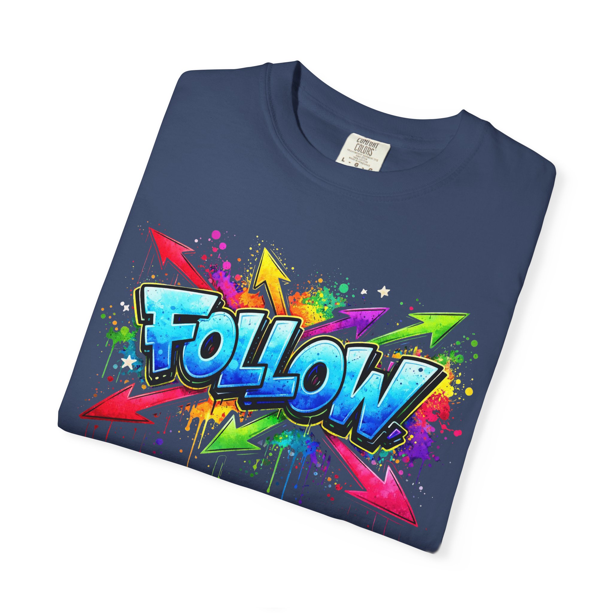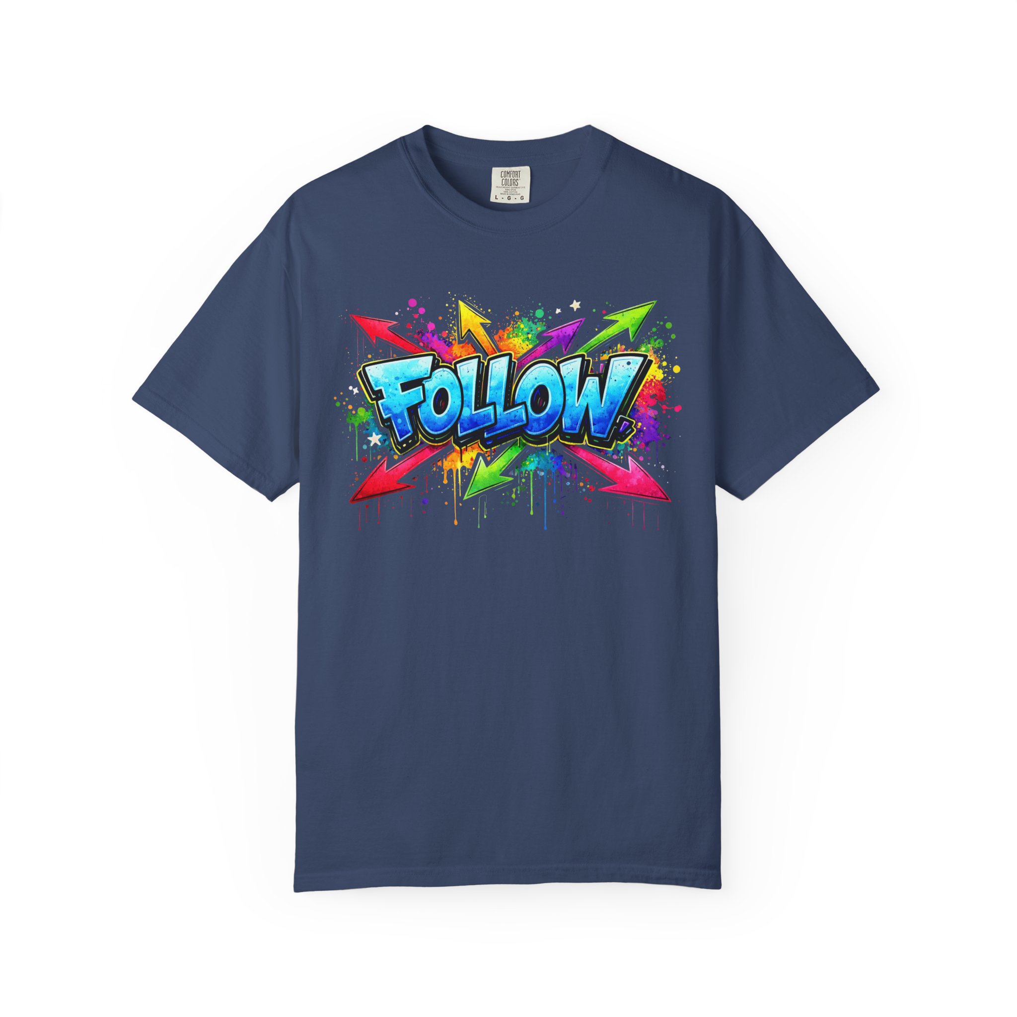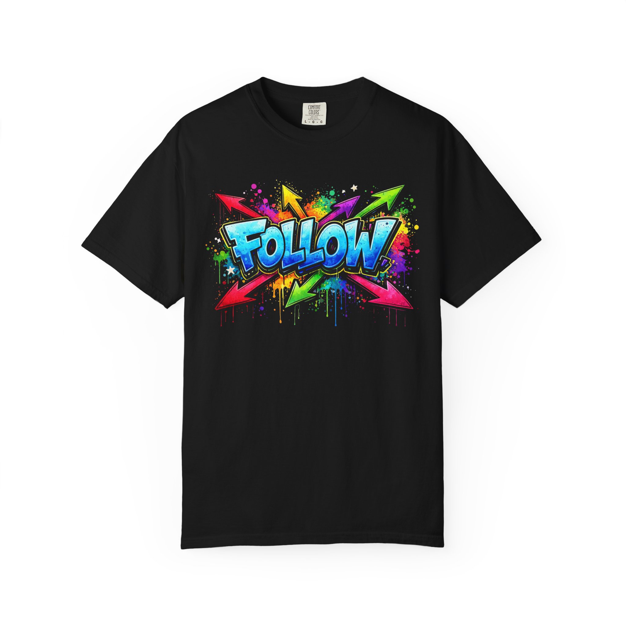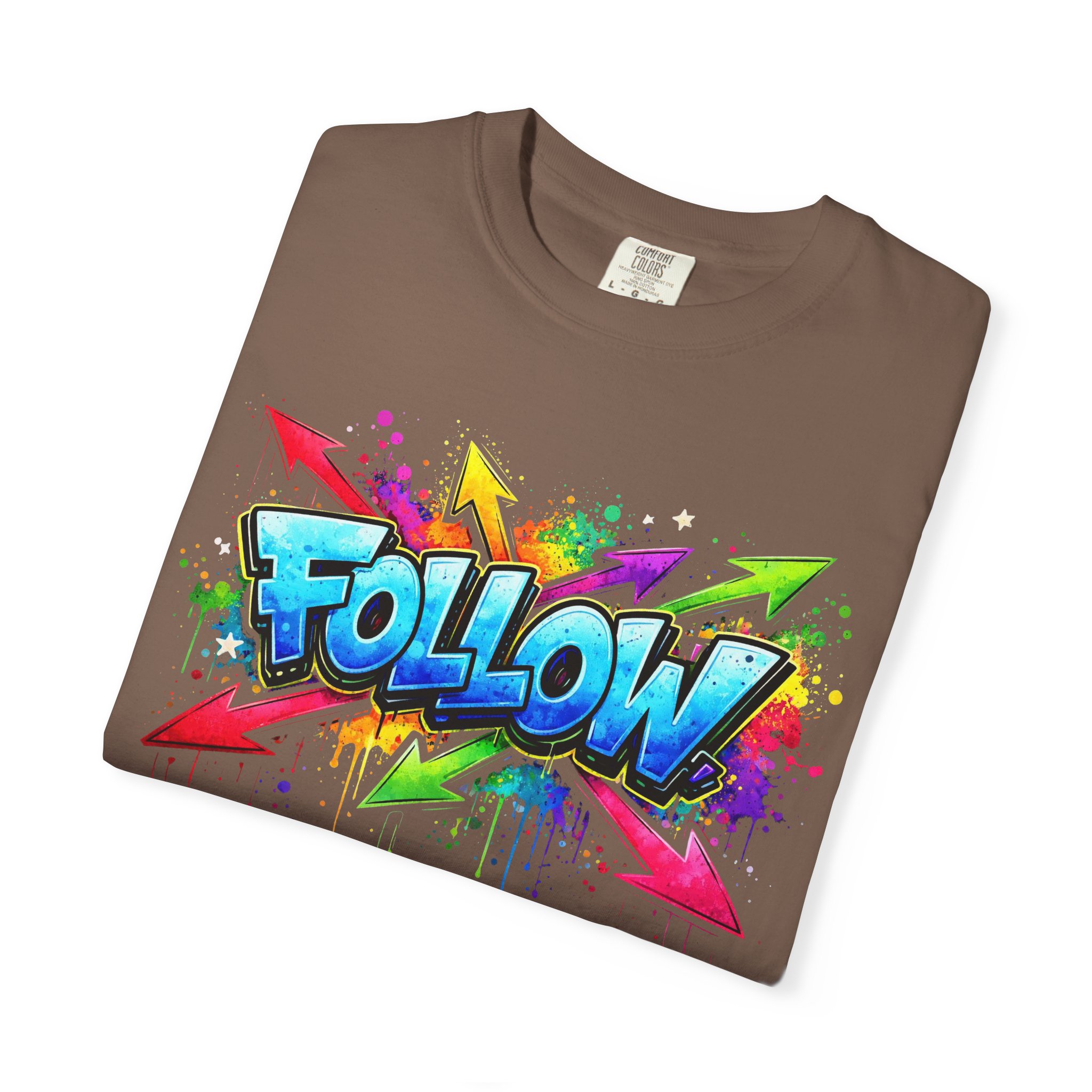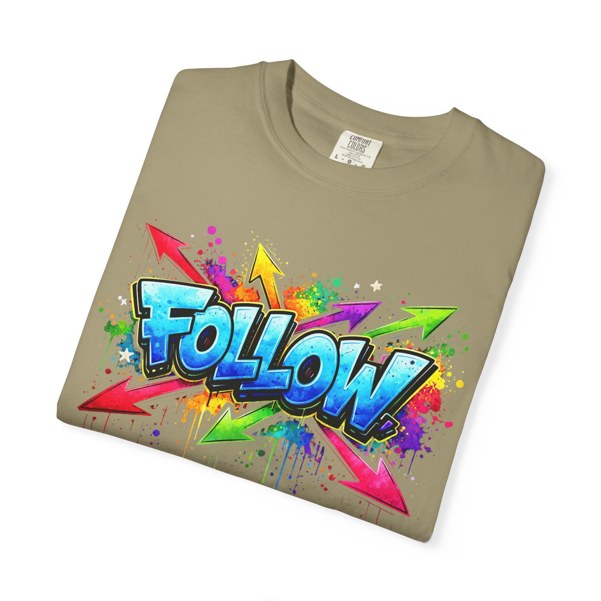 This relaxed, garment-dyed tee brings bold street-art energy into everyday wear. Soft, heavyweight ring-spun cotton feels lived-in from day one, while the vibrant graffiti-style “FOLLOW” graphic pops with multi-colored arrows and paint splatter. Wear it for skate sessions, casual meetups, or when you want to add color to a simple outfit. The roomy fit and sturdy double-needle stitching stand up to frequent wear, and the tubular construction keeps side seams out of the way for a clean silhouette. Available in many colors and sizes, it’s a confident, comfortable layer that reads like personal expression — loud, playful, and unapologetically graphic.