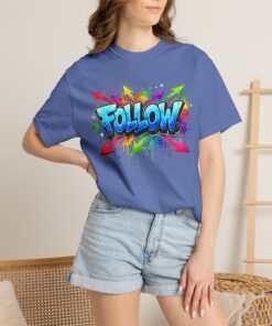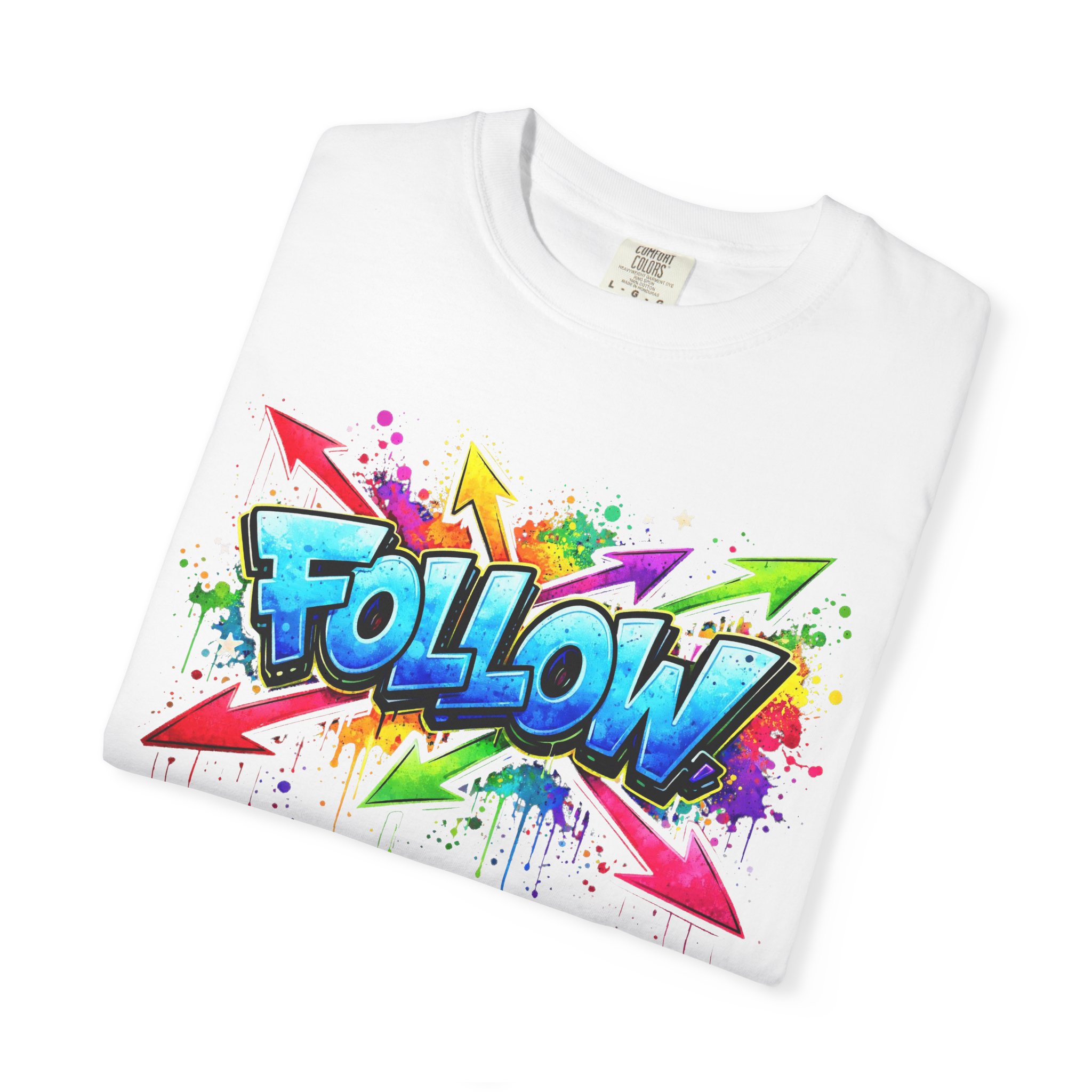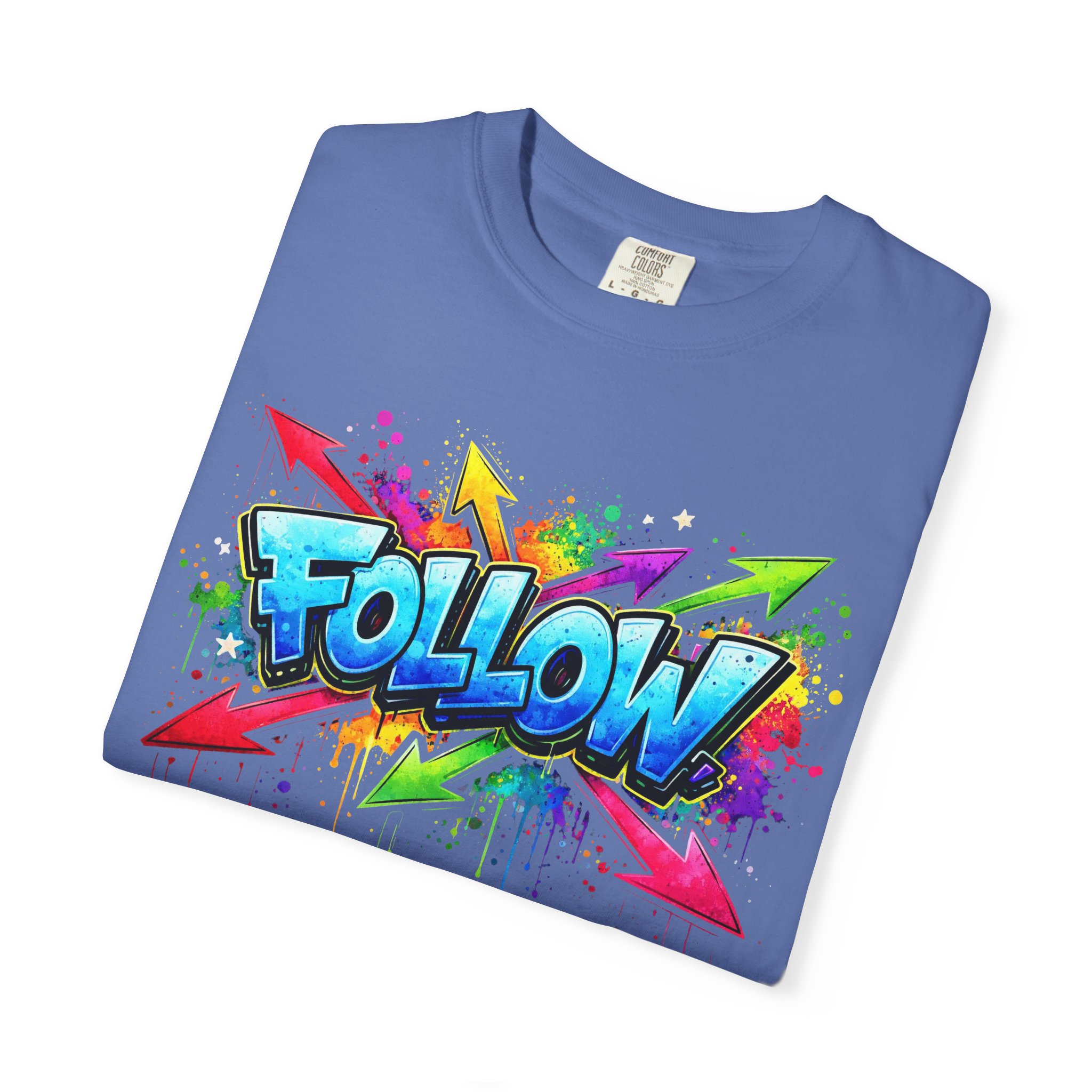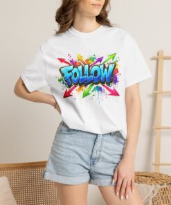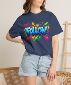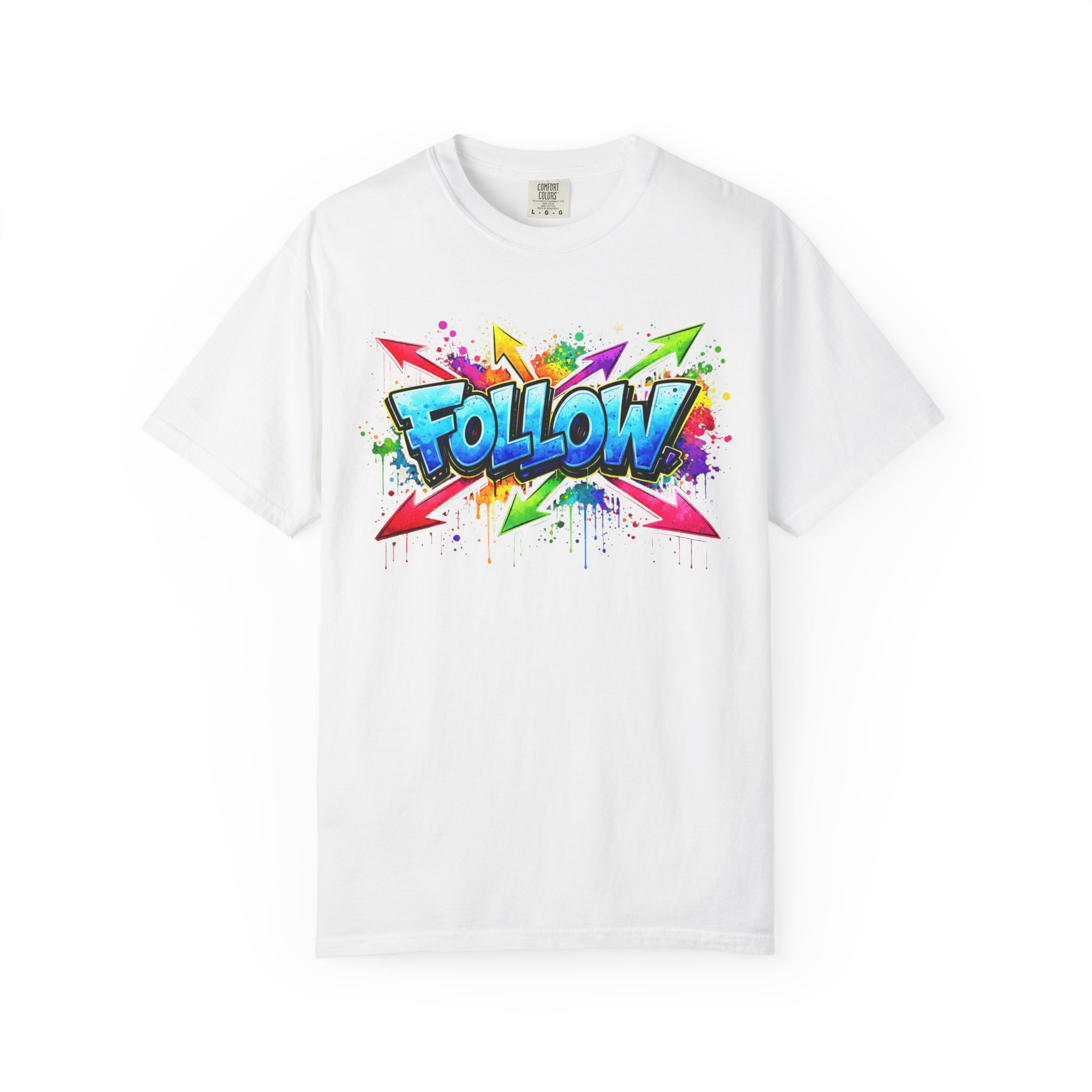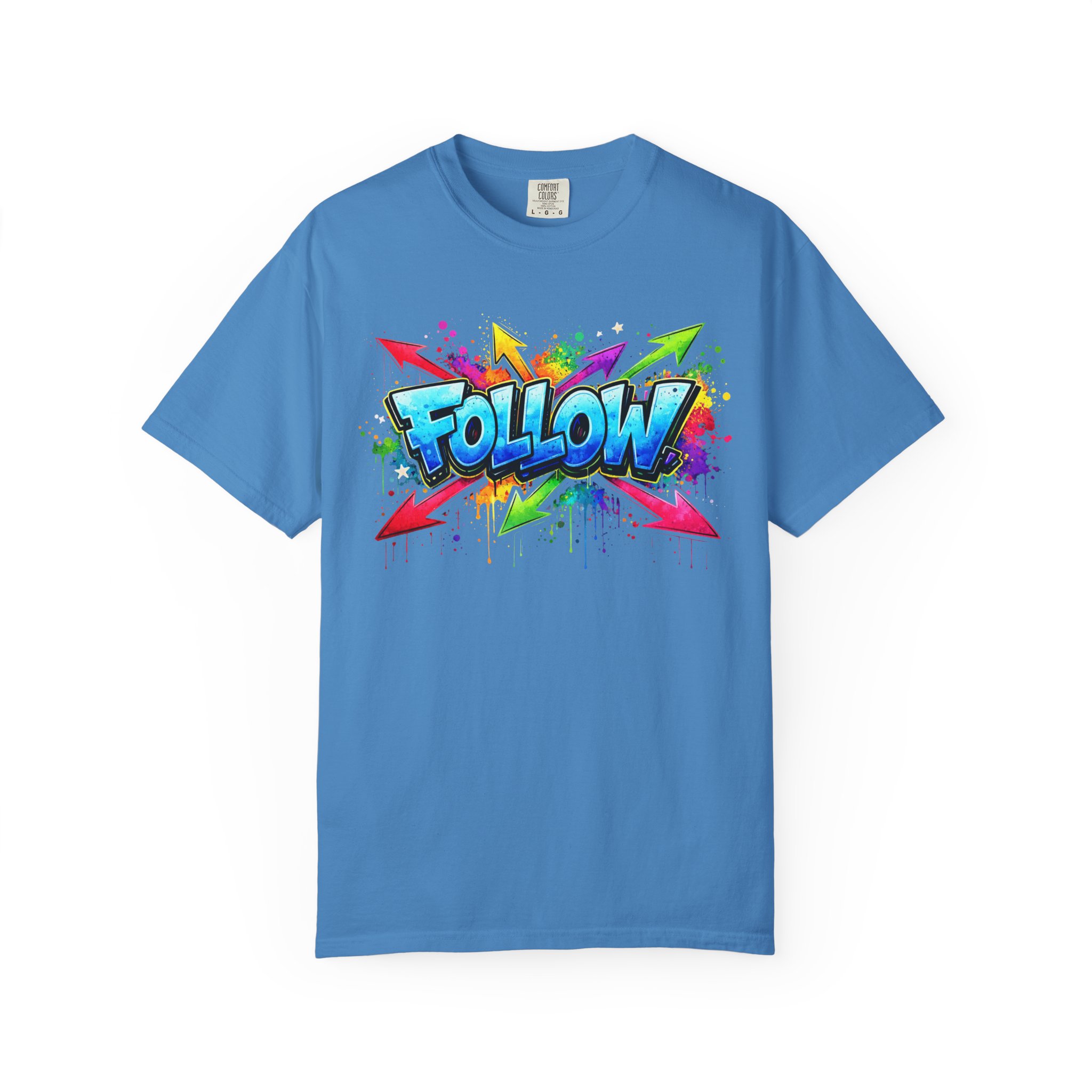 This relaxed, garment-dyed tee brings bold street-art energy into everyday wear. Soft, heavyweight ring-spun cotton feels lived-in from day one, while the vibrant graffiti-style “FOLLOW” graphic pops with multi-colored arrows and paint splatter. Wear it for skate sessions, casual meetups, or when you want to add color to a simple outfit. The roomy fit and sturdy double-needle stitching stand up to frequent wear, and the tubular construction keeps side seams out of the way for a clean silhouette. Available in many colors and sizes, it’s a confident, comfortable layer that reads like personal expression — loud, playful, and unapologetically graphic.