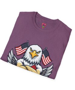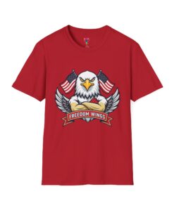 This lightweight crewneck shirt carries a bold patriotic spirit — a fierce bald eagle with spread wings flanked by American flags and a “Freedom Wings” banner. The soft ring-spun cotton feels smooth on the skin and sits comfortably in a classic, easy fit that layers well under jackets or stands out on its own. Durable tubular knit construction keeps the silhouette clean while ribbed collar and shoulder tape maintain shape after many wears. Wear it to rallies, barbecues, or backyard gatherings to quietly signal pride and steady confidence.
