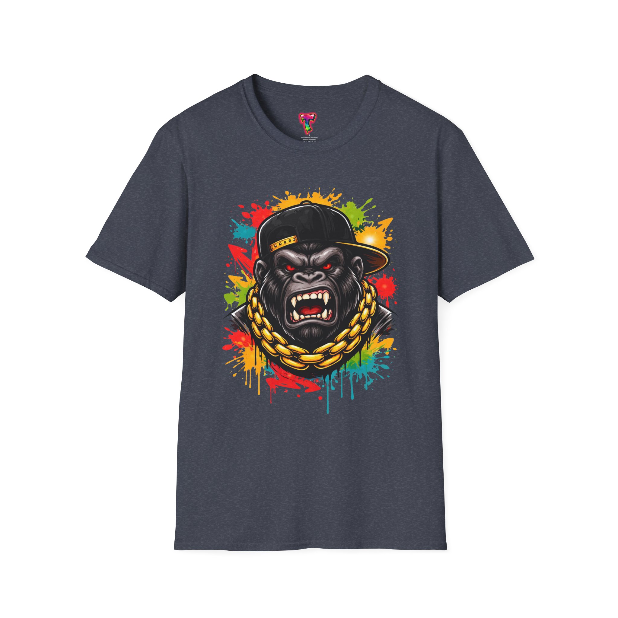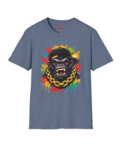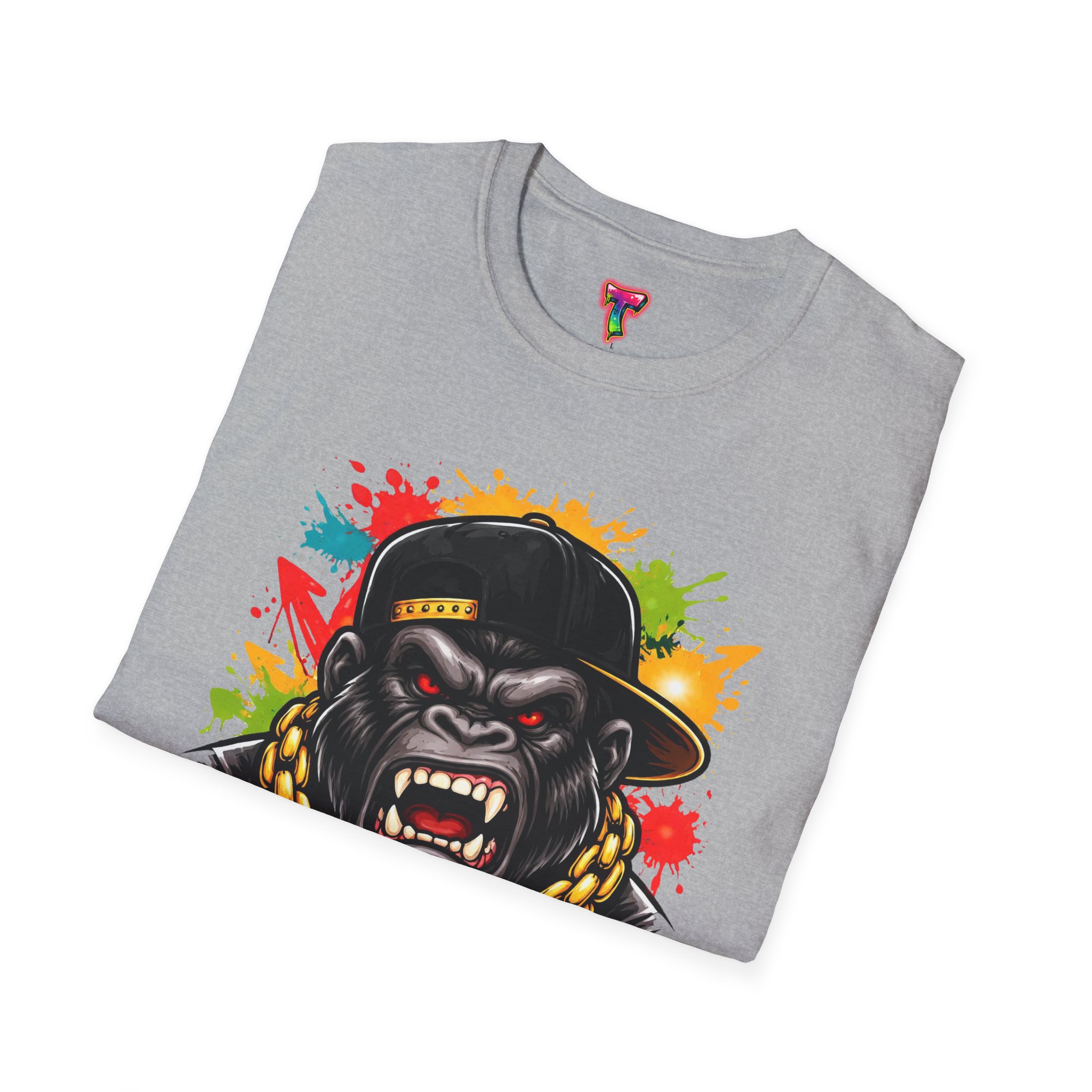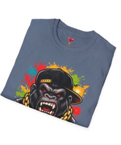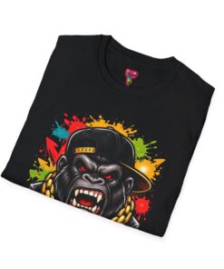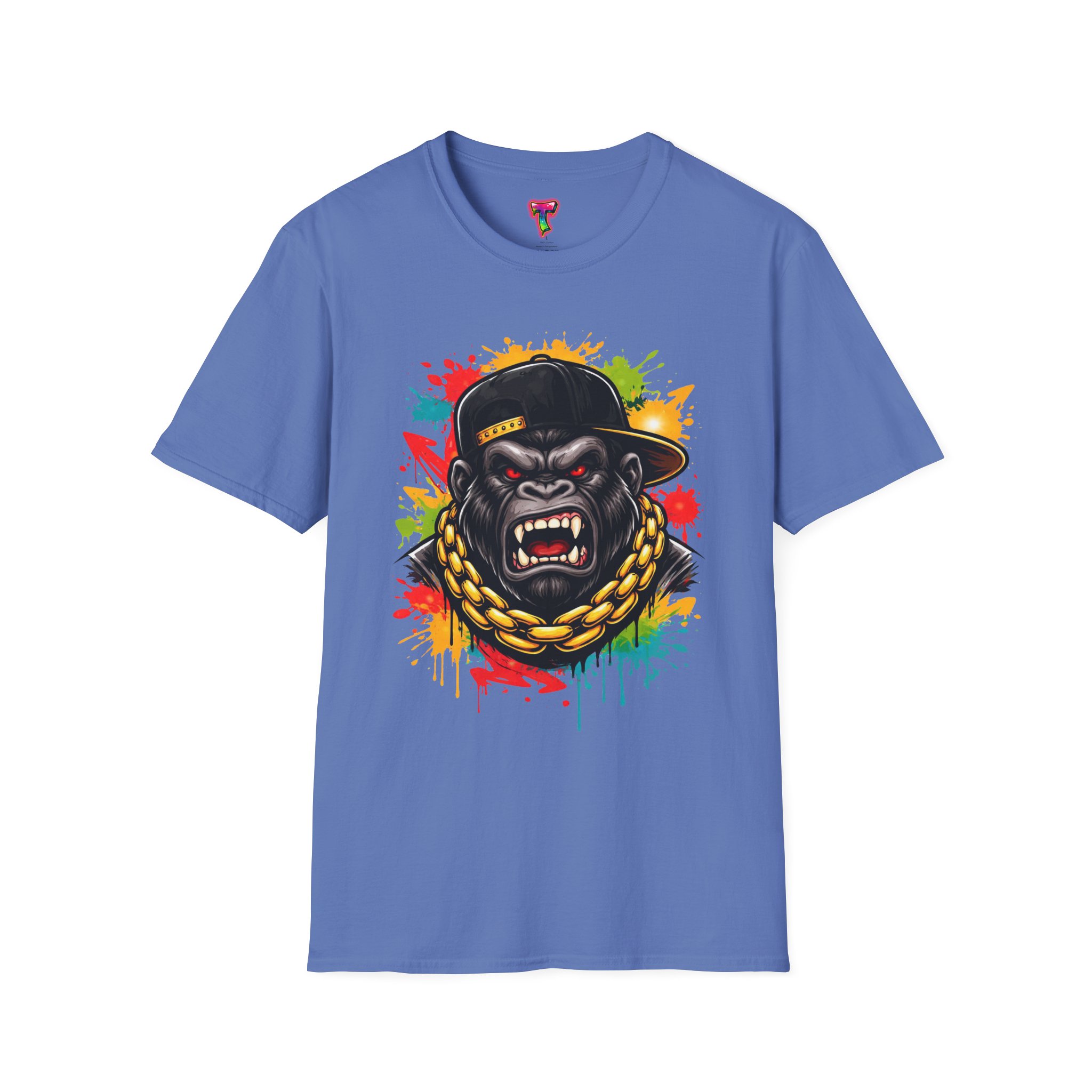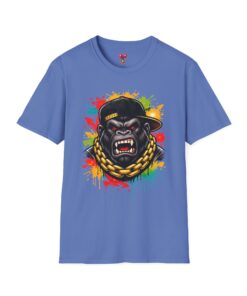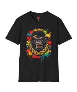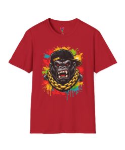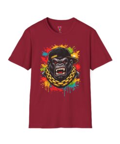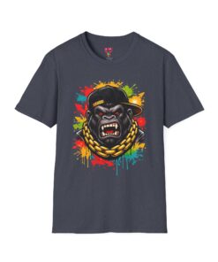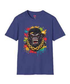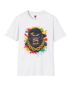 Raw energy, street attitude, and bold color collide on this lightweight cotton tee. The graphic centers a roaring gorilla wearing a sideways cap and thick gold chain, painted over a splash of vibrant inks — it feels like a vinyl sticker come to life. Wear it when you want your outfit to speak loud without trying: layered under a denim jacket for late-night city runs, thrown on for a skatepark session, or worn to casual meetups where style leans toward the unapologetic. The soft ring-spun fabric and tubular knit keep the silhouette clean and comfortable, while the ribbed collar and shoulder tape hold shape through repeat wears. This shirt ages into your rotation, not away from it.