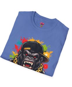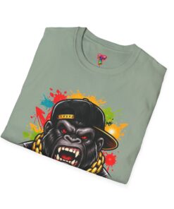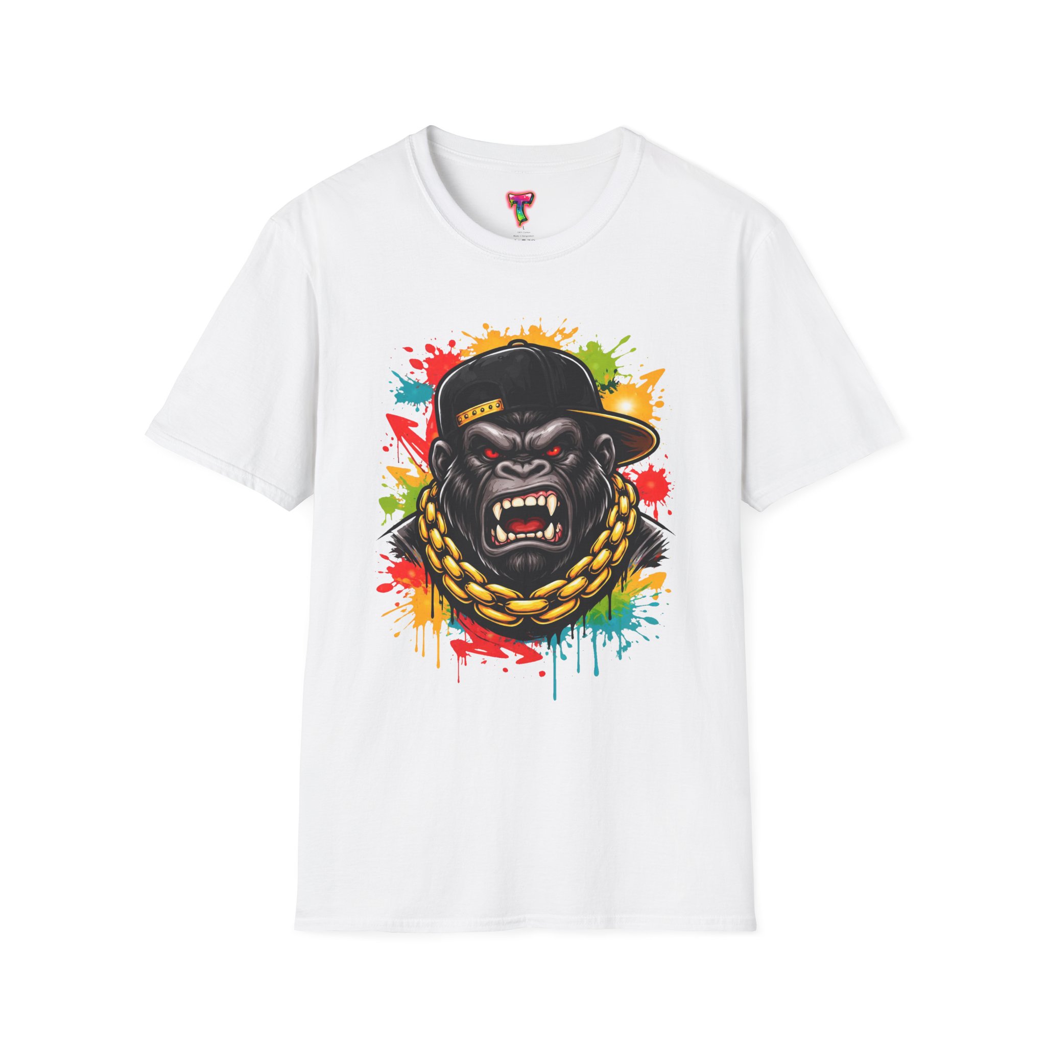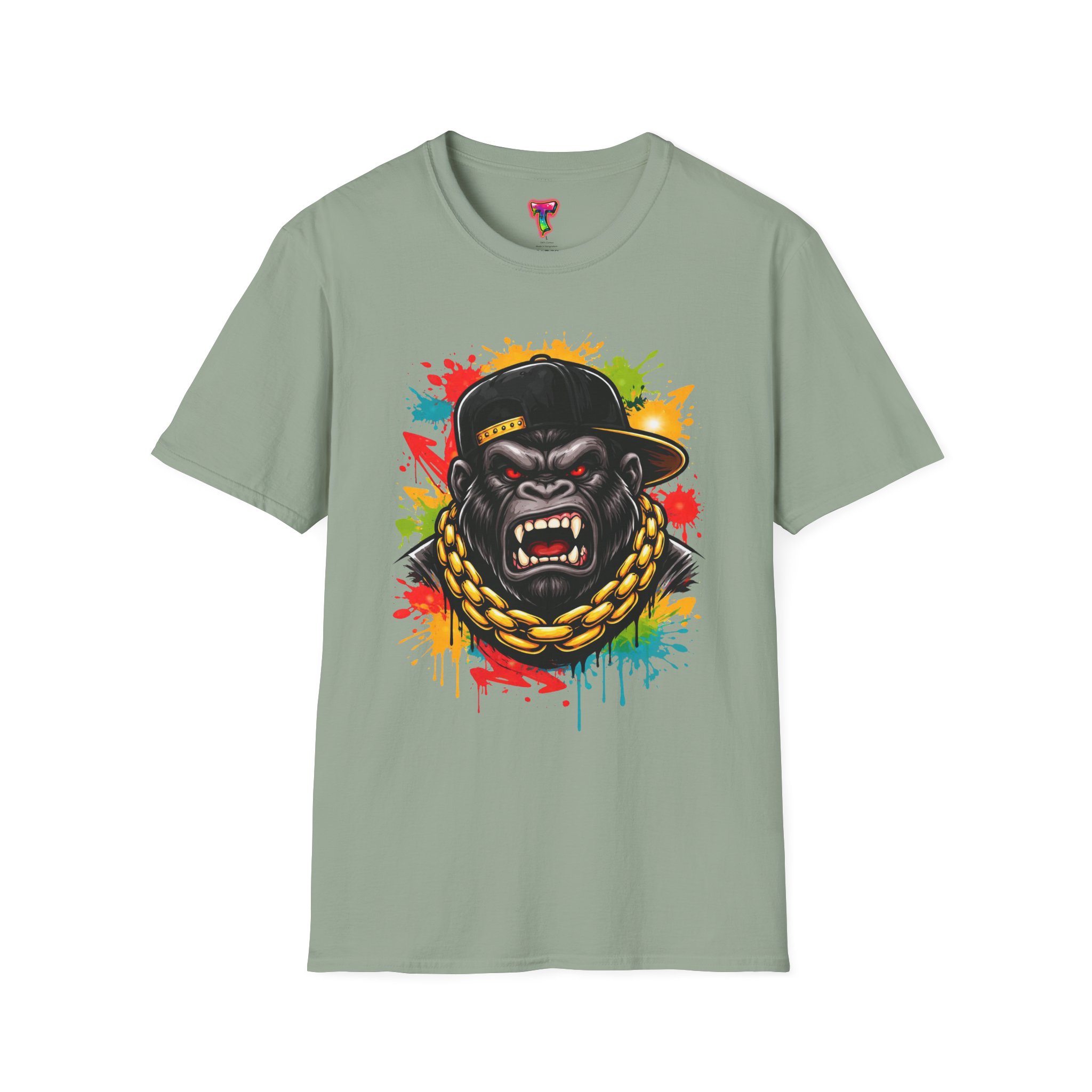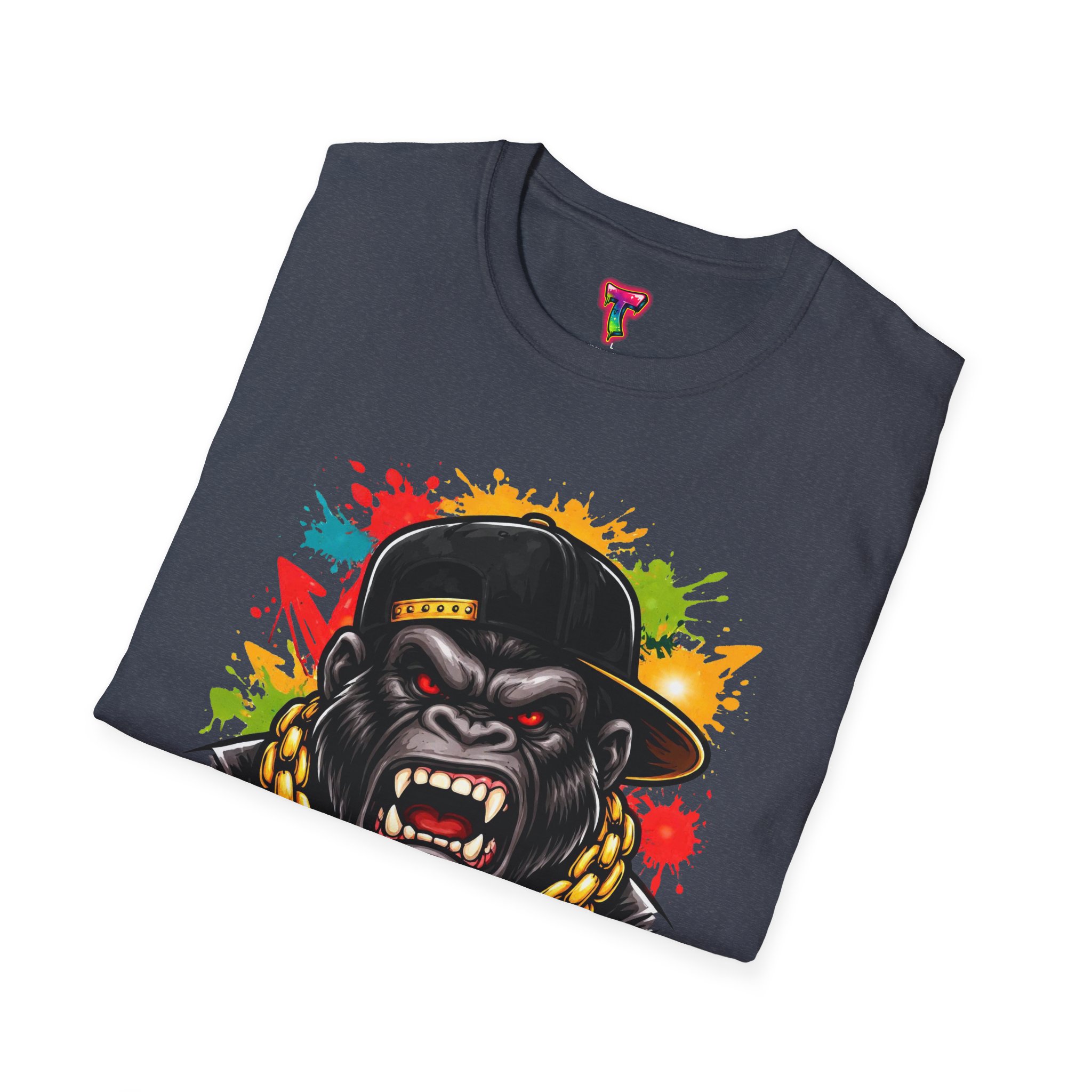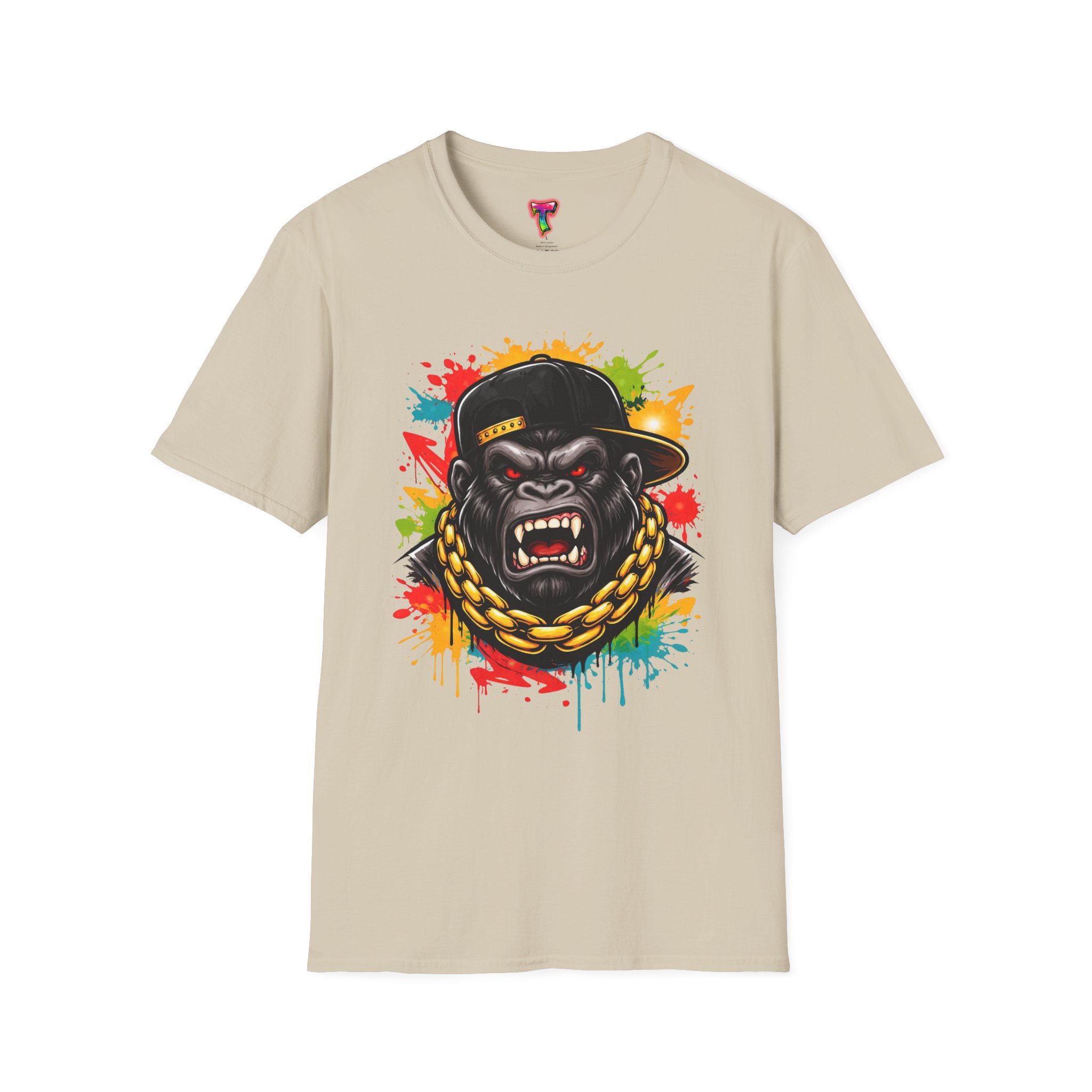 Raw energy, street attitude, and bold color collide on this lightweight cotton tee. The graphic centers a roaring gorilla wearing a sideways cap and thick gold chain, painted over a splash of vibrant inks — it feels like a vinyl sticker come to life. Wear it when you want your outfit to speak loud without trying: layered under a denim jacket for late-night city runs, thrown on for a skatepark session, or worn to casual meetups where style leans toward the unapologetic. The soft ring-spun fabric and tubular knit keep the silhouette clean and comfortable, while the ribbed collar and shoulder tape hold shape through repeat wears. This shirt ages into your rotation, not away from it.