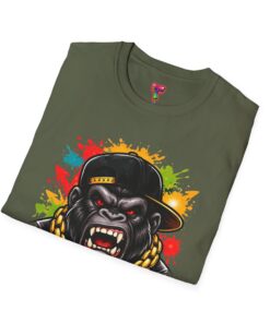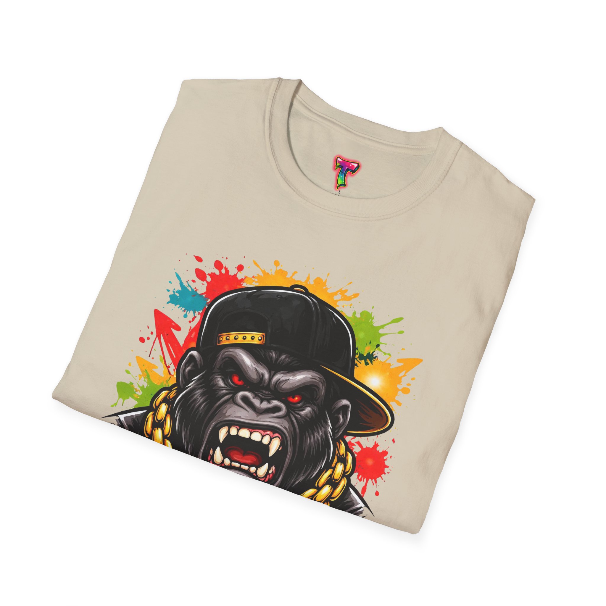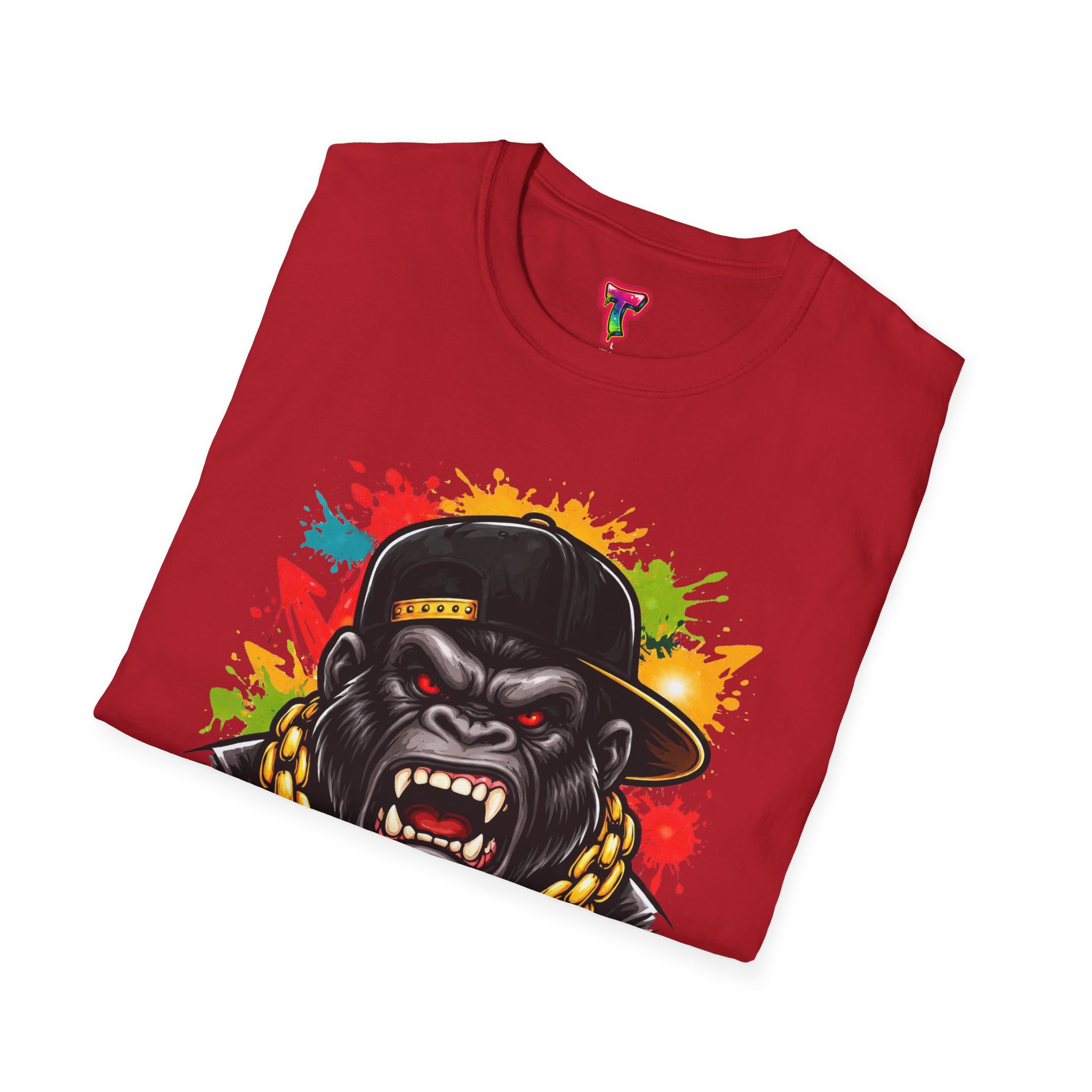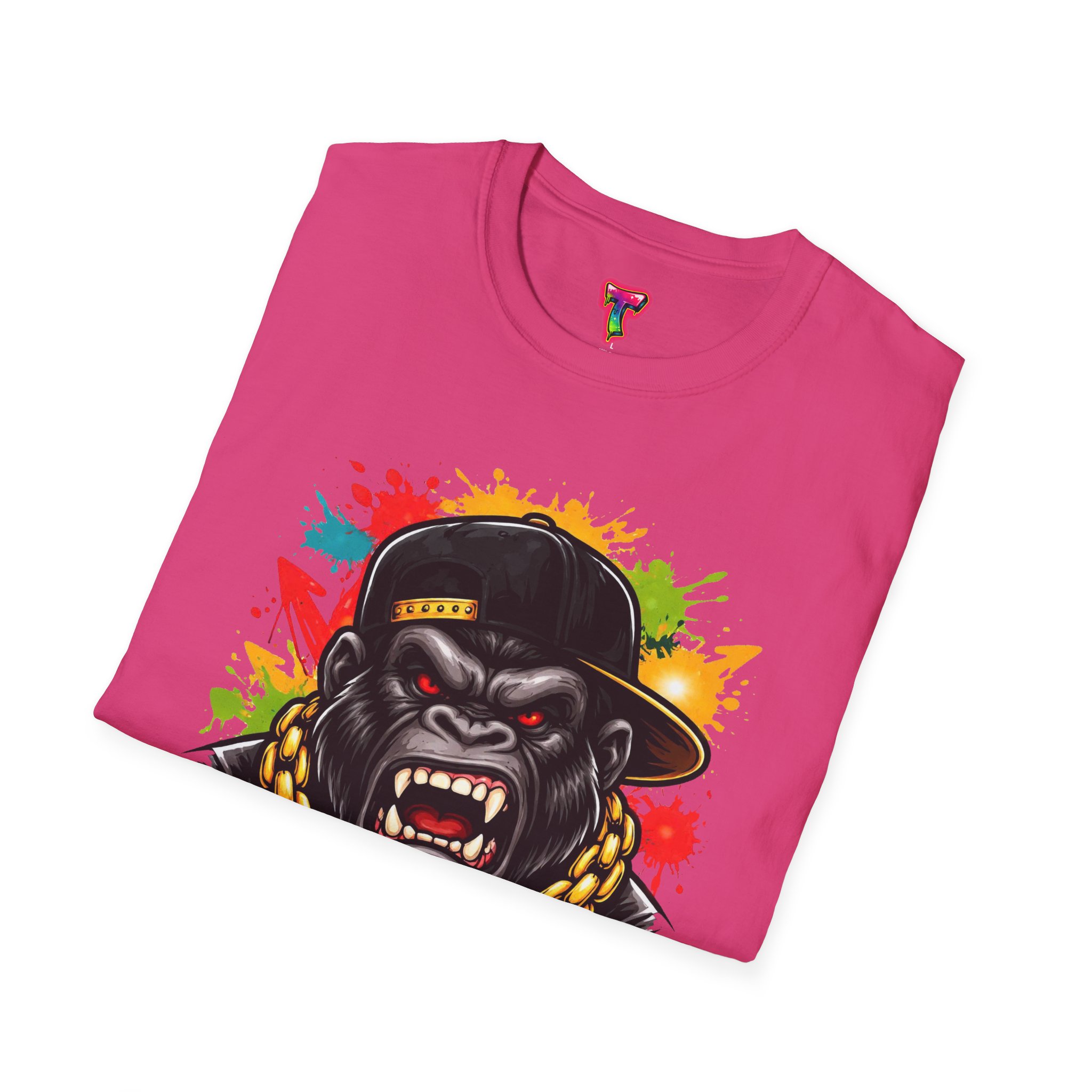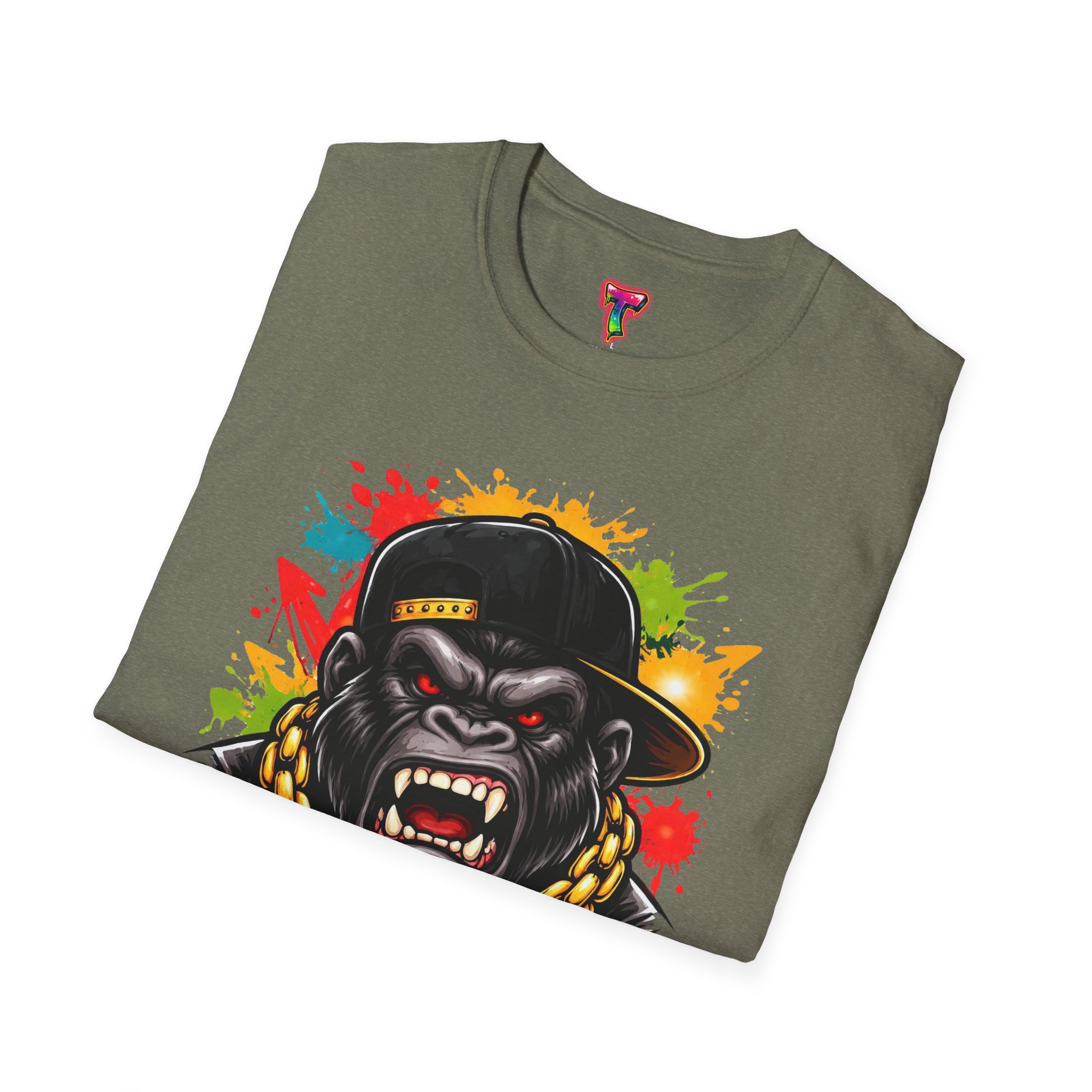 Raw energy, street attitude, and bold color collide on this lightweight cotton tee. The graphic centers a roaring gorilla wearing a sideways cap and thick gold chain, painted over a splash of vibrant inks — it feels like a vinyl sticker come to life. Wear it when you want your outfit to speak loud without trying: layered under a denim jacket for late-night city runs, thrown on for a skatepark session, or worn to casual meetups where style leans toward the unapologetic. The soft ring-spun fabric and tubular knit keep the silhouette clean and comfortable, while the ribbed collar and shoulder tape hold shape through repeat wears. This shirt ages into your rotation, not away from it.