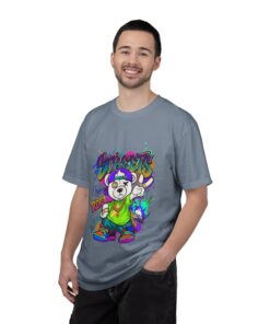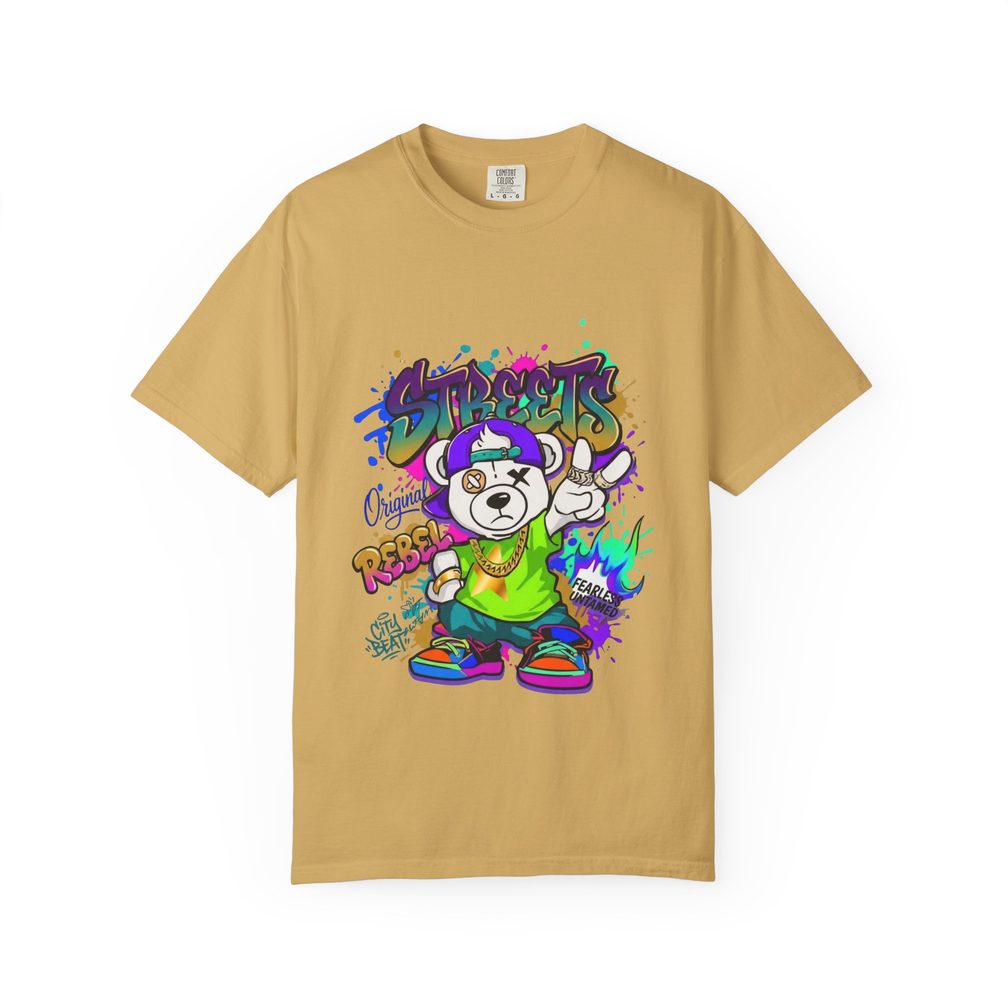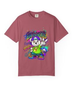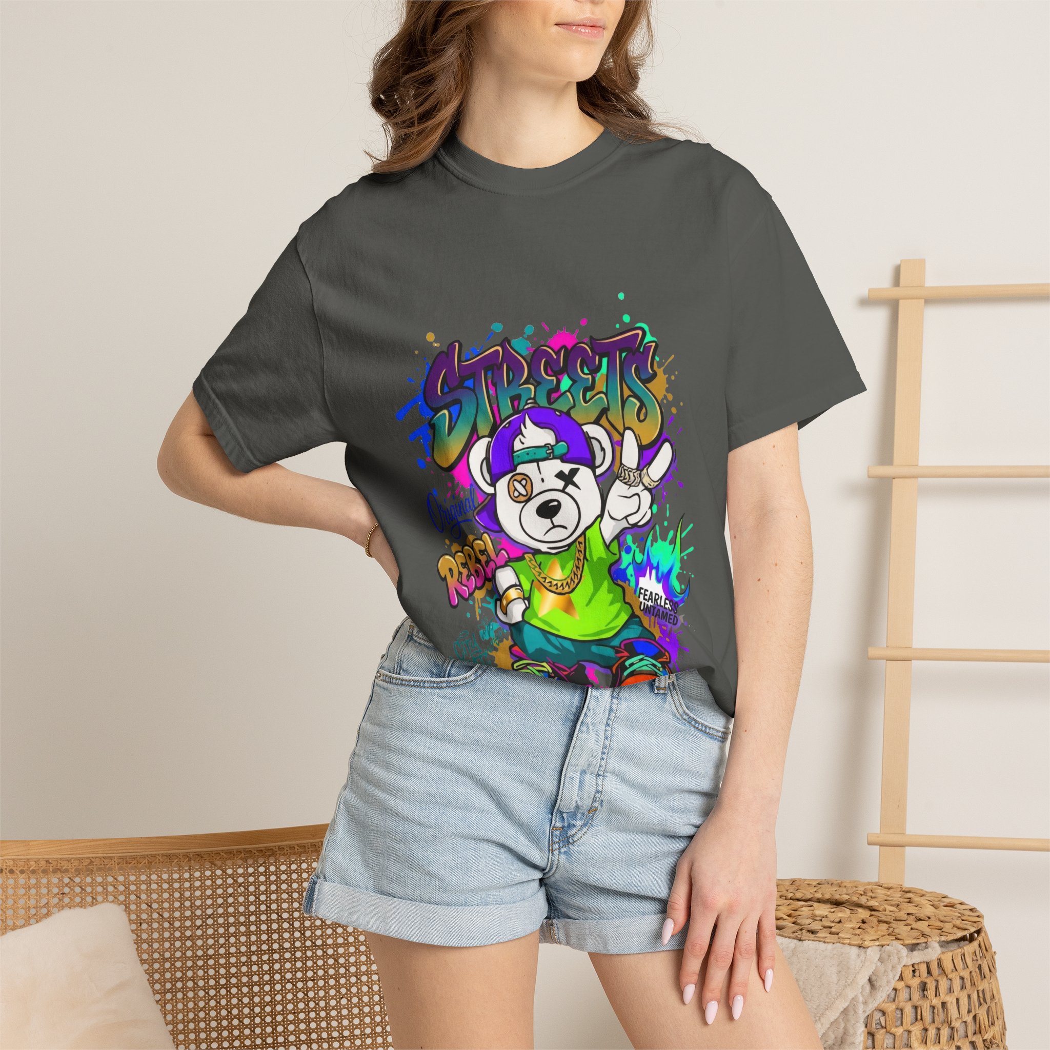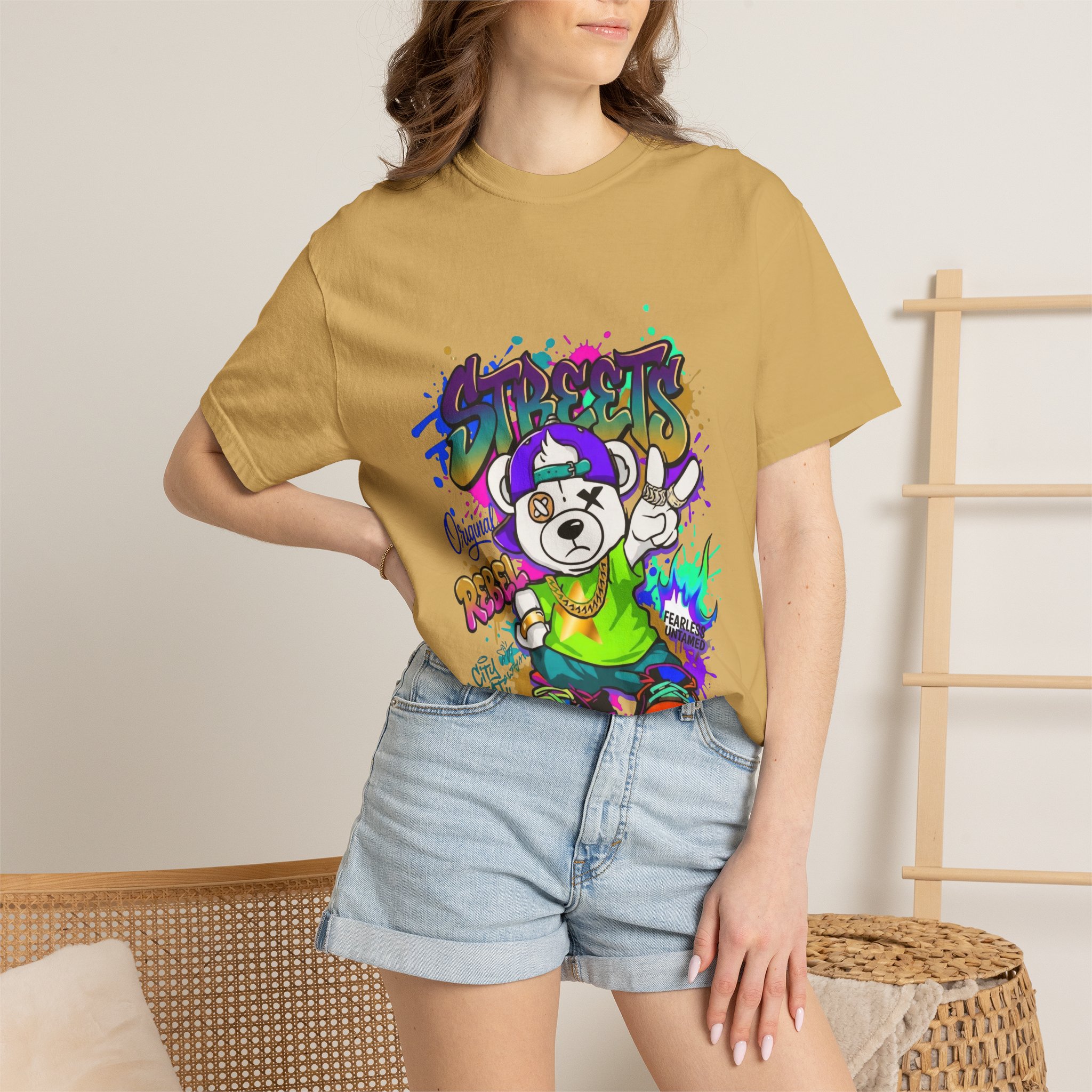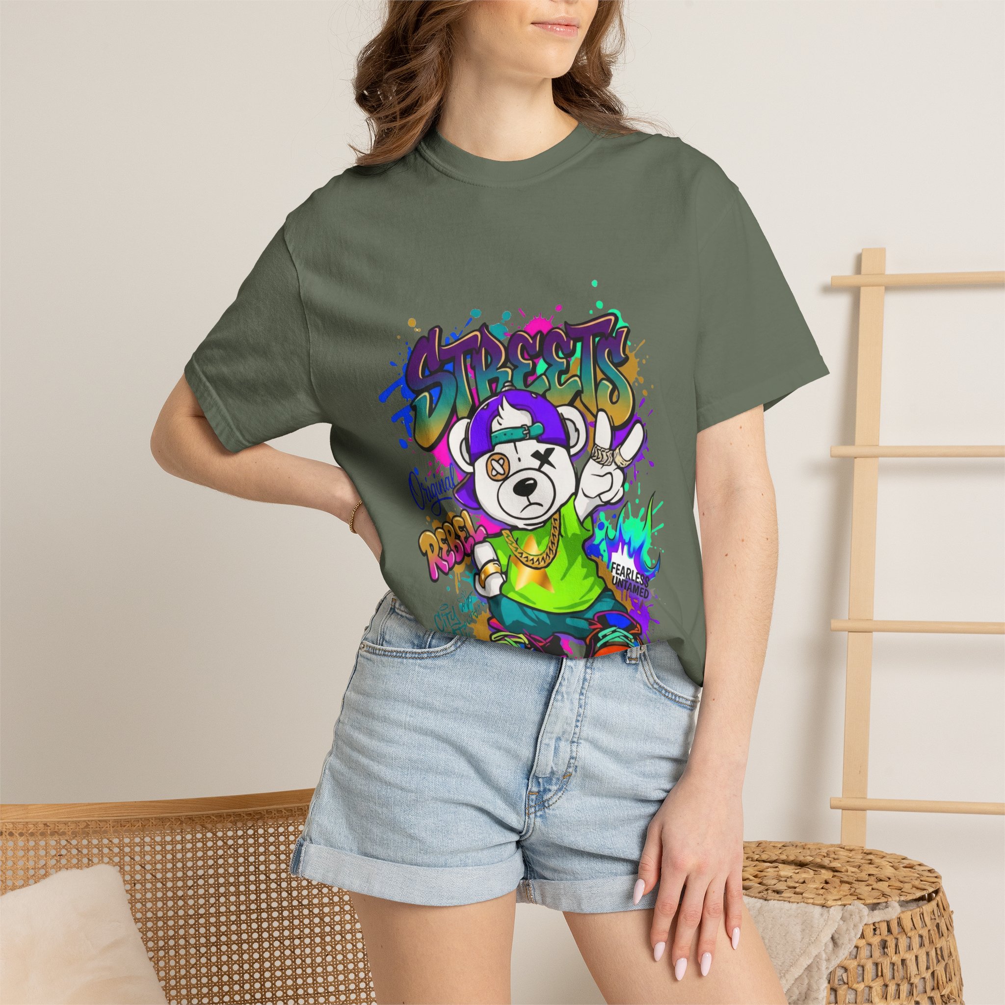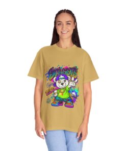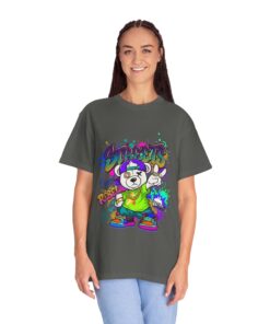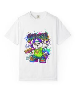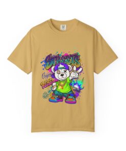 A bold, garment-dyed tee that brings street-art energy to everyday wear. The heavyweight cotton has a lived-in softness from the after-construction dyeing process, so the colors sit with a slightly vintage, broken-in look. At the center, a graffiti-style bear bursts with neon hues and urban flair — a playful, rebellious focal point that reads like a mural you can wear. The relaxed fit and tubular knit give room to move while preserving clean lines and minimal seams. Wear it to skate sessions, late-night art shows, or just when you want your outfit to say you appreciate color, character, and durable construction.