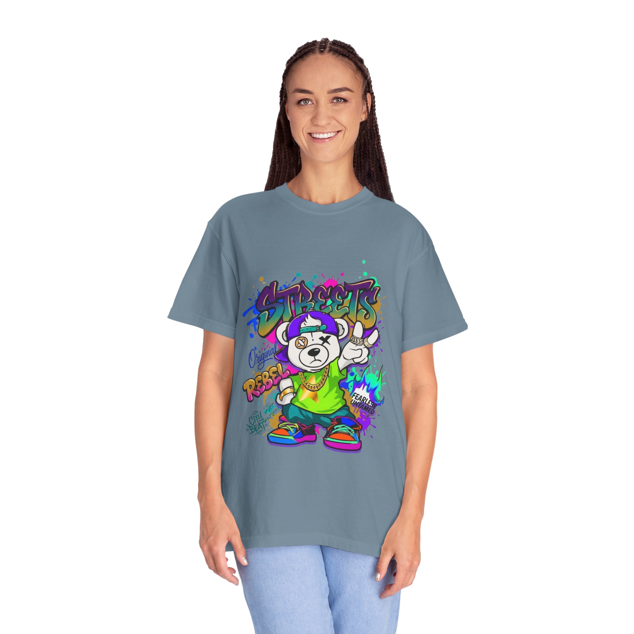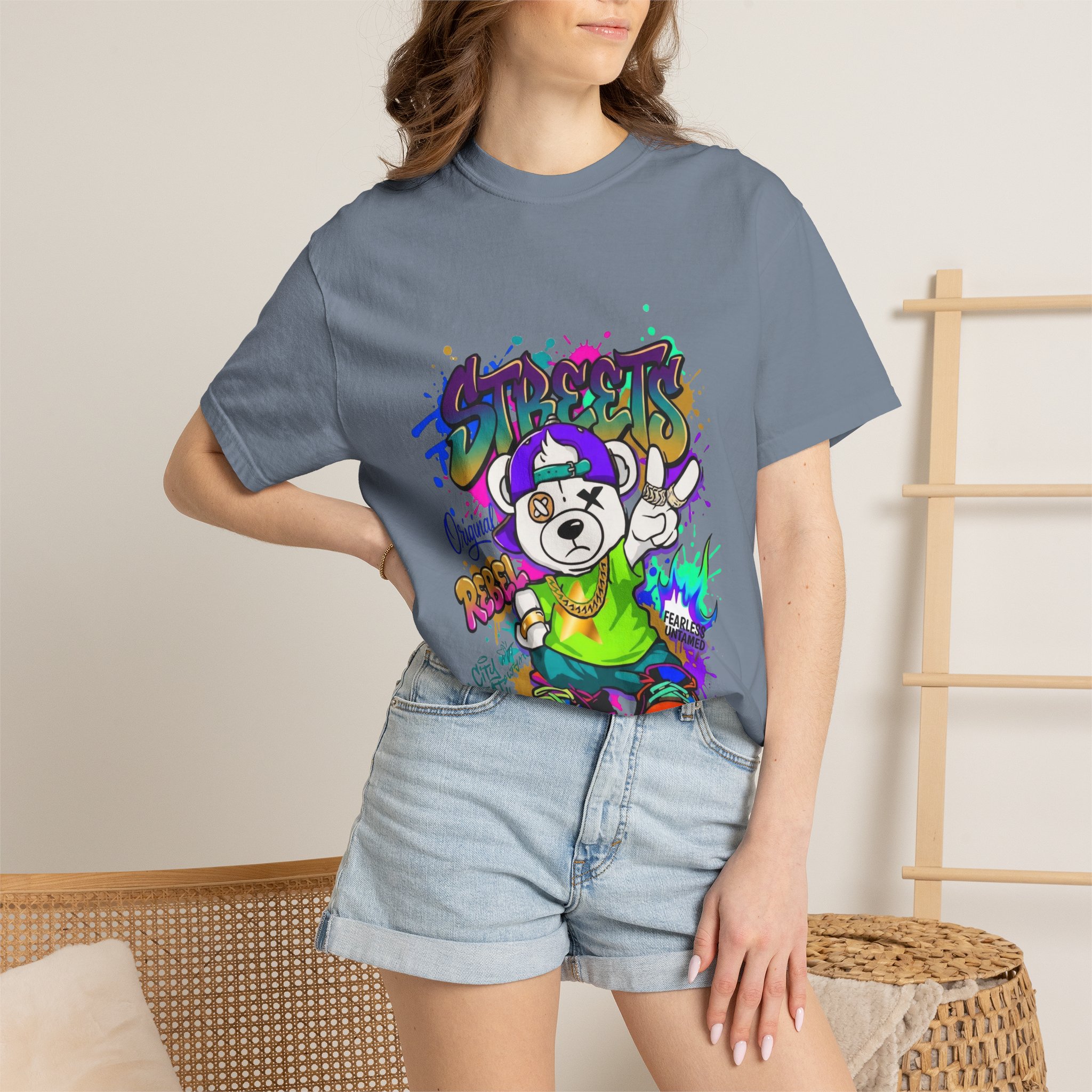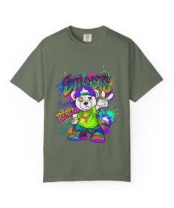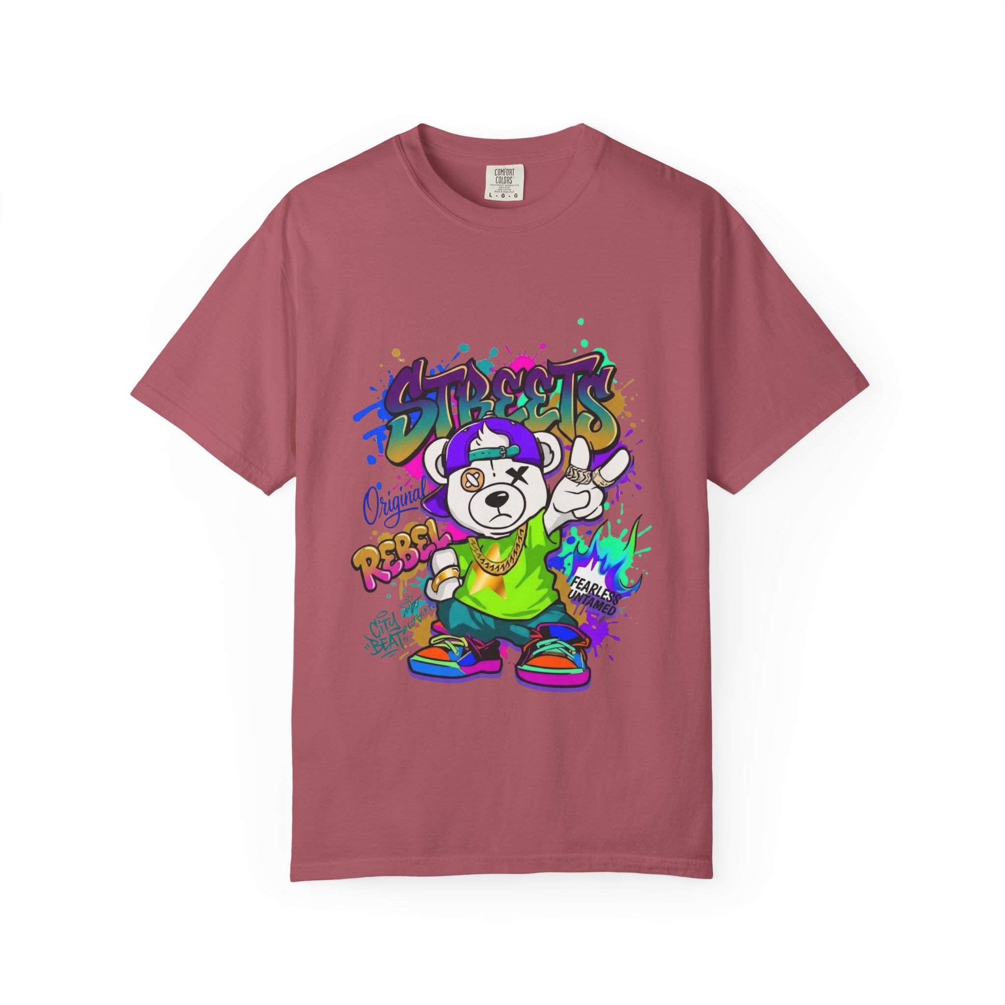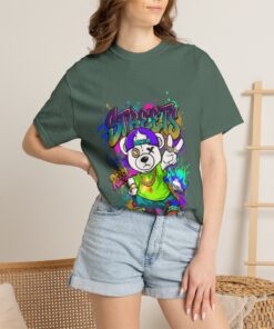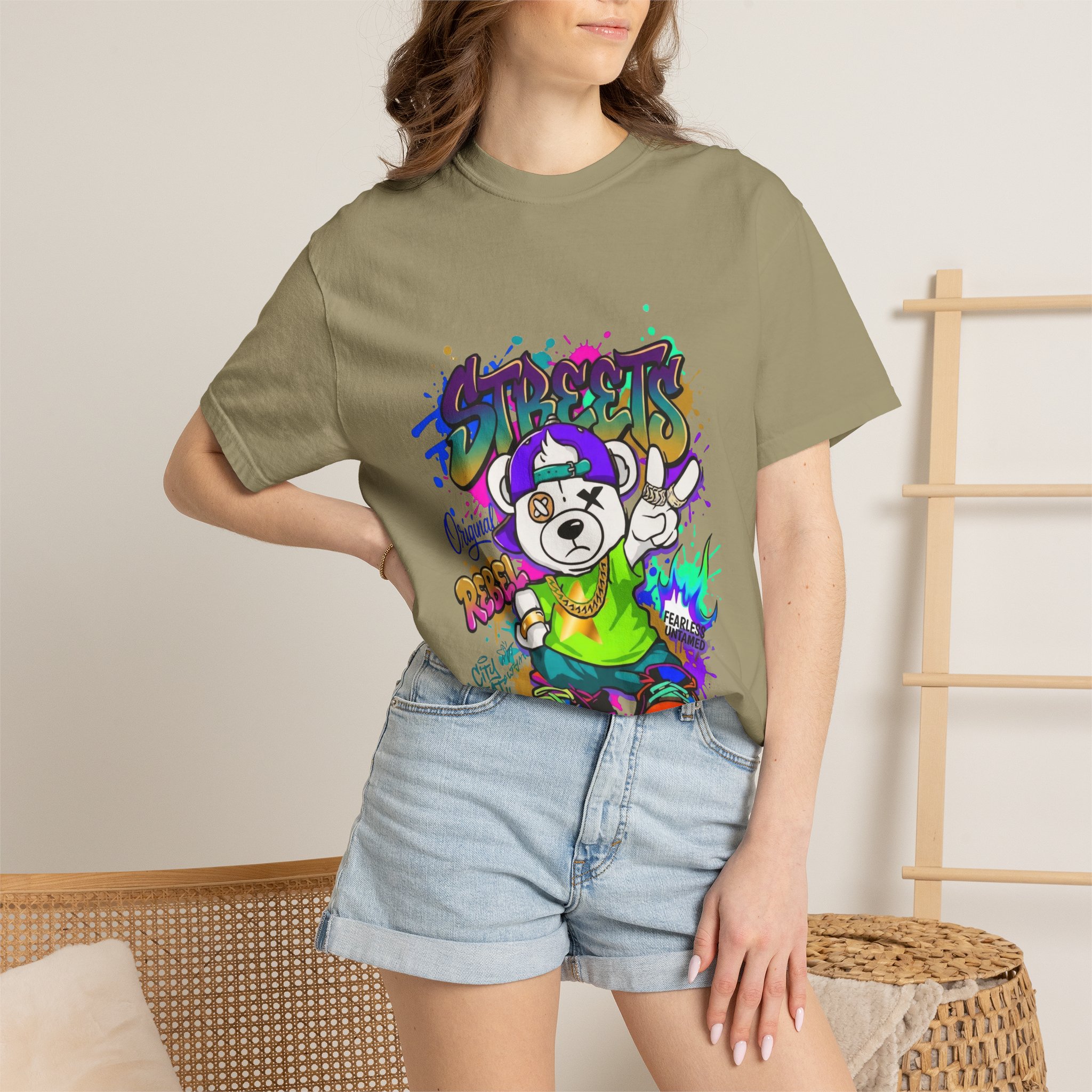 A bold, garment-dyed tee that brings street-art energy to everyday wear. The heavyweight cotton has a lived-in softness from the after-construction dyeing process, so the colors sit with a slightly vintage, broken-in look. At the center, a graffiti-style bear bursts with neon hues and urban flair — a playful, rebellious focal point that reads like a mural you can wear. The relaxed fit and tubular knit give room to move while preserving clean lines and minimal seams. Wear it to skate sessions, late-night art shows, or just when you want your outfit to say you appreciate color, character, and durable construction.