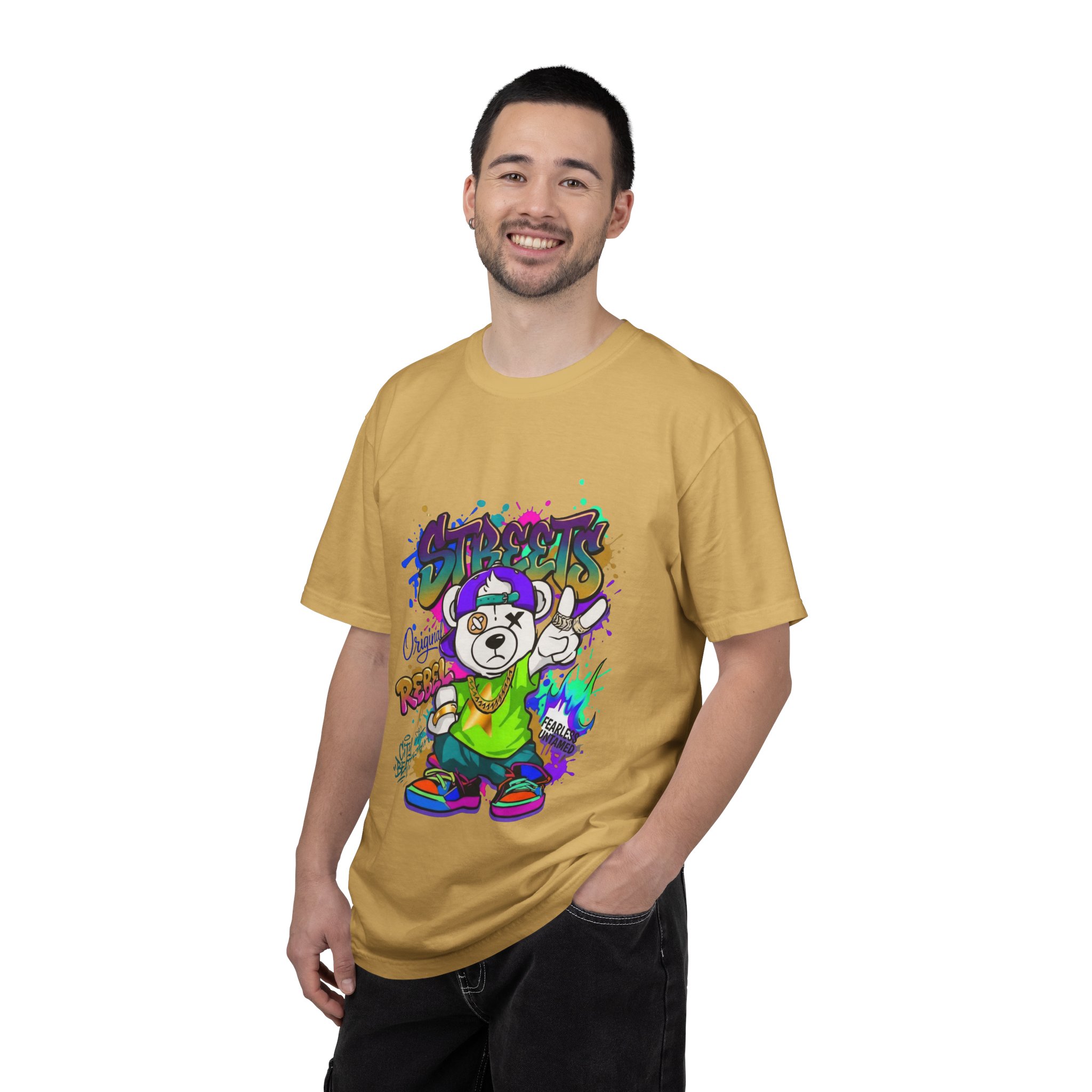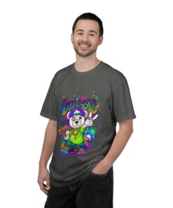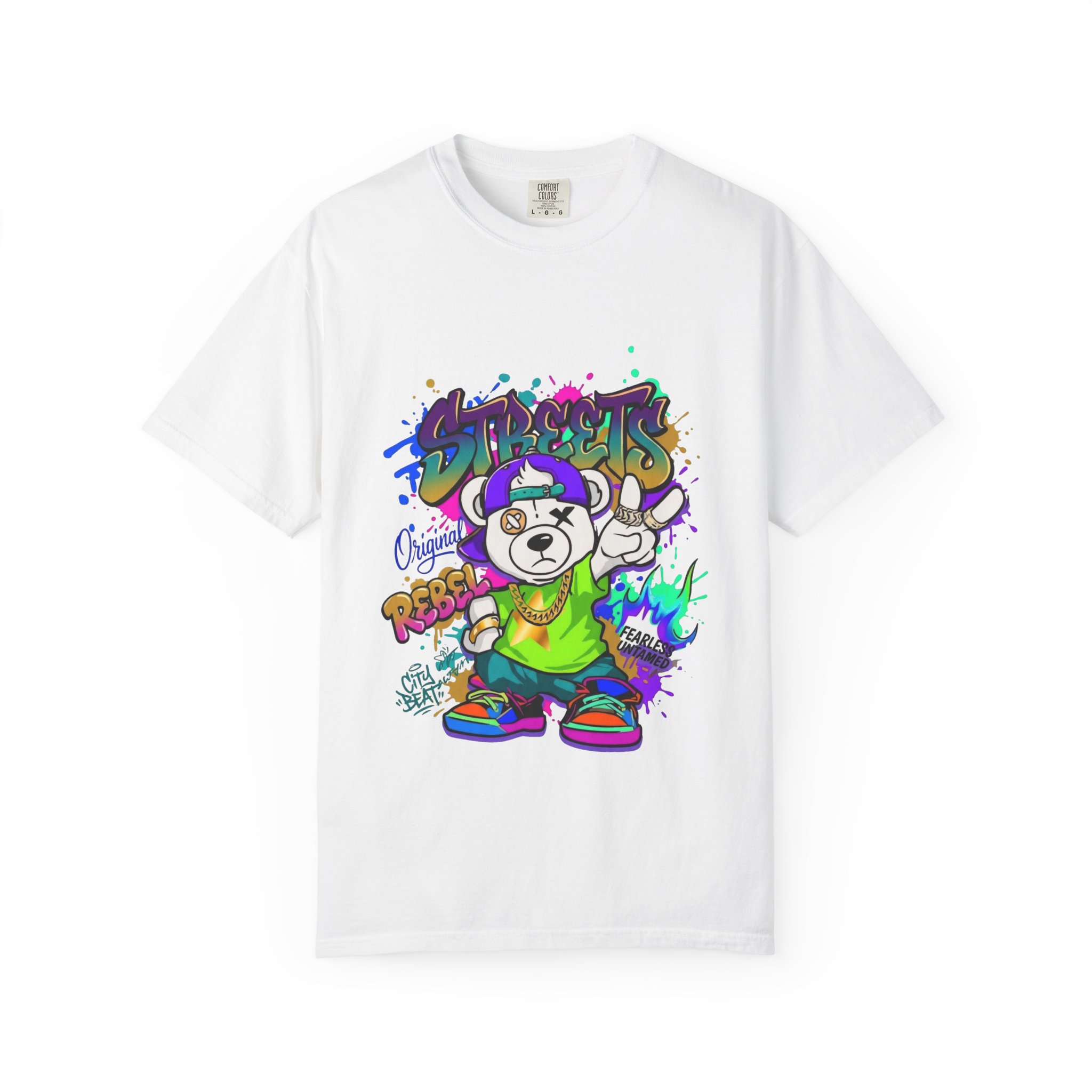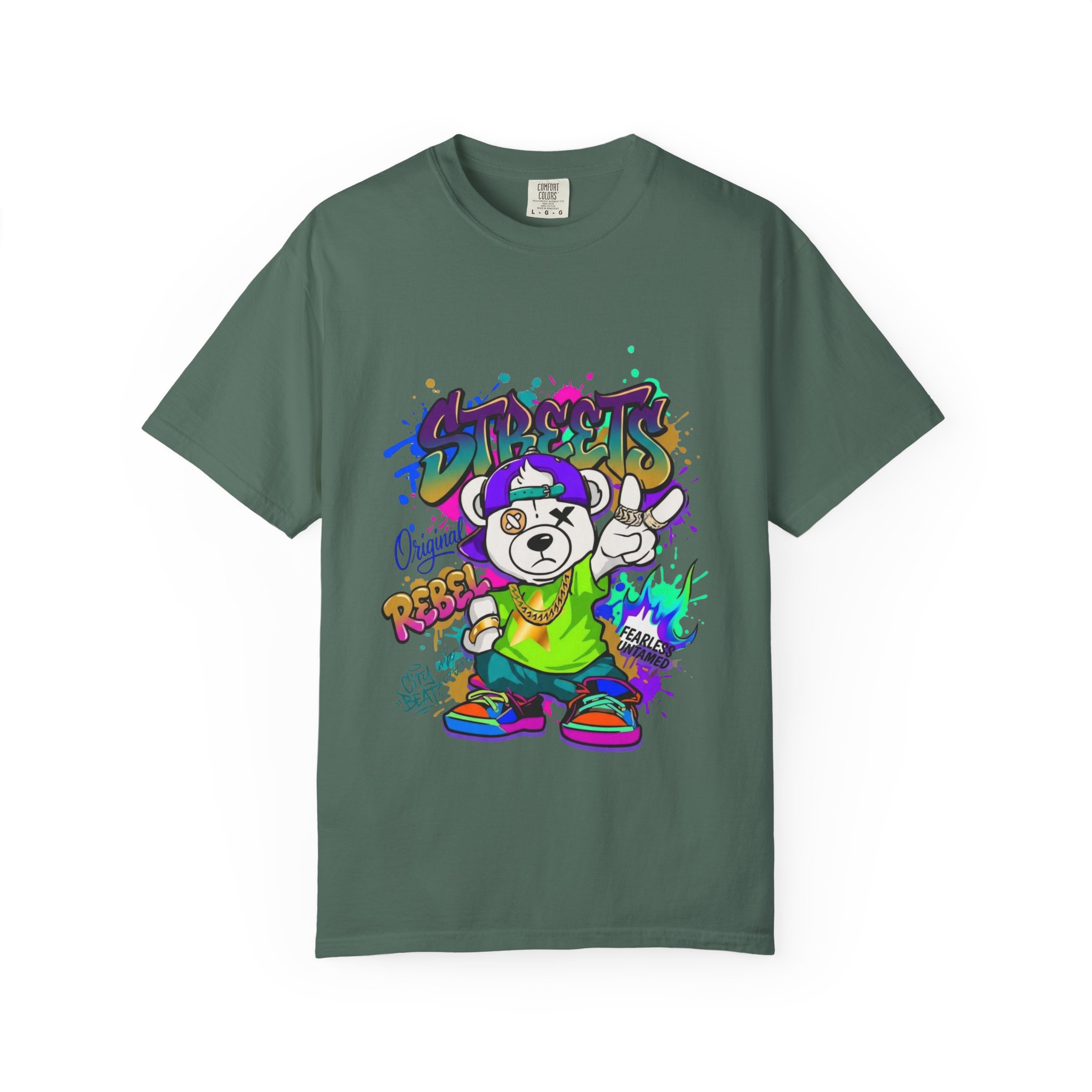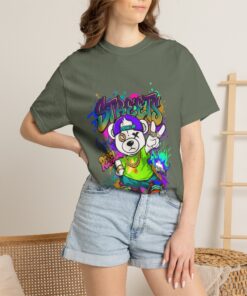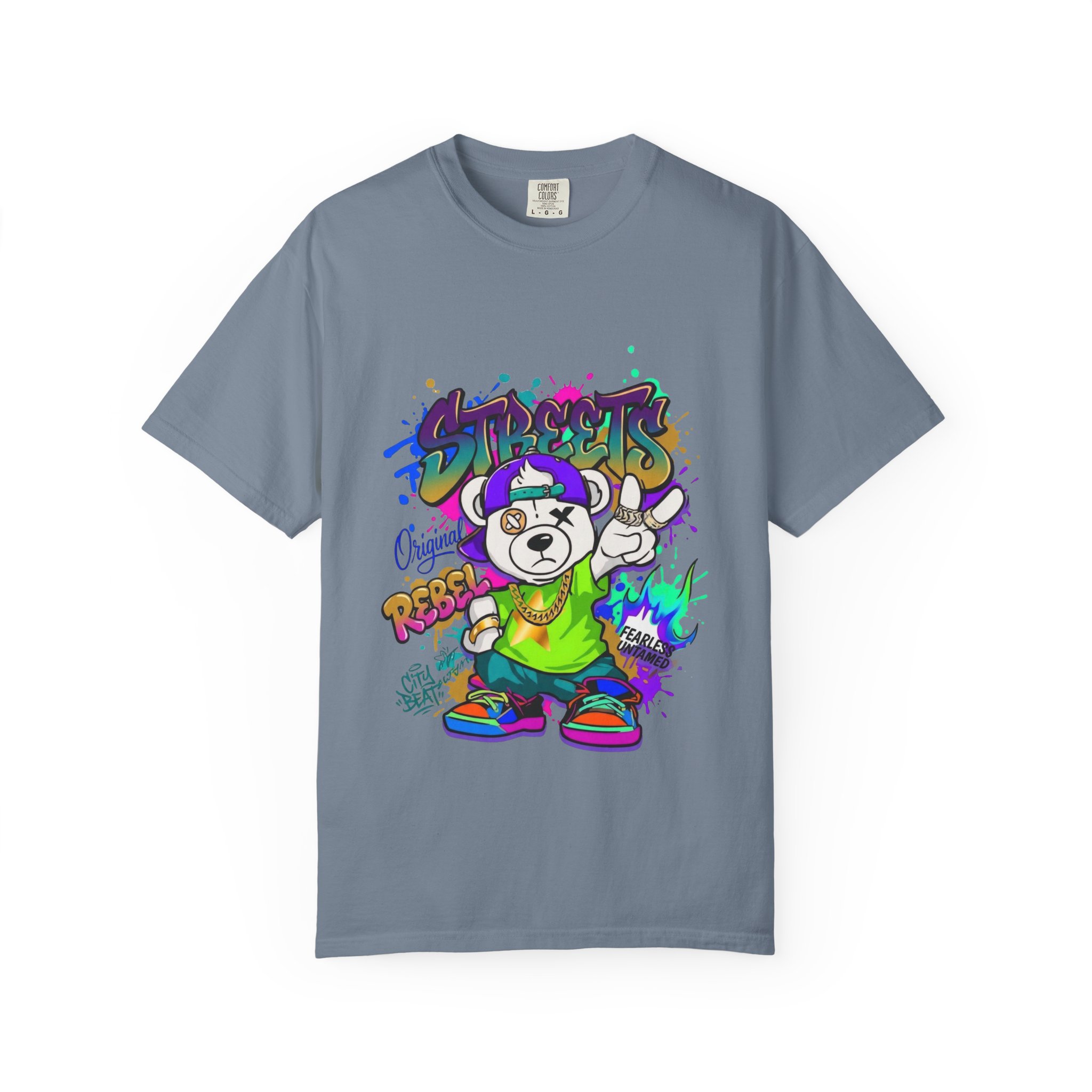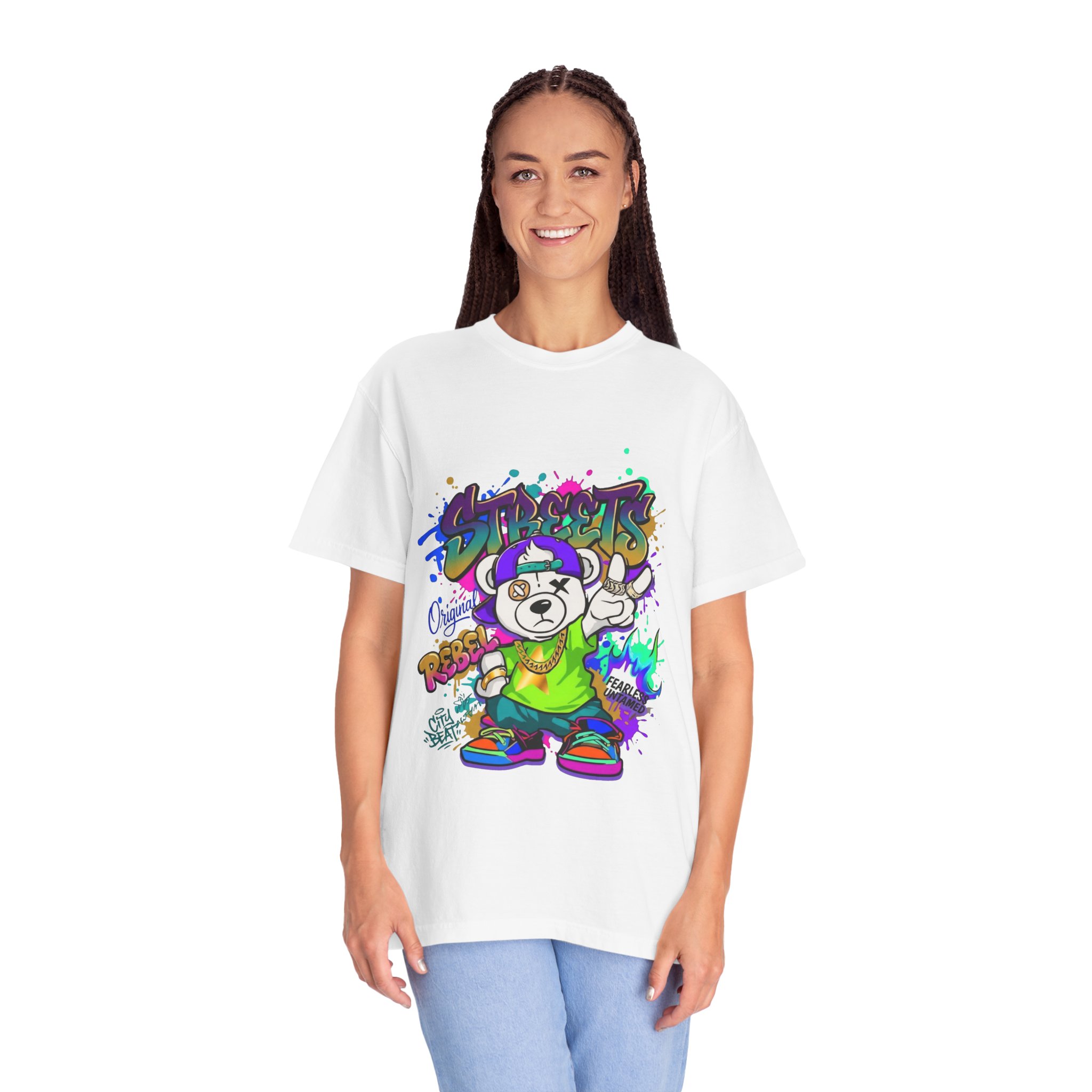 A bold, garment-dyed tee that brings street-art energy to everyday wear. The heavyweight cotton has a lived-in softness from the after-construction dyeing process, so the colors sit with a slightly vintage, broken-in look. At the center, a graffiti-style bear bursts with neon hues and urban flair — a playful, rebellious focal point that reads like a mural you can wear. The relaxed fit and tubular knit give room to move while preserving clean lines and minimal seams. Wear it to skate sessions, late-night art shows, or just when you want your outfit to say you appreciate color, character, and durable construction.