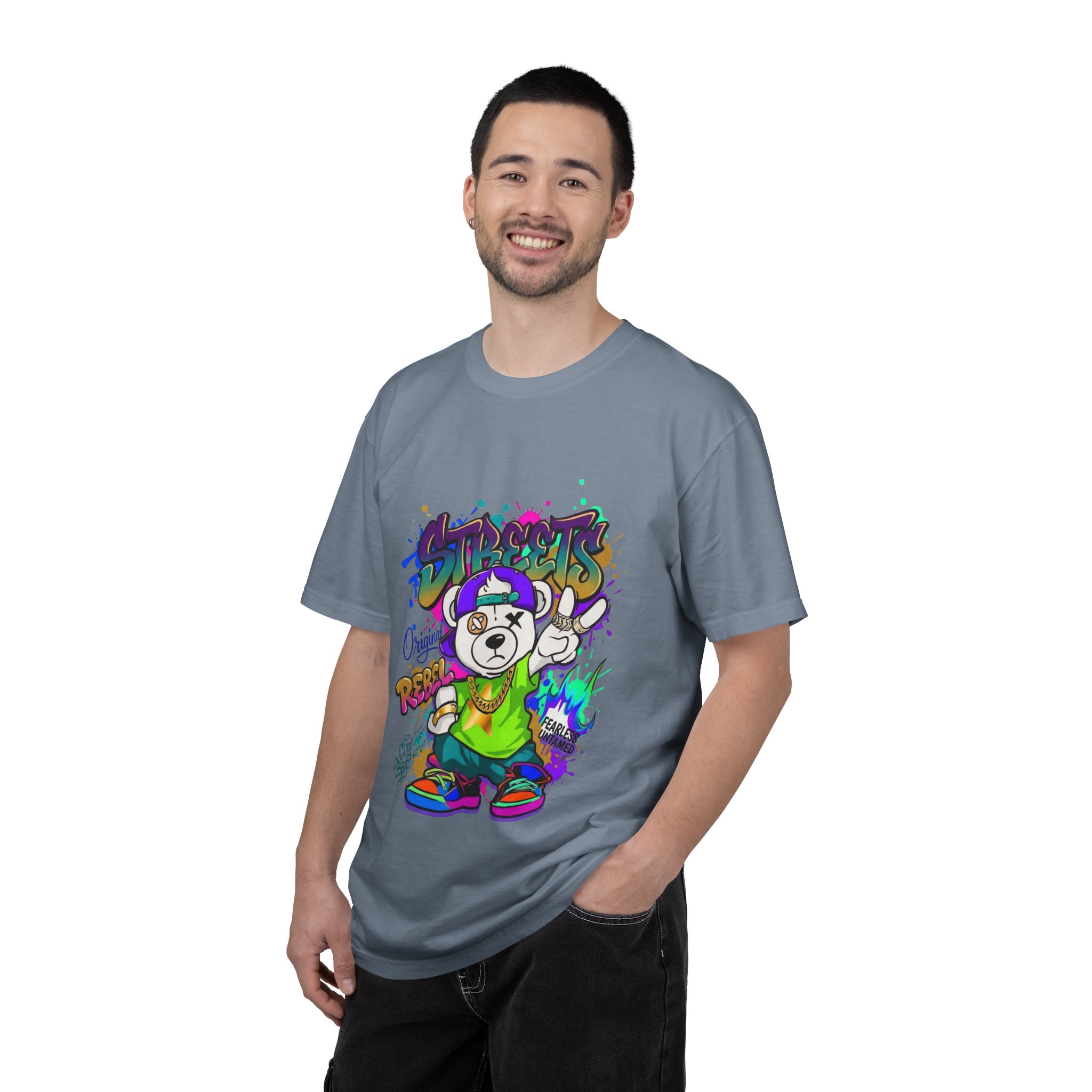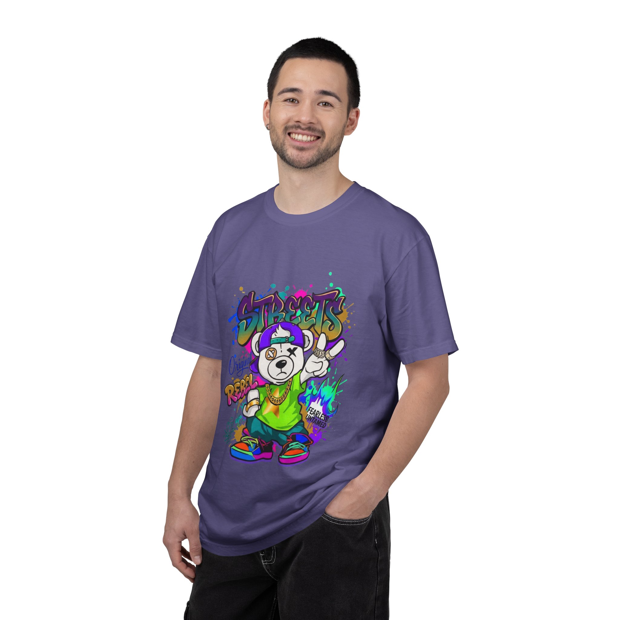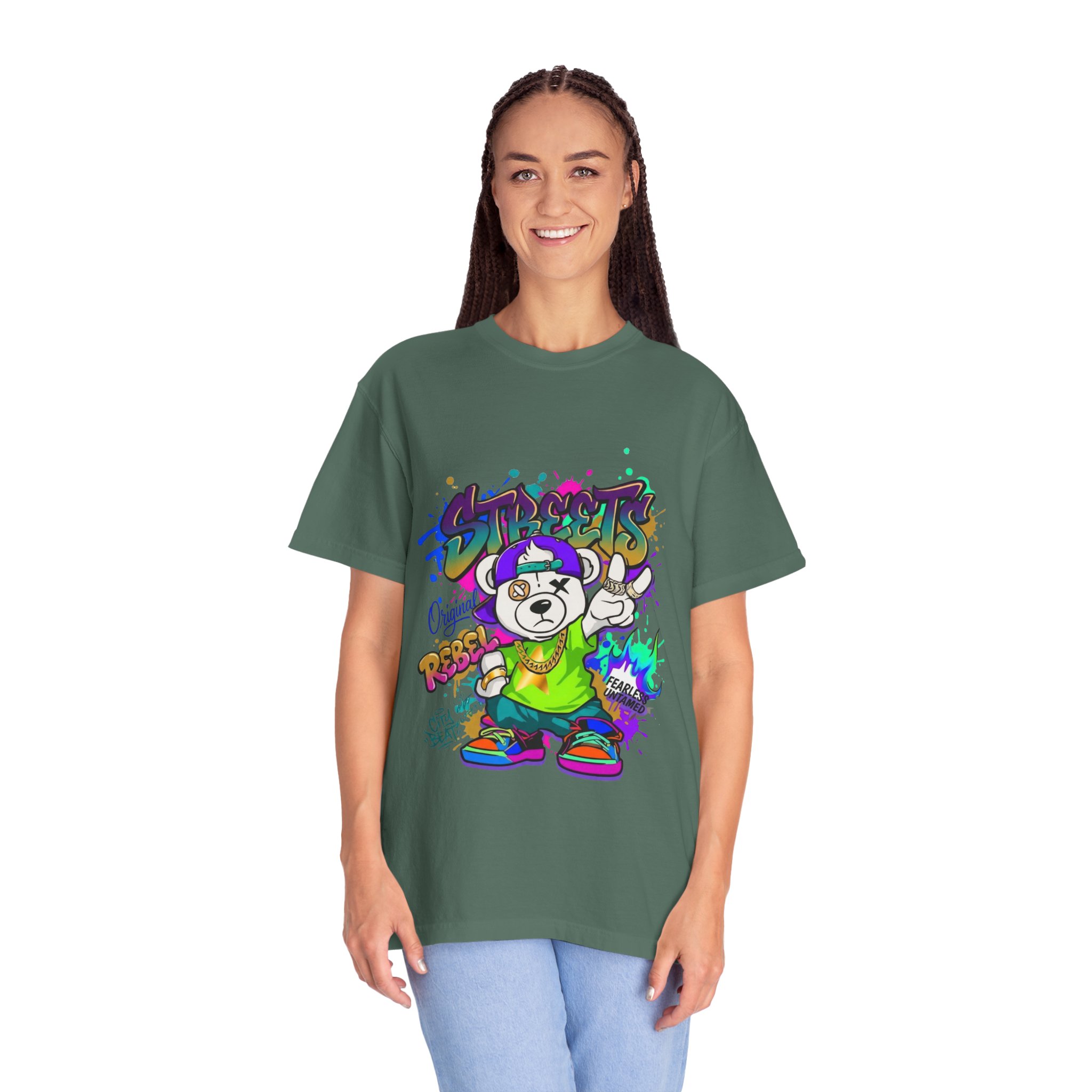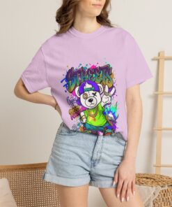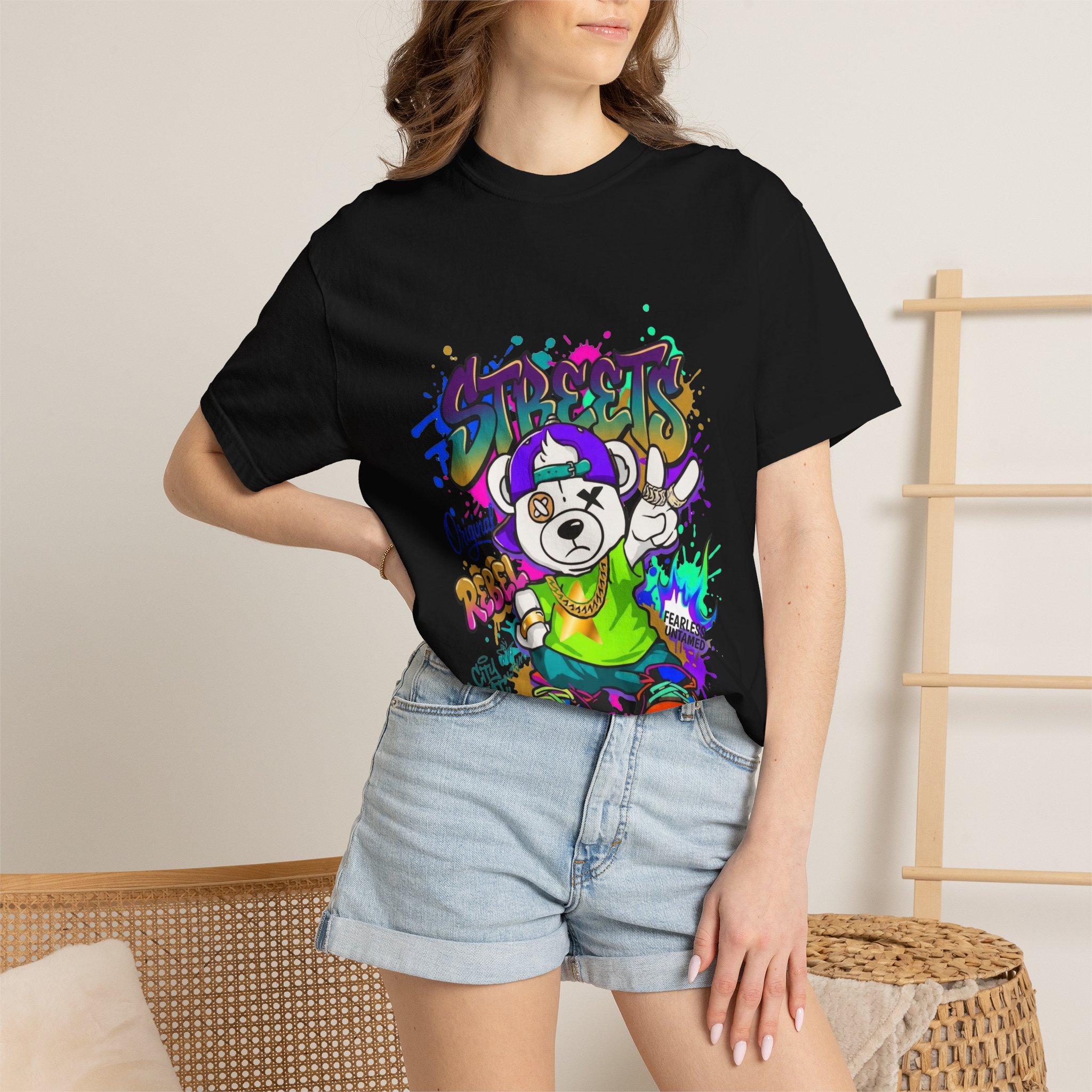A bold, garment-dyed tee that brings street-art energy to everyday wear. The heavyweight cotton has a lived-in softness from the after-construction dyeing process, so the colors sit with a slightly vintage, broken-in look. At the center, a graffiti-style bear bursts with neon hues and urban flair — a playful, rebellious focal point that reads like a mural you can wear. The relaxed fit and tubular knit give room to move while preserving clean lines and minimal seams. Wear it to skate sessions, late-night art shows, or just when you want your outfit to say you appreciate color, character, and durable construction.